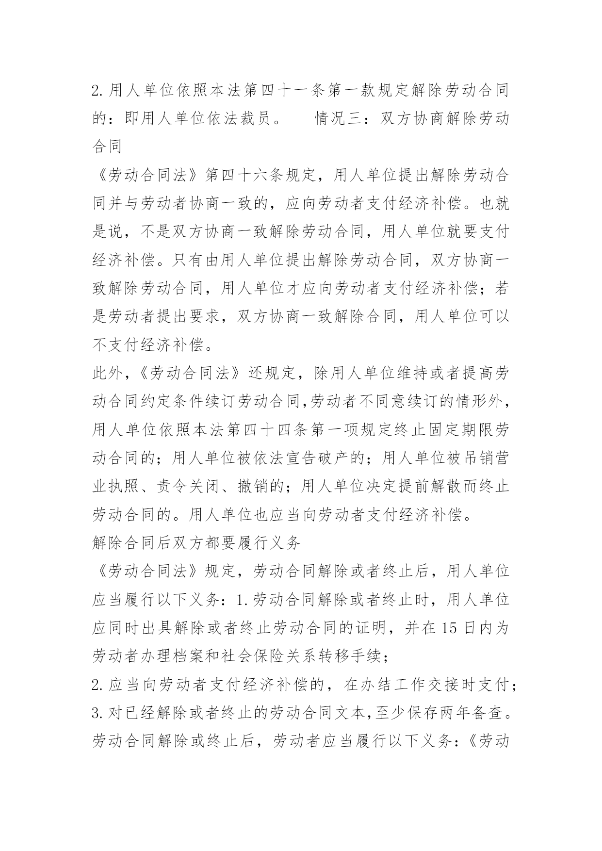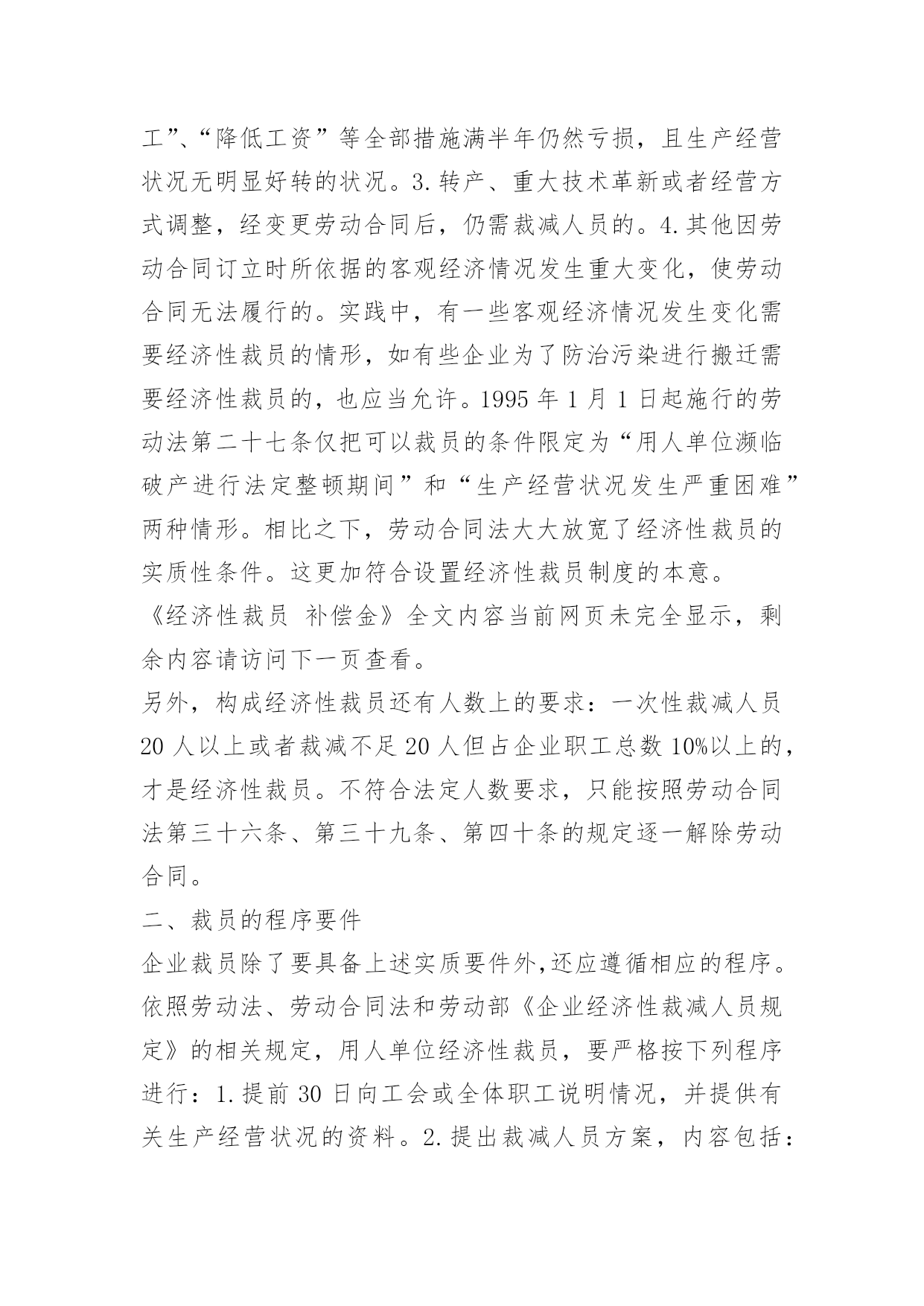 经济性裁员补偿金经济性裁员补偿金情况一:解除或终止合同《劳动合同法》第四十七条规定,此种情况的经济补偿按劳动者在本单位的工作年限,每满一年支付一个月工资的标准支付。六个月以上不满一年的,按一年计算;不满六个月的,向劳动者支付半个月工资。劳动者月工资高于用人单位所在直辖市、省(区)的市级人民政府公布的本地区上年度职工月平均工资三倍的,经济补偿标准为职工月平均工资的三倍,支付年限最高不超过十二年(月工资是指劳动者在劳动合同解除或终止前十二个月的平均工资)。情况二:用人单位单方解除劳动合同《劳动合同法》第四十六条规定,下列情形下,用人单位单方解除劳动合同的,应向劳动者支付经济补偿:1.用人单位依照本法第四十条规定解除劳动合同的:即劳动者患病或非因公负伤,在规定的医疗期满后不能从事原工作,也不能从事由用人单位另行安排的工作的;劳动者不能胜任工作,经过培训或者调整工作岗位,仍不能胜任工作的;劳动合同订立时所依据的客观情况发生重大变化,致使劳动合同无法履行,经用人单位与劳动者协商,未能就变更劳动合同内容达成协议的;用人单位提前30日以书面形式通知劳动者本人或者额外支付劳动者1个月工资后解除劳功合同的。2.用人单位依照本法第四十一条第一款规定解除劳动合同的:即用人单位依法裁员。情况三:双方协商解除劳动合同《劳动合同法》第四十六条规定,用人单位提出解除劳动合同并与劳动者协商一致的,应向劳动者支付经济补偿。也就是说,不是双方协商一致解除劳动合同,用人单位就要支付经济补偿。只有由用人单位提出解除劳动合同,双方协商一致解除劳动合同,用人单位才应向劳动者支付经济补偿;若是劳动者提出要求,双方协商一致解除合同,用人单位可以不支付经济补偿。此外,《劳动合同法》还规定,除用人单位维持或者提高劳动合同约定条件续订劳动合同,劳动者不同意续订的情形外,用人单位依照本法第四十四条第一项规定终止固定期限劳动合同的;用人单位被依法宣告破产的;用人单位被吊销营业执照、责令关闭、撤销的;用人单位决定提前解散而终止劳动合同的。用人单位也应当向劳动者支付经济补偿。解除合同后双方都要履行义务《劳动合同法》规定,劳动合同解除或者终止后,用人单位应当履行以下义务:1.劳动合同解除或者终止时,用人单位应同时出具解除或者终止劳动合同的证明,并在15日内为劳动者办理档案和社会保险关系转移手续;2.应当向劳动者支付经济补偿的,在办结工作交接时支付;3.对已经解除或者终止的劳动合同文本,至少保存两年备查。劳动合同解除或终止后,劳动者应当履行以下义务:《劳动合同法》第五十条规定,劳动合同解除或终止后,劳动者应当按照双方约定,办理工作交接;劳动者应当按照劳动合同的约定,保守用人单位的商业秘密和与知识产权相关的保密事项,履行竞业限制义务。经济性裁员通指企业由于生产经营发生严重困难等原因,为改善状况而辞退成批劳动者的情形,它是用人单位行使解除劳动合同权的方式之一。实行劳动合同制的国家,都或多或少允许用人单位在一定条件下解除劳动合同,如英国《雇佣权利法》规定:在企业关闭或者企业对其人员确需减少时,用人单位可以经济性裁员。我国劳动法及劳动合同法也允许一定条件下用人单位进行经济性裁员。但是,裁员要符合法定的要件,并严格遵循相应的程序规定。一、裁员的实质要件经济性裁员是用人单位出于经营方面考虑而进行的。尽管名为经济性裁员,其实质还是用人单位单方解除劳动合同的一种方式。2017年1月1日起施行的劳动合同法第四十一条采用列举和概括相结合的立法模式,规定4种情形下用人单位可以进行经济性裁员:1.依照企业破产法规定进行重整的。2.生产经营发生严重困难的。何谓“生产经营发生严重困难”?劳动部《企业经济性裁减人员规定》第二条规定,企业生产经营发生严重困难,应当达到当地政府规定的严重困难企业标准。这个“标准”各地定的不一样,如江苏省无锡市把企业严重困难的标准定为:出现亏损,已采取“停止招工”、“清退劳务性用工”、“降低工资”等全部措施满半年仍然亏损,且生产经营状况无明显好转的状况。3.转产、重大技术革新或者经营方式调整,经变更劳动合同后,仍需裁减人员的。4.其他因劳动合同订立时所依据的客观经济情况发生重大变化,使劳动合同无法履行的。实践中,有一些客观经济情况发生变化需要经济性裁员的情形,如有些企业为了防治污染进行搬迁需要经济性裁员的,也应当允许。1995年1月1日起施行的劳动法第二十七条仅把可以裁员的条件限定为“用人单位濒临破产进行法定整顿期间”和“生产经营状况发生严重困难”两种情形。相比之下,劳动合同法大大放宽了经济性裁员的实质性条件。这更加符合设置经济性裁员制度的本意。《经济性裁员补偿金》全文内容当前网页未完全显示,剩余内容请访问下一页查看。另外,构成经济性裁员还有人数上的要求:一次性裁减人员20人以上或者裁减不