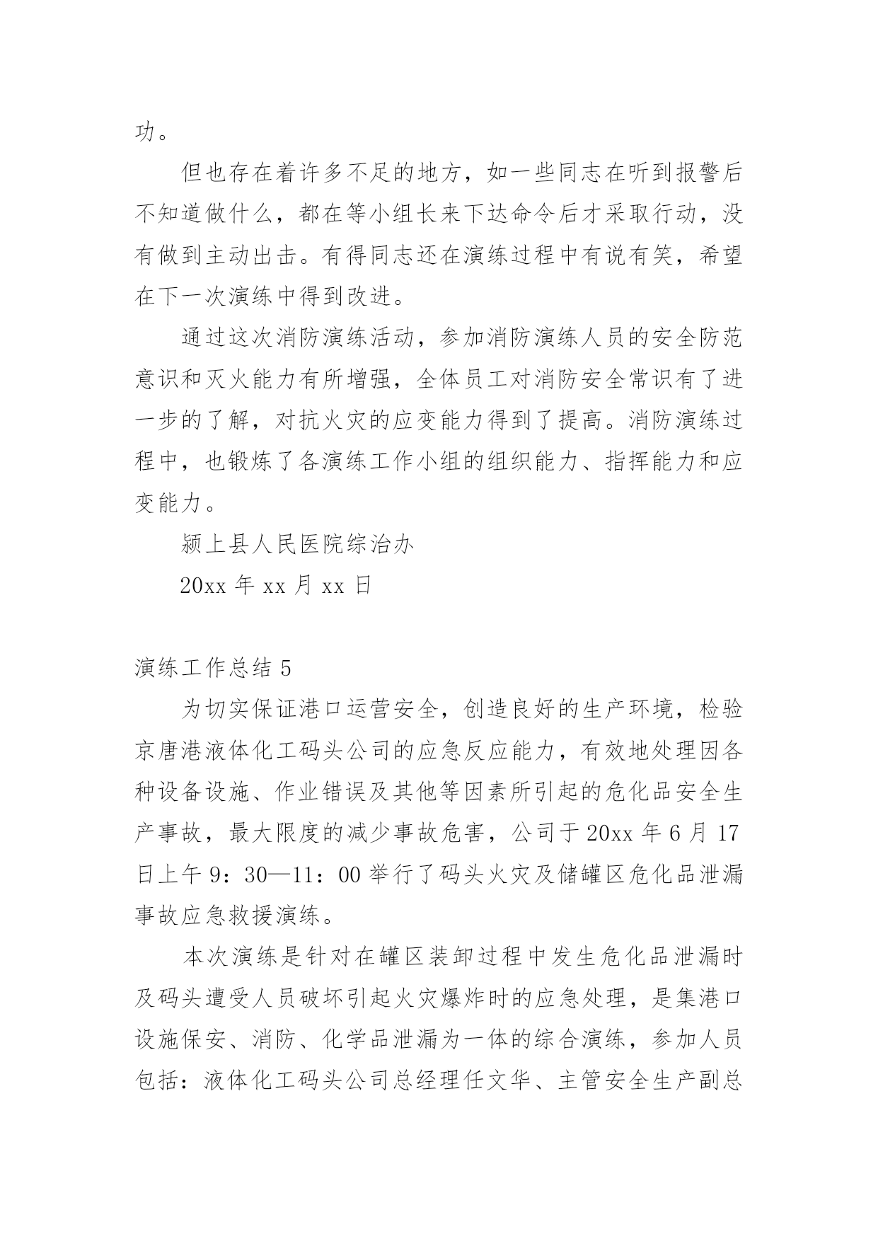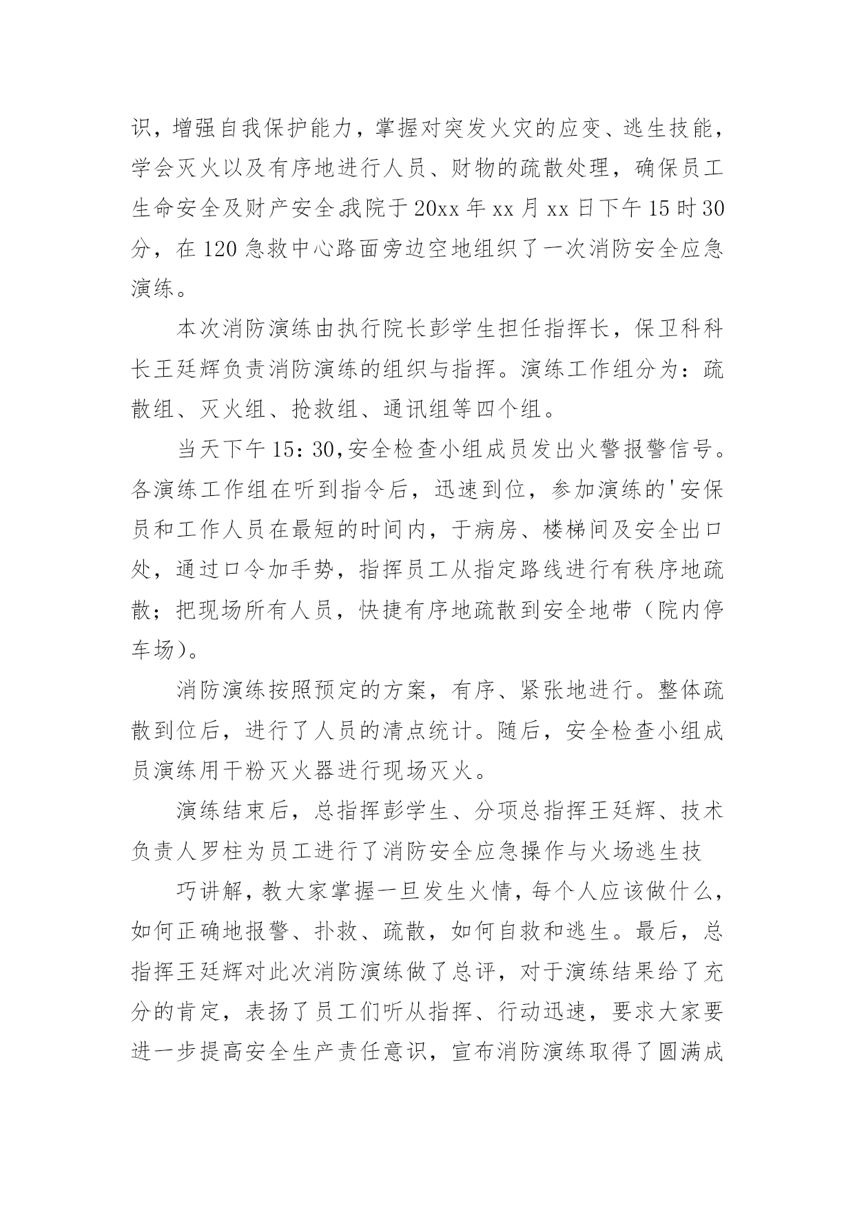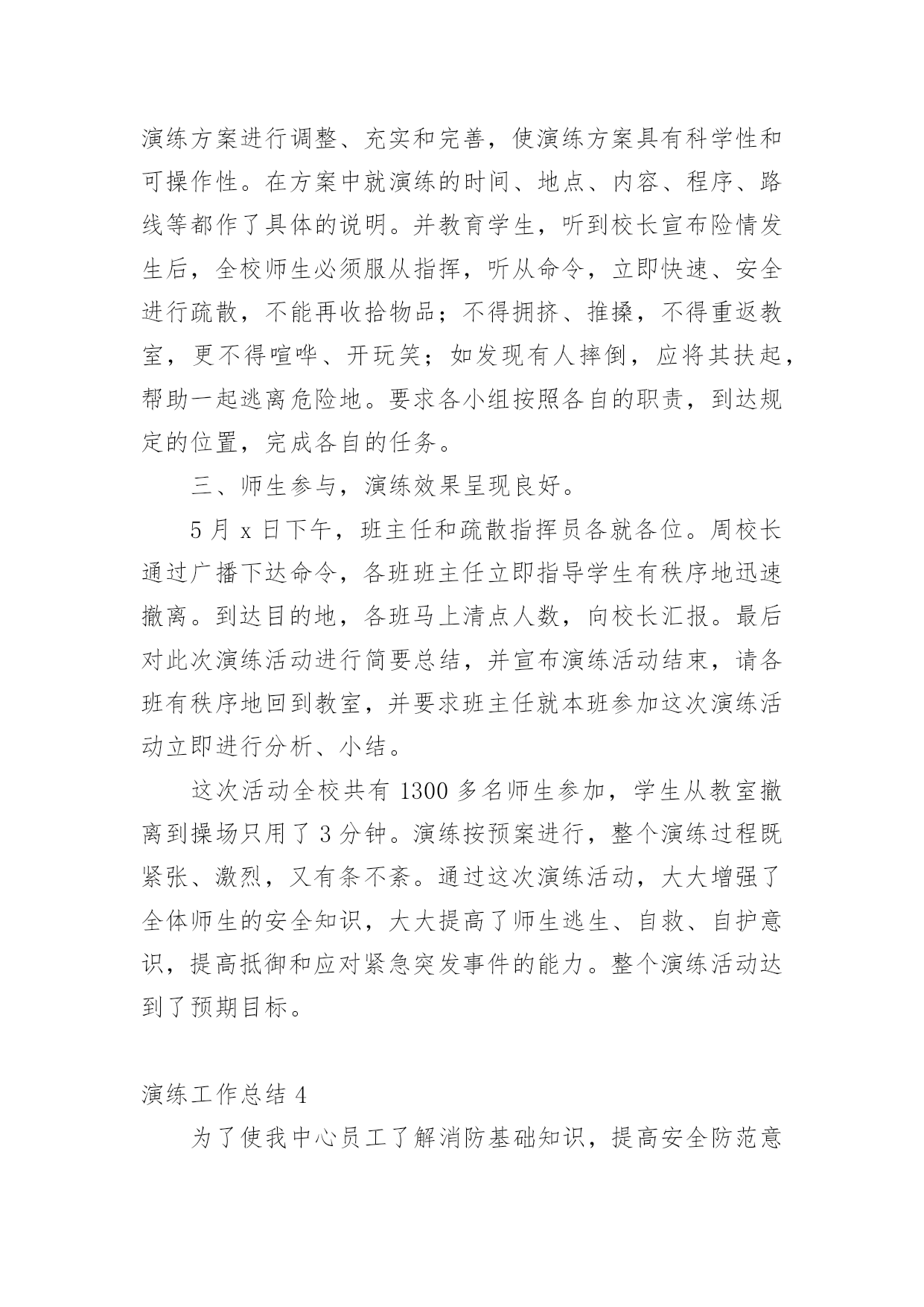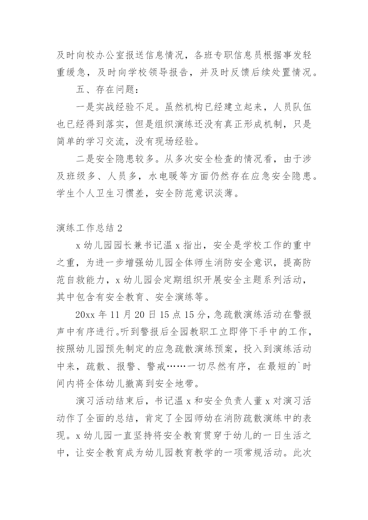 演练工作总结总结是事后对某一阶段的学习或工作情况作加以回顾检查并分析评价的书面材料,它能帮我们理顺知识结构,突出重点,突破难点,快快来写一份总结吧。总结怎么写才是正确的呢?以下是小编收集整理的演练工作总结,仅供参考,大家一起来看看吧。演练工作总结1为贯彻落实上级文件精神,确保演练活动落到实处,我校要求全体成员首先从思想上要引起重视,增强防震、消防安全意识,对学生进行安全意识教育,抓住这次演练机会,提高应对紧急突发事件的能力。现将有关情况汇报如下:一、加强组织领导为积极预防和有效应对应急管理工作,我校先后组织召开全体师生大会,认真传达学习工作会议精神,使全体师生牢固树立应急管理工作的基本理念。一是加强领导。学校主要领导同志组织全体师生就校内外应急工作专门召开会议,安排部署应急管理工作,成立了由校领导班子成员担任组长及副组长,各班主任为成员的应急管理工作领导小组及办公室,及时处置本校职能范围内预防和处置公共场所和突发事件,为各项应急工作的深入开展提供组织保障。二是完善制度。根据上级会议精神,进一步修订了《关于校园各种突发事件的应急预案》;进一步明确了工作原则、适应范围及各级管理部门的工作职责、检查行动具体步骤、检查工作主要措施、检查工作注意事项以及指挥和处置突发事件、信息报送制度等,确保应急管理工作的有效实施。三是抓好落实。按照立足现实、细化职责、重在落实的方针,建立应急管理目标责任制,进一步强化了组织领导,明确了工作责任,保证了全面工作有人管,具体工作有人抓,形成各级联动,层层负责,职责明确,责任到人的良好局面。二、完善应急措施按照“横向到边,纵向到底”的预案体系建设目标,强化应急预案的制订。一是对现有预案进行认真梳理。结合学校工作实际,进一步梳理现有的应急安全预案,深化学校内部安全管理建设,努力探索有效应急管理措施,并要求各班建立相应的应急组织,完善应急措施,并确定专人负责。二是注重预案的可操作性。在完善和修订预案过程中,围绕各班的具体特点,认真研究各类突发事件的发生和发展规律,注意吸取以往在演练过程中的经验教训,加强调研,广泛听取各班主任的意见,不断提高预案的合理性和可操作性,逐步推进应急管理工作的规范化、制度化和程序化。三是明确工作措施。处理应急事故关键要措施得力,快捷迅速,方法得当。我们从应急指挥、应急响应、各班的具体工作分工到当节课具体教师具体处置,都制订了详细具体的工作措施,明确了各班的具体任务和责任。本学期以来,学校全面完成突发事件应急预案的`修订工作。截至目前,我们还组织全体师生演练了安全撤离危险区域应急预案。通过演练,使全校师生的应急安全防范意识有了明显提高。此外,我们还认真检查了校属范围内的各种应急安全措施。三、搞好队伍建设今年以来,我们始终把队伍建设和提高应急管理能力作为一项重要的基础性工作来抓。一是抓队伍。我校在完善应急管理机构建设的基础上,落实应急管理办公室的措施要求,不断充实应急队伍,落实专人负责应急管理工作。通过整合全校应急队伍和力量,逐步建立了统一高效的专业应急管理体系。二是抓培训。我们组织应急管理工作人员进行经常性的工作和措施探讨、学习。内容包括:突发公共事件应急处理方法;日常活动突发公共事件、自然灾害和事故灾难引发的突发公共事件;公共卫生和社会安全事件引发的突发公共事件等类型的突发公共事件预防与处理;突发公共事件应急处理能力的培养。三是抓分析。充分利用晨会、专题大会等有效形式,组织搞好案例分析,主要涉及课间、集会、大型活动、路队当中突发事件的种类、特点、应急准备、应急预案、应急处理措施等。使全体师生进一步树立责任感,增强忧患意识、正确掌握突发公共事件预防和处置的基本常识、原则和方法,教育学生通过采取一系列行之有效的办法提高自身和他人的安全防范意识。四、畅通信息渠道我们根据有关文件精神,结合实际建立了全校应急信息报送流程。流程规定:突发事件发生时,各班专职信息员应及时向校办公室报送信息情况,各班专职信息员根据事发轻重缓急,及时向学校领导报告,并及时反馈后续处置情况。五、存在问题:一是实战经验不足。虽然机构已经建立起来,人员队伍也已经得到落实,但是组织演练还没有真正形成机制,只是简单的学习交流,没有现场经验。二是安全隐患较多。从多次安全检查的情况看,由于涉及班级多、人员多,水电暖等方面仍然存在应急安全隐患。学生个人卫生习惯差,安全防范意识淡薄。演练工作总结2x幼儿园园长兼书记温x指出,安全是学校工作的重中之重,为进一步增强幼儿园全体师生消防安全意识,提高防范自救能力,x幼儿园会定期组织开展安全主题系列活动,其中包含有安全教育、安全演练等。20xx年11月20日15点15分,急疏散演练活动在警报声中有序进行。听到警报后全园教职工立即停下手中的工作,按照幼儿园预先制定的应急疏散演练预案,投入到演练