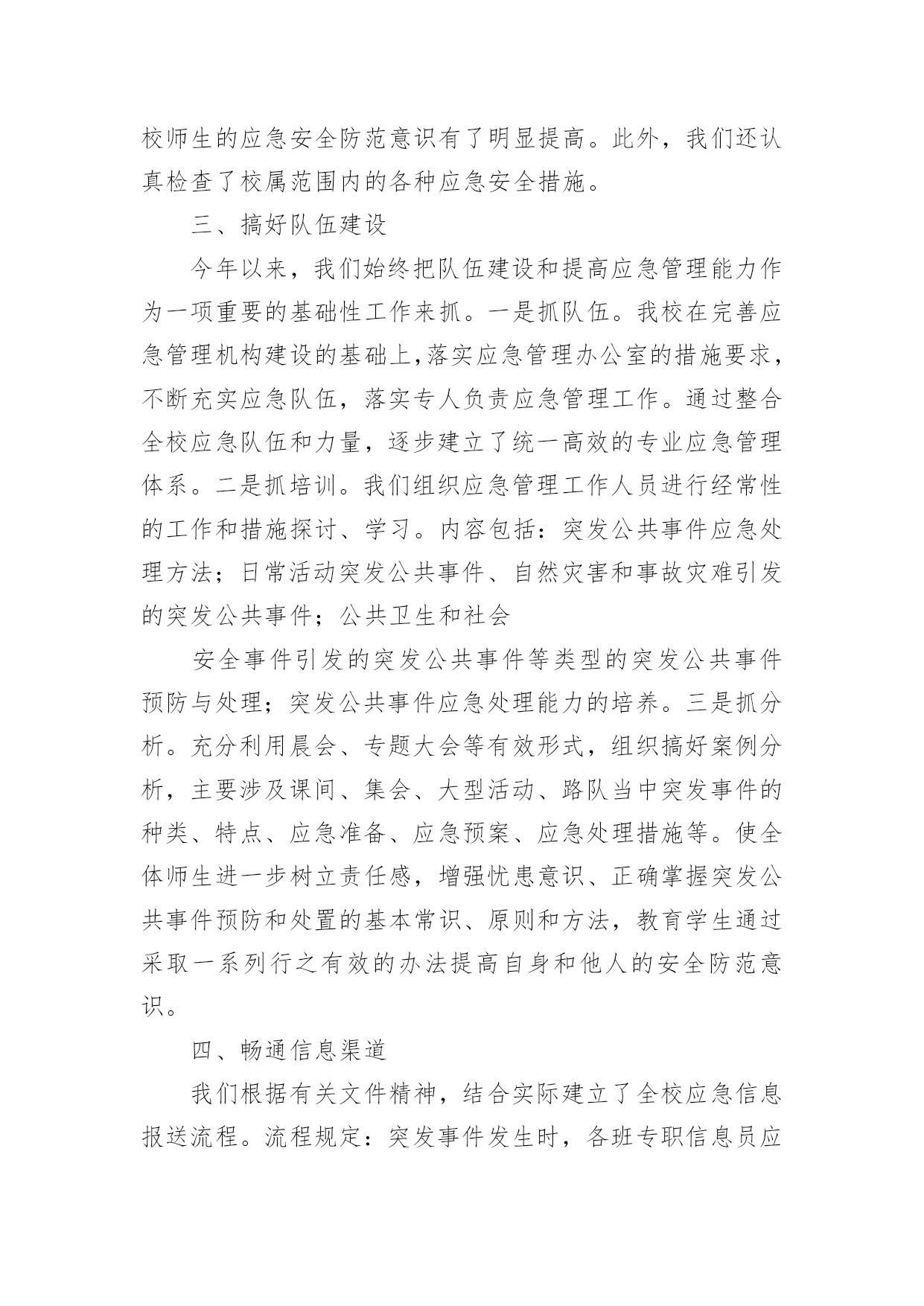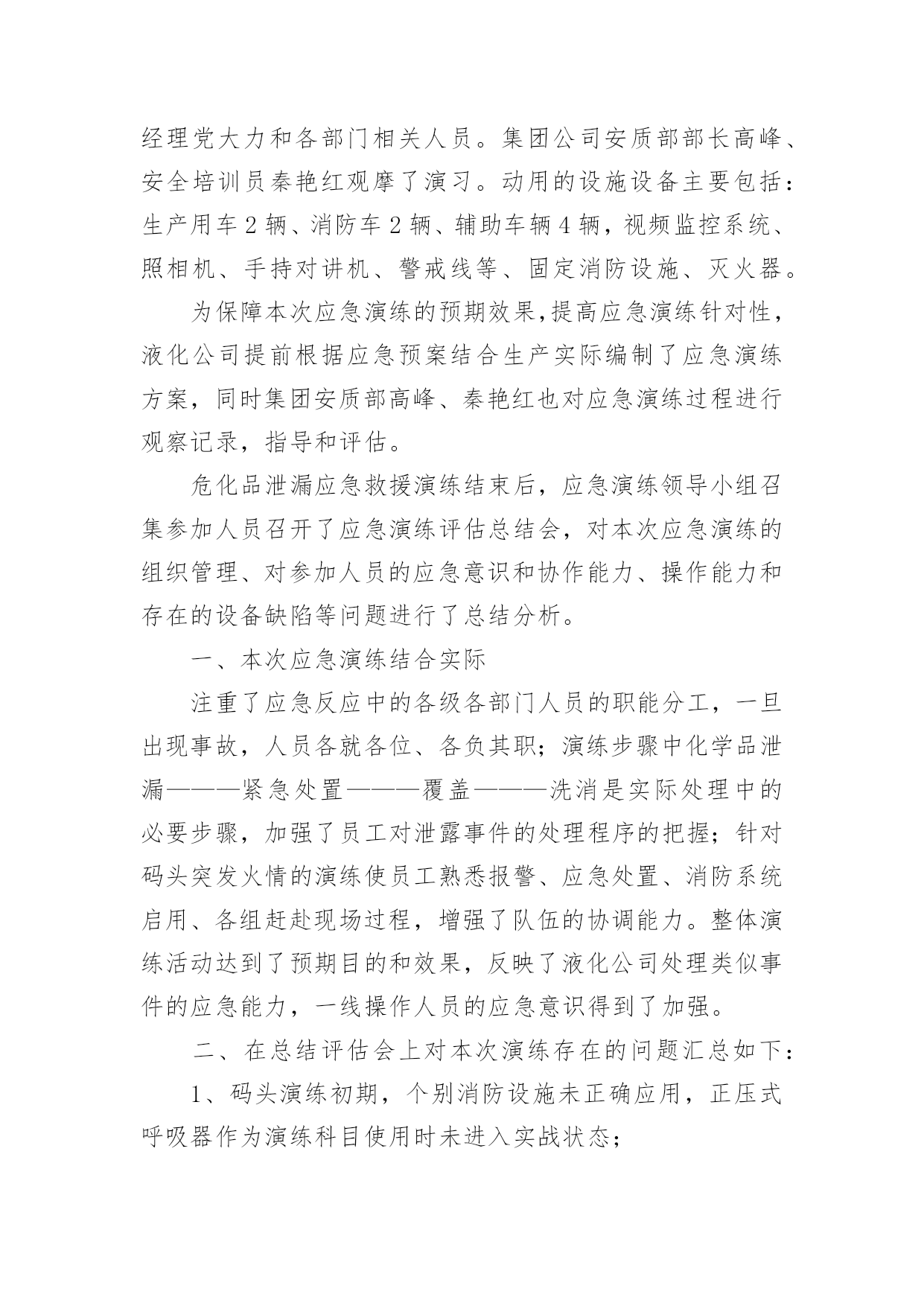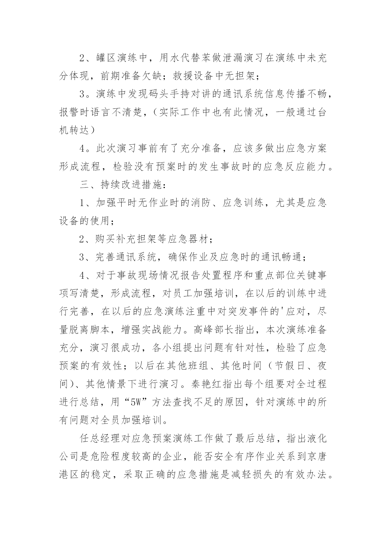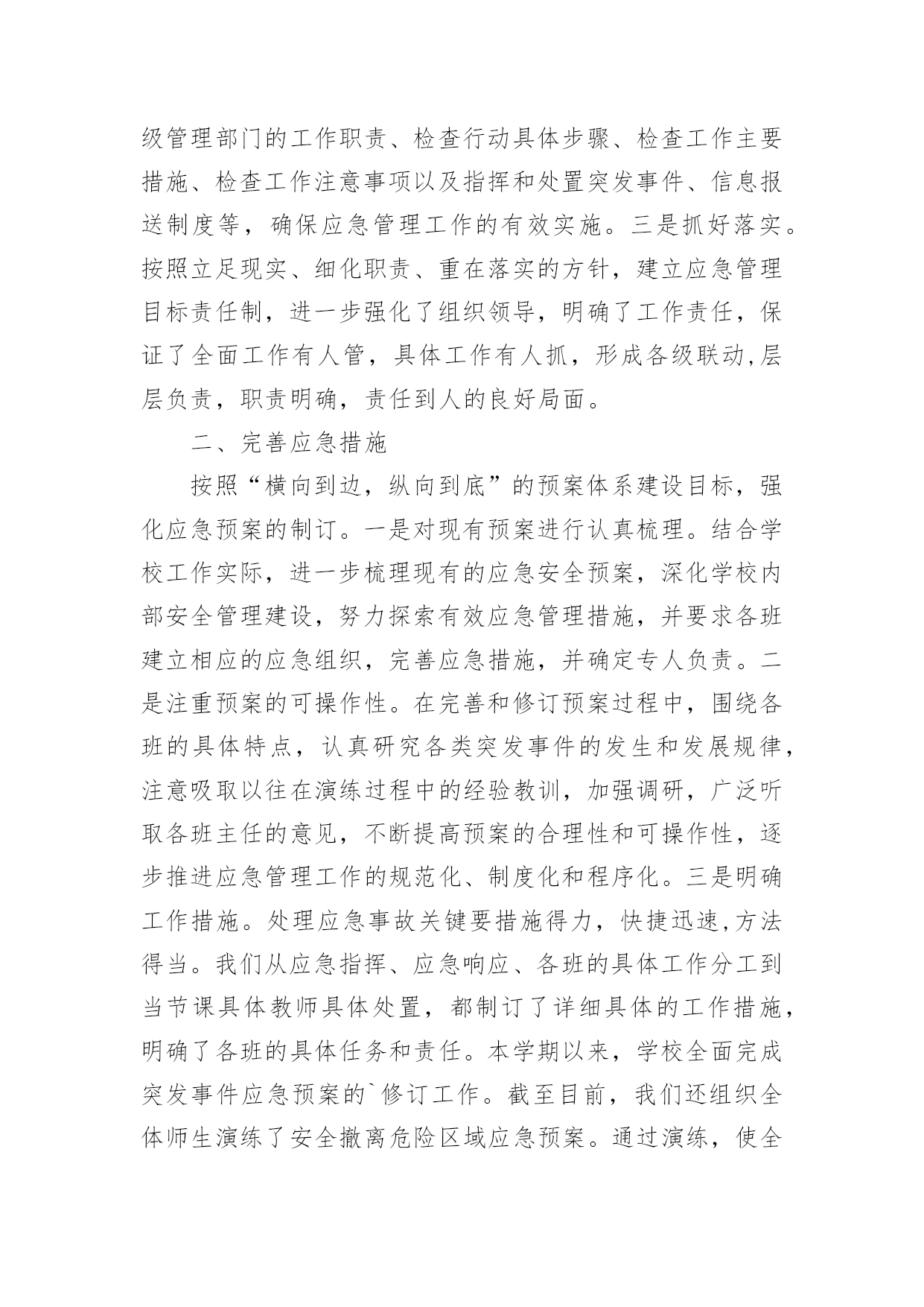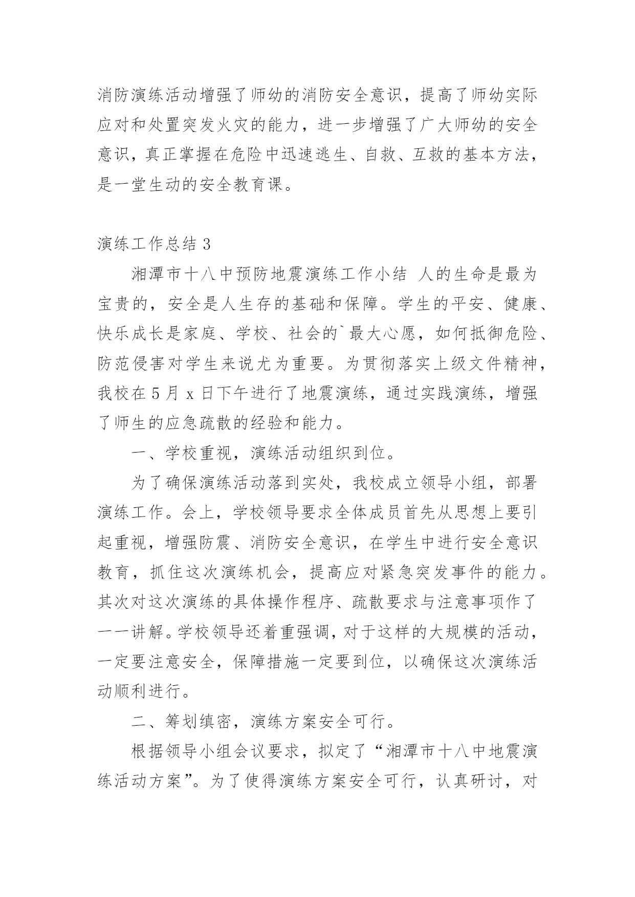演练工作总结总结是事后对某一阶段的学习或工作情况作加以回顾检查并分析评价的书面材料,它能帮我们理顺知识结构,突出重点,突破难点,快快来写一份总结吧。总结怎么写才是正确的呢?以下是小编收集整理的演练工作总结,仅供参考,大家一起来看看吧。演练工作总结1为贯彻落实上级文件精神,确保演练活动落到实处,我校要求全体成员首先从思想上要引起重视,增强防震、消防安全意识,对学生进行安全意识教育,抓住这次演练机会,提高应对紧急突发事件的能力。现将有关情况汇报如下:一、加强组织领导为积极预防和有效应对应急管理工作,我校先后组织召开全体师生大会,认真传达学习工作会议精神,使全体师生牢固树立应急管理工作的基本理念。一是加强领导。学校主要领导同志组织全体师生就校内外应急工作专门召开会议,安排部署应急管理工作,成立了由校领导班子成员担任组长及副组长,各班主任为成员的应急管理工作领导小组及办公室,及时处置本校职能范围内预防和处置公共场所和突发事件,为各项应急工作的深入开展提供组织保障。二是完善制度。根据上级会议精神,进一步修订了《关于校园各种突发事件的应急预案》;进一步明确了工作原则、适应范围及各级管理部门的工作职责、检查行动具体步骤、检查工作主要措施、检查工作注意事项以及指挥和处置突发事件、信息报送制度等,确保应急管理工作的有效实施。三是抓好落实。按照立足现实、细化职责、重在落实的方针,建立应急管理目标责任制,进一步强化了组织领导,明确了工作责任,保证了全面工作有人管,具体工作有人抓,形成各级联动,层层负责,职责明确,责任到人的良好局面。二、完善应急措施按照“横向到边,纵向到底”的预案体系建设目标,强化应急预案的制订。一是对现有预案进行认真梳理。结合学校工作实际,进一步梳理现有的应急安全预案,深化学校内部安全管理建设,努力探索有效应急管理措施,并要求各班建立相应的应急组织,完善应急措施,并确定专人负责。二是注重预案的可操作性。在完善和修订预案过程中,围绕各班的具体特点,认真研究各类突发事件的发生和发展规律,注意吸取以往在演练过程中的经验教训,加强调研,广泛听取各班主任的意见,不断提高预案的合理性和可操作性,逐步推进应急管理工作的规范化、制度化和程序化。三是明确工作措施。处理应急事故关键要措施得力,快捷迅速,方法得当。我们从应急指挥、应急响应、各班的具体工作分工到当节课具体教师具体处置,都制订了详细具体的工作措施,明确了各班的具体任务和责任。本学期以来,学校全面完成突发事件应急预案的`修订工作。截至目前,我们还组织全体师生演练了安全撤离危险区域应急预案。通过演练,使全校师生的应急安全防范意识有了明显提高。此外,我们还认真检查了校属范围内的各种应急安全措施。三、搞好队伍建设今年以来,我们始终把队伍建设和提高应急管理能力作为一项重要的基础性工作来抓。一是抓队伍。我校在完善应急管理机构建设的基础上,落实应急管理办公室的措施要求,不断充实应急队伍,落实专人负责应急管理工作。通过整合全校应急队伍和力量,逐步建立了统一高效的专业应急管理体系。二是抓培训。我们组织应急管理工作人员进行经常性的工作和措施探讨、学习。内容包括:突发公共事件应急处理方法;日常活动突发公共事件、自然灾害和事故灾难引发的突发公共事件;公共卫生和社会安全事件引发的突发公共事件等类型的突发公共事件预防与处理;突发公共事件应急处理能力的培养。三是抓分析。充分利用晨会、专题大会等有效形式,组织搞好案例分析,主要涉及课间、集会、大型活动、路队当中突发事件的种类、特点、应急准备、应急预案、应急处理措施等。使全体师生进一步树立责任感,增强忧患意识、正确掌握突发公共事件预防和处置的基本常识、原则和方法,教育学生通过采取一系列行之有效的办法提高自身和他人的安全防范意识。四、畅通信息渠道我们根据有关文件精神,结合实际建立了全校应急信息报送流程。流程规定:突发事件发生时,各班专职信息员应及时向校办公室报送信息情况,各班专职信息员根据事发轻重缓急,及时向学校领导报告,并及时反馈后续处置情况。五、存在问题:一是实战经验不足。虽然机构已经建立起来,人员队伍也已经得到落实,但是组织演练还没有真正形成机制,只是简单的学习交流,没有现场经验。二是安全隐患较多。从多次安全检查的情况看,由于涉及班级多、人员多,水电暖等方面仍然存在应急安全隐患。学生个人卫生习惯差,安全防范意识淡薄。演练工作总结2x幼儿园园长兼书记温x指出,安全是学校工作的重中之重,为进一步增强幼儿园全体师生消防安全意识,提高防范自救能力,x幼儿园会定期组织开展安全主题系列活动,其中包含有安全教育、安全演练等。20xx年11月20日15点15分,急疏散演练活动在警报声中有序进行。听到警报后全园教职工立即停下手中的工作,按照幼儿园预先制定的应急疏散演练预案,投入到演练
