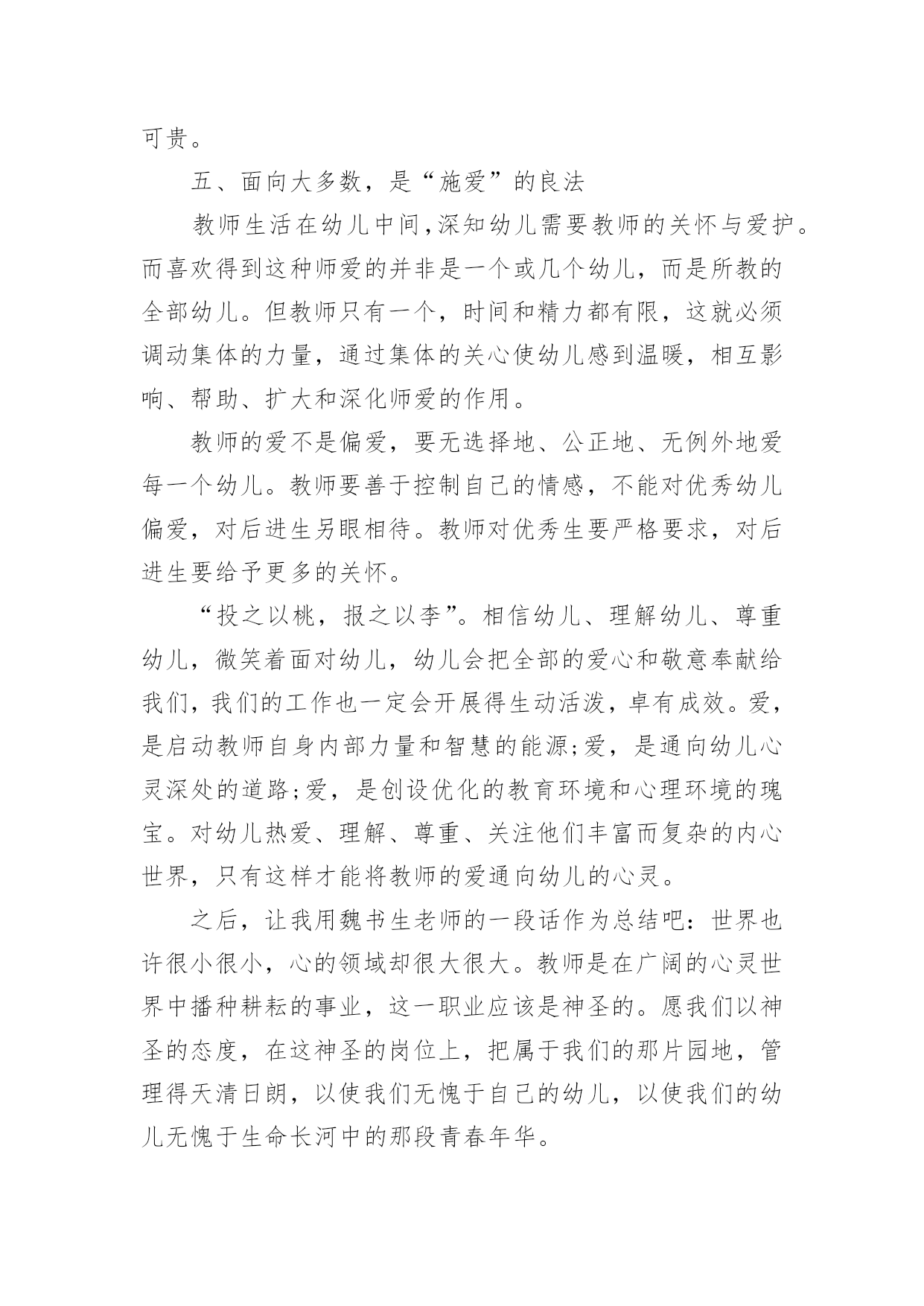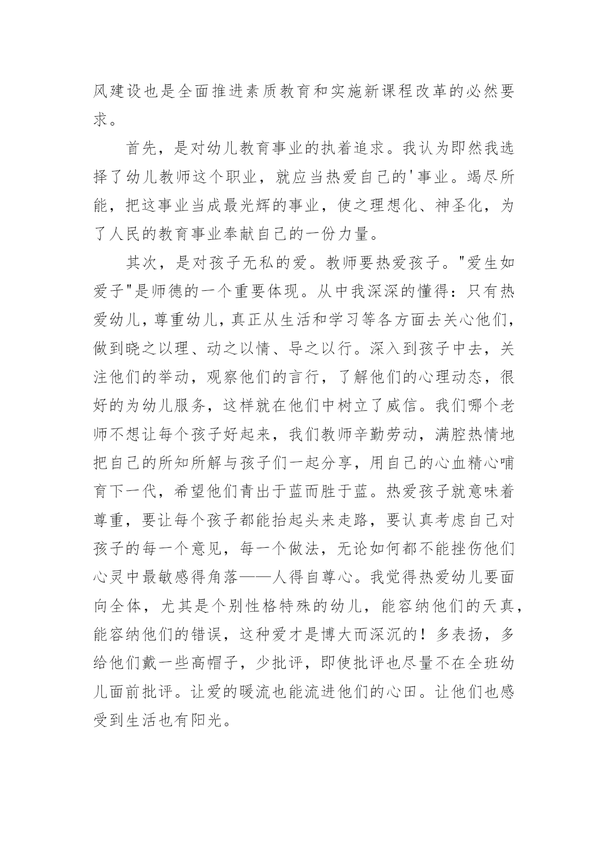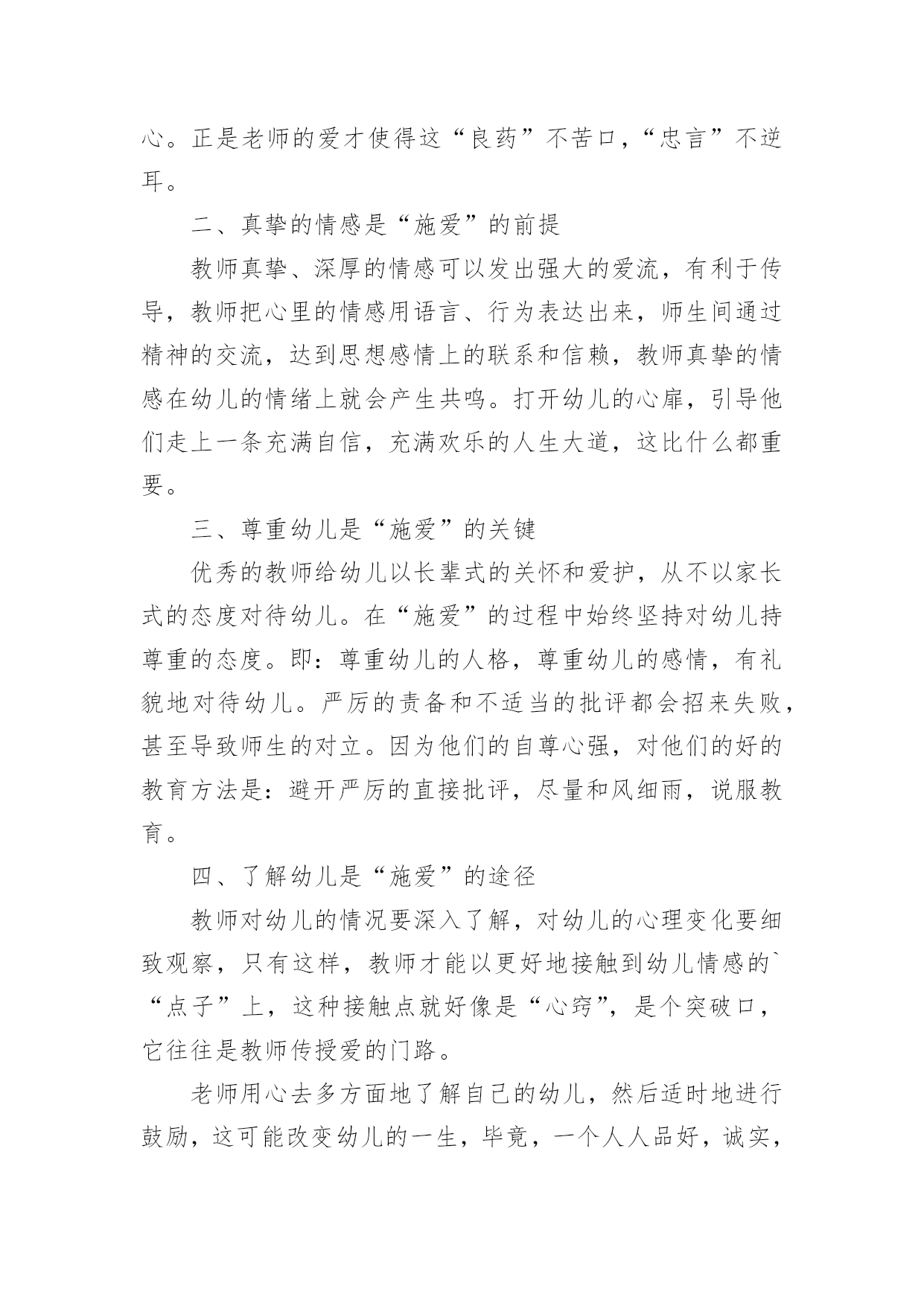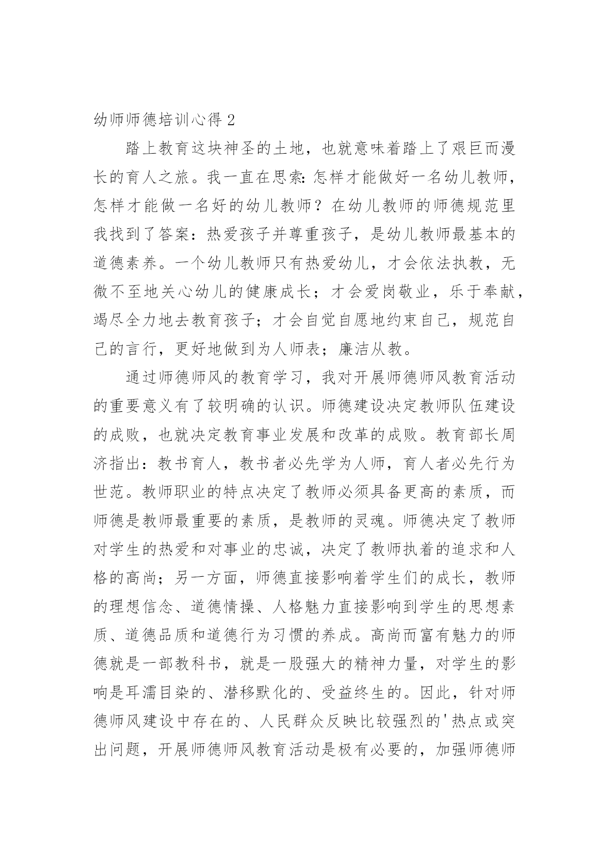 幼师师德培训心得当我们备受启迪时,应该马上记录下来,写一篇心得体会,这样能够给人努力向前的动力。那么写心得体会要注意的内容有什么呢?以下是小编收集整理的幼师师德培训心得,仅供参考,欢迎大家阅读。幼师师德培训心得1我是个刚刚踏上幼儿园教育工作岗位的教师,但我深深地认识到对幼儿充满爱是做好教师工作的关键。记得有位老教师说过:“没有爱就没有教育。”大作家高尔基说过:“谁爱孩子,孩子就爱谁。只有爱孩子的人,他才可以教育孩子。”可见,爱是通往教育成功的桥梁,也是一条基本准则。一、纯真的爱心是“施爱”的基础有人说:“一切好的教育方法,一切好的教育艺术,都产生于教育对幼儿无比热爱的炽热心灵中。”因此作为一名教师,首先应该做到爱孩子。刚接触幼儿,他们纯真的笑容感染了我,因此对于一些童趣十足、无伤大雅的举动我总是宽容对待,欣赏他们的可爱之处,保护他们珍贵的自尊心。幼儿在师爱的沐浴下轻松快乐地学习、生活。即使他们违反了纪律,严厉批评时,我也动之以情,晓之以理,更要让他明白:老师是关心你、爱护你的,是为你着想才如此严格要求……这样,在“严师”面前他就不会产生逆反心理或歧视情绪,而理解了老师的苦心。正是老师的爱才使得这“良药”不苦口,“忠言”不逆耳。二、真挚的情感是“施爱”的前提教师真挚、深厚的情感可以发出强大的爱流,有利于传导,教师把心里的情感用语言、行为表达出来,师生间通过精神的交流,达到思想感情上的联系和信赖,教师真挚的情感在幼儿的情绪上就会产生共鸣。打开幼儿的心扉,引导他们走上一条充满自信,充满欢乐的人生大道,这比什么都重要。三、尊重幼儿是“施爱”的关键优秀的教师给幼儿以长辈式的关怀和爱护,从不以家长式的态度对待幼儿。在“施爱”的过程中始终坚持对幼儿持尊重的态度。即:尊重幼儿的人格,尊重幼儿的感情,有礼貌地对待幼儿。严厉的责备和不适当的批评都会招来失败,甚至导致师生的对立。因为他们的自尊心强,对他们的好的教育方法是:避开严厉的直接批评,尽量和风细雨,说服教育。四、了解幼儿是“施爱”的途径教师对幼儿的情况要深入了解,对幼儿的心理变化要细致观察,只有这样,教师才能以更好地接触到幼儿情感的`“点子”上,这种接触点就好像是“心窍”,是个突破口,它往往是教师传授爱的门路。老师用心去多方面地了解自己的幼儿,然后适时地进行鼓励,这可能改变幼儿的一生,毕竟,一个人人品好,诚实,可贵。五、面向大多数,是“施爱”的良法教师生活在幼儿中间,深知幼儿需要教师的关怀与爱护。而喜欢得到这种师爱的并非是一个或几个幼儿,而是所教的全部幼儿。但教师只有一个,时间和精力都有限,这就必须调动集体的力量,通过集体的关心使幼儿感到温暖,相互影响、帮助、扩大和深化师爱的作用。教师的爱不是偏爱,要无选择地、公正地、无例外地爱每一个幼儿。教师要善于控制自己的情感,不能对优秀幼儿偏爱,对后进生另眼相待。教师对优秀生要严格要求,对后进生要给予更多的关怀。“投之以桃,报之以李”。相信幼儿、理解幼儿、尊重幼儿,微笑着面对幼儿,幼儿会把全部的爱心和敬意奉献给我们,我们的工作也一定会开展得生动活泼,卓有成效。爱,是启动教师自身内部力量和智慧的能源;爱,是通向幼儿心灵深处的道路;爱,是创设优化的教育环境和心理环境的瑰宝。对幼儿热爱、理解、尊重、关注他们丰富而复杂的内心世界,只有这样才能将教师的爱通向幼儿的心灵。之后,让我用魏书生老师的一段话作为总结吧:世界也许很小很小,心的领域却很大很大。教师是在广阔的心灵世界中播种耕耘的事业,这一职业应该是神圣的。愿我们以神圣的态度,在这神圣的岗位上,把属于我们的那片园地,管理得天清日朗,以使我们无愧于自己的幼儿,以使我们的幼儿无愧于生命长河中的那段青春年华。幼师师德培训心得2踏上教育这块神圣的土地,也就意味着踏上了艰巨而漫长的育人之旅。我一直在思索:怎样才能做好一名幼儿教师,怎样才能做一名好的幼儿教师?在幼儿教师的师德规范里我找到了答案:热爱孩子并尊重孩子,是幼儿教师最基本的道德素养。一个幼儿教师只有热爱幼儿,才会依法执教,无微不至地关心幼儿的健康成长;才会爱岗敬业,乐于奉献,竭尽全力地去教育孩子;才会自觉自愿地约束自己,规范自己的言行,更好地做到为人师表;廉洁从教。通过师德师风的教育学习,我对开展师德师风教育活动的重要意义有了较明确的认识。师德建设决定教师队伍建设的成败,也就决定教育事业发展和改革的成败。教育部长周济指出:教书育人,教书者必先学为人师,育人者必先行为世范。教师职业的特点决定了教师必须具备更高的素质,而师德是教师最重要的素质,是教师的灵魂。师德决定了教师对学生的热爱和对事业的忠诚,决定了教师执着的追求和人格的高尚;另一方面,师德直接影响着学生们的成长,教师的理想信念、道德情操、人格魅力直接影响到学生的思想素质、道德品质和道德行为习惯的养成。高尚而