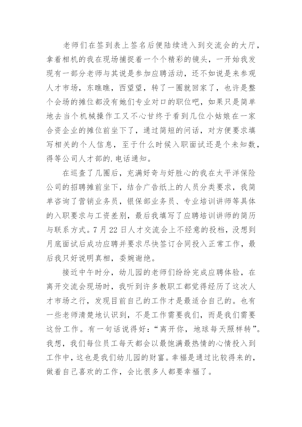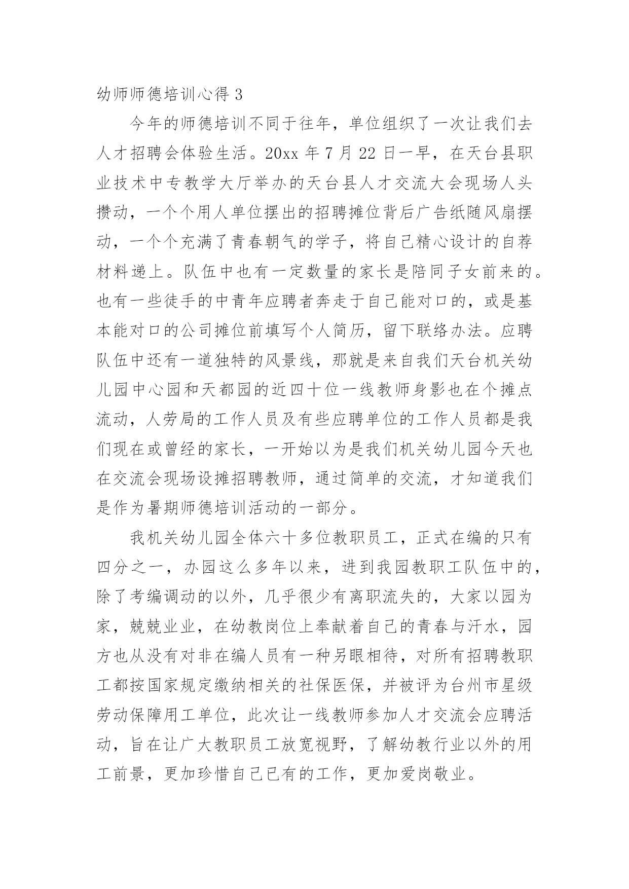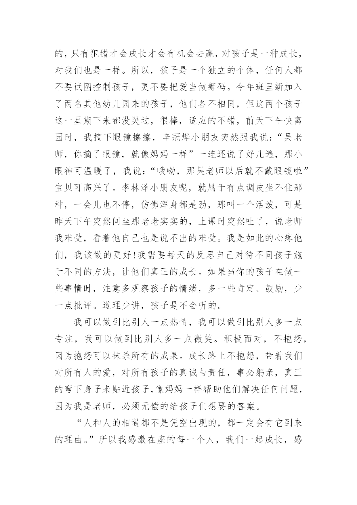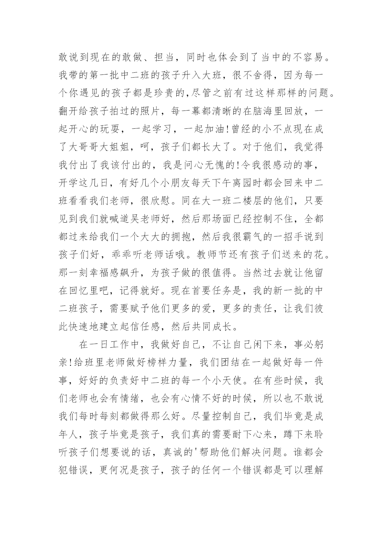 幼师师德培训心得当我们备受启迪时,应该马上记录下来,写一篇心得体会,这样能够给人努力向前的动力。那么写心得体会要注意的内容有什么呢?以下是小编收集整理的幼师师德培训心得,仅供参考,欢迎大家阅读。幼师师德培训心得1我是个刚刚踏上幼儿园教育工作岗位的教师,但我深深地认识到对幼儿充满爱是做好教师工作的关键。记得有位老教师说过:“没有爱就没有教育。”大作家高尔基说过:“谁爱孩子,孩子就爱谁。只有爱孩子的人,他才可以教育孩子。”可见,爱是通往教育成功的桥梁,也是一条基本准则。一、纯真的爱心是“施爱”的基础有人说:“一切好的教育方法,一切好的教育艺术,都产生于教育对幼儿无比热爱的炽热心灵中。”因此作为一名教师,首先应该做到爱孩子。刚接触幼儿,他们纯真的笑容感染了我,因此对于一些童趣十足、无伤大雅的举动我总是宽容对待,欣赏他们的可爱之处,保护他们珍贵的自尊心。幼儿在师爱的沐浴下轻松快乐地学习、生活。即使他们违反了纪律,严厉批评时,我也动之以情,晓之以理,更要让他明白:老师是关心你、爱护你的,是为你着想才如此严格要求……这样,在“严师”面前他就不会产生逆反心理或歧视情绪,而理解了老师的苦心。正是老师的爱才使得这“良药”不苦口,“忠言”不逆耳。二、真挚的情感是“施爱”的前提教师真挚、深厚的情感可以发出强大的爱流,有利于传导,教师把心里的情感用语言、行为表达出来,师生间通过精神的交流,达到思想感情上的联系和信赖,教师真挚的情感在幼儿的情绪上就会产生共鸣。打开幼儿的心扉,引导他们走上一条充满自信,充满欢乐的人生大道,这比什么都重要。三、尊重幼儿是“施爱”的关键优秀的教师给幼儿以长辈式的关怀和爱护,从不以家长式的态度对待幼儿。在“施爱”的过程中始终坚持对幼儿持尊重的态度。即:尊重幼儿的人格,尊重幼儿的感情,有礼貌地对待幼儿。严厉的责备和不适当的批评都会招来失败,甚至导致师生的对立。因为他们的自尊心强,对他们的好的教育方法是:避开严厉的直接批评,尽量和风细雨,说服教育。四、了解幼儿是“施爱”的途径教师对幼儿的情况要深入了解,对幼儿的心理变化要细致观察,只有这样,教师才能以更好地接触到幼儿情感的`“点子”上,这种接触点就好像是“心窍”,是个突破口,它往往是教师传授爱的门路。老师用心去多方面地了解自己的幼儿,然后适时地进行鼓励,这可能改变幼儿的一生,毕竟,一个人人品好,诚实,可贵。五、面向大多数,是“施爱”的良法教师生活在幼儿中间,深知幼儿需要教师的关怀与爱护。而喜欢得到这种师爱的并非是一个或几个幼儿,而是所教的全部幼儿。但教师只有一个,时间和精力都有限,这就必须调动集体的力量,通过集体的关心使幼儿感到温暖,相互影响、帮助、扩大和深化师爱的作用。教师的爱不是偏爱,要无选择地、公正地、无例外地爱每一个幼儿。教师要善于控制自己的情感,不能对优秀幼儿偏爱,对后进生另眼相待。教师对优秀生要严格要求,对后进生要给予更多的关怀。“投之以桃,报之以李”。相信幼儿、理解幼儿、尊重幼儿,微笑着面对幼儿,幼儿会把全部的爱心和敬意奉献给我们,我们的工作也一定会开展得生动活泼,卓有成效。爱,是启动教师自身内部力量和智慧的能源;爱,是通向幼儿心灵深处的道路;爱,是创设优化的教育环境和心理环境的瑰宝。对幼儿热爱、理解、尊重、关注他们丰富而复杂的内心世界,只有这样才能将教师的爱通向幼儿的心灵。之后,让我用魏书生老师的一段话作为总结吧:世界也许很小很小,心的领域却很大很大。教师是在广阔的心灵世界中播种耕耘的事业,这一职业应该是神圣的。愿我们以神圣的态度,在这神圣的岗位上,把属于我们的那片园地,管理得天清日朗,以使我们无愧于自己的幼儿,以使我们的幼儿无愧于生命长河中的那段青春年华。幼师师德培训心得2踏上教育这块神圣的土地,也就意味着踏上了艰巨而漫长的育人之旅。我一直在思索:怎样才能做好一名幼儿教师,怎样才能做一名好的幼儿教师?在幼儿教师的师德规范里我找到了答案:热爱孩子并尊重孩子,是幼儿教师最基本的道德素养。一个幼儿教师只有热爱幼儿,才会依法执教,无微不至地关心幼儿的健康成长;才会爱岗敬业,乐于奉献,竭尽全力地去教育孩子;才会自觉自愿地约束自己,规范自己的言行,更好地做到为人师表;廉洁从教。通过师德师风的教育学习,我对开展师德师风教育活动的重要意义有了较明确的认识。师德建设决定教师队伍建设的成败,也就决定教育事业发展和改革的成败。教育部长周济指出:教书育人,教书者必先学为人师,育人者必先行为世范。教师职业的特点决定了教师必须具备更高的素质,而师德是教师最重要的素质,是教师的灵魂。师德决定了教师对学生的热爱和对事业的忠诚,决定了教师执着的追求和人格的高尚;另一方面,师德直接影响着学生们的成长,教师的理想信念、道德情操、人格魅力直接影响到学生的思想素质、道德品质和道德行为习惯的养成。高尚而