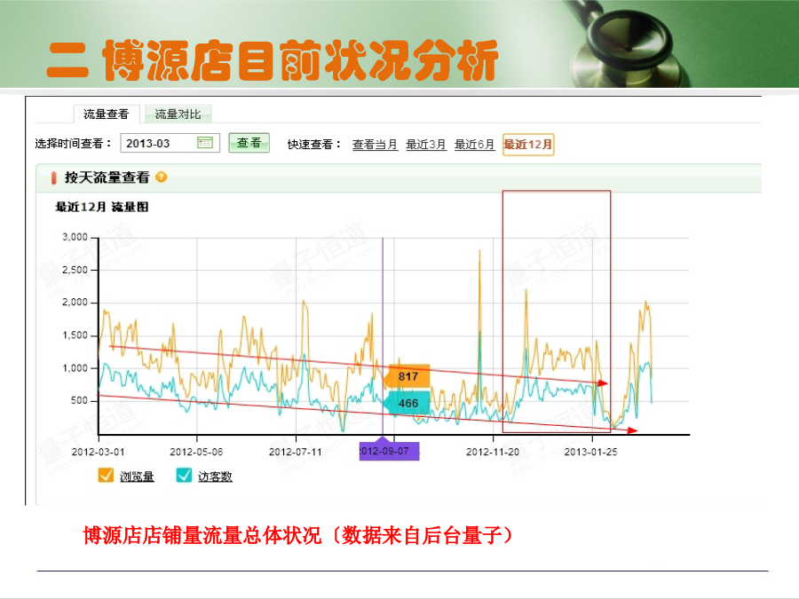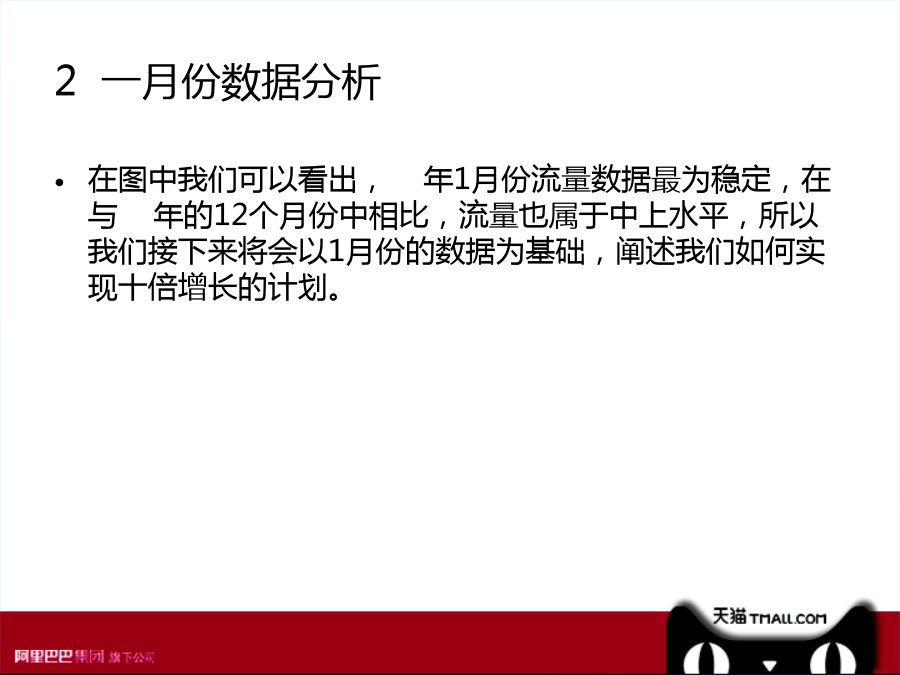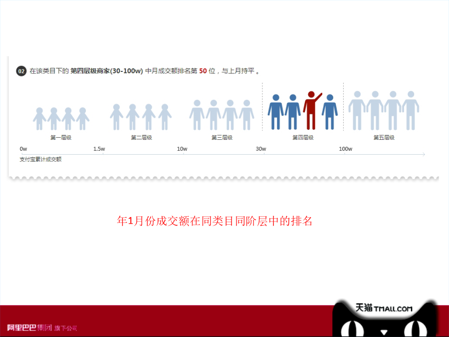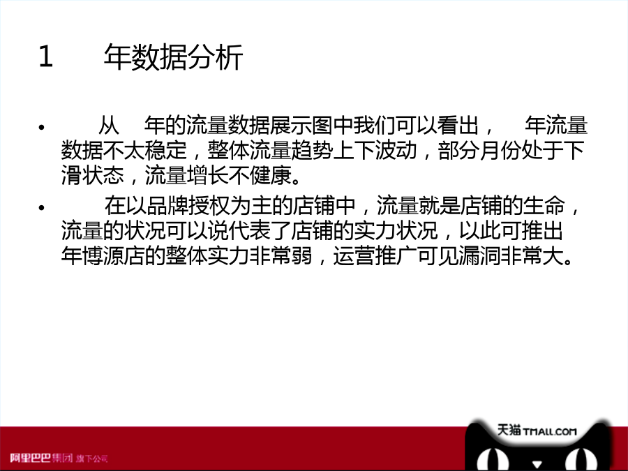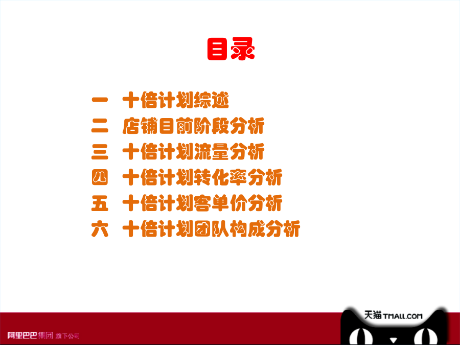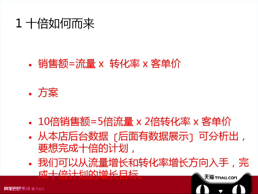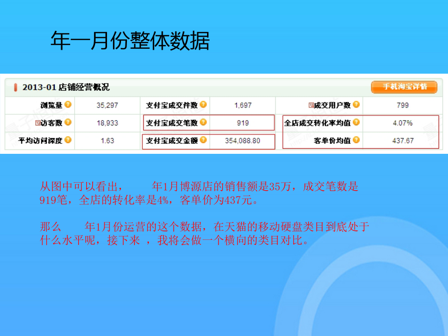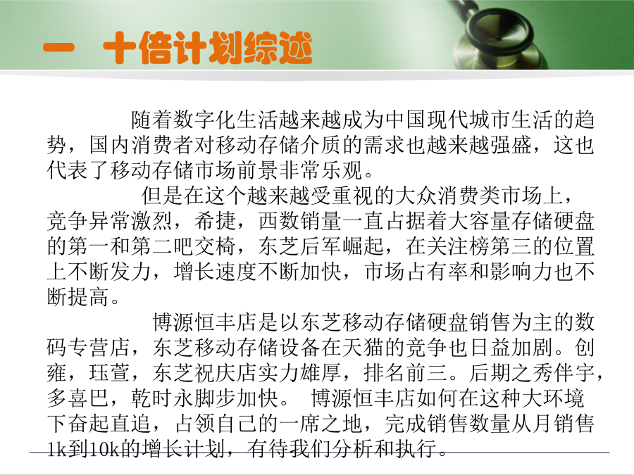 博源恒丰店十倍增长计划表目录一十倍计划综述1十倍如何而来二博源店目前状况分析1年数据分析2一月份数据分析买v6送便签本买slim500g送手表等2、策划并制定网络店铺及产品推广方案〔包括淘宝推广、SEO、论坛推广、博客营销、旺旺推广等〕等营销工作;付费流量主要为直通车流量,占比38%缺少活动流量和淘宝客流量。(一〕店长〔主管)1-2人1年数据分析从本店后台数据〔后面有数据展示〕可分析出,要想完成十倍的计划,从图中可以看出年1月份,店铺流量来源构成主要为直通车10418,占比38.主打款保持与竞争对手的优势从与同类目同阶层的商家对比图中我们可以看出,博源店年1月份的店铺整体转化率低于42%,属于博源店的薄弱环节。博源恒丰店一月份流量状况3把店内的活动信息尽量展现给客人7%,月总流量低于同类目同阶层商家平均值69.3、研究竞争对手的推广方案,向店长提出推广建议;3、研究竞争对手的推广方案,向店长提出推广建议;服务态度售前售中售后术语1月份运营数据在同类目下的排名年1月份成交额在同类目同阶层中的排名从数据图中可以看出,博源店的月成交额低于同类目同阶层商家平均值38.7%,月总流量低于同类目同阶层商家平均值69.1%,转化率低于同类目同阶层商家平均值42%,而客单价我们处于比较优势状态,426元高于同类目同阶层商家平均水平89.7%。一月份成交额大致状况博源恒丰十倍计划流量增长和广告费支出计划表三十倍计划流量分析在一月份的运营体检报告中,我们可以看出,博源店的流量总量低于同层商家的平均值,其中搜索流量和淘宝客流量,活动流量〔包括商城专题和聚划算等〕都大大低于同阶层,而直通车所占流量却大大的高于了同类目的平均值。1月份流量结构分析四十倍计划转化率分析和店铺的转化率相关的因素有:1流量的精准性2店铺的设计〔首页设计,店铺详情页设计,产品卖点设计,产品文案设计)3促销活动4宝贝的价格5宝贝的评价6客服的引导和服务流量精准性解决方案1搜索优化2直通车提高转化率3选择合适的平台报名活动4增加爆款的淘宝客流量5建立完善的会员关系管理体系店铺设计解决方案1首页改版突出重点推广款,活动款排版更加有序大气,促销性强2详情页优化升级突出产品卖点和售后保证,博源店目前详情页文案都以产品叙述性为主.3文案更注重销售性和促销的及时性促销活动解决方案经常性的举行店内的促销活动,塑造促销氛围宝贝的价格解决方案主打款保持与竞争对手的优势宝贝的评价解决方式店内举行好评送礼好评有奖等互动活动客服的引导和服务五十倍计划客单价分析与客单价相关的因素1产品单价2关联销售3活动促销4客服建议性销售1产品单价解决方案1店铺销售进行竞品分析,找出有市场机会的产品,做出爆款推广计划。2合理布局店铺内产品价格矩阵,与店铺定位相结合2关联销售解决方案1详情页进行关联销售2sku选择处进行关联销售3活动促销解决方案1举行店内的满减满送活动如满500元减5元满1000元减15元买v6送便签本买slim500g送手表等2节日促销活动策划以各种节日为主题的促销活动4客服建议性销售解决方案1旺旺活动自动回复如加20元购买8g无包装u盘2引导客人多买3把店内的活动信息尽量展现给客人如店内有满减活动哦满500减5元满1000减15六十倍计划团队构成分析店长推行2、负责网店日常改版策划、上架、推行、销售、售后服务等经营与管2节日促销活动6%的转化率,是我们追求的目标,那么,转化率到底和店铺哪些因素有关呢,我们应该从哪些方面入手优化博源店铺的转化率呢?负责收集市场和行业信息,提供有效应对方案;经常性的举行店内的促销活动,塑造促销氛围6、对淘宝网店本公司产品,随时上网查看,对产品机理等等一些专付费流量主要为直通车流量,占比38%缺少活动流量和淘宝客流量。老客户流量占比17%,所占比例略低,但出于类目情况考虑,移动硬盘重复购买较低,所以15%这个比例还是可以的。3选择合适的平台报名活动6、制定销售计划,带领团队完成销售业绩目标;我们可以从流量增长和转化率增长方向入手,完成十倍计划的增长目标。从本店后台数据〔后面有数据展示〕可分析出,要想完成十倍的计划,1、负责公司淘宝交易平台推广工作;3、研究竞争对手的推广方案,向店长提出推广建议;3、按发货单正确执行商品包装工作,准时准确完成包装任务2、负责网店日常改版策划、上架、推行、销售、售后服务等经营与管博源店店铺量流量总体状况〔数据来自后台量子)客服仓库技术支持谢谢