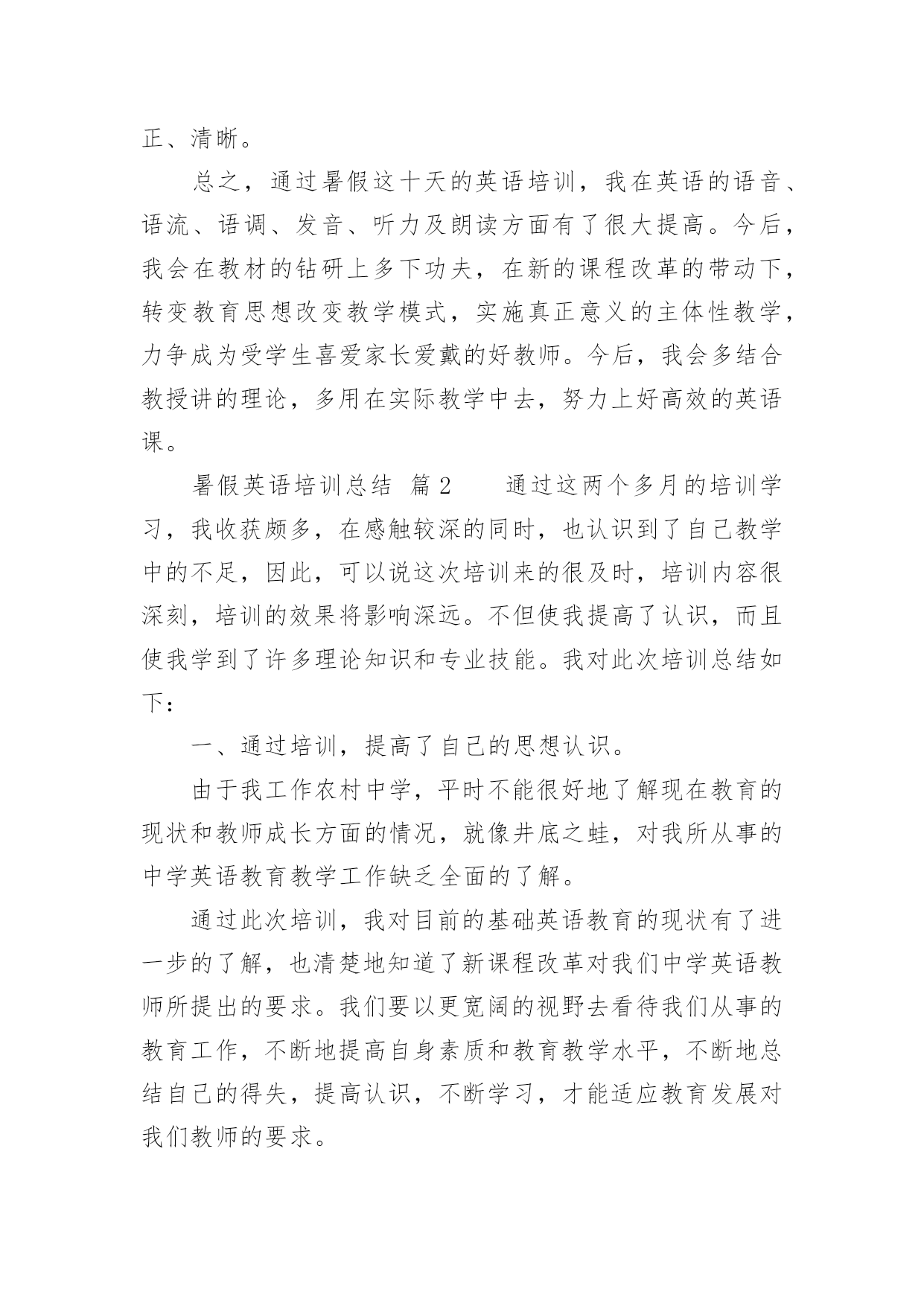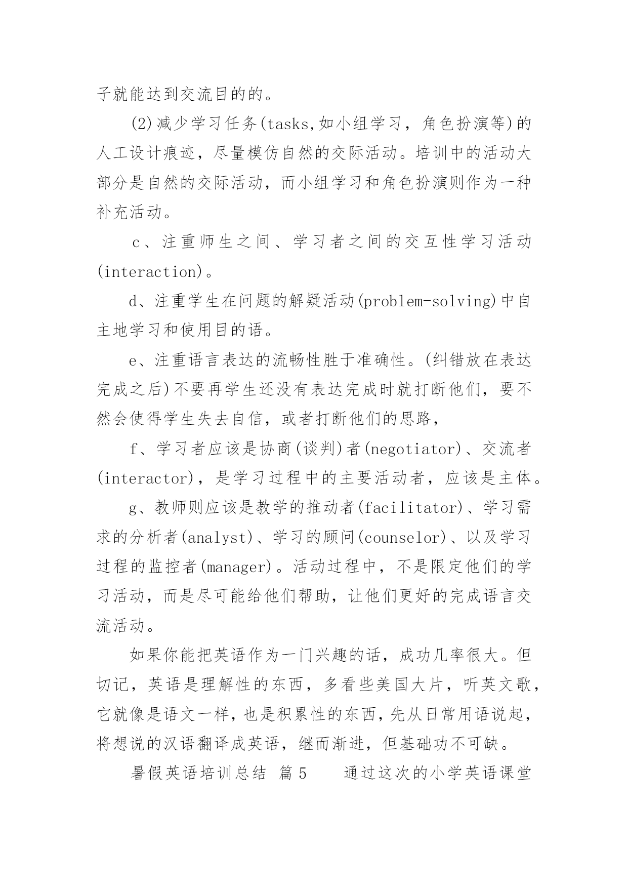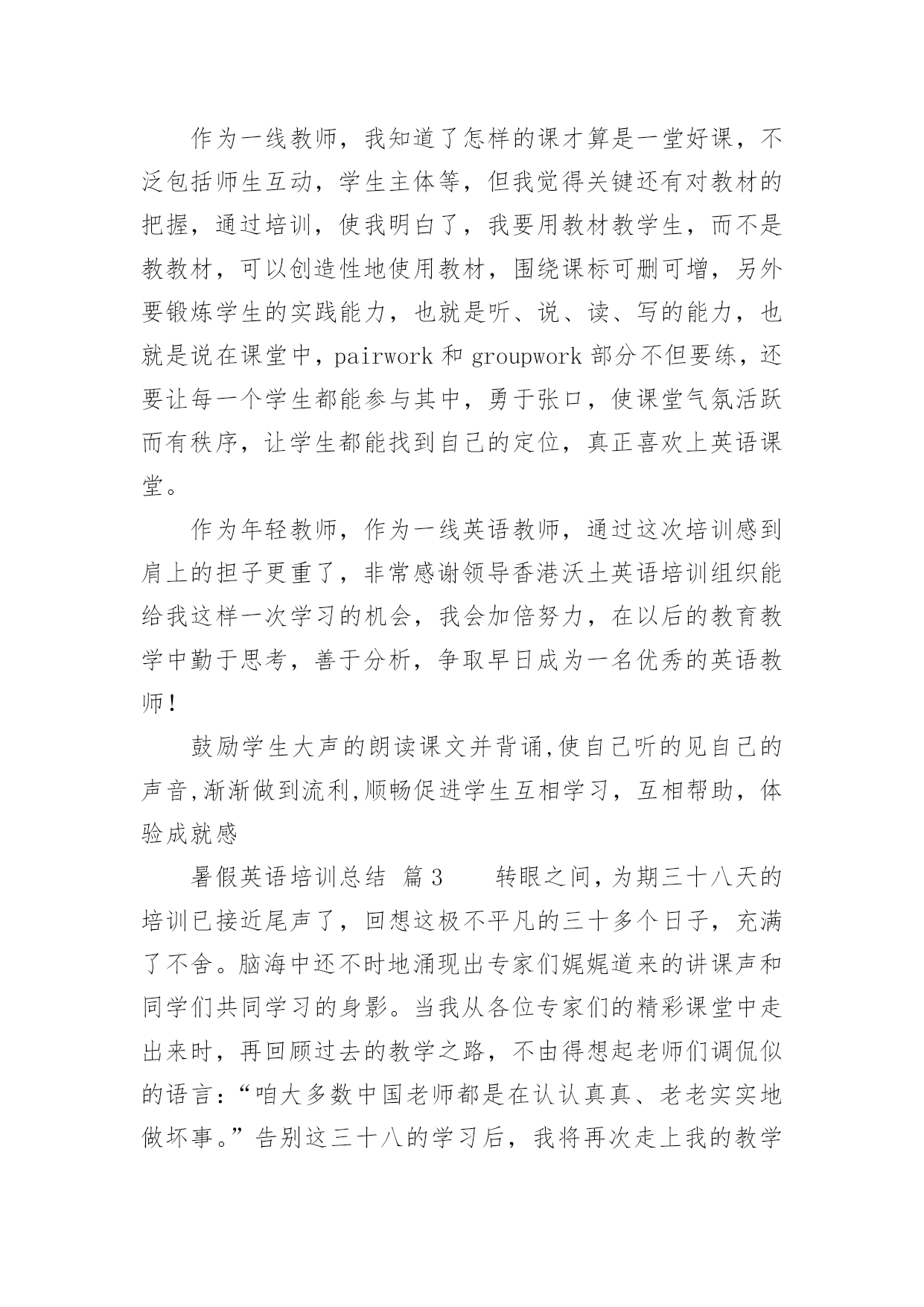 暑假英语培训总结暑假英语培训总结(通用15篇)总结是指对某一阶段的工作、学习或思想中的经验或情况进行分析研究,做出带有规律性结论的书面材料,他能够提升我们的书面表达能力,让我们一起认真地写一份总结吧。我们该怎么写总结呢?下面是小编为大家收集的暑假英语培训总结,欢迎阅读与收藏。暑假英语培训总结篇1全县小学英语教师在二中进行了为期八天的暑假培训,我也是其中的一员,炎炎夏日,但我非常高兴能接受这次培训,对我受益匪浅,心情感慨万分,特别是专家、学者地道的发音,塑窗的教学设计,先进的英语教学理念,真是令人佩服之极,我觉得这次学习对我来说是非常有效和必要的,现将我的培训心得体会如下:在这次培训中,我们接受了语音、口语、语法等各种讲座,而我在学习的过程中完全将自己转换成学生的角色,认真学习,因为那里有无限的老师吸引我。各位教师就像一个知识丰富的图书馆,馆中的每一本书都是我学习的内容。的确如此,从这次培训中我学习到了许多东西,比如在以前的教学中,对于英语的语法过于重视,而忽视了英语作为一种语言,也要注重它的应用性。在英语中也是有许多文化内涵的。还有我们农村教师接触纯真英语的机会比较少,这次的培训留美教授的演讲,让我们的口语有了很大的提高,并长了很多见识!县教研室的王振龙老师,让我们的口语大大提高,他的报告总是让我学到很多知识,我们可以听到一口流利的英语,还可以练就自己的口语,他到过美国留过学。在这次培训中,我们了解到了英语教学中的最新理念,用心得教学理念武装自己的头脑。将理论联系到实际中,为我们在教学战线上注入了新的血液,使每节课都有不少的收获,真是受益匪浅!语音课上,让我学到了很多知识,在语音上课中,我不仅领略了老师的标准的英语发音,还纠正了很多我口语中的错误对于一个乡村教师来说,是非常有用的,我要教自己的学生发音,如果错了将会误导自己的`学生,所以在培训后,我可以减少在教学中的错误,让学生学得更好,让我们的口语有了很大的提高,会将步步高升!在最后的三天中,我们听了来自各个学校老师们的经验介绍,我深深体会到:语言积累之本是厚积薄发,举一反三,在课堂教学中,我知道了让学生学什么,怎么学,培养学生的语言综合运用能力;如何让学生愿意学习,在今后的教学中,我会精心设计每一堂课,鼓励学生做课堂的主人,自己做学生的帮手和学伴,尽量让学生自学创新学习,尽最大努力少批评甚至不批评学生!每节课都热情饱满的上课,平等对待每一个学生,科学设计家庭作业,对同学们提出的合理化建议和意见,尽早的融入课堂教学中,做到学生提出的建议并改正,扩大词汇量,让学生多听、多利用音像设备,特别是在词汇教学中,将单词外形和发音结合起来教学。一定做到语音正确、流利、纯正、清晰。总之,通过暑假这十天的英语培训,我在英语的语音、语流、语调、发音、听力及朗读方面有了很大提高。今后,我会在教材的钻研上多下功夫,在新的课程改革的带动下,转变教育思想改变教学模式,实施真正意义的主体性教学,力争成为受学生喜爱家长爱戴的好教师。今后,我会多结合教授讲的理论,多用在实际教学中去,努力上好高效的英语课。暑假英语培训总结篇2通过这两个多月的培训学习,我收获颇多,在感触较深的同时,也认识到了自己教学中的不足,因此,可以说这次培训来的很及时,培训内容很深刻,培训的效果将影响深远。不但使我提高了认识,而且使我学到了许多理论知识和专业技能。我对此次培训总结如下:一、通过培训,提高了自己的思想认识。由于我工作农村中学,平时不能很好地了解现在教育的现状和教师成长方面的情况,就像井底之蛙,对我所从事的中学英语教育教学工作缺乏全面的了解。通过此次培训,我对目前的基础英语教育的现状有了进一步的了解,也清楚地知道了新课程改革对我们中学英语教师所提出的要求。我们要以更宽阔的视野去看待我们从事的教育工作,不断地提高自身素质和教育教学水平,不断地总结自己的得失,提高认识,不断学习,才能适应教育发展对我们教师的要求。二、通过培训,学习到了许多的理论知识和专业技能知识。本届中学英语培训,内容丰富,多样:有专家在线研讨,有精彩的专题视频,有班级、学科的精彩简报,有学员的各种精彩文章、作业,有专家、辅导教师和学员精彩的互动点评。在在线研讨和专题视频中,专家们用他们质朴的语言,渊博的知识,先进的教育理念来点亮我们对知识的渴求和对教育的执着追求,每一次观看视频、每一次在线研讨,都如坐春风,如沐春雨,使我的教育教学观念发生了很大的变化,也剖析出我们课堂中许多不足之处。这些理论知识正是我们教学活动设计、教学实践的依据。更值得一提的是此次培训注重理论联系实际,在提升学员理论水平的基础上,回归课堂,各专家和辅导老师指导教学实践,通过在线点评和线下指导,指点迷津,从而使自己的理论知识和专业技能水平得到尽快提高。一年时光很快就过去了,回顾一年来的工作,