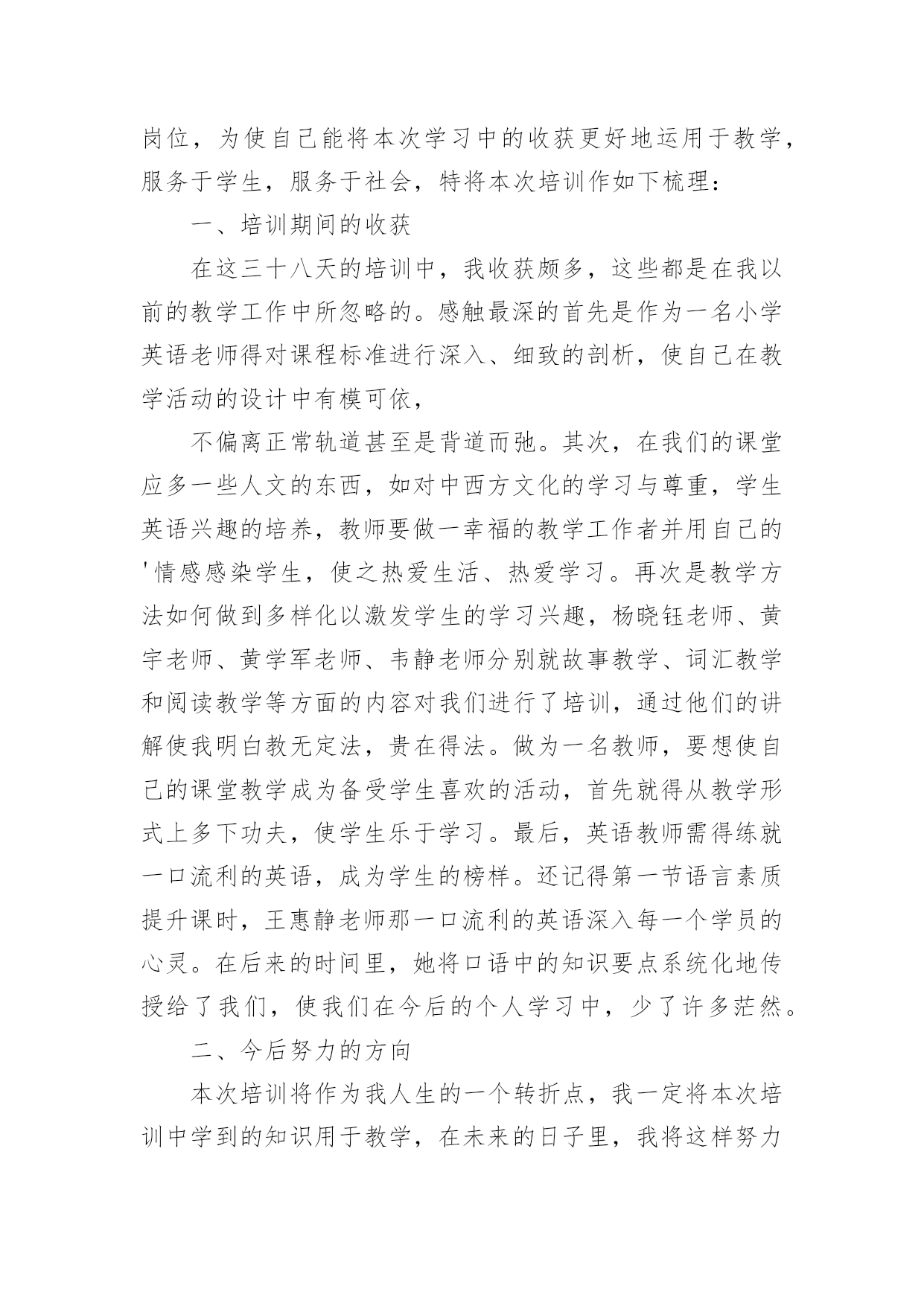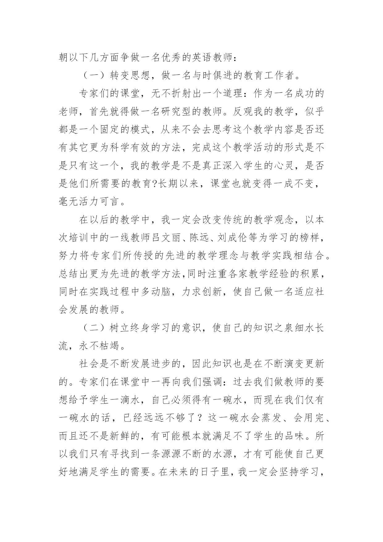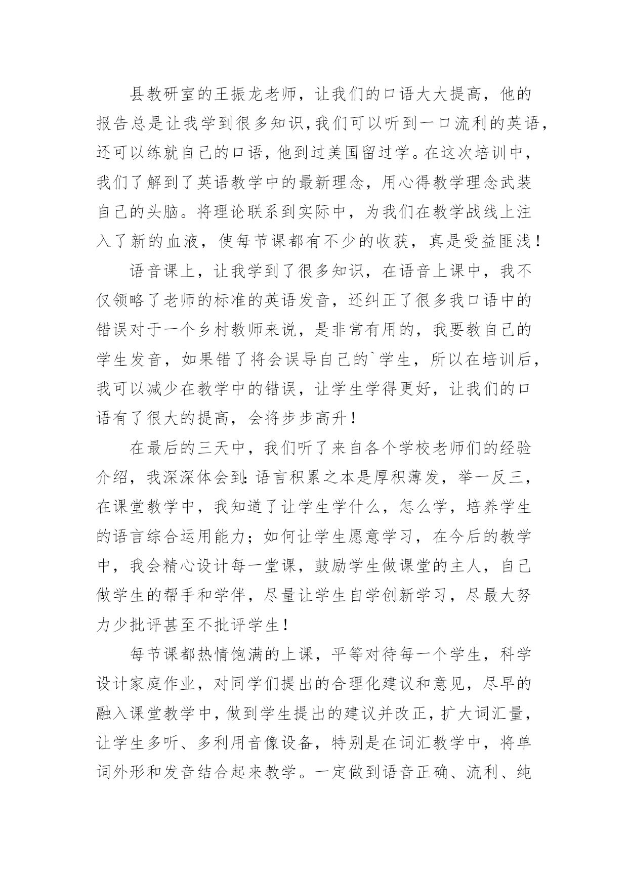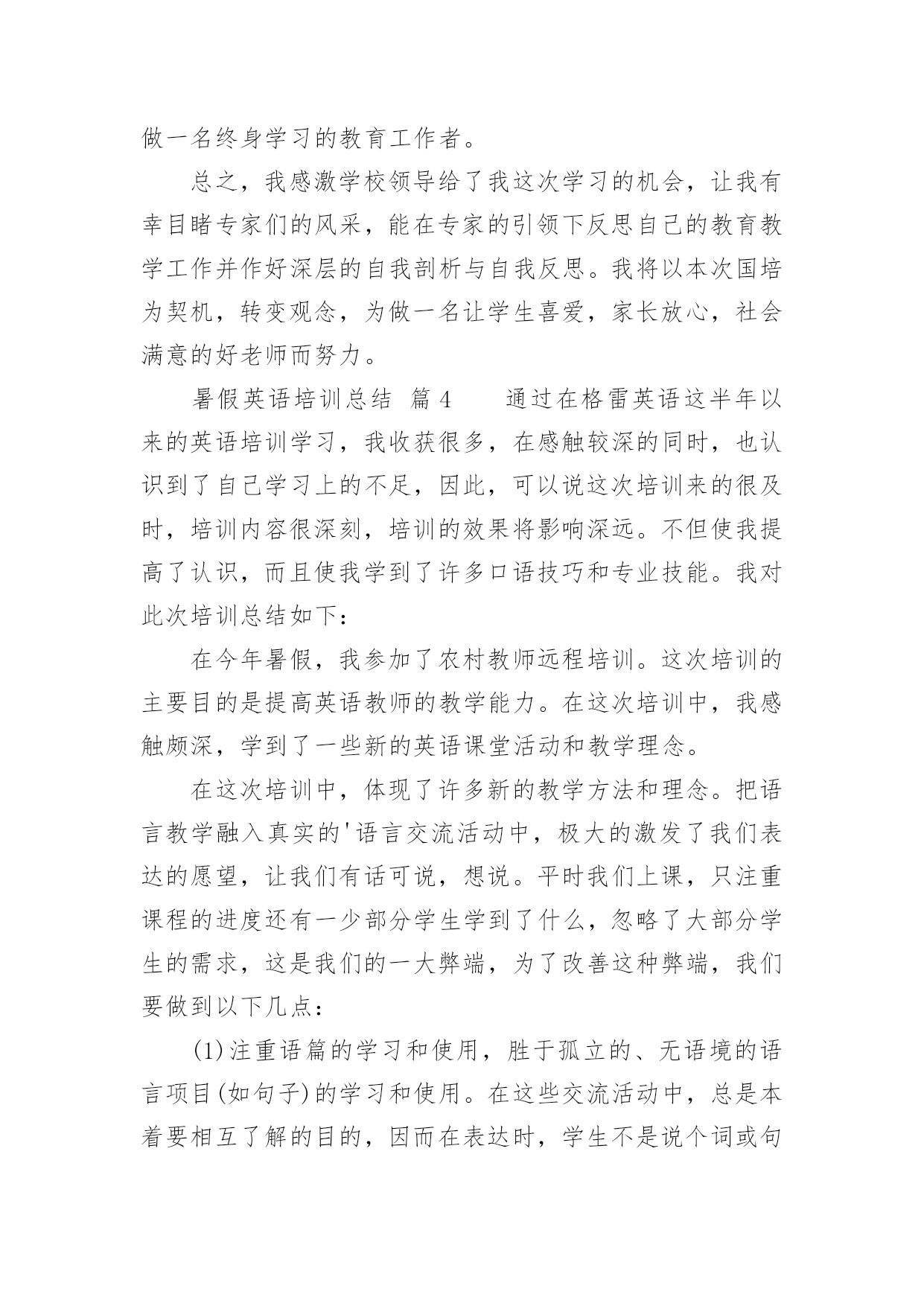暑假英语培训总结暑假英语培训总结(通用15篇)总结是指对某一阶段的工作、学习或思想中的经验或情况进行分析研究,做出带有规律性结论的书面材料,他能够提升我们的书面表达能力,让我们一起认真地写一份总结吧。我们该怎么写总结呢?下面是小编为大家收集的暑假英语培训总结,欢迎阅读与收藏。暑假英语培训总结篇1全县小学英语教师在二中进行了为期八天的暑假培训,我也是其中的一员,炎炎夏日,但我非常高兴能接受这次培训,对我受益匪浅,心情感慨万分,特别是专家、学者地道的发音,塑窗的教学设计,先进的英语教学理念,真是令人佩服之极,我觉得这次学习对我来说是非常有效和必要的,现将我的培训心得体会如下:在这次培训中,我们接受了语音、口语、语法等各种讲座,而我在学习的过程中完全将自己转换成学生的角色,认真学习,因为那里有无限的老师吸引我。各位教师就像一个知识丰富的图书馆,馆中的每一本书都是我学习的内容。的确如此,从这次培训中我学习到了许多东西,比如在以前的教学中,对于英语的语法过于重视,而忽视了英语作为一种语言,也要注重它的应用性。在英语中也是有许多文化内涵的。还有我们农村教师接触纯真英语的机会比较少,这次的培训留美教授的演讲,让我们的口语有了很大的提高,并长了很多见识!县教研室的王振龙老师,让我们的口语大大提高,他的报告总是让我学到很多知识,我们可以听到一口流利的英语,还可以练就自己的口语,他到过美国留过学。在这次培训中,我们了解到了英语教学中的最新理念,用心得教学理念武装自己的头脑。将理论联系到实际中,为我们在教学战线上注入了新的血液,使每节课都有不少的收获,真是受益匪浅!语音课上,让我学到了很多知识,在语音上课中,我不仅领略了老师的标准的英语发音,还纠正了很多我口语中的错误对于一个乡村教师来说,是非常有用的,我要教自己的学生发音,如果错了将会误导自己的`学生,所以在培训后,我可以减少在教学中的错误,让学生学得更好,让我们的口语有了很大的提高,会将步步高升!在最后的三天中,我们听了来自各个学校老师们的经验介绍,我深深体会到:语言积累之本是厚积薄发,举一反三,在课堂教学中,我知道了让学生学什么,怎么学,培养学生的语言综合运用能力;如何让学生愿意学习,在今后的教学中,我会精心设计每一堂课,鼓励学生做课堂的主人,自己做学生的帮手和学伴,尽量让学生自学创新学习,尽最大努力少批评甚至不批评学生!每节课都热情饱满的上课,平等对待每一个学生,科学设计家庭作业,对同学们提出的合理化建议和意见,尽早的融入课堂教学中,做到学生提出的建议并改正,扩大词汇量,让学生多听、多利用音像设备,特别是在词汇教学中,将单词外形和发音结合起来教学。一定做到语音正确、流利、纯正、清晰。总之,通过暑假这十天的英语培训,我在英语的语音、语流、语调、发音、听力及朗读方面有了很大提高。今后,我会在教材的钻研上多下功夫,在新的课程改革的带动下,转变教育思想改变教学模式,实施真正意义的主体性教学,力争成为受学生喜爱家长爱戴的好教师。今后,我会多结合教授讲的理论,多用在实际教学中去,努力上好高效的英语课。暑假英语培训总结篇2通过这两个多月的培训学习,我收获颇多,在感触较深的同时,也认识到了自己教学中的不足,因此,可以说这次培训来的很及时,培训内容很深刻,培训的效果将影响深远。不但使我提高了认识,而且使我学到了许多理论知识和专业技能。我对此次培训总结如下:一、通过培训,提高了自己的思想认识。由于我工作农村中学,平时不能很好地了解现在教育的现状和教师成长方面的情况,就像井底之蛙,对我所从事的中学英语教育教学工作缺乏全面的了解。通过此次培训,我对目前的基础英语教育的现状有了进一步的了解,也清楚地知道了新课程改革对我们中学英语教师所提出的要求。我们要以更宽阔的视野去看待我们从事的教育工作,不断地提高自身素质和教育教学水平,不断地总结自己的得失,提高认识,不断学习,才能适应教育发展对我们教师的要求。二、通过培训,学习到了许多的理论知识和专业技能知识。本届中学英语培训,内容丰富,多样:有专家在线研讨,有精彩的专题视频,有班级、学科的精彩简报,有学员的各种精彩文章、作业,有专家、辅导教师和学员精彩的互动点评。在在线研讨和专题视频中,专家们用他们质朴的语言,渊博的知识,先进的教育理念来点亮我们对知识的渴求和对教育的执着追求,每一次观看视频、每一次在线研讨,都如坐春风,如沐春雨,使我的教育教学观念发生了很大的变化,也剖析出我们课堂中许多不足之处。这些理论知识正是我们教学活动设计、教学实践的依据。更值得一提的是此次培训注重理论联系实际,在提升学员理论水平的基础上,回归课堂,各专家和辅导老师指导教学实践,通过在线点评和线下指导,指点迷津,从而使自己的理论知识和专业技能水平得到尽快提高。一年时光很快就过去了,回顾一年来的工作,