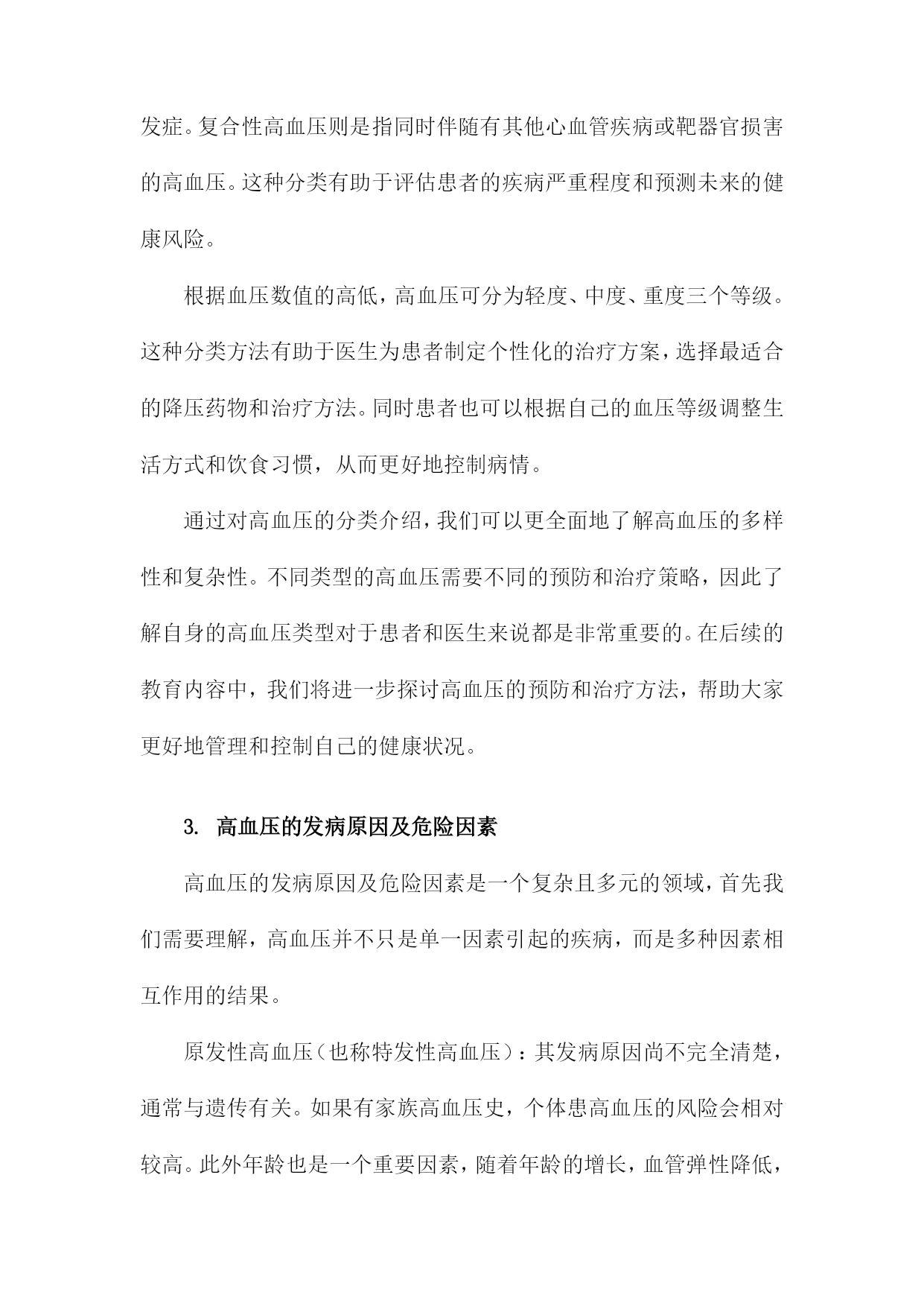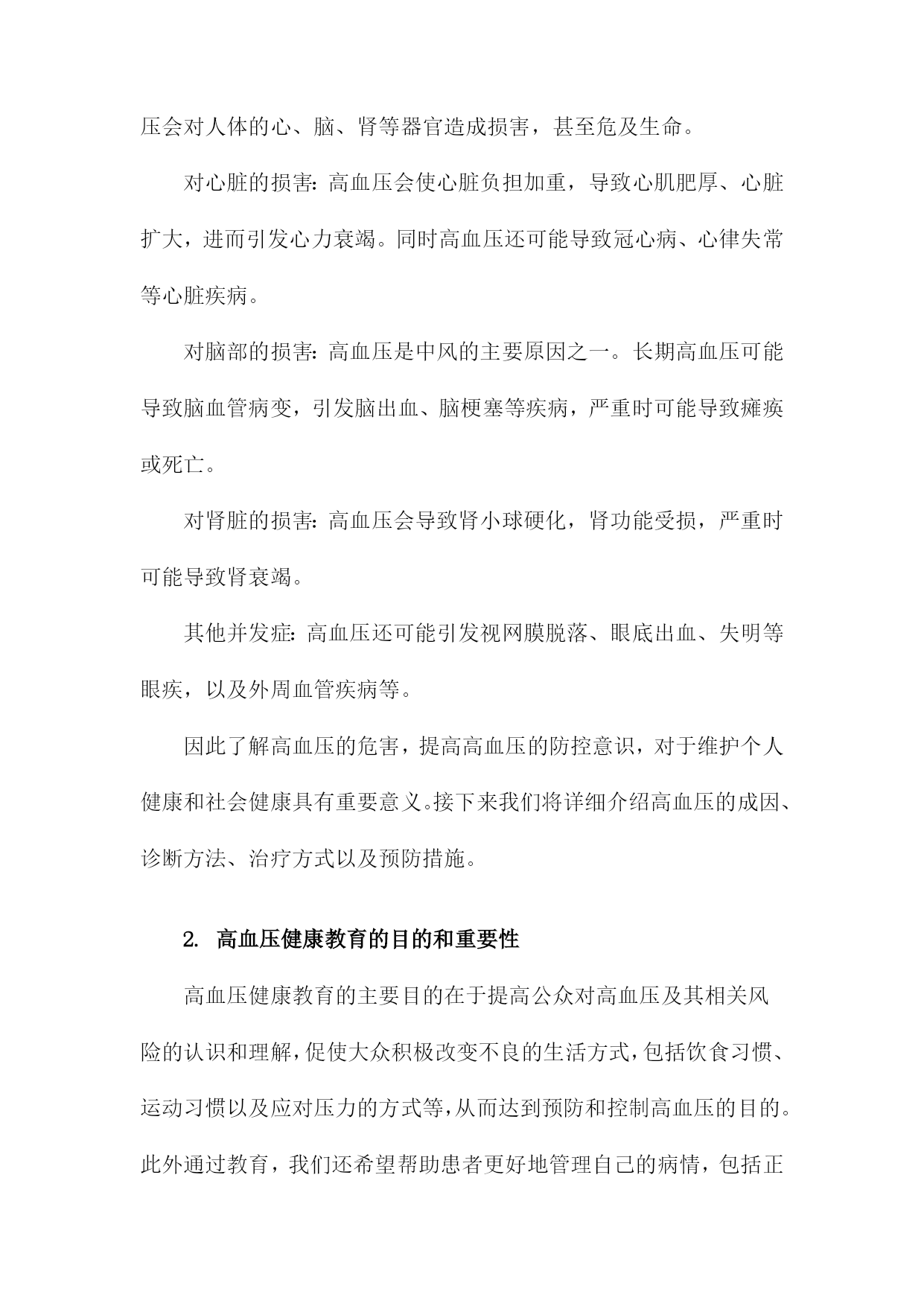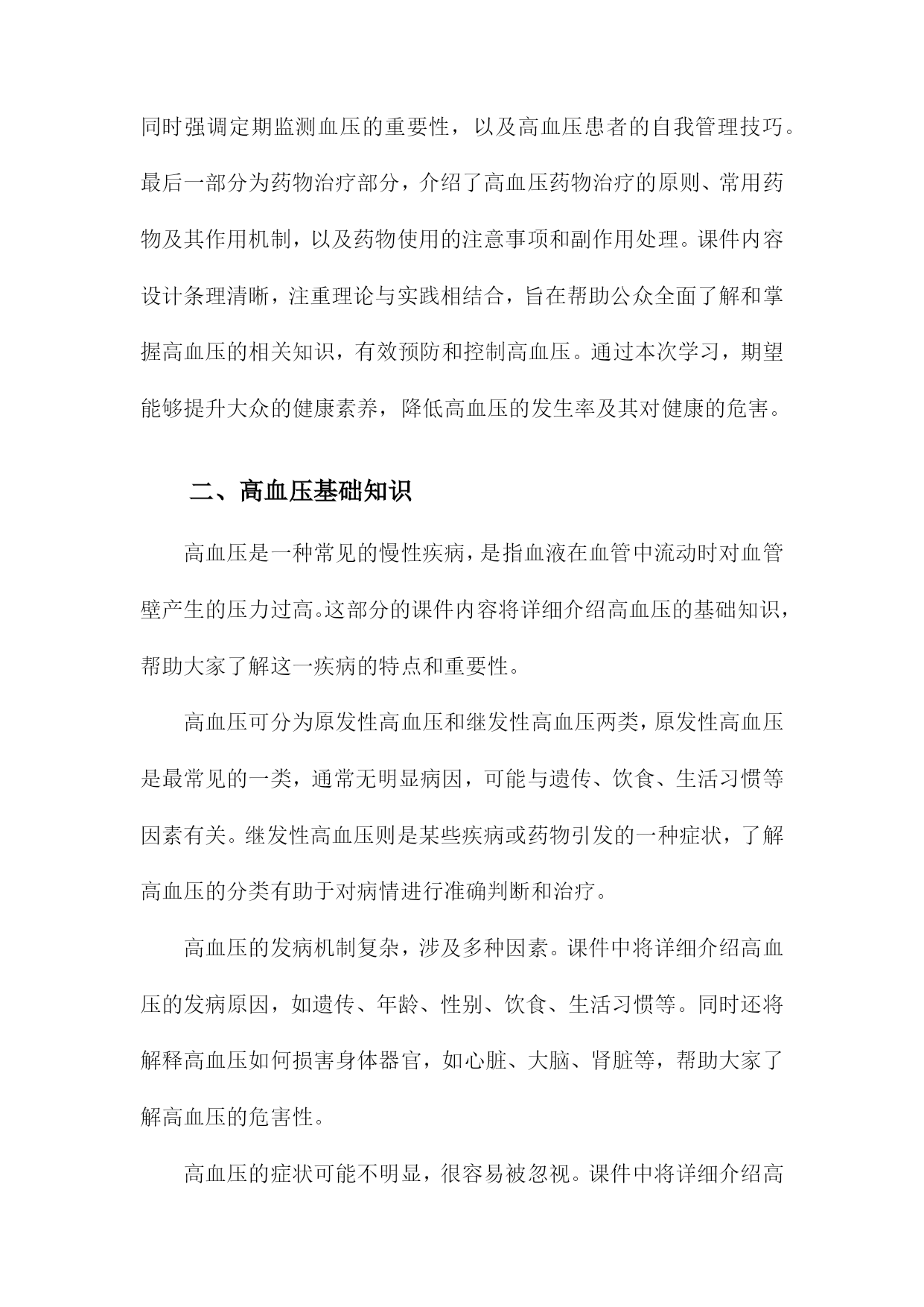 《高血压健康教育》课件一、概要随着现代社会生活方式的改变,高血压的发病率不断上升,已经成为一种广泛流行的慢性疾病。高血压不仅影响人们的身体健康,也给社会经济带来巨大负担。因此高血压的健康教育显得尤为重要,本课件《高血压健康教育》旨在提高公众对高血压的认识,了解高血压的危害,掌握预防和控制高血压的方法和技巧。课件内容涵盖了高血压的基本知识、发病原因、临床表现、诊断标准、治疗方法和预防措施等方面,通过深入浅出的讲解,使受众全面了解高血压的相关知识,从而提高自我保健意识,降低高血压的发病率和患病率。同时本课件也强调了高血压患者的心理调适和生活方式改善的重要性,旨在帮助患者建立科学、健康的生活方式,提高生活质量。1.高血压的普遍性和危害高血压是一种常见的慢性疾病,已经成为全球性的健康问题。随着现代生活方式的改变,高血压的患病率不断攀升,越来越多的人受到其困扰。高血压的普遍性体现在各个年龄段、性别和地域的人群中,且往往与不良的生活习惯、遗传因素等多种因素有关。高血压是一种潜在的“隐形杀手”,其危害不容忽视。长期高血压会对人体的心、脑、肾等器官造成损害,甚至危及生命。对心脏的损害:高血压会使心脏负担加重,导致心肌肥厚、心脏扩大,进而引发心力衰竭。同时高血压还可能导致冠心病、心律失常等心脏疾病。对脑部的损害:高血压是中风的主要原因之一。长期高血压可能导致脑血管病变,引发脑出血、脑梗塞等疾病,严重时可能导致瘫痪或死亡。对肾脏的损害:高血压会导致肾小球硬化,肾功能受损,严重时可能导致肾衰竭。其他并发症:高血压还可能引发视网膜脱落、眼底出血、失明等眼疾,以及外周血管疾病等。因此了解高血压的危害,提高高血压的防控意识,对于维护个人健康和社会健康具有重要意义。接下来我们将详细介绍高血压的成因、诊断方法、治疗方式以及预防措施。2.高血压健康教育的目的和重要性高血压健康教育的主要目的在于提高公众对高血压及其相关风险的认识和理解,促使大众积极改变不良的生活方式,包括饮食习惯、运动习惯以及应对压力的方式等,从而达到预防和控制高血压的目的。此外通过教育,我们还希望帮助患者更好地管理自己的病情,包括正确使用药物、有效监测血压以及及时寻求医疗帮助等,从而提高高血压患者的治疗率和控制率。高血压作为一种常见且多发的慢性疾病,对于人们的健康构成了严重威胁。由于高血压常常在初期没有明显的症状,因此很多人对其缺乏足够的重视,常常导致病情恶化,甚至引发严重并发症。因此开展高血压健康教育至关重要,通过教育我们可以提高公众的健康意识,使人们认识到高血压的危害,从而主动采取预防措施。同时对于已经患病的人群,教育可以帮助他们更好地管理病情,减少并发症的发生,提高生活质量。此外高血压健康教育还能帮助医疗资源更好地分配和利用,减轻医疗压力。高血压健康教育是提高公众健康水平、预防和控制高血压的重要手段。通过教育我们可以提高公众的健康意识,促进健康行为的形成,从而有效预防和控制高血压。3.课件内容的简要介绍本课件主要分为四个部分进行高血压健康教育的介绍,第一部分为高血压概述,介绍了高血压的定义、分类、发病原因以及常见症状。第二部分为高血压的危害,详细阐述了高血压对人体各系统的损害,以及高血压并发其他慢性疾病的风险。第三部分为重点内容的高血压预防与管理,包括合理饮食、适量运动、心理调适、规律作息等方面,同时强调定期监测血压的重要性,以及高血压患者的自我管理技巧。最后一部分为药物治疗部分,介绍了高血压药物治疗的原则、常用药物及其作用机制,以及药物使用的注意事项和副作用处理。课件内容设计条理清晰,注重理论与实践相结合,旨在帮助公众全面了解和掌握高血压的相关知识,有效预防和控制高血压。通过本次学习,期望能够提升大众的健康素养,降低高血压的发生率及其对健康的危害。二、高血压基础知识高血压是一种常见的慢性疾病,是指血液在血管中流动时对血管壁产生的压力过高。这部分的课件内容将详细介绍高血压的基础知识,帮助大家了解这一疾病的特点和重要性。高血压可分为原发性高血压和继发性高血压两类,原发性高血压是最常见的一类,通常无明显病因,可能与遗传、饮食、生活习惯等因素有关。继发性高血压则是某些疾病或药物引发的一种症状,了解高血压的分类有助于对病情进行准确判断和治疗。高血压的发病机制复杂,涉及多种因素。课件中将详细介绍高血压的发病原因,如遗传、年龄、性别、饮食、生活习惯等。同时还将解释高血压如何损害身体器官,如心脏、大脑、肾脏等,帮助大家了解高血压的危害性。高血压的症状可能不明显,很容易被忽视。课件中将详细介绍高血压的常见症状,如头痛、头晕、耳鸣、胸闷等。此外还将强调高血压并发症的危害性,提醒大家关注自身健康。高血压的诊断主要依据血压测量值,课件中将介绍高血压的诊断标准、诊断方