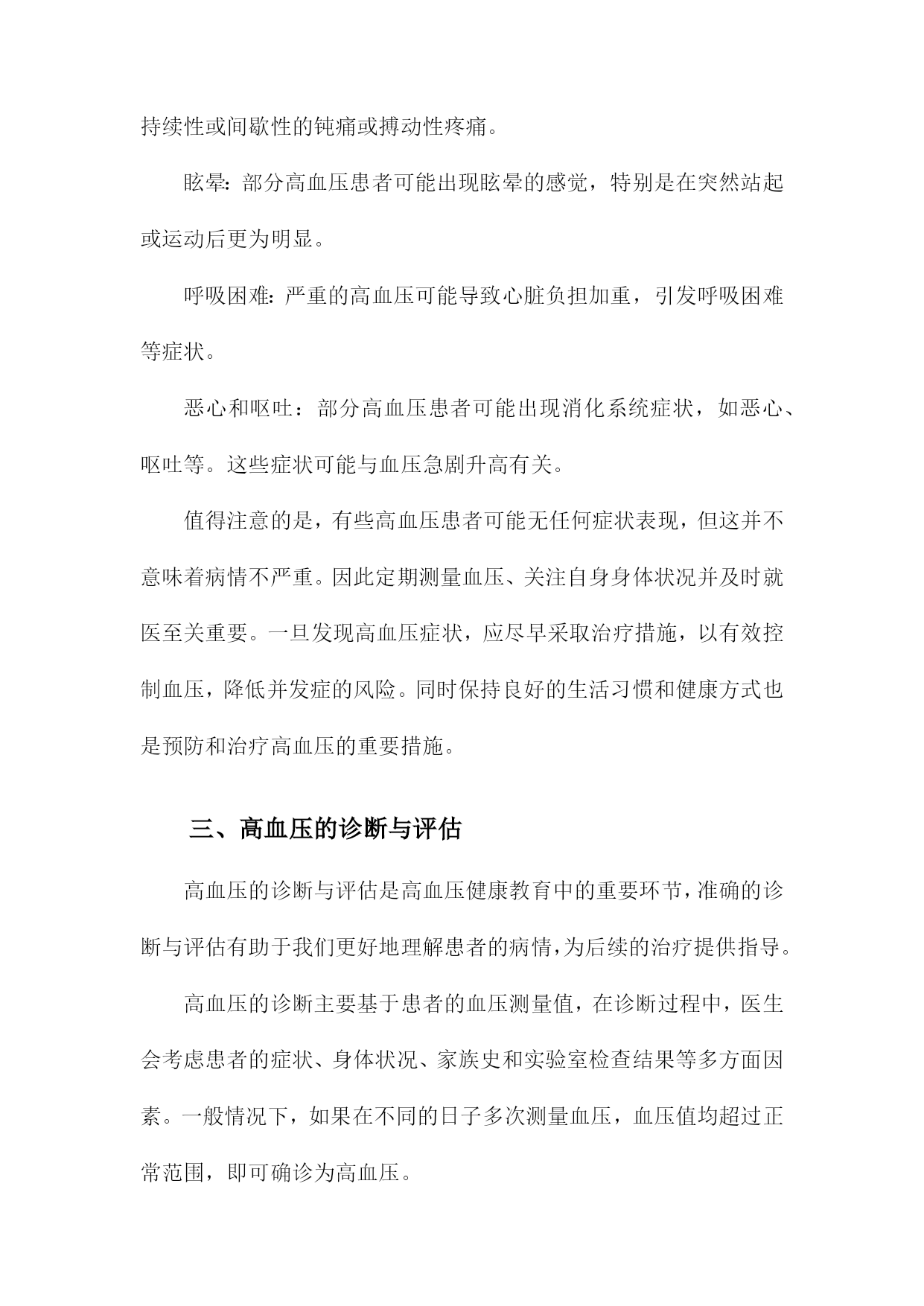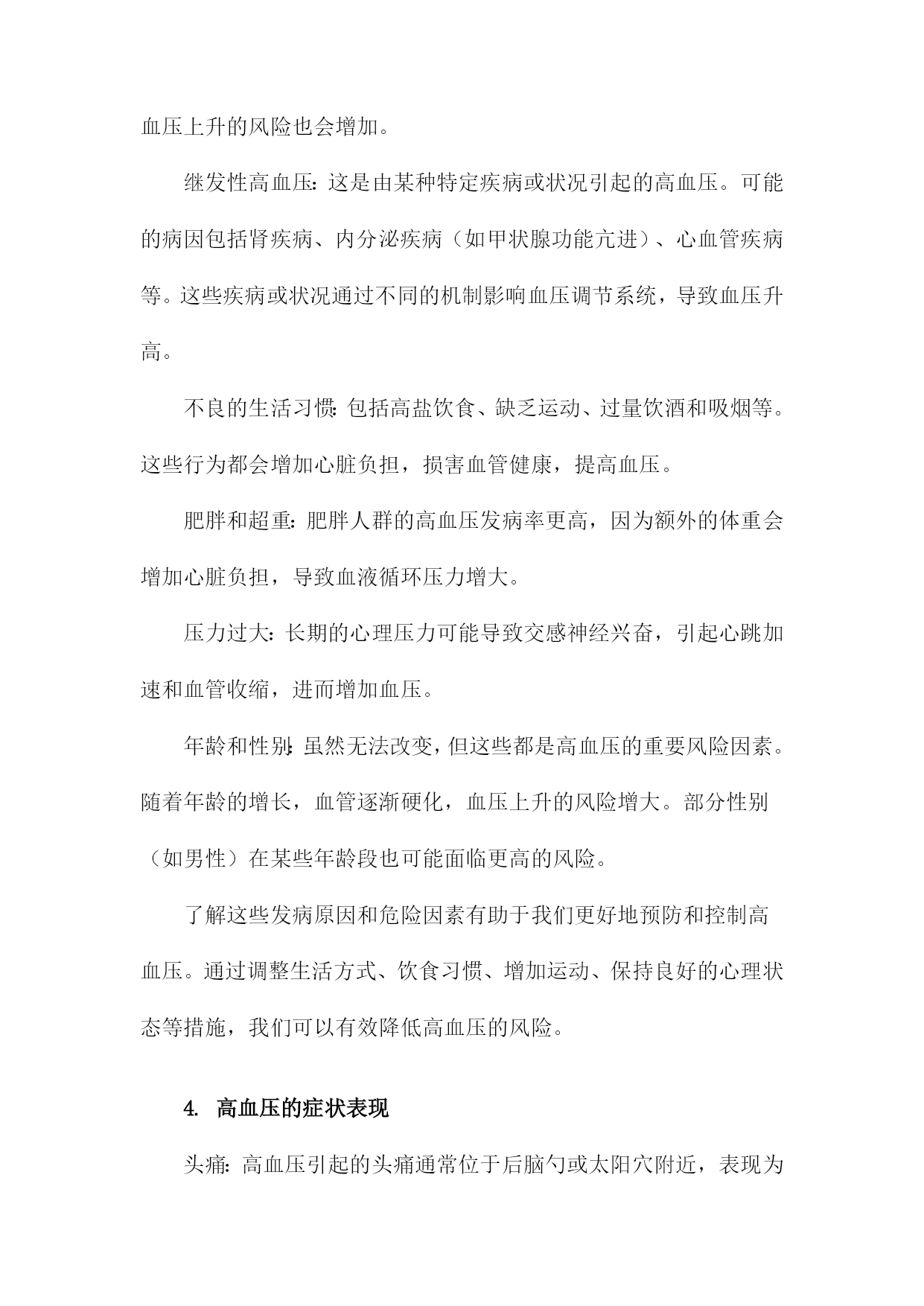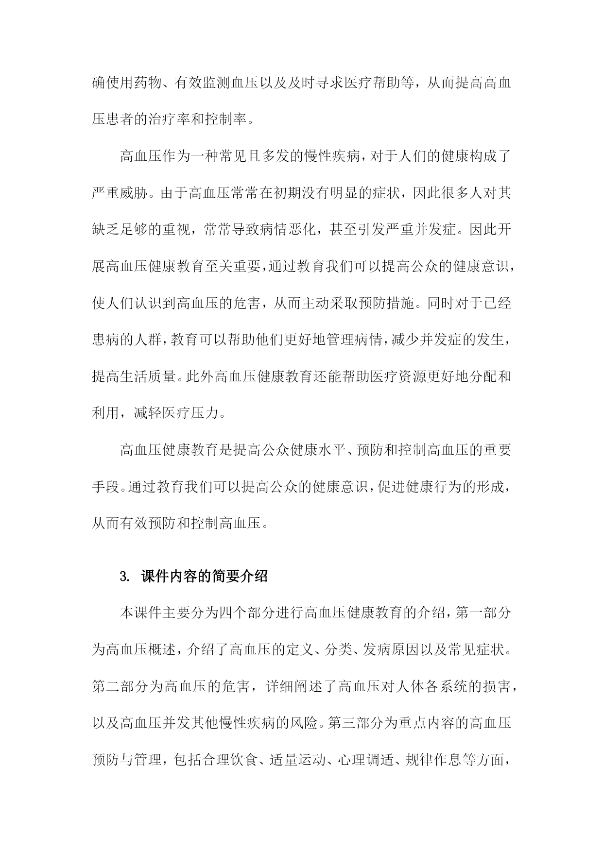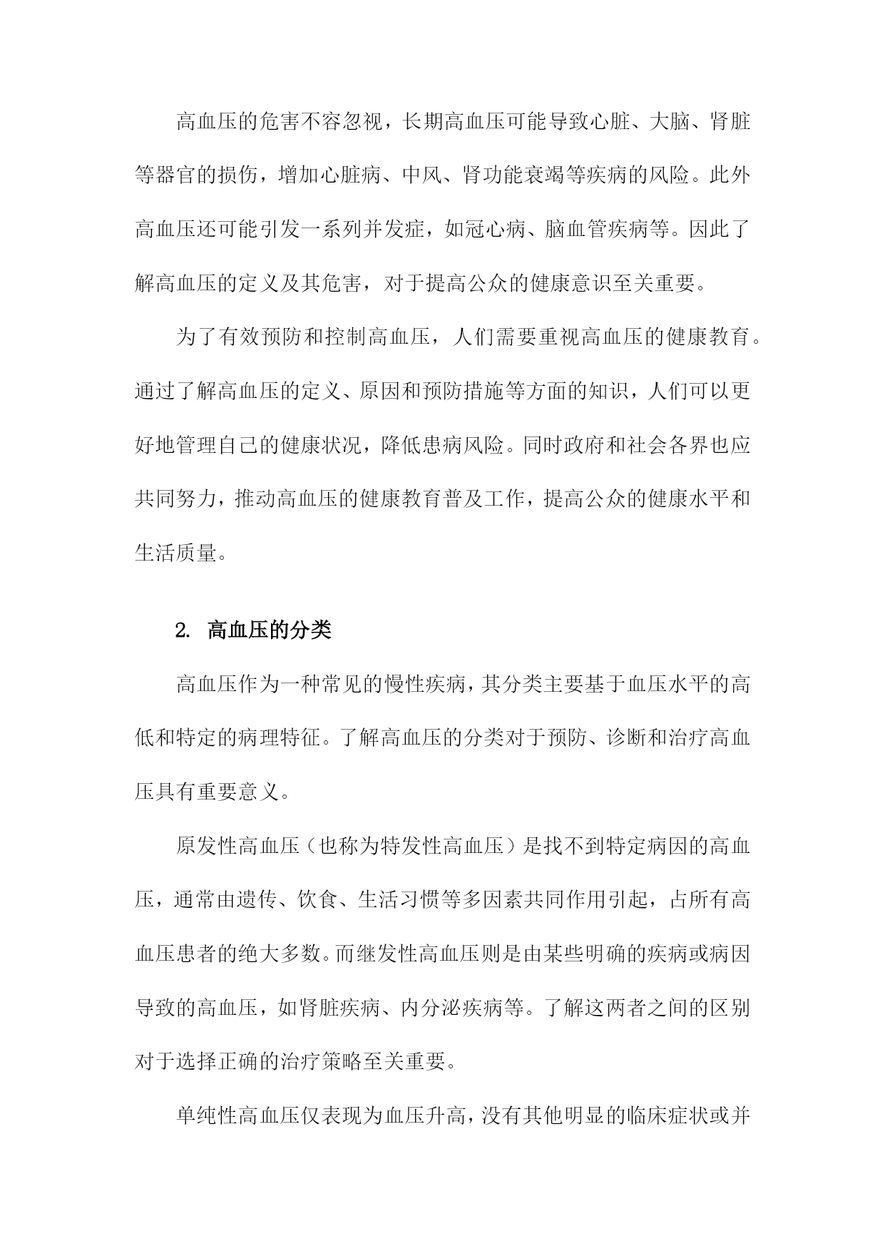 《高血压健康教育》课件一、概要随着现代社会生活方式的改变,高血压的发病率不断上升,已经成为一种广泛流行的慢性疾病。高血压不仅影响人们的身体健康,也给社会经济带来巨大负担。因此高血压的健康教育显得尤为重要,本课件《高血压健康教育》旨在提高公众对高血压的认识,了解高血压的危害,掌握预防和控制高血压的方法和技巧。课件内容涵盖了高血压的基本知识、发病原因、临床表现、诊断标准、治疗方法和预防措施等方面,通过深入浅出的讲解,使受众全面了解高血压的相关知识,从而提高自我保健意识,降低高血压的发病率和患病率。同时本课件也强调了高血压患者的心理调适和生活方式改善的重要性,旨在帮助患者建立科学、健康的生活方式,提高生活质量。1.高血压的普遍性和危害高血压是一种常见的慢性疾病,已经成为全球性的健康问题。随着现代生活方式的改变,高血压的患病率不断攀升,越来越多的人受到其困扰。高血压的普遍性体现在各个年龄段、性别和地域的人群中,且往往与不良的生活习惯、遗传因素等多种因素有关。高血压是一种潜在的“隐形杀手”,其危害不容忽视。长期高血压会对人体的心、脑、肾等器官造成损害,甚至危及生命。对心脏的损害:高血压会使心脏负担加重,导致心肌肥厚、心脏扩大,进而引发心力衰竭。同时高血压还可能导致冠心病、心律失常等心脏疾病。对脑部的损害:高血压是中风的主要原因之一。长期高血压可能导致脑血管病变,引发脑出血、脑梗塞等疾病,严重时可能导致瘫痪或死亡。对肾脏的损害:高血压会导致肾小球硬化,肾功能受损,严重时可能导致肾衰竭。其他并发症:高血压还可能引发视网膜脱落、眼底出血、失明等眼疾,以及外周血管疾病等。因此了解高血压的危害,提高高血压的防控意识,对于维护个人健康和社会健康具有重要意义。接下来我们将详细介绍高血压的成因、诊断方法、治疗方式以及预防措施。2.高血压健康教育的目的和重要性高血压健康教育的主要目的在于提高公众对高血压及其相关风险的认识和理解,促使大众积极改变不良的生活方式,包括饮食习惯、运动习惯以及应对压力的方式等,从而达到预防和控制高血压的目的。此外通过教育,我们还希望帮助患者更好地管理自己的病情,包括正确使用药物、有效监测血压以及及时寻求医疗帮助等,从而提高高血压患者的治疗率和控制率。高血压作为一种常见且多发的慢性疾病,对于人们的健康构成了严重威胁。由于高血压常常在初期没有明显的症状,因此很多人对其缺乏足够的重视,常常导致病情恶化,甚至引发严重并发症。因此开展高血压健康教育至关重要,通过教育我们可以提高公众的健康意识,使人们认识到高血压的危害,从而主动采取预防措施。同时对于已经患病的人群,教育可以帮助他们更好地管理病情,减少并发症的发生,提高生活质量。此外高血压健康教育还能帮助医疗资源更好地分配和利用,减轻医疗压力。高血压健康教育是提高公众健康水平、预防和控制高血压的重要手段。通过教育我们可以提高公众的健康意识,促进健康行为的形成,从而有效预防和控制高血压。3.课件内容的简要介绍本课件主要分为四个部分进行高血压健康教育的介绍,第一部分为高血压概述,介绍了高血压的定义、分类、发病原因以及常见症状。第二部分为高血压的危害,详细阐述了高血压对人体各系统的损害,以及高血压并发其他慢性疾病的风险。第三部分为重点内容的高血压预防与管理,包括合理饮食、适量运动、心理调适、规律作息等方面,同时强调定期监测血压的重要性,以及高血压患者的自我管理技巧。最后一部分为药物治疗部分,介绍了高血压药物治疗的原则、常用药物及其作用机制,以及药物使用的注意事项和副作用处理。课件内容设计条理清晰,注重理论与实践相结合,旨在帮助公众全面了解和掌握高血压的相关知识,有效预防和控制高血压。通过本次学习,期望能够提升大众的健康素养,降低高血压的发生率及其对健康的危害。二、高血压基础知识高血压是一种常见的慢性疾病,是指血液在血管中流动时对血管壁产生的压力过高。这部分的课件内容将详细介绍高血压的基础知识,帮助大家了解这一疾病的特点和重要性。高血压可分为原发性高血压和继发性高血压两类,原发性高血压是最常见的一类,通常无明显病因,可能与遗传、饮食、生活习惯等因素有关。继发性高血压则是某些疾病或药物引发的一种症状,了解高血压的分类有助于对病情进行准确判断和治疗。高血压的发病机制复杂,涉及多种因素。课件中将详细介绍高血压的发病原因,如遗传、年龄、性别、饮食、生活习惯等。同时还将解释高血压如何损害身体器官,如心脏、大脑、肾脏等,帮助大家了解高血压的危害性。高血压的症状可能不明显,很容易被忽视。课件中将详细介绍高血压的常见症状,如头痛、头晕、耳鸣、胸闷等。此外还将强调高血压并发症的危害性,提醒大家关注自身健康。高血压的诊断主要依据血压测量值,课件中将介绍高血压的诊断标准、诊断方