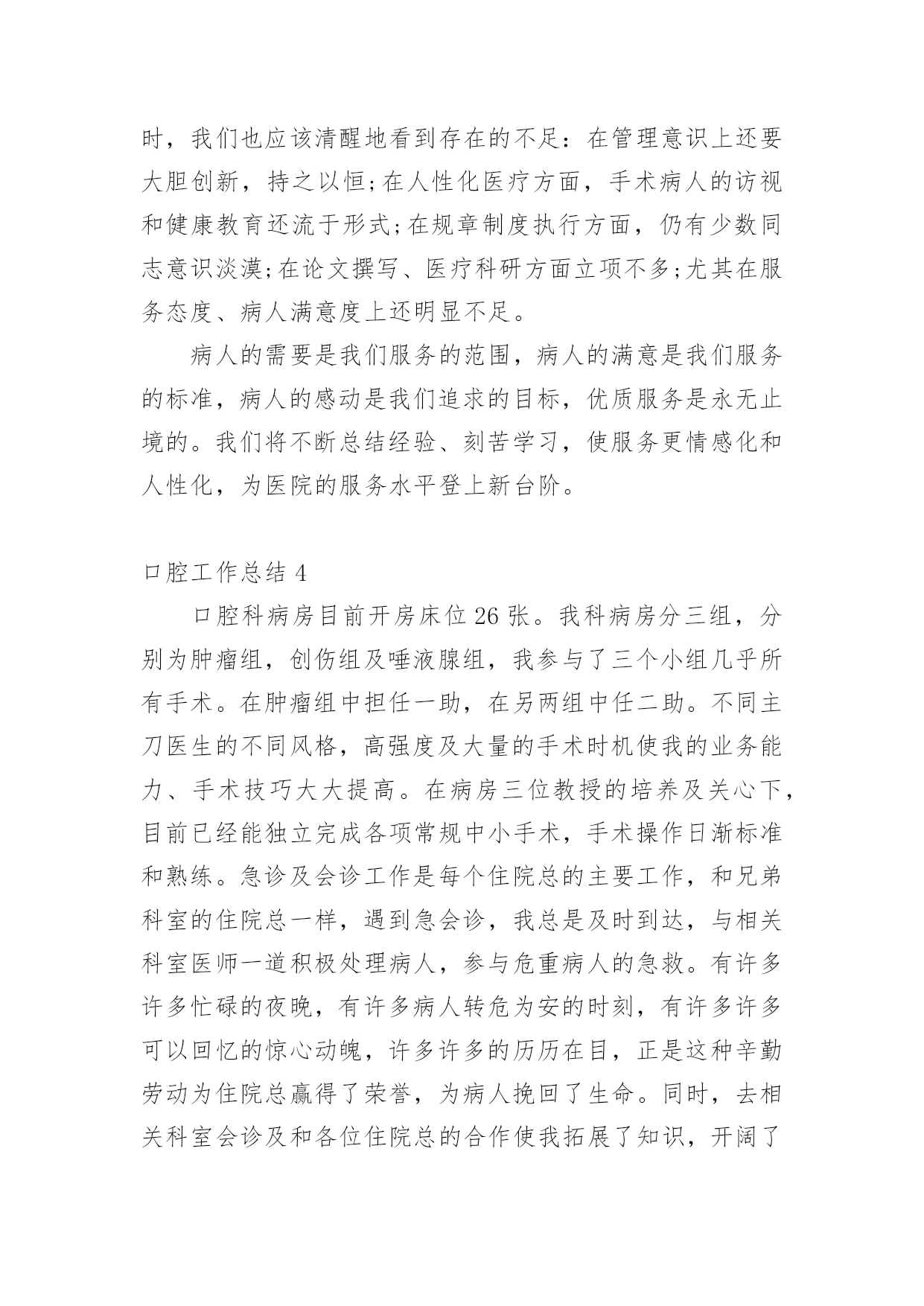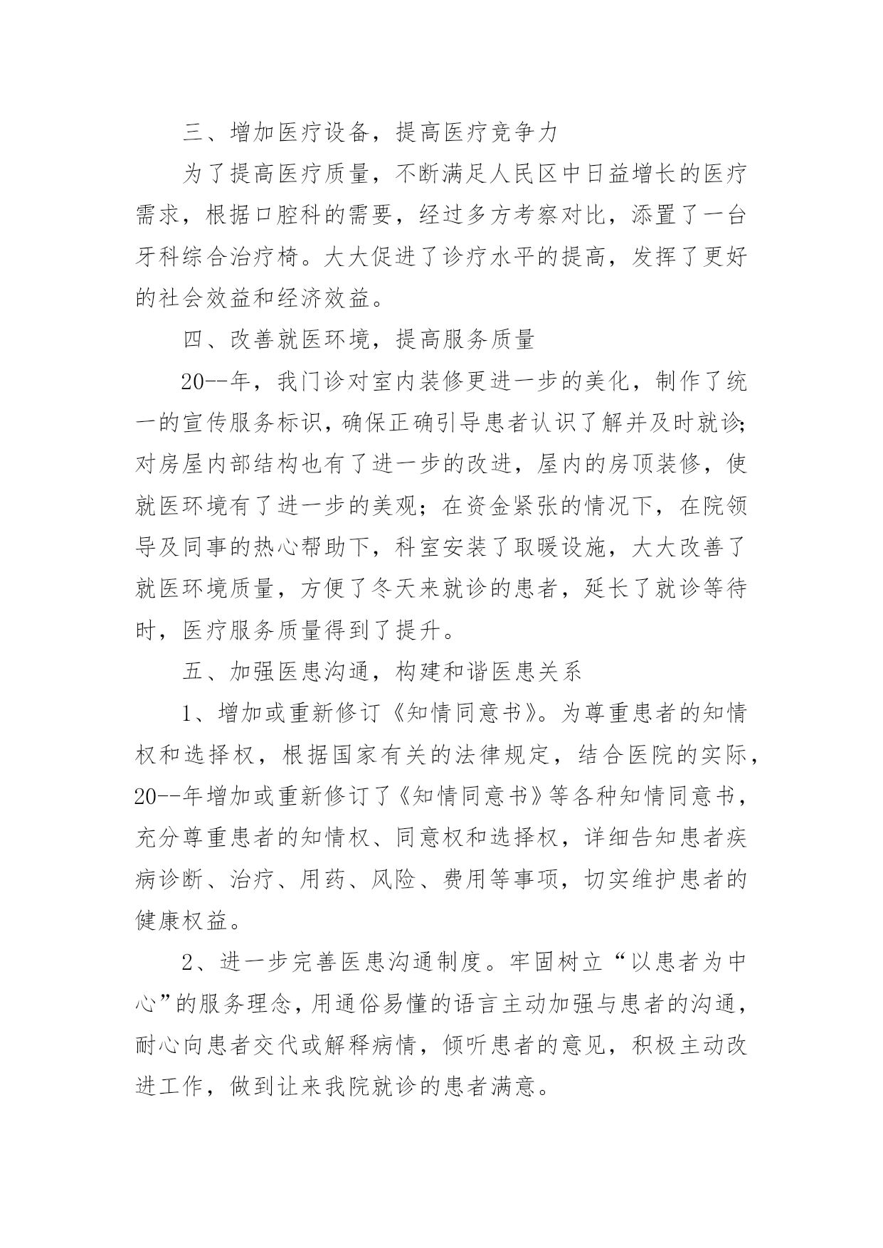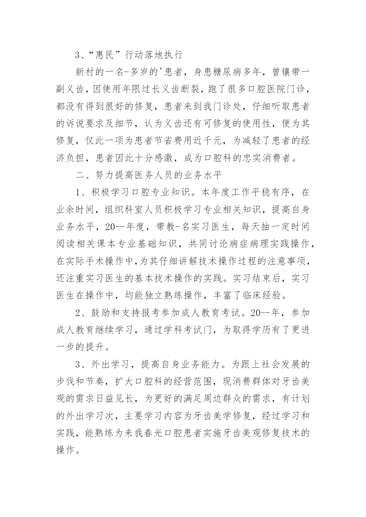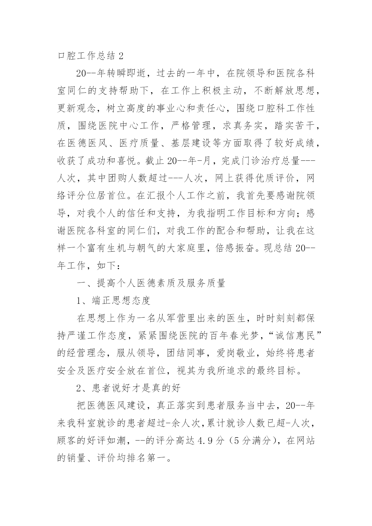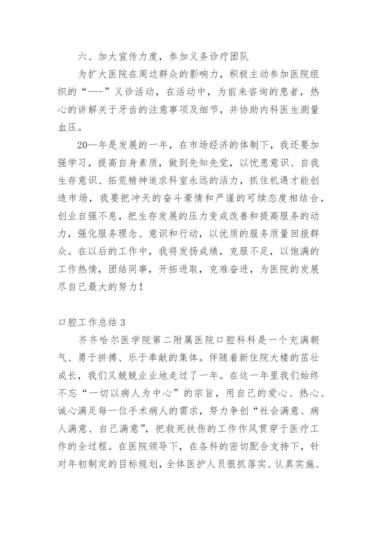 口腔工作总结总结是在一段时间内对学习和工作生活等表现加以总结和概括的一种书面材料,他能够提升我们的书面表达能力,不妨让我们认真地完成总结吧。你所见过的总结应该是什么样的?下面是小编整理的口腔工作总结,仅供参考,欢迎大家阅读。口腔工作总结1口腔医疗技术人员是健康的保障,是口腔科正常运转的保障,是口腔门诊工作的重中之重,如果说口腔门诊是门诊工作的话,那么在口腔门诊工作的开展也是如此。我们作为口腔门诊的工作人员,就更要在工作的开展当中去认真的去做好,作为医保的工作人员,我在这个工作的开展上面是做了不少的事情,但是我依旧是要去认真的去做好,为了更好的完成工作,我对自己在这xx年的工作做了一个总结。一、医疗工作我们作为口腔门诊的工作人员,就更应该去做到认真对待,不能出现一些比较大的误诊的情况,在医疗方面我一直都是认真的去做好自己的工作,在工作的时候,我也都是认真的去学习,去了解医保的相关知识,同时我也是在空闲时间也是会去查阅一些资料,有些是医保的工作的相关的理论知识,我知道自己是一个比较缺乏的方面,但是经过这xx年的一些医保工作,我也是感兴趣了不少,这xx年我也是积极的参加科室的培训,让自己对医保的工作有了更多的了解,同时也是对于医保的相关知识也是积累了一些经验,让自己能在这种工作状态下面做的更好一些。同时我也是去参加医院的一些培训,让自己更好了解医保的相关知识,同时在医保的相关工作开展方面我也是能去把握更多的医保知识。二、日常的`工作这xx年我依旧是严格的去要求自己,在工作的时候,我也是不敢松懈,一方面我会去学习,去了解医保相关的相关知识,另一方面我也是会对于医保工作的日常工作去做到熟练,去熟练,同时我也是会多去了解医保,了解到医保的相关知识,对于医保的工作我也是更加的有了一个了解,不会觉得是一种负担,我也是明白医保工作是有很大的压力的,而是更需要我去学习的一种方式,来让自己更好的去把医保的工作去做好,同时我也是积极的去把医保相关的相关的知识去学习,让自己能做好,在工作当中更加的熟练,更好的去把医保的工作做好。当然我也是知道自己工作的一个开展还是有些做的不够好的,这些也是有很大的一个原因,只有做好了工作,那么才有更大的收获,我也是要不断的去进步,去把医保的工作去做到位,让自己能做到更合理,更优秀,这xx年也是让我感到很充实,自己也是感到工作的开展也是比较的顺利,我也是要继续的努力做好。口腔工作总结220--年转瞬即逝,过去的一年中,在院领导和医院各科室同仁的支持帮助下,在工作上积极主动,不断解放思想,更新观念,树立高度的事业心和责任心,围绕口腔科工作性质,围绕医院中心工作,严格管理,求真务实,踏实苦干,在医德医风、医疗质量、基层建设等方面取得了较好成绩,收获了成功和喜悦。截止20--年-月,完成门诊治疗总量---人次,其中团购人数超过---人次,网上获得优质评价,网络评分位居首位。在汇报个人工作之前,我首先要感谢院领导,对我个人的信任和支持,为我指明工作目标和方向;感谢医院各科室的同仁们,对我工作的配合和帮助,让我在这样一个富有生机与朝气的大家庭里,倍感振奋。现总结20--年工作,如下:一、提高个人医德素质及服务质量1、端正思想态度在思想上作为一名从军营里出来的医生,时时刻刻都保持严谨工作态度,紧紧围绕医院的百年春光梦,“诚信惠民”的经营理念,服从领导,团结同事,爱岗敬业,始终将患者安全及医疗安全放在首位,视其为我所追求的最终目标。2、患者说好才是真的好把医德医风建设,真正落实到患者服务当中去,20--年来我科室就诊的患者超过-余人次,累计就诊人数已超-人次,顾客的好评如潮,--的评分高达4.9分(5分满分),在网站的销量、评价均排名第一。3、“惠民”行动落地执行新村的一名-多岁的'患者,身患糖尿病多年,曾镶带一副义齿,因使用年限过长义齿断裂,跑了很多口腔医院门诊,都没有得到很好的修复,患者来到我门诊处,仔细听取患者的诉说要求及细节,认为义齿还有可修复的使用性,便为其修复,仅此一项为患者节省费用近千元,为减轻了患者的经济负担,患者因此十分感激,成为口腔科的忠实消费者。二、努力提高医务人员的业务水平1、积极学习口腔专业知识。本年度工作平稳有序,在业余时间,组织科室人员积极学习专业相关知识,提高自身业务水平,20--年度,带教-名实习医生,每天抽一定时间阅读相关课本专业基础知识,共同讨论病症病理实践操作,在实际手术操作中,为其仔细讲解技术操作过程的注意事项,还注重实习医生的基本技术操作的实践。实习结束后,实习医生在操作中,均能独立熟练操作,丰富了临床经验。2、鼓励和支持报考参加成人教育考试。20--年,参加成人教育继续学习,通过学科考试门,为取得学历有了更进一步的提升。3、外出学习,提高自身业务能力。为跟上社会发展的步伐和节奏,扩大口