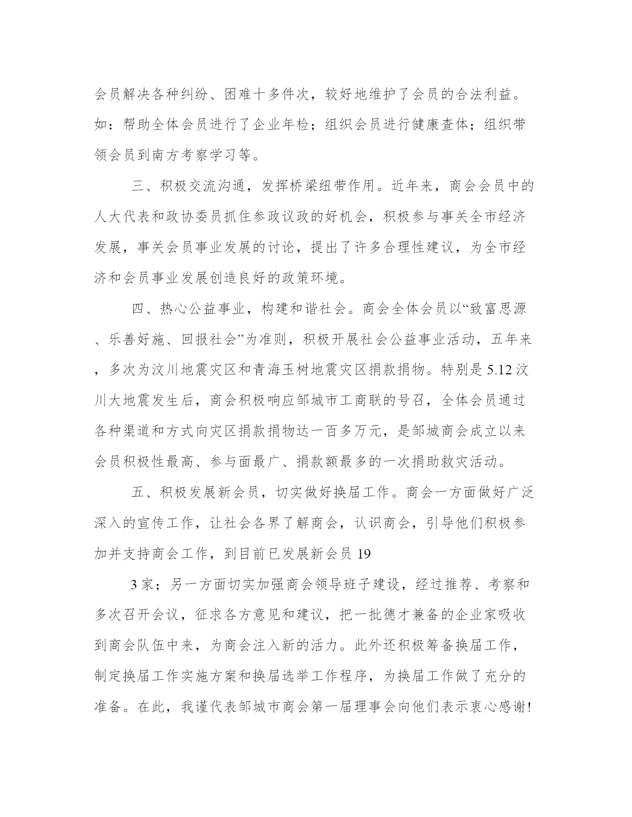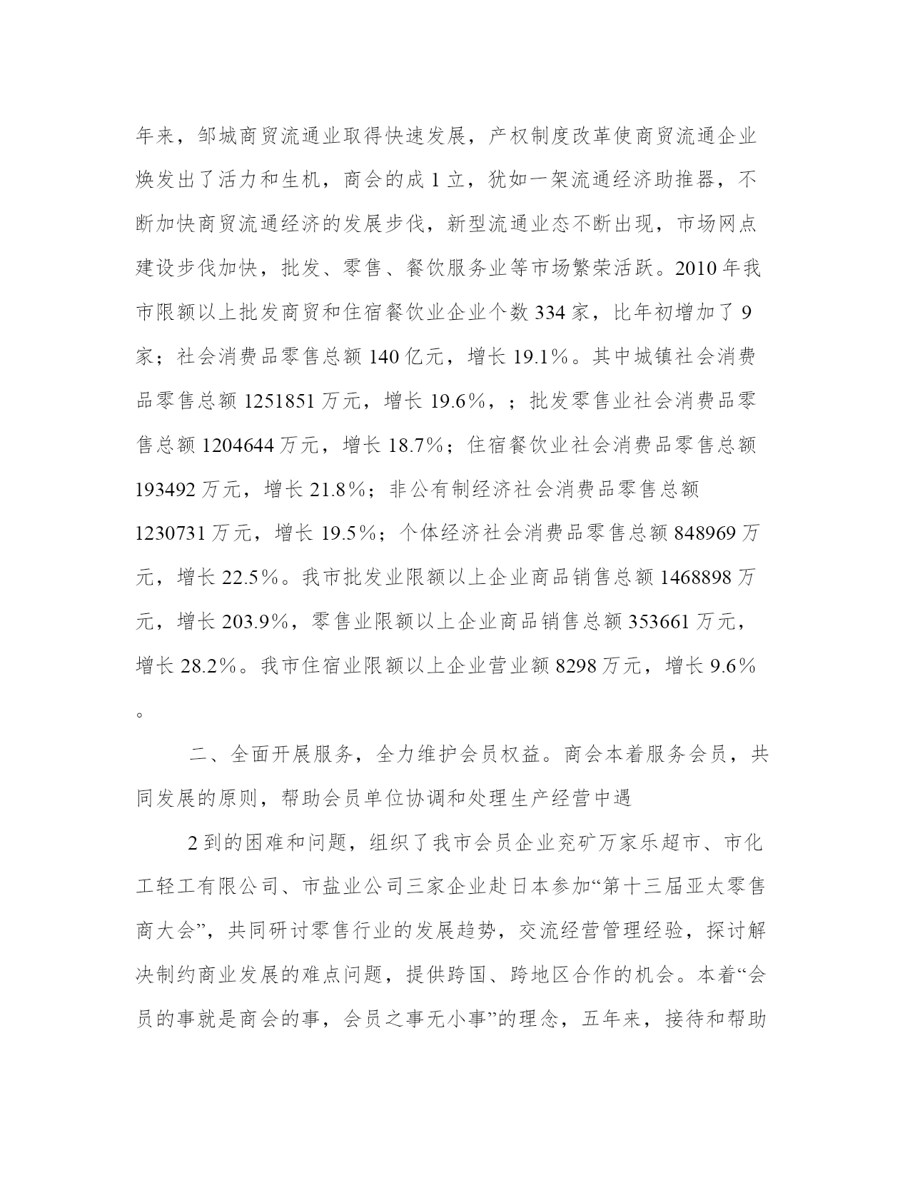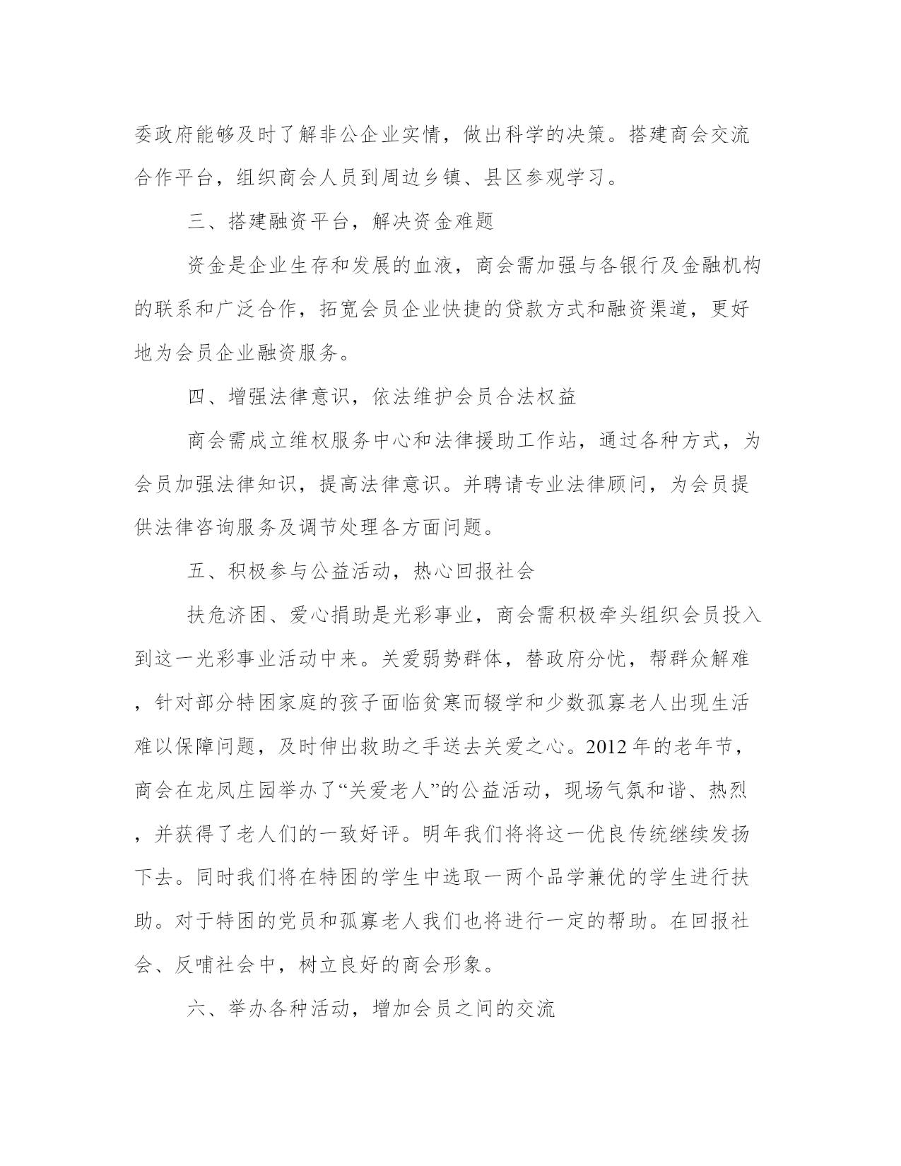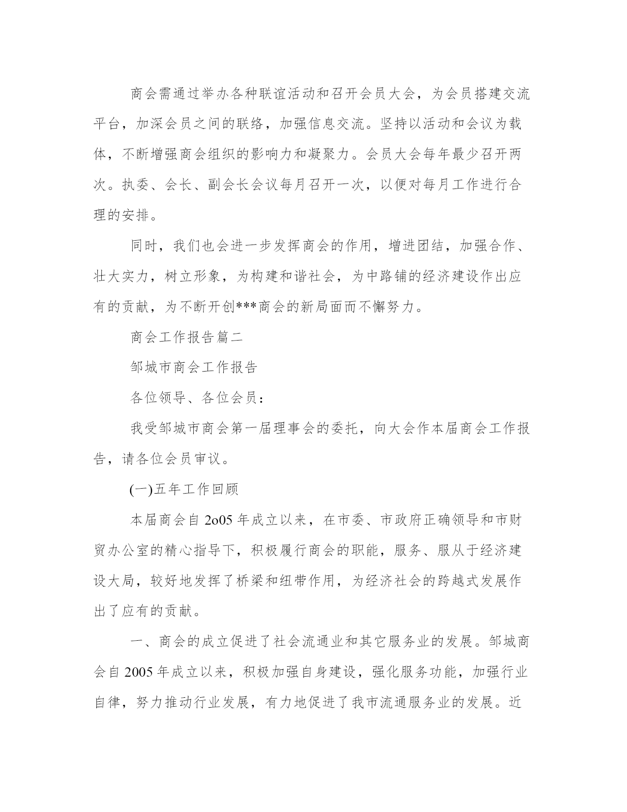 最新商会工作报告(6篇)报告材料主要是向上级汇报工作,其表达方式以叙述、说明为主,在语言运用上要突出陈述性,把事情交代清楚,充分显示内容的真实和材料的客观。那么,报告到底怎么写才合适呢?下面是小编带来的优秀报告范文,希望大家能够喜欢!商会工作报告篇一第一章工作总结***商会一直以来,因各种原因以致一直未能有效的开展工作,今年10月,经过会长、副会长及各执委的讨论分析后决定正式启动工作。几个月来,我们的主要工作是打基础。现将这几个月的工作情况作如下总结:一、商会基本情况经过前期的筹备和不断努力,商会现已发展会员企业30余名,涉及房地产、餐饮、休闲农庄、玻璃制造、机械制造、钛制品、摩托车销售、砖瓦制造、燃气、连锁超市、食品等行业。二、主要做法和工作体会1、商会是松散型的社会团体。人员各方面的差异较大,入会心理多样化。实践证明,如果没有一整套健全的规章制度,商会就很难正常健康发展。因此,在商会成立初期,我们制定了******商会章程、*******商会会费缴纳标准与规划草案等规章制度。在工作中,用制度管事,工作才能做到规范化、制度化、效能化。而这些规章制度,能够完善商会的工作程序,规范商会的工作秩序,使商会的工作在有序、规范中运作,并提高商会的工作效能。2、商会召开了基础会议,确定了商会的成员。并招聘了专门负责各方面工作的人员。经会长、副会长及执委开会讨论后,向党委政府以及县工商联领导汇报了情况,并得到了各级领导的肯定和支持。三、工作中存在的不足商会自成立以来,因各方面的原因,工作方面还存在很多不足,主要体现在以下几个方面:1、对外宣传力度有待进一步加强由于我们商会正式运作时间不长,还在起步发展阶段,所以在对外宣传上力度不够,商会的知名度还不高。而且各方面的交流太少,导致信息渠道不畅通。2、各方面经济业务合作渠道有待进一步拓宽我们的商会还很“年轻”,经验也不足,与外界各方面的沟通还需要进一步拓宽,在经济业务合作上还需要进一步加强;要切实树立商会形象,提高商会的实力,加强商会会员之间的联合,做到团结发展。第二章2013商会工作安排新的一年,新的开始。为了商会工作更好的发展,我们要在党委政府和上级工商联的领导下,团结一心,本着“团结、交流、拓展、服务”的办会宗旨,努力做好商会的服务工作,尽力为企业、为会员办实事、多办事。并积极开展其他各项工作。一、壮大会员队伍,做到持续发展积极发展吸收新会员,扩大会员队伍,壮大商会力量是扩大商会影响力,增强凝聚力,保持商会健康发展推进商会自身建设的有效途径,商会要发展,会员是关键。因此积极发展吸收新会员是属于商会的重要工作日程。同时也要积极发动其他大型个体私营业户入会,在今年的12月份,我们在政党委李书记的带领下走访了****和****等会员企业。2013年我们将继续通过走访会员企业来宣传商会、了解企业情况、熟悉会员、沟通感情、征求企业的意见、掌握各企业的需求、从而扩大(发展)会员。二、拓宽工作思路,努力打造“实干型商会”服务会员是商会的主要任务,也是商会顺利开展工作的出发点。商会作为联系非公有制企业的桥梁,自身组织建设如何,关系到商会职能的发挥和为会员提供服务的水平。因此,必须切实加强商会自身组织建设,使商会的联系沟通能力、为会员服务的能力不断提高。我们商会要自觉履行自身职能,坚持“服务立会,服务兴会”这一宗旨,不断加大为会员企业的服务力度,开拓服务新领域。调动广大企业会员的积极性,营造团队精神,发挥整体优势,更好地担当起镇党委政府联系非公经济认识的桥梁和纽带的重任。同时建立好商会的党组织,积极配合镇党委的各项工作。积极向镇党委政府建言献策,使镇党委政府能够及时了解非公企业实情,做出科学的决策。搭建商会交流合作平台,组织商会人员到周边乡镇、县区参观学习。三、搭建融资平台,解决资金难题资金是企业生存和发展的血液,商会需加强与各银行及金融机构的联系和广泛合作,拓宽会员企业快捷的贷款方式和融资渠道,更好地为会员企业融资服务。四、增强法律意识,依法维护会员合法权益商会需成立维权服务中心和法律援助工作站,通过各种方式,为会员加强法律知识,提高法律意识。并聘请专业法律顾问,为会员提供法律咨询服务及调节处理各方面问题。五、积极参与公益活动,热心回报社会扶危济困、爱心捐助是光彩事业,商会需积极牵头组织会员投入到这一光彩事业活动中来。关爱弱势群体,替政府分忧,帮群众解难,针对部分特困家庭的孩子面临贫寒而辍学和少数孤寡老人出现生活难以保障问题,及时伸出救助之手送去关爱之心。2012年的老年节,商会在龙凤庄园举办了“关爱老人”的公益活动,现场气氛和谐、热烈,并获得了老人们的一致好评。明年我们将将这一优良传统继续发扬下去。同时我们将在特困的学生中选取一两个品学兼优的学生进