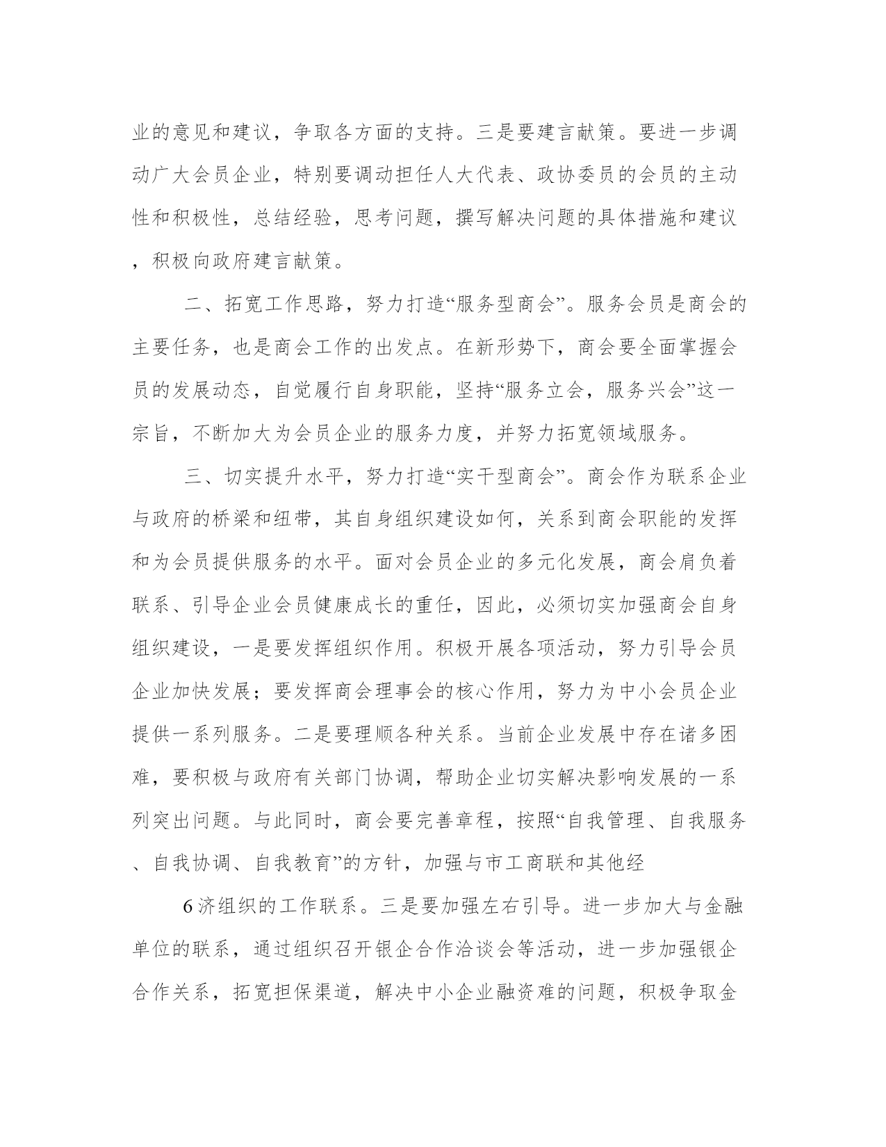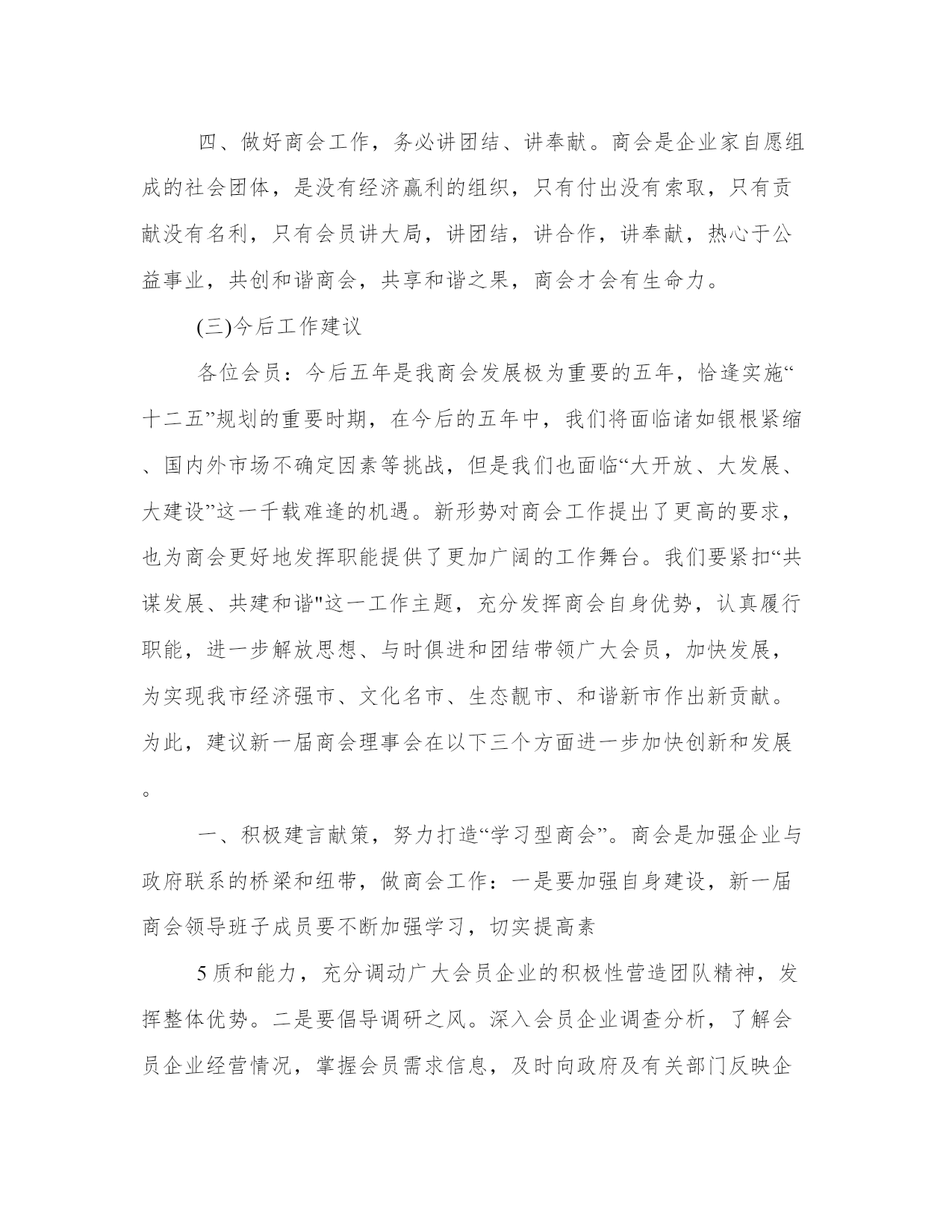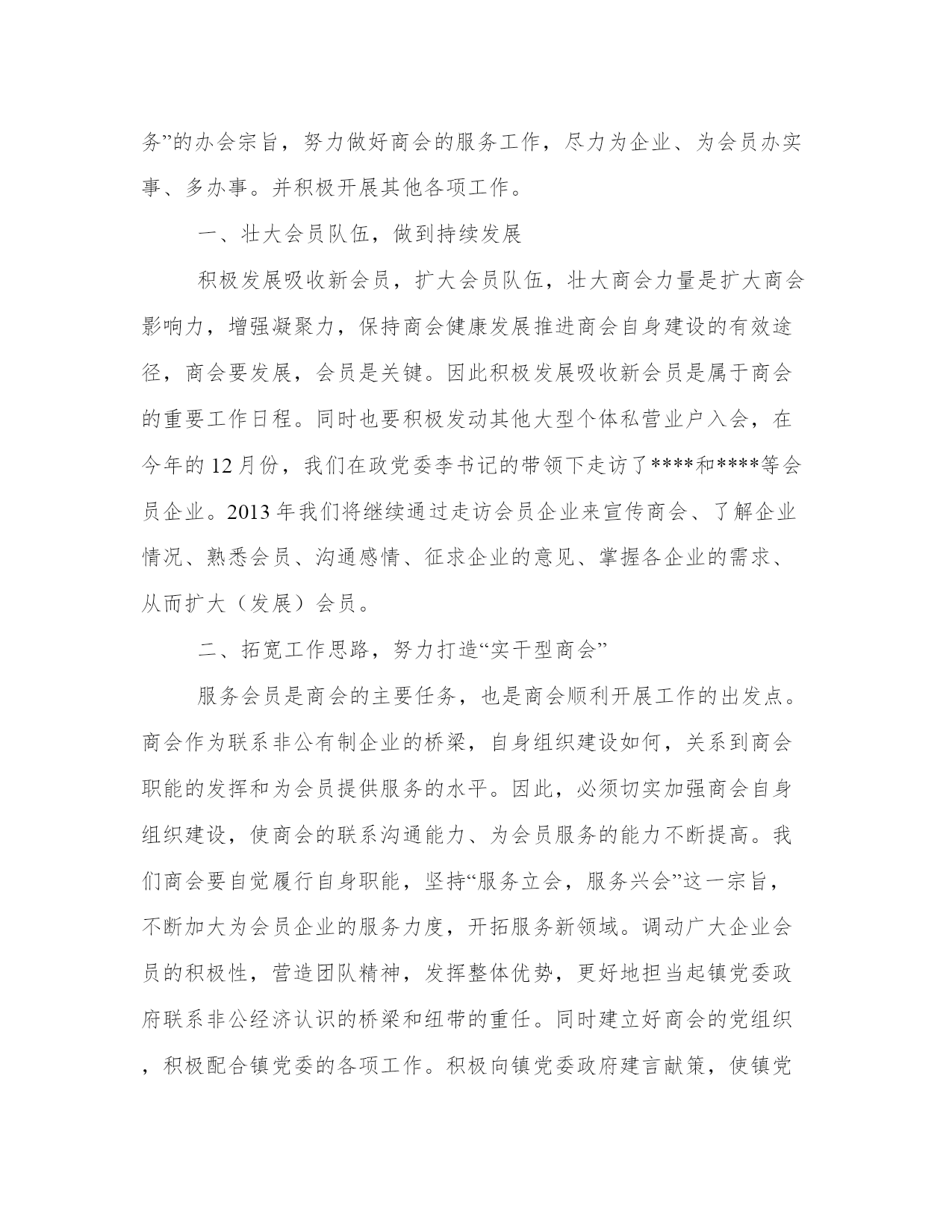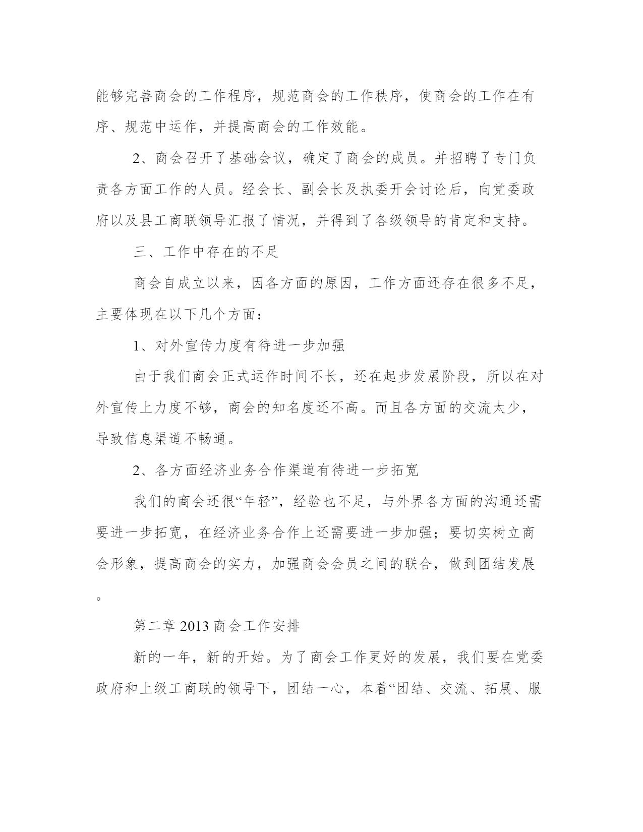 最新商会工作报告(6篇)报告材料主要是向上级汇报工作,其表达方式以叙述、说明为主,在语言运用上要突出陈述性,把事情交代清楚,充分显示内容的真实和材料的客观。那么,报告到底怎么写才合适呢?下面是小编带来的优秀报告范文,希望大家能够喜欢!商会工作报告篇一第一章工作总结***商会一直以来,因各种原因以致一直未能有效的开展工作,今年10月,经过会长、副会长及各执委的讨论分析后决定正式启动工作。几个月来,我们的主要工作是打基础。现将这几个月的工作情况作如下总结:一、商会基本情况经过前期的筹备和不断努力,商会现已发展会员企业30余名,涉及房地产、餐饮、休闲农庄、玻璃制造、机械制造、钛制品、摩托车销售、砖瓦制造、燃气、连锁超市、食品等行业。二、主要做法和工作体会1、商会是松散型的社会团体。人员各方面的差异较大,入会心理多样化。实践证明,如果没有一整套健全的规章制度,商会就很难正常健康发展。因此,在商会成立初期,我们制定了******商会章程、*******商会会费缴纳标准与规划草案等规章制度。在工作中,用制度管事,工作才能做到规范化、制度化、效能化。而这些规章制度,能够完善商会的工作程序,规范商会的工作秩序,使商会的工作在有序、规范中运作,并提高商会的工作效能。2、商会召开了基础会议,确定了商会的成员。并招聘了专门负责各方面工作的人员。经会长、副会长及执委开会讨论后,向党委政府以及县工商联领导汇报了情况,并得到了各级领导的肯定和支持。三、工作中存在的不足商会自成立以来,因各方面的原因,工作方面还存在很多不足,主要体现在以下几个方面:1、对外宣传力度有待进一步加强由于我们商会正式运作时间不长,还在起步发展阶段,所以在对外宣传上力度不够,商会的知名度还不高。而且各方面的交流太少,导致信息渠道不畅通。2、各方面经济业务合作渠道有待进一步拓宽我们的商会还很“年轻”,经验也不足,与外界各方面的沟通还需要进一步拓宽,在经济业务合作上还需要进一步加强;要切实树立商会形象,提高商会的实力,加强商会会员之间的联合,做到团结发展。第二章2013商会工作安排新的一年,新的开始。为了商会工作更好的发展,我们要在党委政府和上级工商联的领导下,团结一心,本着“团结、交流、拓展、服务”的办会宗旨,努力做好商会的服务工作,尽力为企业、为会员办实事、多办事。并积极开展其他各项工作。一、壮大会员队伍,做到持续发展积极发展吸收新会员,扩大会员队伍,壮大商会力量是扩大商会影响力,增强凝聚力,保持商会健康发展推进商会自身建设的有效途径,商会要发展,会员是关键。因此积极发展吸收新会员是属于商会的重要工作日程。同时也要积极发动其他大型个体私营业户入会,在今年的12月份,我们在政党委李书记的带领下走访了****和****等会员企业。2013年我们将继续通过走访会员企业来宣传商会、了解企业情况、熟悉会员、沟通感情、征求企业的意见、掌握各企业的需求、从而扩大(发展)会员。二、拓宽工作思路,努力打造“实干型商会”服务会员是商会的主要任务,也是商会顺利开展工作的出发点。商会作为联系非公有制企业的桥梁,自身组织建设如何,关系到商会职能的发挥和为会员提供服务的水平。因此,必须切实加强商会自身组织建设,使商会的联系沟通能力、为会员服务的能力不断提高。我们商会要自觉履行自身职能,坚持“服务立会,服务兴会”这一宗旨,不断加大为会员企业的服务力度,开拓服务新领域。调动广大企业会员的积极性,营造团队精神,发挥整体优势,更好地担当起镇党委政府联系非公经济认识的桥梁和纽带的重任。同时建立好商会的党组织,积极配合镇党委的各项工作。积极向镇党委政府建言献策,使镇党委政府能够及时了解非公企业实情,做出科学的决策。搭建商会交流合作平台,组织商会人员到周边乡镇、县区参观学习。三、搭建融资平台,解决资金难题资金是企业生存和发展的血液,商会需加强与各银行及金融机构的联系和广泛合作,拓宽会员企业快捷的贷款方式和融资渠道,更好地为会员企业融资服务。四、增强法律意识,依法维护会员合法权益商会需成立维权服务中心和法律援助工作站,通过各种方式,为会员加强法律知识,提高法律意识。并聘请专业法律顾问,为会员提供法律咨询服务及调节处理各方面问题。五、积极参与公益活动,热心回报社会扶危济困、爱心捐助是光彩事业,商会需积极牵头组织会员投入到这一光彩事业活动中来。关爱弱势群体,替政府分忧,帮群众解难,针对部分特困家庭的孩子面临贫寒而辍学和少数孤寡老人出现生活难以保障问题,及时伸出救助之手送去关爱之心。2012年的老年节,商会在龙凤庄园举办了“关爱老人”的公益活动,现场气氛和谐、热烈,并获得了老人们的一致好评。明年我们将将这一优良传统继续发扬下去。同时我们将在特困的学生中选取一两个品学兼优的学生进