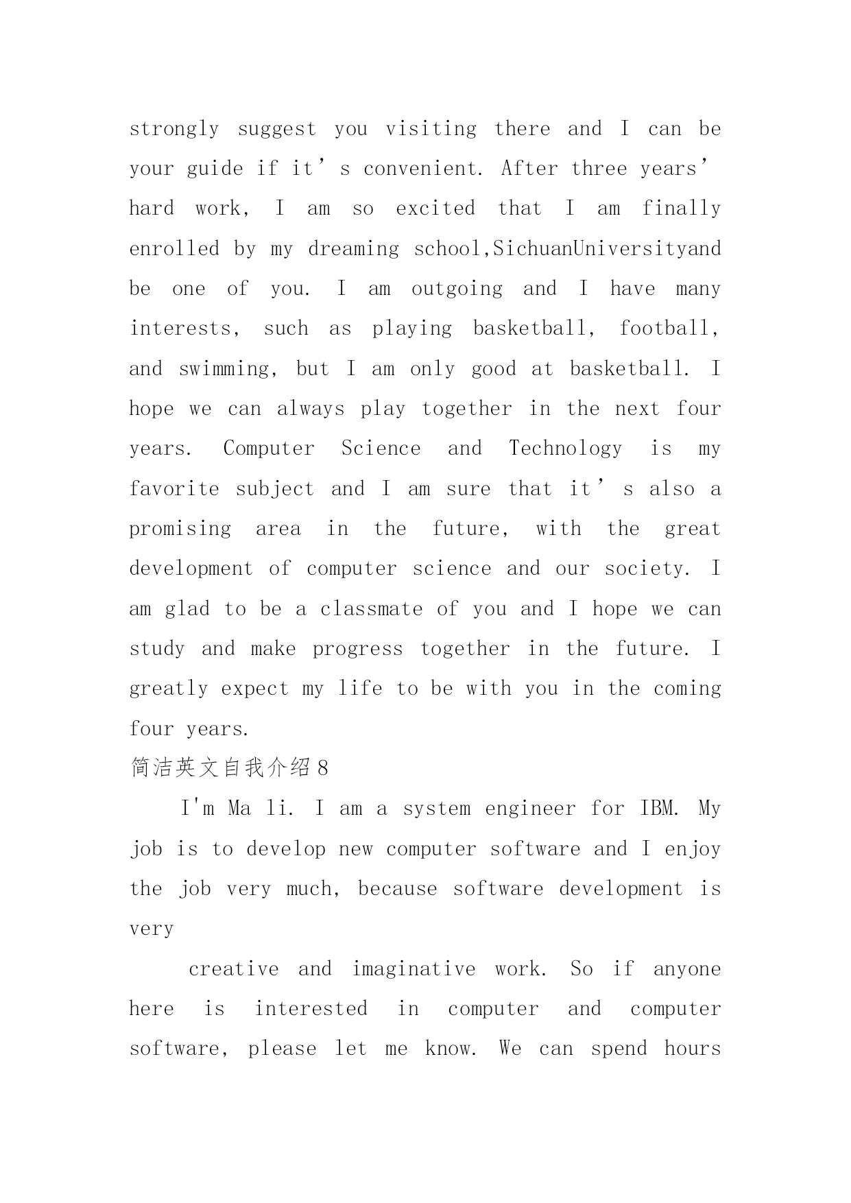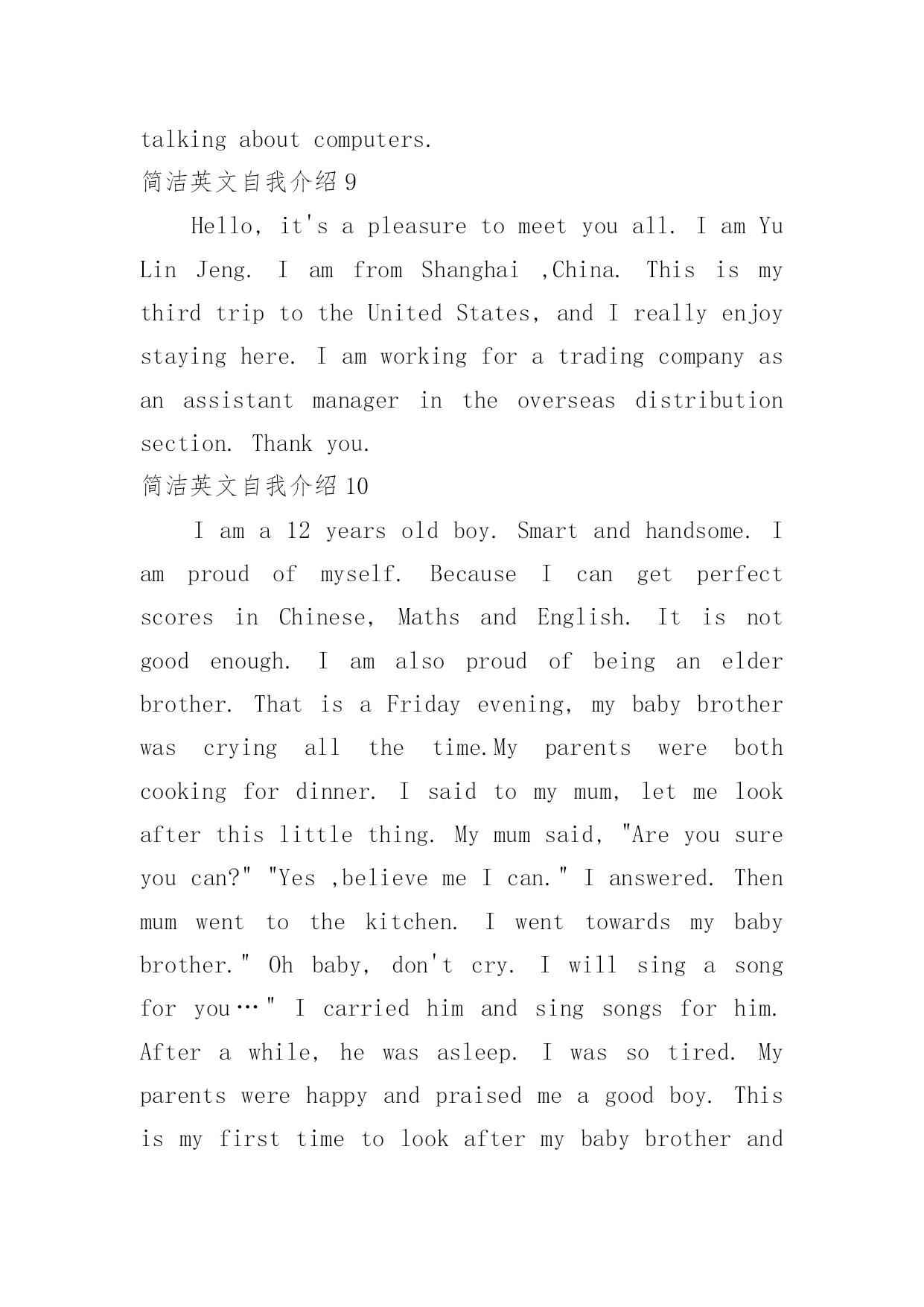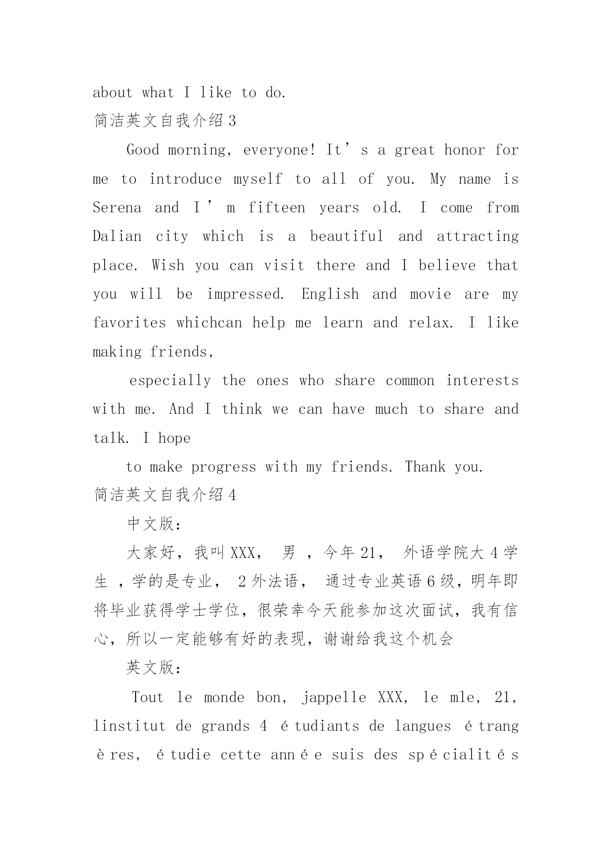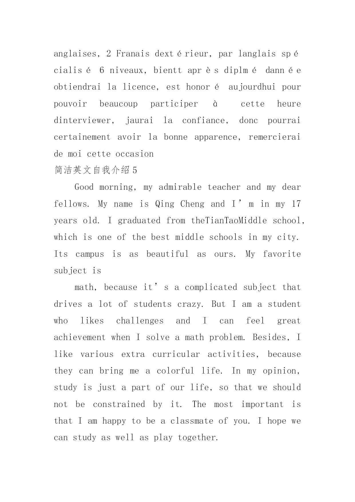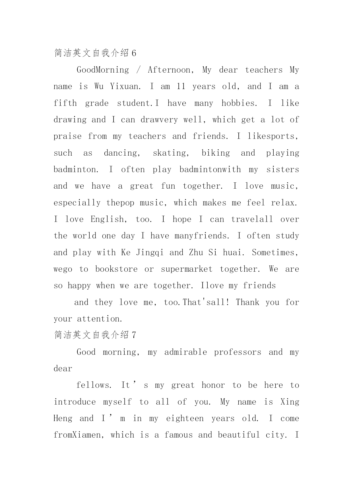 简洁英文自我介绍简洁英文自我介绍当我们在一个陌生场合中,我们有必要进行适当的自我介绍,自我介绍是一种认识自我的手段。相信许多人会觉得自我介绍很难写吧,以下是小编收集整理的简洁英文自我介绍,仅供参考,希望能够帮助到大家。简洁英文自我介绍1Hello,everybody.IamNingcaichenfromBeijing,IamworkingforanagentforaelectriccompanyinBeijing.ItisaboutfivemonthssinceIcametotheUnitedStates,andImissmyfamilyverymuch.It'llbeseveralmonthsbeforetheycomehere,andIhopetocontinuetohaveanenjoyablesinglelifetillthen.Thanks.简洁英文自我介绍2MynameisPatandI'mfromTaiwan.Rightnow,I'mastudent.Istudyveryhardeveryday.IlikegoingtoschoolbecauseI'meagertolearn.IenjoylearningEnglish.It'smyfavoriteclass.IliketomakefriendsandIgetalongwitheveryone.ThisistheintroductionIgivewheneverImeetnewpeople.IttellspeoplealittlebitaboutmeandaboutwhatIliketodo.简洁英文自我介绍3Goodmorning,everyone!It’sagreathonorformetointroducemyselftoallofyou.MynameisSerenaandI’mfifteenyearsold.IcomefromDaliancitywhichisabeautifulandattractingplace.WishyoucanvisitthereandIbelievethatyouwillbeimpressed.Englishandmoviearemyfavoriteswhichcanhelpmelearnandrelax.Ilikemakingfriends,especiallytheoneswhosharecommoninterestswithme.AndIthinkwecanhavemuchtoshareandtalk.Ihopetomakeprogresswithmyfriends.Thankyou.简洁英文自我介绍4中文版:大家好,我叫XXX,男,今年21,外语学院大4学生,学的是专业,2外法语,通过专业英语6级,明年即将毕业获得学士学位,很荣幸今天能参加这次面试,我有信心,所以一定能够有好的表现,谢谢给我这个机会英文版:Toutlemondebon,jappelleXXX,lemle,21,linstitutdegrands4étudiantsdelanguesétrangères,étudiecetteannéesuisdesspécialitésanglaises,2Franaisdextérieur,parlanglaisspécialisé6niveaux,bienttaprèsdiplmédannéeobtiendrailalicence,esthonoréaujourdhuipourpouvoirbeaucoupparticiperàcetteheuredinterviewer,jaurailaconfiance,doncpourraicertainementavoirlabonneapparence,remercieraidemoicetteoccasion简洁英文自我介绍5Goodmorning,myadmirableteacherandmydearfellows.MynameisQingChengandI’minmy17yearsold.IgraduatedfromtheTianTaoMiddleschool,whichisoneofthebestmiddleschoolsinmycity.Itscampusisasbeautifulasours.Myfavoritesubjectismath,becauseit’sacomplicatedsubjectthatdrivesalotofstudentscrazy.ButIamastudentwholikeschallengesandIcanfeelgreatachievementwhenIsolveamathproblem.Besides,Ilikevarious
