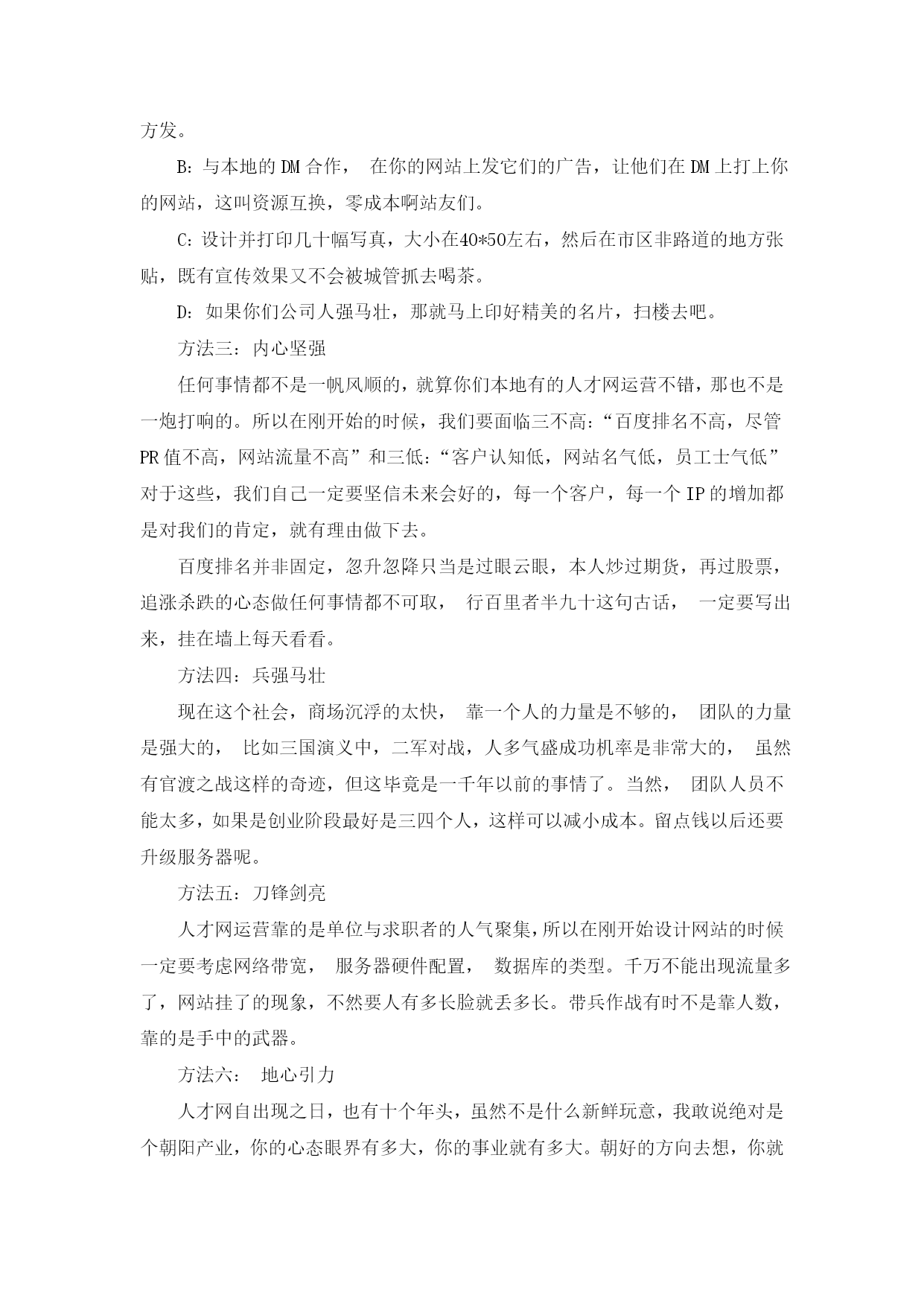 地方人才网成功运营的五个方法浅析随着生活节奏加快,科技文明进步,很多单位招聘,个人求职都喜欢通过网络来完成自己的选择需求。于是乎,各种人才网站像施了肥的庄稼,尽情生长,更是出现一个地区几个人才网竞争的局面。尽管现在建个人才网的门槛比较低,但是能够成功运营却需要讲究方法。方法一:网上运动A:把自己的人才网址提交给各大搜索引擎和网址站,百度与谷歌不能怠慢,一定要提交。为了争取能尽快收录,就在权重比较高的论坛上发些尽量是原创的贴子,并在贴子上附上自己的人才网址,这样才能争取到更多的外链。发外链不能太心急每天五个,十个,二十个递增,以后匀速保持在四十左右的水平,不然大幅度增加外链小心百度K你,我就吃过这个害啊。B:把自己人才网美工做好,就像去逛商场,如果购物环境太差你也没心情买东西,道理是一样的。对于LOGO设计的简洁大方,自己美工不行,可以到猪八戒或是威客中国上面找个能手做,最多二百块。精美的LOGO也适用在名片上,这样出去跑业务的话,客户接过名片一看对你公司的看法绝对不一样。C:很多站长都恨不得让全天下的人都自己的网站,但是饭要一口一口的吃。对于网上推广我有五个点子。a:把自己加入本地很多的QQ群中,利用图片,文字的形式发消息,当然频率不能太快,一天四次为宜,时间分别为9点,11点,15点,20点。b:在本地的有名的论坛中申请帐号,然后在相关的版块里发布自己的信息。c:在百度贴吧,知道吧,QQ问中查看有没有关于自己本地人才网的问题,然后回答。d:与本地的网站站长交换连接。这样的结盟对自己以后的帮助是相当大的。e:到交换连接网站上找人才网,跟他们交换连接,可能你的PR值不高底气不足,但你一定要脸皮厚并且内心真诚。人心都是肉长的,谁都会理解的。方法二:网下运动A:很多人都会想到是发传单,根据我们宿迁人才网)的实践发现,这种方法可行性高,但效果不理想。那怎么办,印卡面(名片大小)然后在人流量多的地方发。B:与本地的DM合作,在你的网站上发它们的广告,让他们在DM上打上你的网站,这叫资源互换,零成本啊站友们。C:设计并打印几十幅写真,大小在40*50左右,然后在市区非路道的地方张贴,既有宣传效果又不会被城管抓去喝茶。D:如果你们公司人强马壮,那就马上印好精美的名片,扫楼去吧。方法三:内心坚强任何事情都不是一帆风顺的,就算你们本地有的人才网运营不错,那也不是一炮打响的。所以在刚开始的时候,我们要面临三不高:“百度排名不高,尽管PR值不高,网站流量不高”和三低:“客户认知低,网站名气低,员工士气低”对于这些,我们自己一定要坚信未来会好的,每一个客户,每一个IP的增加都是对我们的肯定,就有理由做下去。百度排名并非固定,忽升忽降只当是过眼云眼,本人炒过期货,再过股票,追涨杀跌的心态做任何事情都不可取,行百里者半九十这句古话,一定要写出来,挂在墙上每天看看。方法四:兵强马壮现在这个社会,商场沉浮的太快,靠一个人的力量是不够的,团队的力量是强大的,比如三国演义中,二军对战,人多气盛成功机率是非常大的,虽然有官渡之战这样的奇迹,但这毕竟是一千年以前的事情了。当然,团队人员不能太多,如果是创业阶段最好是三四个人,这样可以减小成本。留点钱以后还要升级服务器呢。方法五:刀锋剑亮人才网运营靠的是单位与求职者的人气聚集,所以在刚开始设计网站的时候一定要考虑网络带宽,服务器硬件配置,数据库的类型。千万不能出现流量多了,网站挂了的现象,不然要人有多长脸就丢多长。带兵作战有时不是靠人数,靠的是手中的武器。方法六:地心引力人才网自出现之日,也有十个年头,虽然不是什么新鲜玩意,我敢说绝对是个朝阳产业,你的心态眼界有多大,你的事业就有多大。朝好的方向去想,你就会有好的点子浮现在你的脑海。本文由HYPERLINK"http://www.panfawang.com"盘发网整理编辑HYPERLINK"http://www.panfawang.com"http://www.panfawang.com