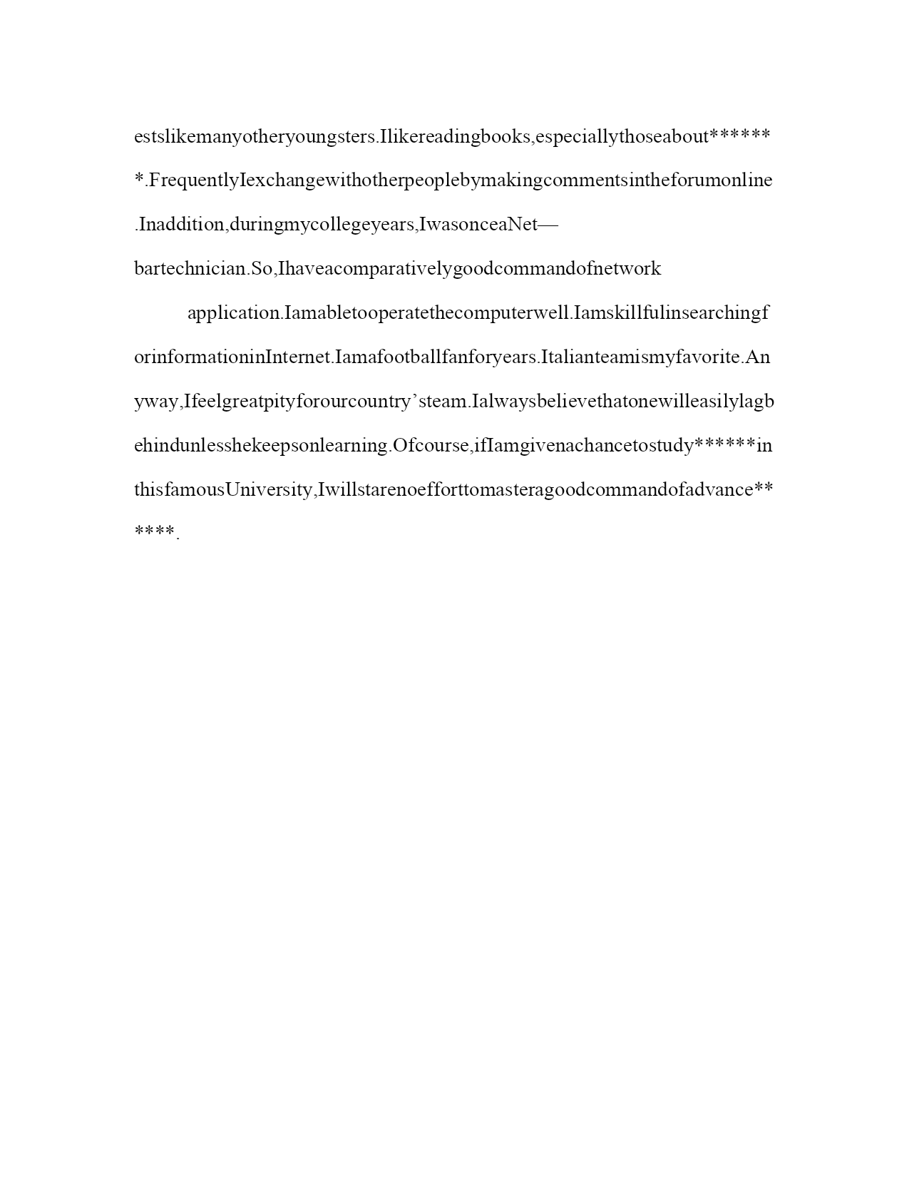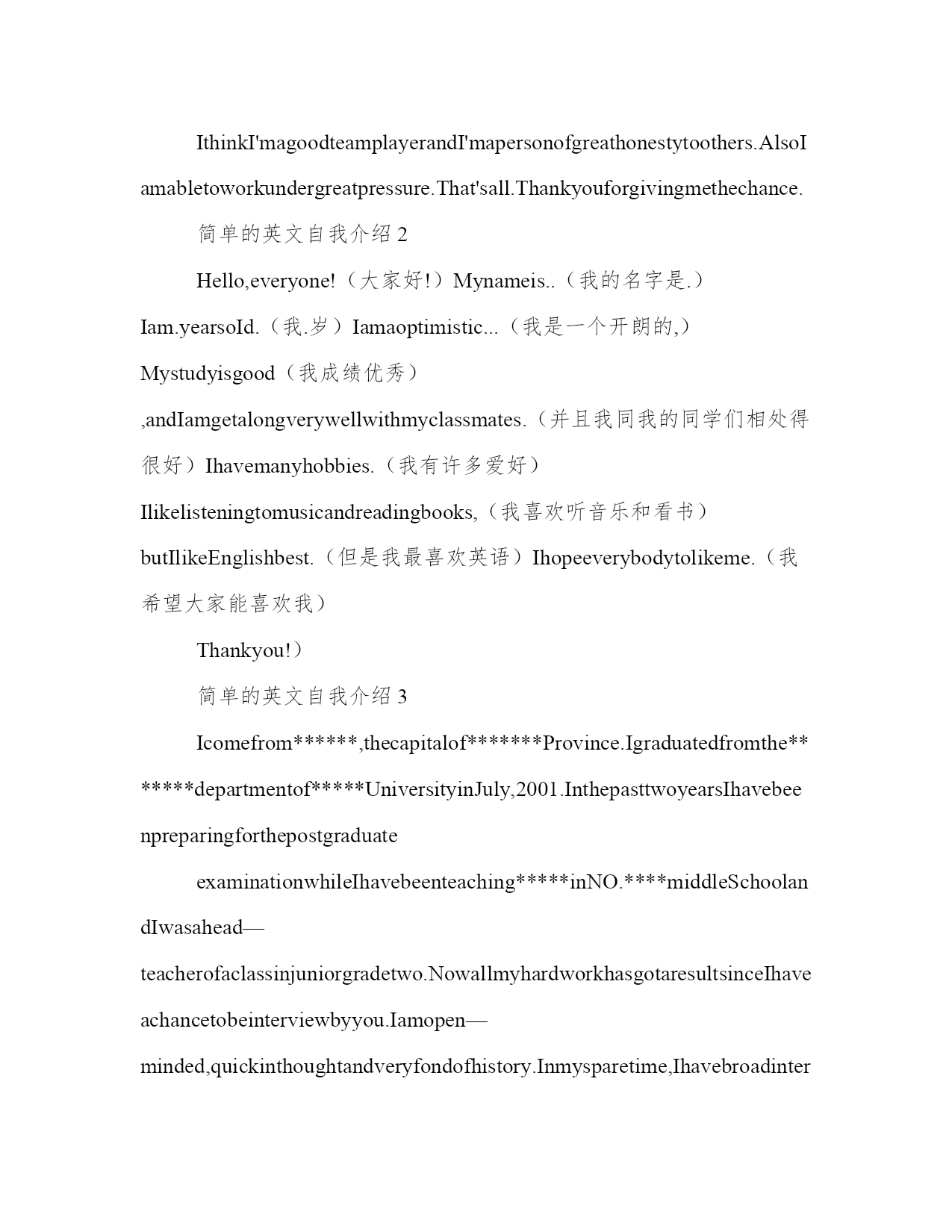 简单的英文自我介绍简单的英文自我介绍1Goodmorning!Itisreallymyhonortohavethisopportunityforainterview,Ihopeicanmakeagoodperformancetoday.I'mconfidentthatIcansucceed.NowiwillintroducemyselfbrieflyIam26yearsold,borninshandongprovince.Iwasgraduatedfromqingdaouniversity.mymajoriselectronic.andigotmybachelordegreeaftermygraduationintheyearof2003.Ispendmostofmytimeonstudy,ihavepassedCET4/6.andihaveacquiredbasicknowledgeofmymajorduringmyschooltime.InJuly2003,IbeginworkforasmallprivatecompanyasatechnicalsupportengineerinQingDaocity.BecauseI'mcapableofmoreresponsibilities,soIdecidedtochangemyjob.AndinAugust2004,IleftQingDaotoBeiJingandworkedforaforeignenterpriseasaautomationsoftwaretestengineer.BecauseIwanttochangemyworkingenvironment,I'dliketofindajobwhichismorechallenging.MoroverMotorolaisaglobalcompany,soIfeelIcangainthemostfromworkinginthiskindofcompanyennvironment.ThatisthereasonwhyIcomeheretocompeteforthisposition.IthinkI'magoodteamplayerandI'mapersonofgreathonestytoothers.AlsoIamabletoworkundergreatpressure.That'sall.Thankyouforgivingmethechance.简单的英文自我介绍2Hello,everyone!(大家好!)Mynameis..(我的名字是.)Iam.yearsoId.(我.岁)Iamaoptimistic...(我是一个开朗的,)Mystudyisgood(我成绩优秀),andIamgetalongverywellwithmyclassmates.(并且我同我的同学们相处得很好)Ihavemanyhobbies.(我有许多爱好)Ilikelisteningtomusicandreadingbooks,(我喜欢听音乐和看书)butIlikeEnglishbest.(但是我最喜欢英语)Ihopeeverybodytolikeme.(我希望大家能喜欢我)Thankyou!)简单的英文自我介绍3Icomefrom******,thecapitalof*******Province.Igraduatedfromthe*******departmentof*****UniversityinJuly,2001.InthepasttwoyearsIhavebeenpreparingforthepostgraduateexaminationwhileIhavebeenteaching*****inNO.****middleSchoolandIwasahead—teacherofaclassinjuniorgradetwo.NowallmyhardworkhasgotaresultsinceIhaveachancetobeinterviewbyyou.Iamopen—minded,quickinthoughtandveryfondofhistory.Inmysparetime,Ihavebroadinterestslikemanyotheryoungsters.Ilikereadingbooks,especiallythoseabout*******.FrequentlyIexchangewithotherpeoplebymakingcommentsintheforumonline.Inaddition,duringmycollegeyears,IwasonceaNet—bartechnician.So,Iha