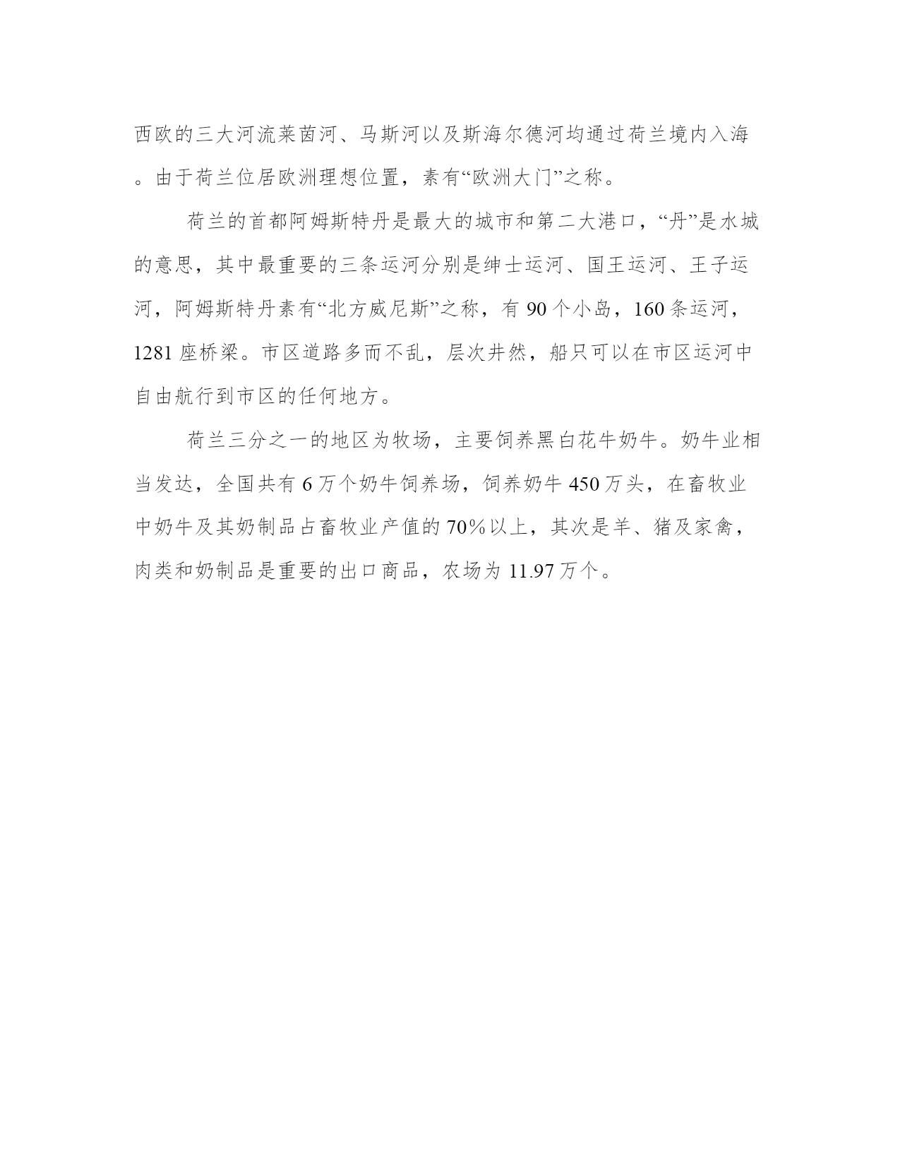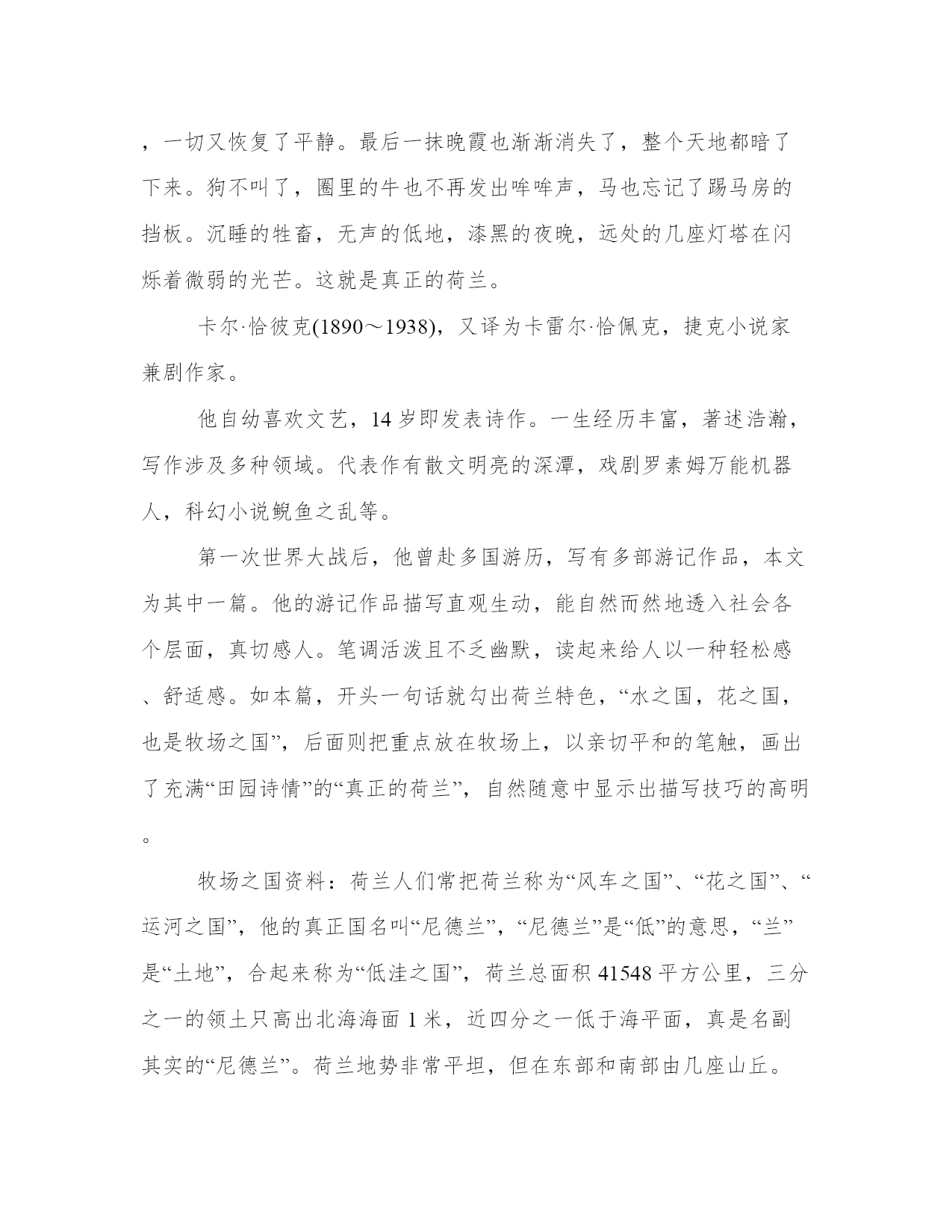 牧场之国课文资料荷兰,是水之国,花之国,也是牧场之国。一条条运河之间的绿色低地上,黑白花牛,白头黑牛,白腰蓝嘴黑牛,在低头吃草。有的牛背上盖着防潮的毛毡。牛群吃草时非常专注,有时站立不动,仿佛正在思考着什么。牛犊的模样像贵夫人,仪态端庄。老牛好似牛群的家长,无比尊严。极目远眺,四周全是丝绒般的碧绿草原和黑白两色的花牛。这就是真正的荷兰。这就是真正的荷兰:碧绿色的低地镶嵌在一条条运河之间,成群的骏马,匹匹剽肥体壮。除了深深的野草遮掩着的运河,没有什么能够阻挡它们飞驰到远方。辽阔无垠的原野似乎归它们所有,它们是这个自由王国的主人和公爵。在天堂般的绿色草原上,白色的绵羊,悠然自得。黑色的猪群,不停地呼噜着,像是对什么表示赞许。成千上万的小鸡,成群结队的长毛山羊,在见不到一个人影的绿草地上,安闲地欣赏着这属于它们自己的王国。这就是真正的荷兰。到了傍晚,才看见有人驾着小船过来,坐上小板凳,给严肃沉默的奶牛挤奶。金色的晚霞铺在西天,远处偶尔传来汽笛声,接着又是一片寂静。在这里,谁都不叫喊吆喝,牛脖子上的铃铛也没有响声,挤奶的人更是默默无言。运河之中,装满奶桶的船只在舒缓平稳地行驶。满载着一罐一罐牛奶的汽车、火车,不停地开往城市。车船过后,一切又恢复了平静。最后一抹晚霞也渐渐消失了,整个天地都暗了下来。狗不叫了,圈里的牛也不再发出哞哞声,马也忘记了踢马房的挡板。沉睡的牲畜,无声的低地,漆黑的夜晚,远处的几座灯塔在闪烁着微弱的光芒。这就是真正的荷兰。卡尔·恰彼克(1890~1938),又译为卡雷尔·恰佩克,捷克小说家兼剧作家。他自幼喜欢文艺,14岁即发表诗作。一生经历丰富,著述浩瀚,写作涉及多种领域。代表作有散文明亮的深潭,戏剧罗素姆万能机器人,科幻小说鲵鱼之乱等。第一次世界大战后,他曾赴多国游历,写有多部游记作品,本文为其中一篇。他的游记作品描写直观生动,能自然而然地透入社会各个层面,真切感人。笔调活泼且不乏幽默,读起来给人以一种轻松感、舒适感。如本篇,开头一句话就勾出荷兰特色,“水之国,花之国,也是牧场之国”,后面则把重点放在牧场上,以亲切平和的笔触,画出了充满“田园诗情”的“真正的荷兰”,自然随意中显示出描写技巧的高明。牧场之国资料:荷兰人们常把荷兰称为“风车之国”、“花之国”、“运河之国”,他的真正国名叫“尼德兰”,“尼德兰”是“低”的意思,“兰”是“土地”,合起来称为“低洼之国”,荷兰总面积41548平方公里,三分之一的领土只高出北海海面1米,近四分之一低于海平面,真是名副其实的“尼德兰”。荷兰地势非常平坦,但在东部和南部由几座山丘。西欧的三大河流莱茵河、马斯河以及斯海尔德河均通过荷兰境内入海。由于荷兰位居欧洲理想位置,素有“欧洲大门”之称。荷兰的首都阿姆斯特丹是最大的城市和第二大港口,“丹”是水城的意思,其中最重要的三条运河分别是绅士运河、国王运河、王子运河,阿姆斯特丹素有“北方威尼斯”之称,有90个小岛,160条运河,1281座桥梁。市区道路多而不乱,层次井然,船只可以在市区运河中自由航行到市区的任何地方。荷兰三分之一的地区为牧场,主要饲养黑白花牛奶牛。奶牛业相当发达,全国共有6万个奶牛饲养场,饲养奶牛450万头,在畜牧业中奶牛及其奶制品占畜牧业产值的70%以上,其次是羊、猪及家禽,肉类和奶制品是重要的出口商品,农场为11.97万个。
