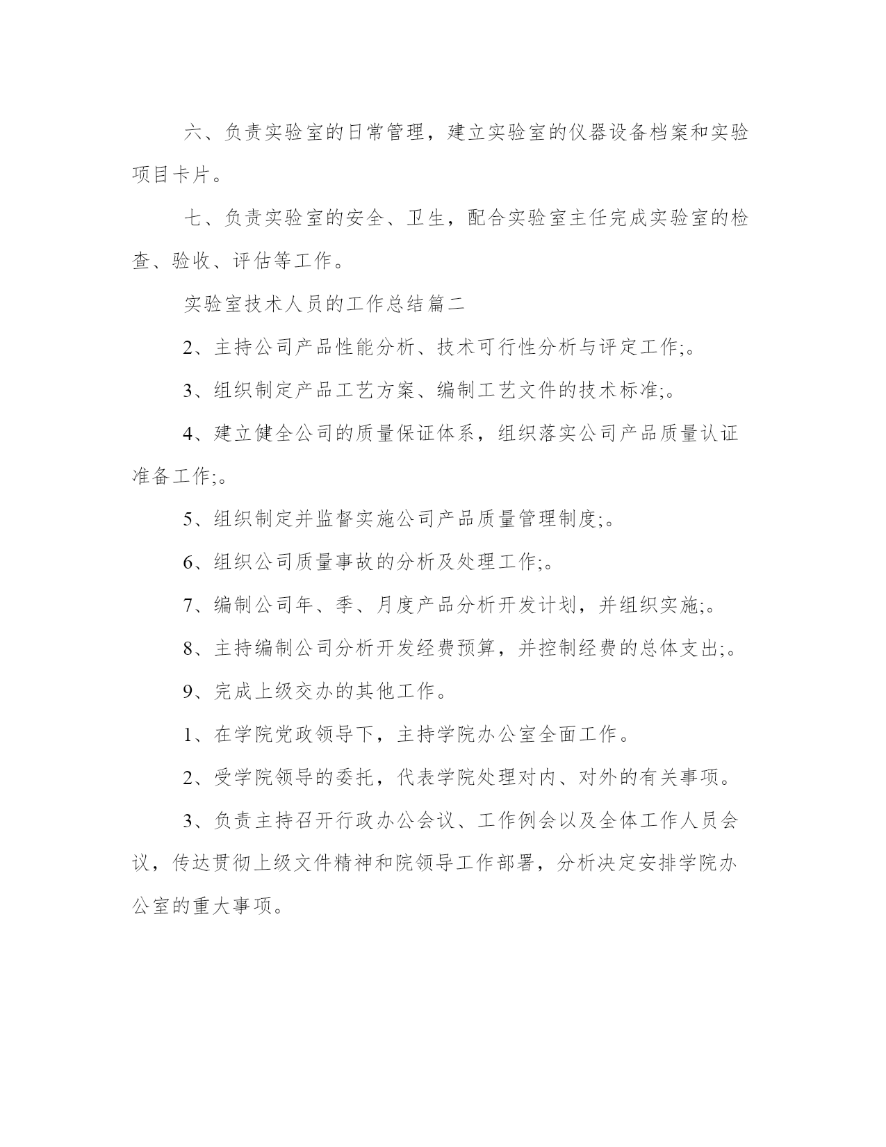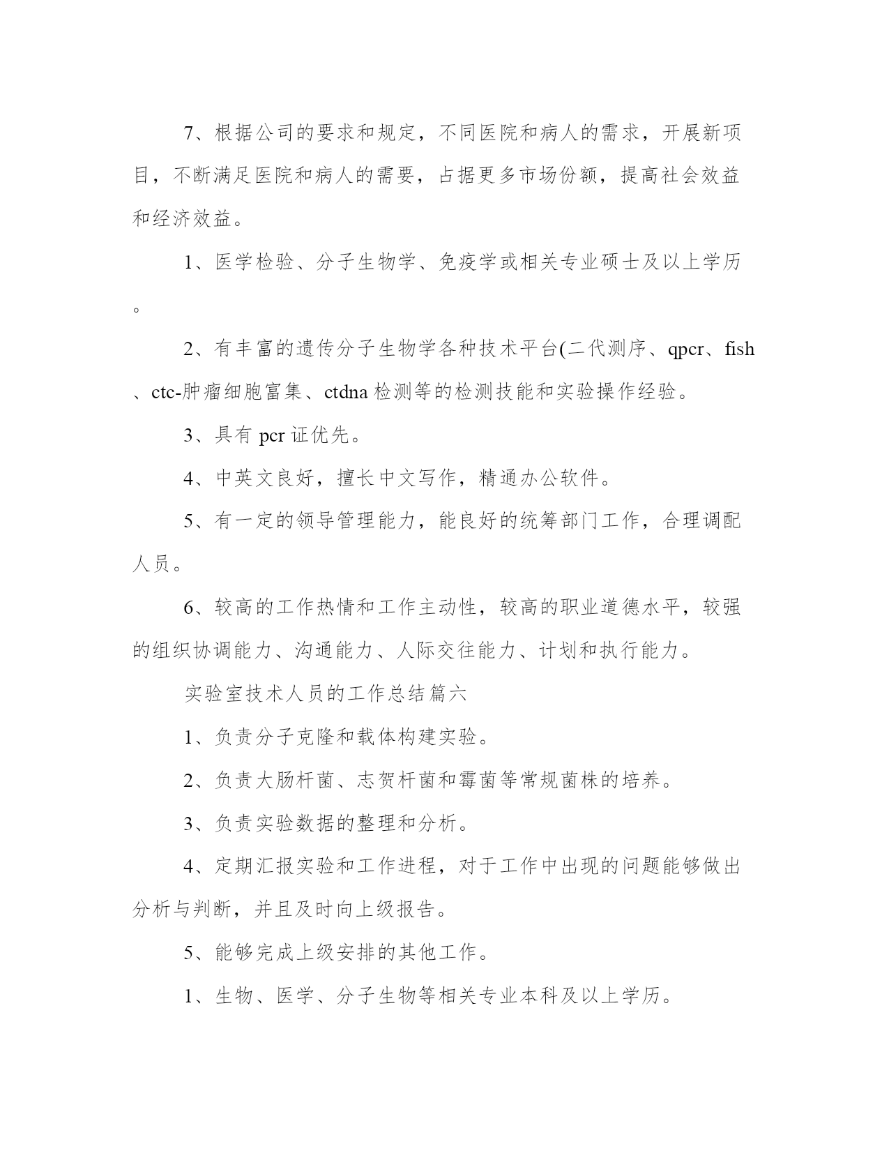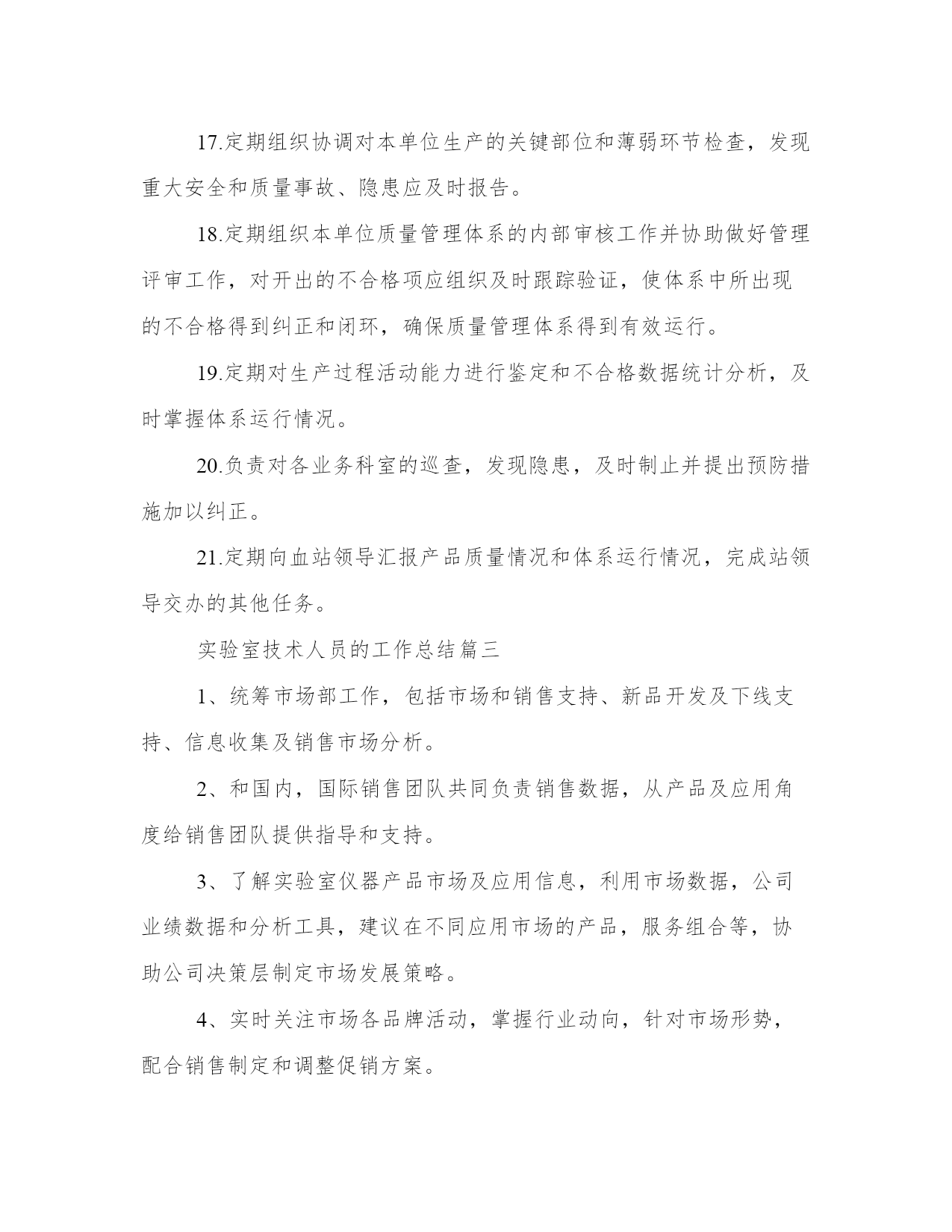 实验室技术人员的工作总结(实用20篇)通过总结,我们可以更好地发现自己的优势和劣势,从而更有针对性地提升自己。在总结中,可以适当加入自己的感悟和建议,展示对学习和工作的思考。接下来,我们一起来看看一些经典的总结案例,希望能给大家一些启发。实验室技术人员的工作总结篇一为保证实验教学工作的顺利进行,更好地完成实验教学改革,提高实验教学质量,实验室的实验技术人员应履行如下岗位职责:一、积极参加实验中心的建设和管理,认真完成实验室主任下达的各项任务。二、积极参加实验教学改革,如增加新实验项目及旧实验内容的更新,协助教师做好学生实验技术的指导。三、按照实验教学计划,按时完成实验前的各项准备,协助实验指导教师解决实验中所出现的相关问题,并做好实验后的整理工作。四、负责制定实验室仪器设备的操作规程和注意事项,保证实验教学仪器设备的正常运行。五、负责实验室相关仪器设备、配件、器材、药品和低值易耗品的管理,做到账、物、卡相符,按学校要求完成对各类物品的编号工作。六、负责实验室的日常管理,建立实验室的仪器设备档案和实验项目卡片。七、负责实验室的安全、卫生,配合实验室主任完成实验室的检查、验收、评估等工作。实验室技术人员的工作总结篇二2、主持公司产品性能分析、技术可行性分析与评定工作;。3、组织制定产品工艺方案、编制工艺文件的技术标准;。4、建立健全公司的质量保证体系,组织落实公司产品质量认证准备工作;。5、组织制定并监督实施公司产品质量管理制度;。6、组织公司质量事故的分析及处理工作;。7、编制公司年、季、月度产品分析开发计划,并组织实施;。8、主持编制公司分析开发经费预算,并控制经费的总体支出;。9、完成上级交办的其他工作。1、在学院党政领导下,主持学院办公室全面工作。2、受学院领导的委托,代表学院处理对内、对外的有关事项。3、负责主持召开行政办公会议、工作例会以及全体工作人员会议,传达贯彻上级文件精神和院领导工作部署,分析决定安排学院办公室的重大事项。4、拟定各级来文来电的分送处理意见,组织起草学院党政工作报告、发展规划、总结、计划、决议、纪要等文件,审签学院党政各类文件,签发学院办公室文件。5、协助院领导组织好各类会议,负责会议题的初审并分报主管领导审定;审签___,督促检查会议决议的贯彻落实。6、根据学院工作部署,综合协调各部门、各单位开展工作。7、组织开展调查分析,搜集整理信息,积极发挥领导参谋助手作用。8、督查督办上级部门和学院领导批示、学院的重要决定以及院领导安排事项的落实。9、协调安排学校党政领导工作日程。10、协助院领导组织处理学院突发事件和重大事故。11、负责校内外的联络沟通和公务接待工作。12、负责印信管理、来信来访、校友联络、机要保密等工作。13、负责学院办公室的资产财务、人事调配、安全保卫、服务保障等工作。14、负责办公室的自身建设,组织办公室人员的业务培训,提高政治素质、业务水平和实际工作能力。15、完成学院党政交办的其它工作。1.在站长或分管领导的领导下,根据法定标准和本部门的实际情况,制定本单位原辅材料及血液产品的质量检定、机采成分及临床治疗等业务操作规程、岗位职责和工作计划,并组织实施。2.以身作则,密切联系群众。督促全科人员遵守本血站的各项规章制度,合理安排全科人员的工作,明确分工、分组,认真落实各项工作任务。3.定期组织本科人员进行政治学习,做好职工的思想政治工作,激发职工的主人翁责任感。坚持原则,弘扬正气,敢于同不良风气作斗争。4.加强与兄弟科室之间的联系,取长补短,团结协作。定期召开全科人员会议,增强内部团结,分析存在问题,传达贯彻血站召开的会议精神,不断提高工作质量。5.定期组织本科人员进行业务培训并考核,不断提高本科人员的业务水平。6.经常对本科的各个工作环节进行监督检查,发现问题及时解决,对重大问题、差错事故应及时向主管领导汇报,配合有关部门进行分析并采取相应措施。7.带领全科成员做好原始资料的保存、统计、上报工作。定期对各种仪器设备进行保养,有故障的仪器设备应及时通知有关部门维修或更新。x槲室所需物品的增补应做到及时、节约。8.协助各兄弟科室解决实际工作中的疑点和难点。9.不断引进输血新技术,组织本科人员积极开展血液和输血技术的应用分析,努力开发新产品,提高血站经济效益。及时做好科研课题申报工作。10.密切注意输血专业的国内外动态,经常组织本科人员的政治、业务学习,开展学术活动,举办不同类型的培训班,培养输血技术人才。11.密切联系临床,经常深人医院,调查分析,收集信息,协助医院解决临床输血中的疑难问题,积极开展临床辅助诊断项目,扩大对临床的服务范围。12.负责本血站的各种产品生产过程的质量监督和质量鉴定