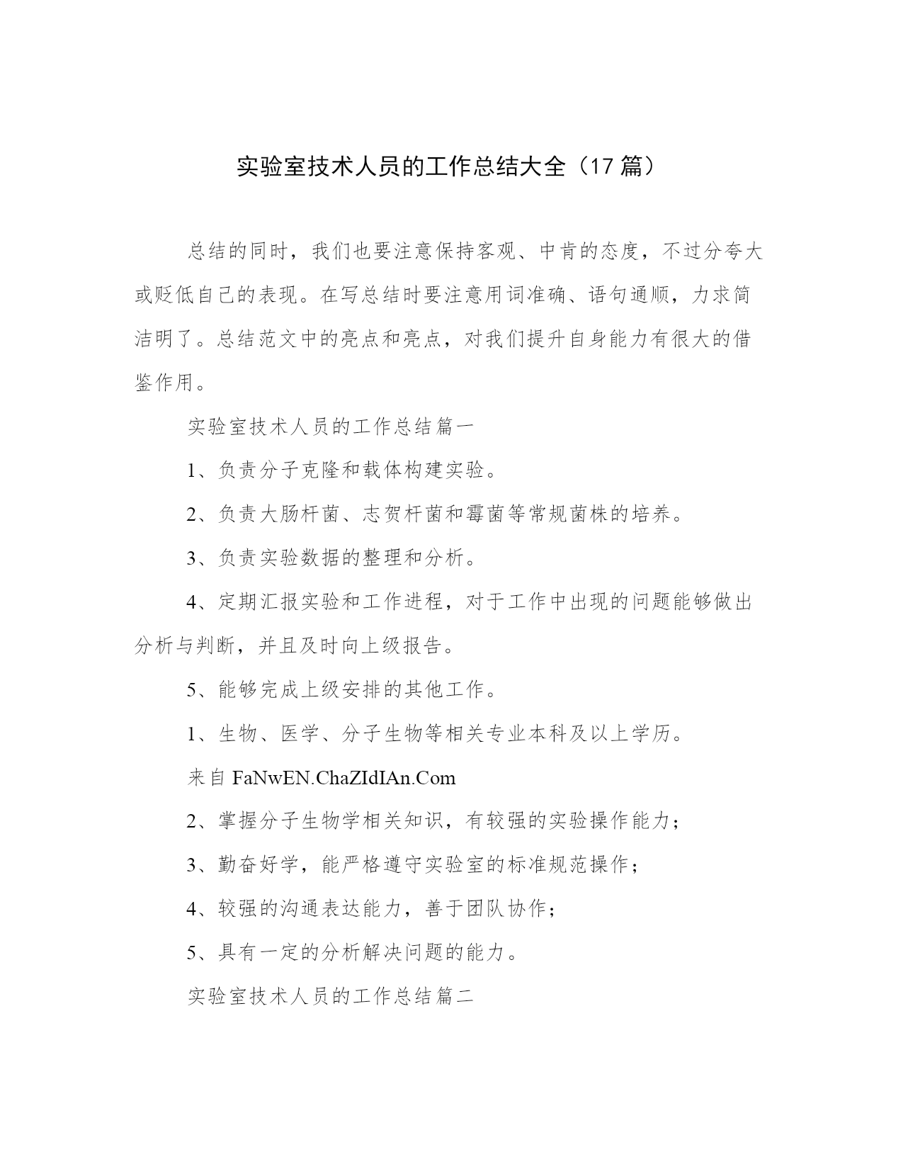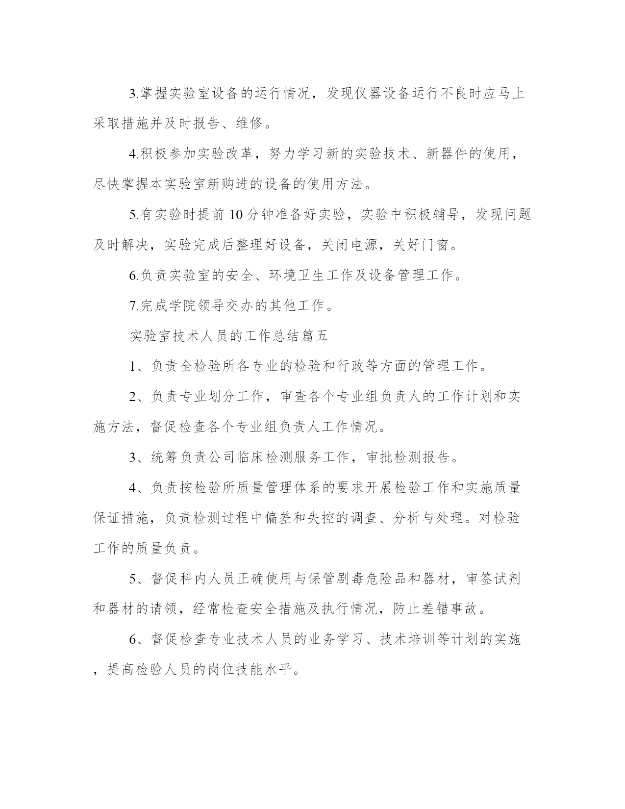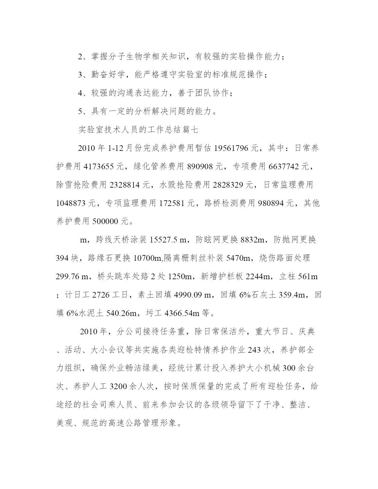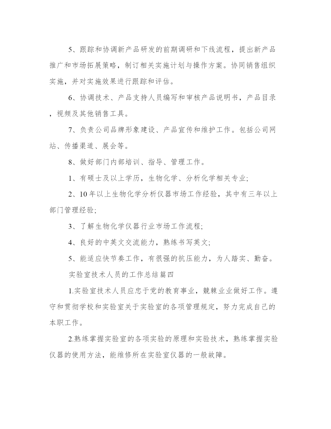 实验室技术人员的工作总结(实用20篇)通过总结,我们可以更好地发现自己的优势和劣势,从而更有针对性地提升自己。在总结中,可以适当加入自己的感悟和建议,展示对学习和工作的思考。接下来,我们一起来看看一些经典的总结案例,希望能给大家一些启发。实验室技术人员的工作总结篇一为保证实验教学工作的顺利进行,更好地完成实验教学改革,提高实验教学质量,实验室的实验技术人员应履行如下岗位职责:一、积极参加实验中心的建设和管理,认真完成实验室主任下达的各项任务。二、积极参加实验教学改革,如增加新实验项目及旧实验内容的更新,协助教师做好学生实验技术的指导。三、按照实验教学计划,按时完成实验前的各项准备,协助实验指导教师解决实验中所出现的相关问题,并做好实验后的整理工作。四、负责制定实验室仪器设备的操作规程和注意事项,保证实验教学仪器设备的正常运行。五、负责实验室相关仪器设备、配件、器材、药品和低值易耗品的管理,做到账、物、卡相符,按学校要求完成对各类物品的编号工作。六、负责实验室的日常管理,建立实验室的仪器设备档案和实验项目卡片。七、负责实验室的安全、卫生,配合实验室主任完成实验室的检查、验收、评估等工作。实验室技术人员的工作总结篇二2、主持公司产品性能分析、技术可行性分析与评定工作;。3、组织制定产品工艺方案、编制工艺文件的技术标准;。4、建立健全公司的质量保证体系,组织落实公司产品质量认证准备工作;。5、组织制定并监督实施公司产品质量管理制度;。6、组织公司质量事故的分析及处理工作;。7、编制公司年、季、月度产品分析开发计划,并组织实施;。8、主持编制公司分析开发经费预算,并控制经费的总体支出;。9、完成上级交办的其他工作。1、在学院党政领导下,主持学院办公室全面工作。2、受学院领导的委托,代表学院处理对内、对外的有关事项。3、负责主持召开行政办公会议、工作例会以及全体工作人员会议,传达贯彻上级文件精神和院领导工作部署,分析决定安排学院办公室的重大事项。4、拟定各级来文来电的分送处理意见,组织起草学院党政工作报告、发展规划、总结、计划、决议、纪要等文件,审签学院党政各类文件,签发学院办公室文件。5、协助院领导组织好各类会议,负责会议题的初审并分报主管领导审定;审签___,督促检查会议决议的贯彻落实。6、根据学院工作部署,综合协调各部门、各单位开展工作。7、组织开展调查分析,搜集整理信息,积极发挥领导参谋助手作用。8、督查督办上级部门和学院领导批示、学院的重要决定以及院领导安排事项的落实。9、协调安排学校党政领导工作日程。10、协助院领导组织处理学院突发事件和重大事故。11、负责校内外的联络沟通和公务接待工作。12、负责印信管理、来信来访、校友联络、机要保密等工作。13、负责学院办公室的资产财务、人事调配、安全保卫、服务保障等工作。14、负责办公室的自身建设,组织办公室人员的业务培训,提高政治素质、业务水平和实际工作能力。15、完成学院党政交办的其它工作。1.在站长或分管领导的领导下,根据法定标准和本部门的实际情况,制定本单位原辅材料及血液产品的质量检定、机采成分及临床治疗等业务操作规程、岗位职责和工作计划,并组织实施。2.以身作则,密切联系群众。督促全科人员遵守本血站的各项规章制度,合理安排全科人员的工作,明确分工、分组,认真落实各项工作任务。3.定期组织本科人员进行政治学习,做好职工的思想政治工作,激发职工的主人翁责任感。坚持原则,弘扬正气,敢于同不良风气作斗争。4.加强与兄弟科室之间的联系,取长补短,团结协作。定期召开全科人员会议,增强内部团结,分析存在问题,传达贯彻血站召开的会议精神,不断提高工作质量。5.定期组织本科人员进行业务培训并考核,不断提高本科人员的业务水平。6.经常对本科的各个工作环节进行监督检查,发现问题及时解决,对重大问题、差错事故应及时向主管领导汇报,配合有关部门进行分析并采取相应措施。7.带领全科成员做好原始资料的保存、统计、上报工作。定期对各种仪器设备进行保养,有故障的仪器设备应及时通知有关部门维修或更新。x槲室所需物品的增补应做到及时、节约。8.协助各兄弟科室解决实际工作中的疑点和难点。9.不断引进输血新技术,组织本科人员积极开展血液和输血技术的应用分析,努力开发新产品,提高血站经济效益。及时做好科研课题申报工作。10.密切注意输血专业的国内外动态,经常组织本科人员的政治、业务学习,开展学术活动,举办不同类型的培训班,培养输血技术人才。11.密切联系临床,经常深人医院,调查分析,收集信息,协助医院解决临床输血中的疑难问题,积极开展临床辅助诊断项目,扩大对临床的服务范围。12.负责本血站的各种产品生产过程的质量监督和质量鉴定
