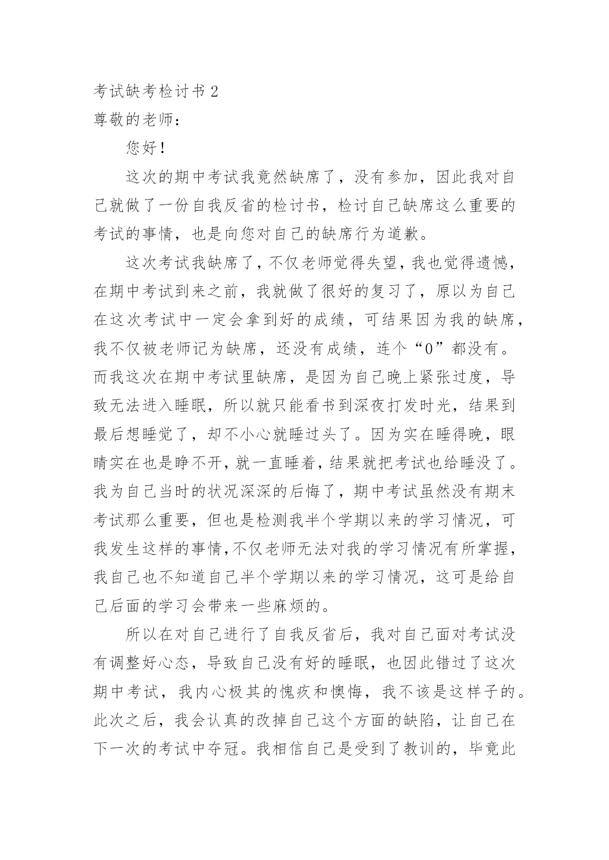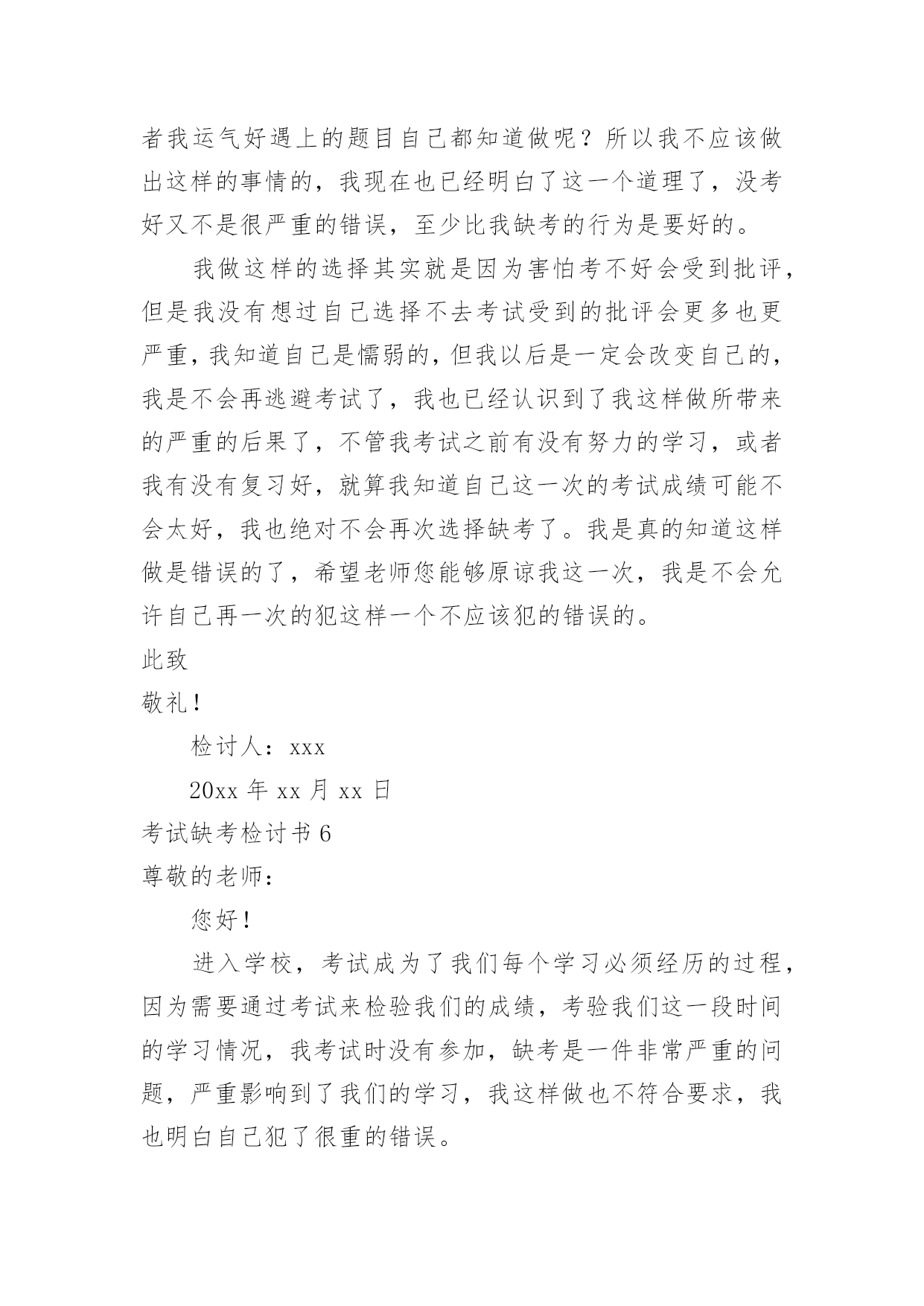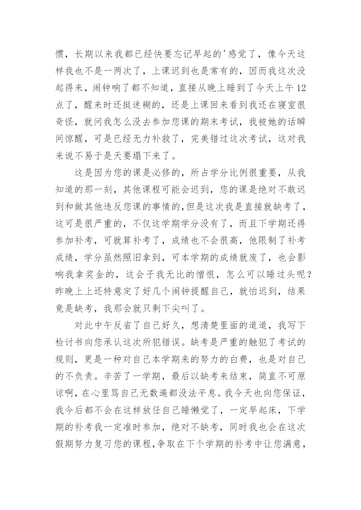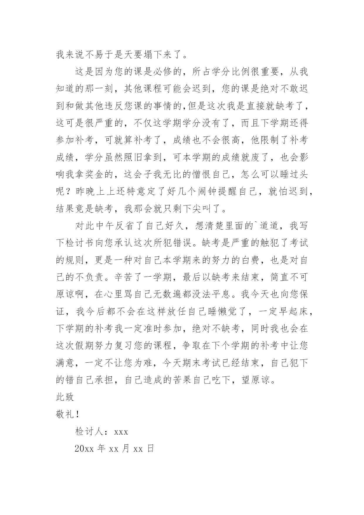 考试缺考检讨书考试缺考检讨书在学习、工作或生活中出现了问题或过错后,往往要写检讨书来自我悔悟,要注意检讨书不能写成流水账。问题来了,检讨书应该怎么写?下面是小编精心整理的考试缺考检讨书,希望对大家有所帮助。考试缺考检讨书1尊敬的老师:您好!我是大二xx专业xx班的学生xxx,今天上午是您的课的期末考试,但是我没有按时参加考试并且还缺考了,由此现在来检讨这次缺考行为,抱歉没有遵守您考试秩序。今天上午这场考试是您这个学期课程的结束,也是我这门课节课,是很重要的,但是我会直接睡过去了,完全记不起还有考试,还是期末考试。因为到了大二,我的课就相对减少了,因此早上几天都可能没课,所以我就养成了睡懒觉的习惯,长期以来我都已经快要忘记早起的感觉了,像今天这样我也不是一两次了,上课迟到也是常有的,因而我这次没起得来,闹钟响了都不知道,直接从晚上睡到了今天上午12点了,醒来时还挺迷糊的,还是上课回来看到我还在寝室很奇怪,就问我怎么没去参加您课的期末考试,我被她的话瞬间惊醒,可是已经无力补救了,完美错过这次考试,这对我来说不易于是天要塌下来了。这是因为您的课是必修的,所占学分比例很重要,从我知道的那一刻,其他课程可能会迟到,您的课是绝对不敢迟到和做其他违反您课的事情的,但是这次我是直接就缺考了,这可是很严重的,不仅这学期学分没有了,而且下学期还得参加补考,可就算补考了,成绩也不会很高,他限制了补考成绩,学分虽然照旧拿到,可本学期的成绩就废了,也会影响我拿奖金的,这会子我无比的憎恨自己,怎么可以睡过头呢?昨晚上上还特意定了好几个闹钟提醒自己,就怕迟到,结果竟是缺考,我那会就只剩下尖叫了。对此中午反省了自己好久,想清楚里面的`道道,我写下检讨书向您承认这次所犯错误。缺考是严重的触犯了考试的规则,更是一种对自己本学期来的努力的白费,也是对自己的不负责。辛苦了一学期,最后以缺考来结束,简直不可原谅啊,在心里骂自己无数遍都没法平息。我今天也向您保证,我今后都不会在这样放任自己睡懒觉了,一定早起床,下学期的补考我一定准时参加,绝对不缺考,同时我也会在这次假期努力复习您的课程,争取在下个学期的补考中让您满意,一定不让您为难,今天期末考试已经结束,自己犯下的错自己承担,自己造成的苦果自己吃下,望原谅。此致敬礼!检讨人:xxx20xx年xx月xx日考试缺考检讨书2尊敬的老师:您好!这次的期中考试我竟然缺席了,没有参加,因此我对自己就做了一份自我反省的检讨书,检讨自己缺席这么重要的考试的事情,也是向您对自己的缺席行为道歉。这次考试我缺席了,不仅老师觉得失望,我也觉得遗憾,在期中考试到来之前,我就做了很好的复习了,原以为自己在这次考试中一定会拿到好的成绩,可结果因为我的缺席,我不仅被老师记为缺席,还没有成绩,连个“0”都没有。而我这次在期中考试里缺席,是因为自己晚上紧张过度,导致无法进入睡眠,所以就只能看书到深夜打发时光,结果到最后想睡觉了,却不小心就睡过头了。因为实在睡得晚,眼睛实在也是睁不开,就一直睡着,结果就把考试也给睡没了。我为自己当时的状况深深的后悔了,期中考试虽然没有期末考试那么重要,但也是检测我半个学期以来的学习情况,可我发生这样的事情,不仅老师无法对我的学习情况有所掌握,我自己也不知道自己半个学期以来的学习情况,这可是给自己后面的学习会带来一些麻烦的。所以在对自己进行了自我反省后,我对自己面对考试没有调整好心态,导致自己没有好的睡眠,也因此错过了这次期中考试,我内心极其的愧疚和懊悔,我不该是这样子的。此次之后,我会认真的改掉自己这个方面的缺陷,让自己在下一次的考试中夺冠。我相信自己是受到了教训的,毕竟此次期中考试的成绩我是全班最低的,这已经让我很崩溃了,所以我就不会有下次了。缺席考试也是违反考场规定的,毕竟在这之前,老师您就说过无数遍了,就是希望所有的同学都能按时参加考试,在考试中去对自己的学习情况有所了解,才能更好的进行之后的学习。可我这一次的考试缺席,已经是不能去挽回的.损失了。我请求老师能给学生一次改过的机会,让我在下次的考试里取得很好的成绩。这次是学生自己的问题,我吸取此次的教训,一定不会有再次机会让自己缺席考试的。也请老师这次原谅我,我是真的认识自己的错误在哪了,我会去弥补的。一定不让老师失望了,所以望老师以后也还能继续支持学生,我会把学习和成绩提上来的。此致敬礼!检讨人:xxx20xx年xx月xx日考试缺考检讨书3您好!我是大二xx专业xx班的学生xxx,上午是您的课的期末,但是我没有按时参加考试并且还缺考了,由此现在来检讨缺考行为,抱歉没有遵守您考试秩序。今天上午这场考试是您这个课程的结束,也是我这门课节课,是很重要的,但是我会直接睡过去了,完全记不起还有考试,还是期末考试。因为到了大二,我的课就相对减少了,因此早上几天都可能没课,所