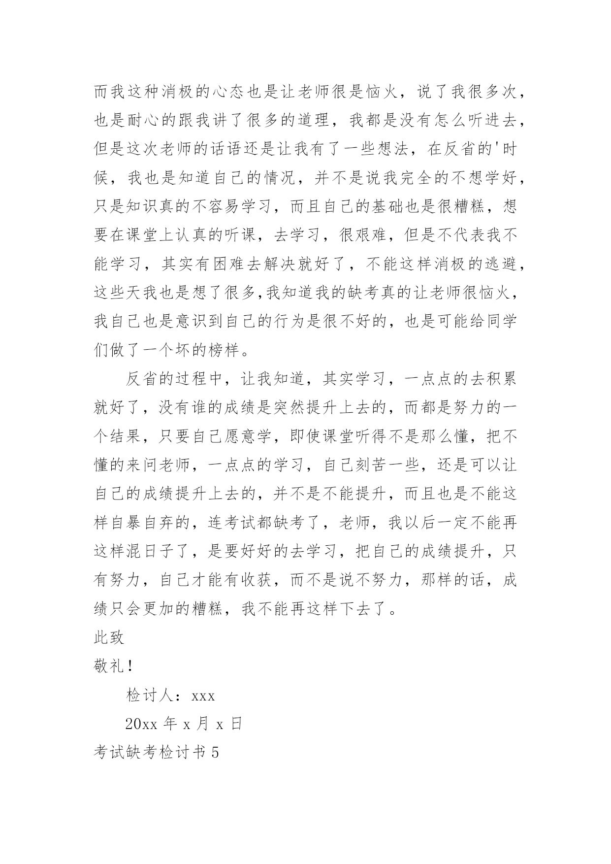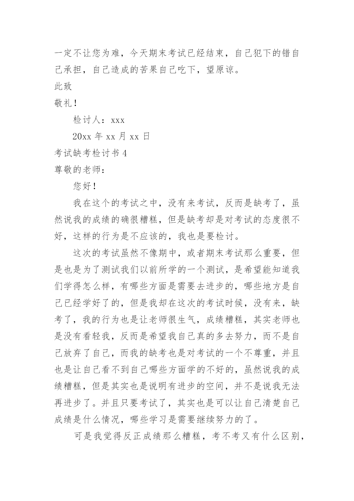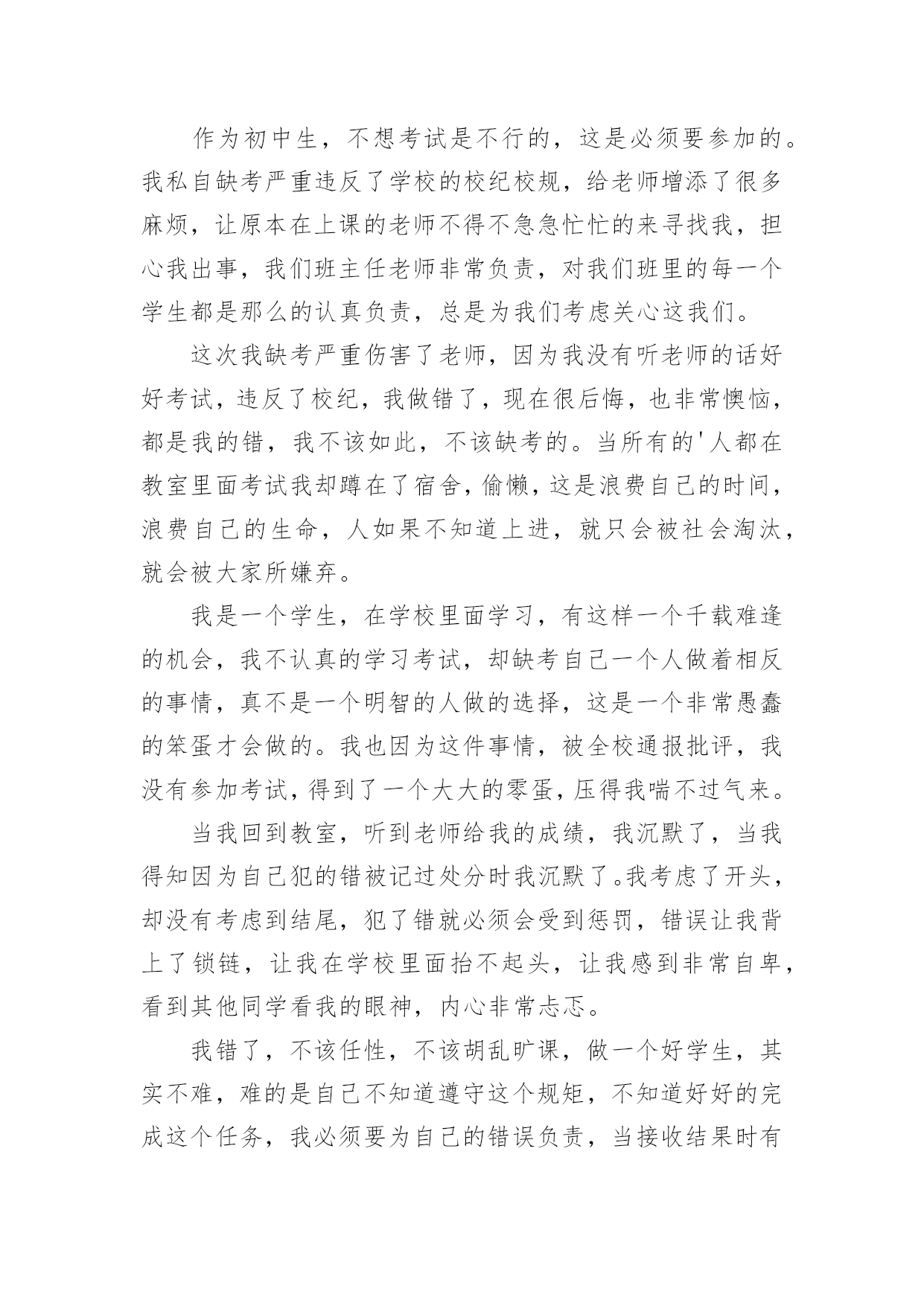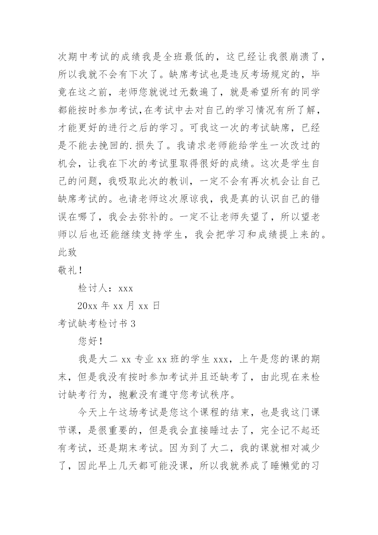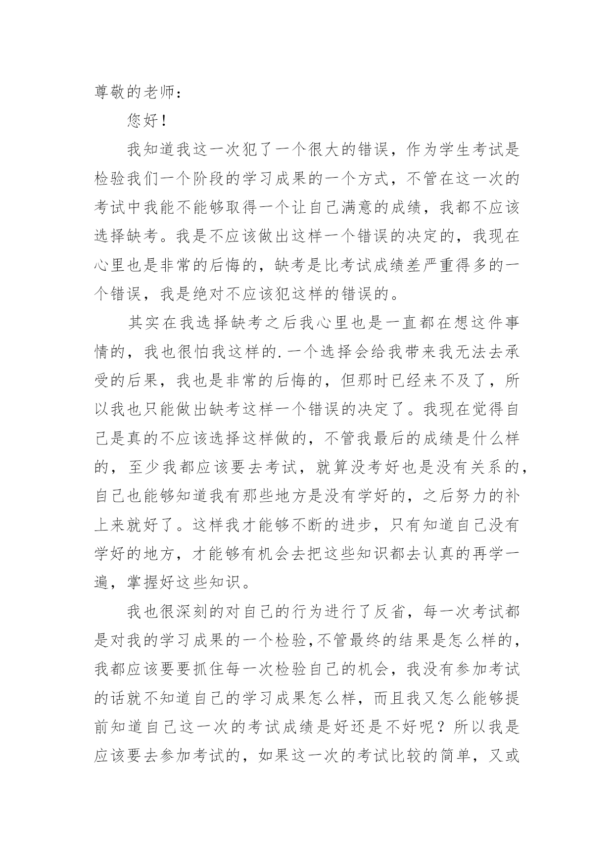 考试缺考检讨书考试缺考检讨书在学习、工作或生活中出现了问题或过错后,往往要写检讨书来自我悔悟,要注意检讨书不能写成流水账。问题来了,检讨书应该怎么写?下面是小编精心整理的考试缺考检讨书,希望对大家有所帮助。考试缺考检讨书1尊敬的老师:您好!我是大二xx专业xx班的学生xxx,今天上午是您的课的期末考试,但是我没有按时参加考试并且还缺考了,由此现在来检讨这次缺考行为,抱歉没有遵守您考试秩序。今天上午这场考试是您这个学期课程的结束,也是我这门课节课,是很重要的,但是我会直接睡过去了,完全记不起还有考试,还是期末考试。因为到了大二,我的课就相对减少了,因此早上几天都可能没课,所以我就养成了睡懒觉的习惯,长期以来我都已经快要忘记早起的感觉了,像今天这样我也不是一两次了,上课迟到也是常有的,因而我这次没起得来,闹钟响了都不知道,直接从晚上睡到了今天上午12点了,醒来时还挺迷糊的,还是上课回来看到我还在寝室很奇怪,就问我怎么没去参加您课的期末考试,我被她的话瞬间惊醒,可是已经无力补救了,完美错过这次考试,这对我来说不易于是天要塌下来了。这是因为您的课是必修的,所占学分比例很重要,从我知道的那一刻,其他课程可能会迟到,您的课是绝对不敢迟到和做其他违反您课的事情的,但是这次我是直接就缺考了,这可是很严重的,不仅这学期学分没有了,而且下学期还得参加补考,可就算补考了,成绩也不会很高,他限制了补考成绩,学分虽然照旧拿到,可本学期的成绩就废了,也会影响我拿奖金的,这会子我无比的憎恨自己,怎么可以睡过头呢?昨晚上上还特意定了好几个闹钟提醒自己,就怕迟到,结果竟是缺考,我那会就只剩下尖叫了。对此中午反省了自己好久,想清楚里面的`道道,我写下检讨书向您承认这次所犯错误。缺考是严重的触犯了考试的规则,更是一种对自己本学期来的努力的白费,也是对自己的不负责。辛苦了一学期,最后以缺考来结束,简直不可原谅啊,在心里骂自己无数遍都没法平息。我今天也向您保证,我今后都不会在这样放任自己睡懒觉了,一定早起床,下学期的补考我一定准时参加,绝对不缺考,同时我也会在这次假期努力复习您的课程,争取在下个学期的补考中让您满意,一定不让您为难,今天期末考试已经结束,自己犯下的错自己承担,自己造成的苦果自己吃下,望原谅。此致敬礼!检讨人:xxx20xx年xx月xx日考试缺考检讨书2尊敬的老师:您好!这次的期中考试我竟然缺席了,没有参加,因此我对自己就做了一份自我反省的检讨书,检讨自己缺席这么重要的考试的事情,也是向您对自己的缺席行为道歉。这次考试我缺席了,不仅老师觉得失望,我也觉得遗憾,在期中考试到来之前,我就做了很好的复习了,原以为自己在这次考试中一定会拿到好的成绩,可结果因为我的缺席,我不仅被老师记为缺席,还没有成绩,连个“0”都没有。而我这次在期中考试里缺席,是因为自己晚上紧张过度,导致无法进入睡眠,所以就只能看书到深夜打发时光,结果到最后想睡觉了,却不小心就睡过头了。因为实在睡得晚,眼睛实在也是睁不开,就一直睡着,结果就把考试也给睡没了。我为自己当时的状况深深的后悔了,期中考试虽然没有期末考试那么重要,但也是检测我半个学期以来的学习情况,可我发生这样的事情,不仅老师无法对我的学习情况有所掌握,我自己也不知道自己半个学期以来的学习情况,这可是给自己后面的学习会带来一些麻烦的。所以在对自己进行了自我反省后,我对自己面对考试没有调整好心态,导致自己没有好的睡眠,也因此错过了这次期中考试,我内心极其的愧疚和懊悔,我不该是这样子的。此次之后,我会认真的改掉自己这个方面的缺陷,让自己在下一次的考试中夺冠。我相信自己是受到了教训的,毕竟此次期中考试的成绩我是全班最低的,这已经让我很崩溃了,所以我就不会有下次了。缺席考试也是违反考场规定的,毕竟在这之前,老师您就说过无数遍了,就是希望所有的同学都能按时参加考试,在考试中去对自己的学习情况有所了解,才能更好的进行之后的学习。可我这一次的考试缺席,已经是不能去挽回的.损失了。我请求老师能给学生一次改过的机会,让我在下次的考试里取得很好的成绩。这次是学生自己的问题,我吸取此次的教训,一定不会有再次机会让自己缺席考试的。也请老师这次原谅我,我是真的认识自己的错误在哪了,我会去弥补的。一定不让老师失望了,所以望老师以后也还能继续支持学生,我会把学习和成绩提上来的。此致敬礼!检讨人:xxx20xx年xx月xx日考试缺考检讨书3您好!我是大二xx专业xx班的学生xxx,上午是您的课的期末,但是我没有按时参加考试并且还缺考了,由此现在来检讨缺考行为,抱歉没有遵守您考试秩序。今天上午这场考试是您这个课程的结束,也是我这门课节课,是很重要的,但是我会直接睡过去了,完全记不起还有考试,还是期末考试。因为到了大二,我的课就相对减少了,因此早上几天都可能没课,所