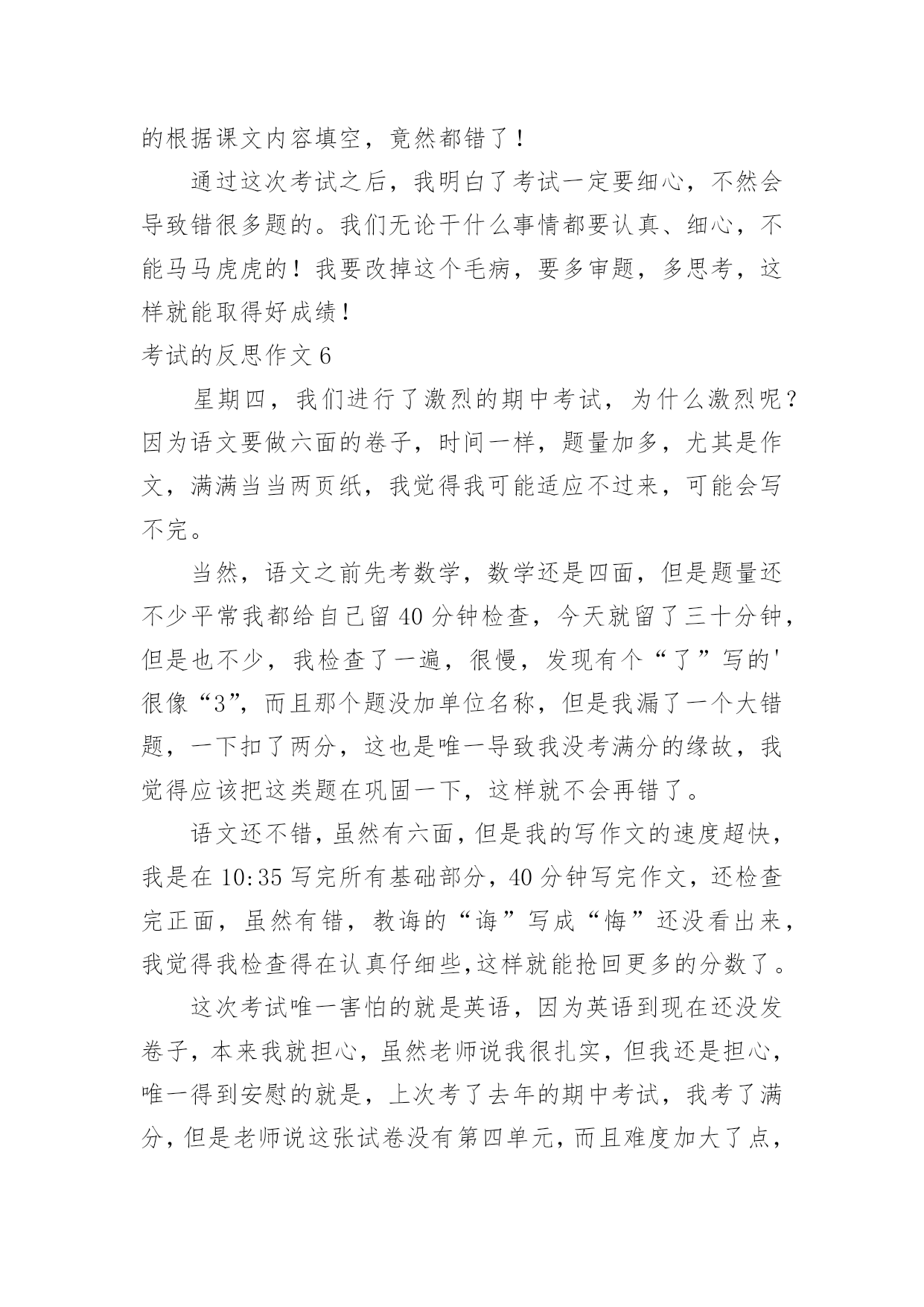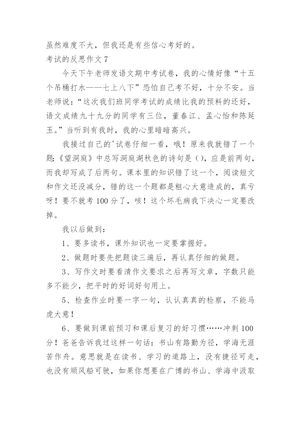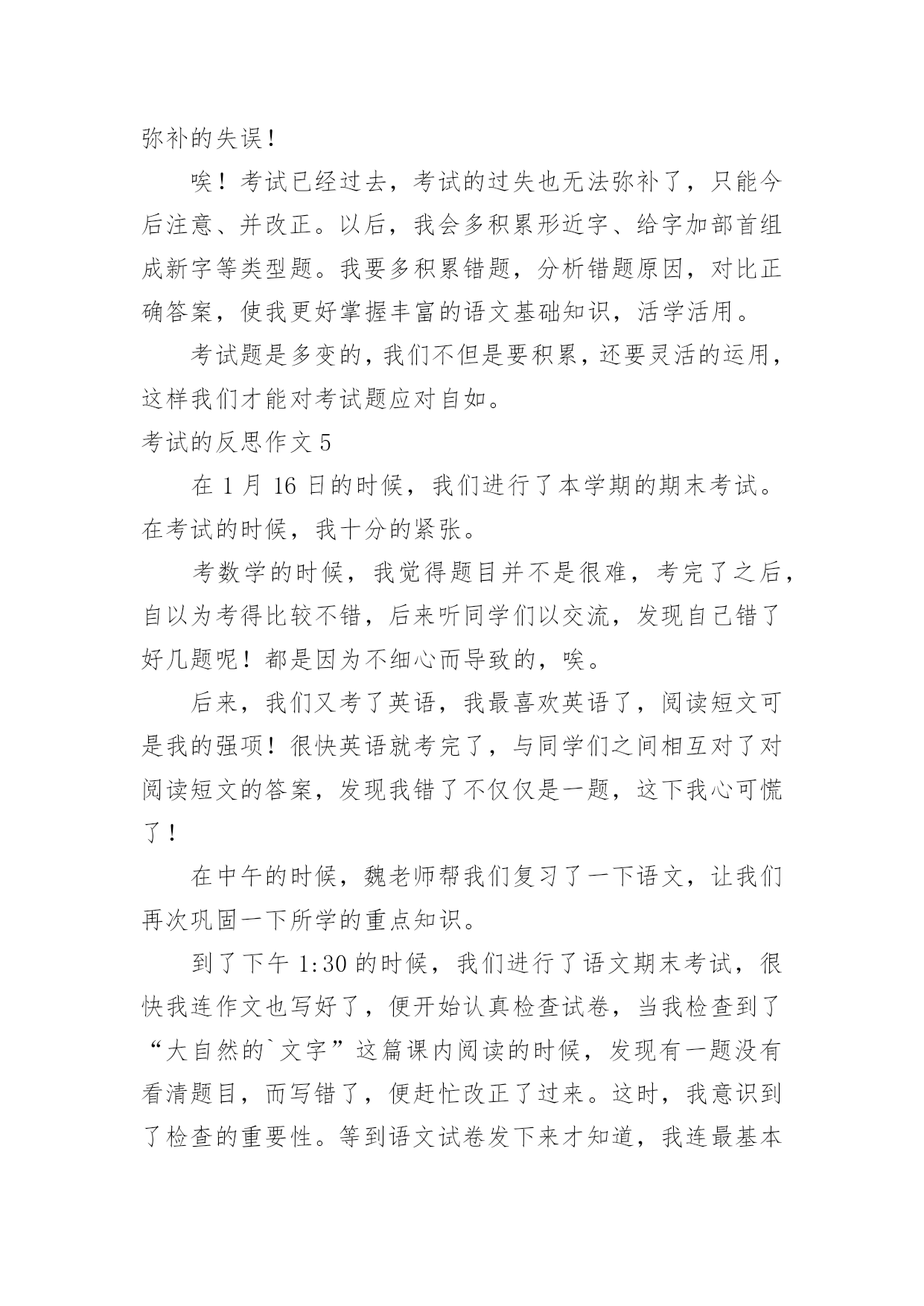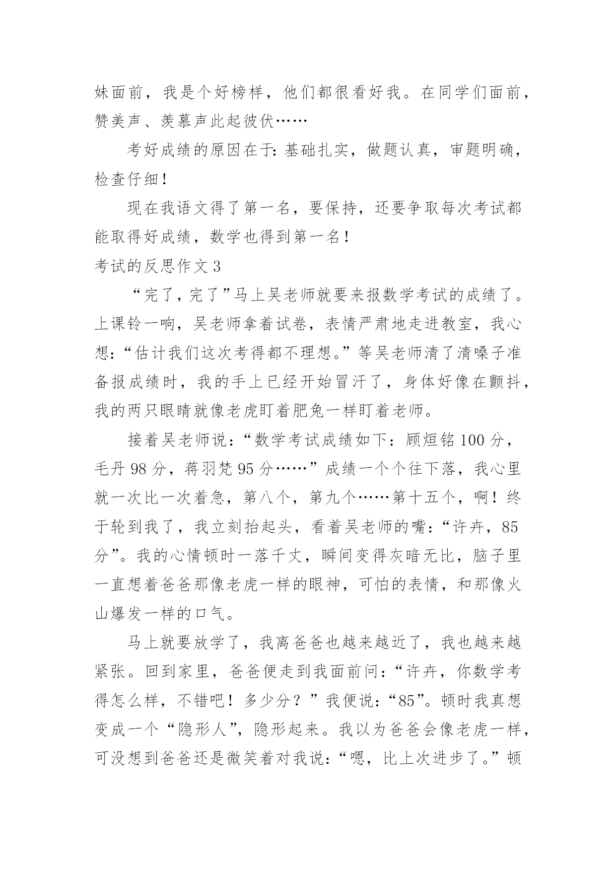 考试的反思作文考试的反思作文(热门)在平时的学习、工作或生活中,许多人都有过写作文的经历,对作文都不陌生吧,作文一定要做到主题集中,围绕同一主题作深入阐述,切忌东拉西扯,主题涣散甚至无主题。你知道作文怎样写才规范吗?以下是小编帮大家整理的考试的反思作文,仅供参考,大家一起来看看吧。考试的反思作文1我这次成绩很差,我感觉非常难受。首先我要改掉考试不细心读题目的坏习惯。有时候我往往看着题目前面就顺手把后面的问题写上了,但是却错了很多。这也许也和答题技巧有关系。总之,通过以后的练习,我一定要在考试的过程之中认真审题,自习读题,把题目看准、看好。时间允许的时候要多检查几遍,绝对不允许自己再犯类似于这样的无谓的错误。其次,我还要加强语文、数学、英语三门主科以及政治、历史、地理、生物和物理的习题强化。平日大家都聚在一起做一样的题目,感觉不出来有什么明显的差异。可是一当考试,才发现原来那么多考试题目是我从来看都没看过的(你就先编着吧)。只怪自己买的.练习题做的少。不能允许自己再继续这样下去,所以,我一定要加倍努力,从这次考试之中汲取教训,增加力量,为下一次考试做好准备,打好基础。考试技巧贵在练习。生活之中,我还要多多加强自己的练习和复习,考试之前制定周详的复习计划,不再手忙脚乱,没有方向。平日生活学习中学会积累,语文积累好词好句,数学也要多积累难的题目,英语则是语法项目。对做完形填空等练习题也是提高英语的好方法。没事,这仅仅只是期中考,还有期末考呢,只要在下次的考试中,我不在犯错误,我还是有机会的。我一定不会让老师,让自己失望的。考试的反思作文2昨天,张老师笑盈盈地走过来,又和颜悦色地对我说“张麦,这次你要请客?!”我一开始没缓过神来,不知道是怎么一回事,“你呀,语文期中考试考了第一名,97分呢!”顿时,我简直不相信自己的耳朵,差点叫出来。可过了一会儿,我又冷静下来,想到今天是愚人节!我连往自己头上泼了盆冷水,要知道愚人节什么话都是骗人的';之后,我也没再去想这件事。直到放学,张老师把喜讯传给妈妈时,我才相信了。听到了消息,我热泪盈眶,心中有一种说不出的兴奋。现在爸爸、妈妈知道了。接着外公、外婆收悉了。最后,爷爷、奶奶,同学、朋友都知晓了。消息似乎传遍了宇宙,我到哪儿都能听见追捧声,赞美声。在爸爸妈妈那里我可以随便提要求,只要不夸张,都可以满足我。在外公外婆、爷爷奶奶那儿奖励不断。在兄弟姐妹面前,我是个好榜样,他们都很看好我。在同学们面前,赞美声、羡慕声此起彼伏……考好成绩的原因在于:基础扎实,做题认真,审题明确,检查仔细!现在我语文得了第一名,要保持,还要争取每次考试都能取得好成绩,数学也得到第一名!考试的反思作文3“完了,完了”马上吴老师就要来报数学考试的成绩了。上课铃一响,吴老师拿着试卷,表情严肃地走进教室,我心想:“估计我们这次考得都不理想。”等吴老师清了清嗓子准备报成绩时,我的手上已经开始冒汗了,身体好像在颤抖,我的两只眼睛就像老虎盯着肥兔一样盯着老师。接着吴老师说:“数学考试成绩如下:顾烜铭100分,毛丹98分,蒋羽梵95分……”成绩一个个往下落,我心里就一次比一次着急,第八个,第九个……第十五个,啊!终于轮到我了,我立刻抬起头,看着吴老师的嘴:“许卉,85分”。我的心情顿时一落千丈,瞬间变得灰暗无比,脑子里一直想着爸爸那像老虎一样的眼神,可怕的表情,和那像火山爆发一样的口气。马上就要放学了,我离爸爸也越来越近了,我也越来越紧张。回到家里,爸爸便走到我面前问:“许卉,你数学考得怎么样,不错吧!多少分?”我便说:“85”。顿时我真想变成一个“隐形人”,隐形起来。我以为爸爸会像老虎一样,可没想到爸爸还是微笑着对我说:“嗯,比上次进步了。”顿时我眼镜瞪得大大的,惊讶的问:“爸爸,你怎么不批评我。”爸爸回答说:“通过你自己的努力,这次成绩比上次进步了许多。只要你坚持不懈,以后的'成绩会让同学和老师刮目相看的。”听了爸爸的这番话,我大受鼓舞,下定决心,一定要考出好成绩,不辜负老师和家里对我的期望。从这次考试之后我也明白了一个道理“功夫不负有心人,有志者事竟成!”考试的反思作文4令人紧张的期中考试结束了,考试的失败与成功还是一个未解之谜,可是,当考完最后一门功课时,老师简短的几句话却成了我们心情的`晴天霹雳,使一下子松弛下来的我们像打了霜的茄子?蔫儿了!今年的期中考试题非常简单,但是老师说过:“考试题越简单越是会错题连篇。”因此,我们都不敢轻视这次考试。但是,最终简单的考试题把我们征服了,使快速答完题的我们闲下来,并且认为:“这么简单的考试题,一定不会错误百出”有了这个念头,我们便不去仔细检查,而是飞快的游览着卷面,任凭让错题在那里摆着,即使特别显眼,我们也无法发现它,更不会去将它们改一下,就这样我们交了卷儿,考后家长问:“考得怎么样?