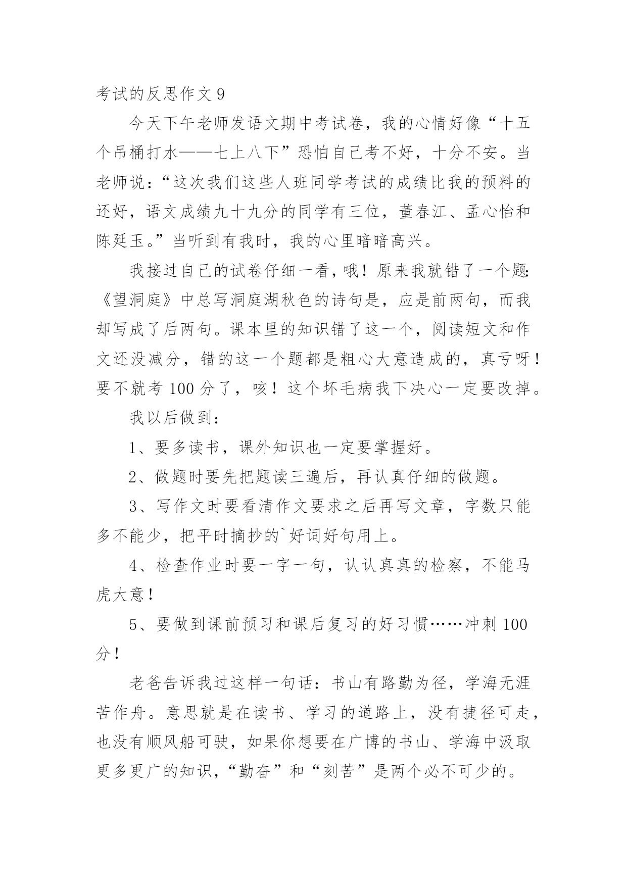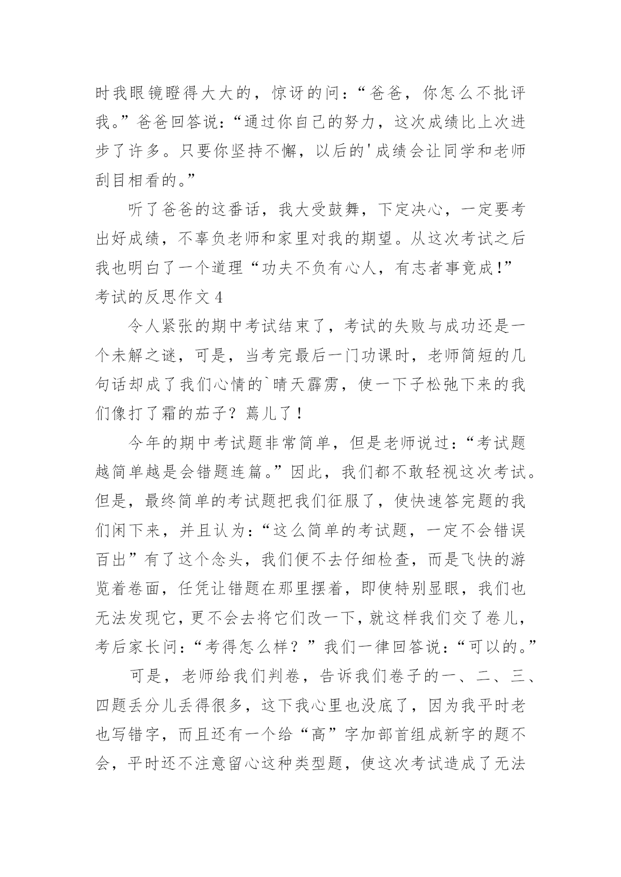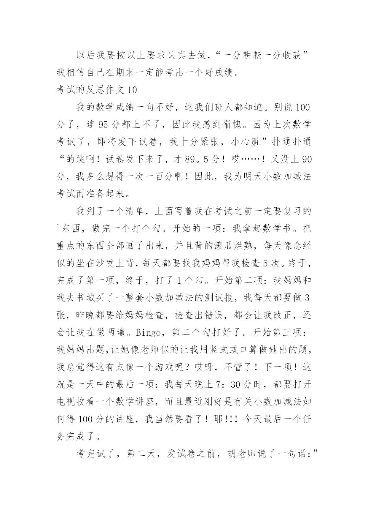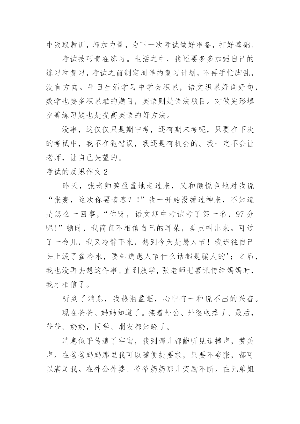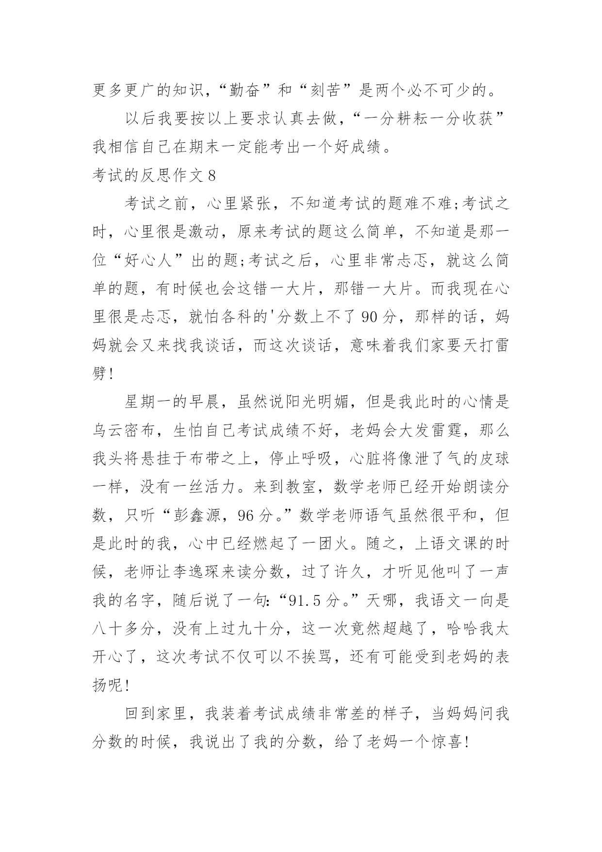 考试的反思作文考试的反思作文(热门)在平时的学习、工作或生活中,许多人都有过写作文的经历,对作文都不陌生吧,作文一定要做到主题集中,围绕同一主题作深入阐述,切忌东拉西扯,主题涣散甚至无主题。你知道作文怎样写才规范吗?以下是小编帮大家整理的考试的反思作文,仅供参考,大家一起来看看吧。考试的反思作文1我这次成绩很差,我感觉非常难受。首先我要改掉考试不细心读题目的坏习惯。有时候我往往看着题目前面就顺手把后面的问题写上了,但是却错了很多。这也许也和答题技巧有关系。总之,通过以后的练习,我一定要在考试的过程之中认真审题,自习读题,把题目看准、看好。时间允许的时候要多检查几遍,绝对不允许自己再犯类似于这样的无谓的错误。其次,我还要加强语文、数学、英语三门主科以及政治、历史、地理、生物和物理的习题强化。平日大家都聚在一起做一样的题目,感觉不出来有什么明显的差异。可是一当考试,才发现原来那么多考试题目是我从来看都没看过的(你就先编着吧)。只怪自己买的.练习题做的少。不能允许自己再继续这样下去,所以,我一定要加倍努力,从这次考试之中汲取教训,增加力量,为下一次考试做好准备,打好基础。考试技巧贵在练习。生活之中,我还要多多加强自己的练习和复习,考试之前制定周详的复习计划,不再手忙脚乱,没有方向。平日生活学习中学会积累,语文积累好词好句,数学也要多积累难的题目,英语则是语法项目。对做完形填空等练习题也是提高英语的好方法。没事,这仅仅只是期中考,还有期末考呢,只要在下次的考试中,我不在犯错误,我还是有机会的。我一定不会让老师,让自己失望的。考试的反思作文2昨天,张老师笑盈盈地走过来,又和颜悦色地对我说“张麦,这次你要请客?!”我一开始没缓过神来,不知道是怎么一回事,“你呀,语文期中考试考了第一名,97分呢!”顿时,我简直不相信自己的耳朵,差点叫出来。可过了一会儿,我又冷静下来,想到今天是愚人节!我连往自己头上泼了盆冷水,要知道愚人节什么话都是骗人的';之后,我也没再去想这件事。直到放学,张老师把喜讯传给妈妈时,我才相信了。听到了消息,我热泪盈眶,心中有一种说不出的兴奋。现在爸爸、妈妈知道了。接着外公、外婆收悉了。最后,爷爷、奶奶,同学、朋友都知晓了。消息似乎传遍了宇宙,我到哪儿都能听见追捧声,赞美声。在爸爸妈妈那里我可以随便提要求,只要不夸张,都可以满足我。在外公外婆、爷爷奶奶那儿奖励不断。在兄弟姐妹面前,我是个好榜样,他们都很看好我。在同学们面前,赞美声、羡慕声此起彼伏……考好成绩的原因在于:基础扎实,做题认真,审题明确,检查仔细!现在我语文得了第一名,要保持,还要争取每次考试都能取得好成绩,数学也得到第一名!考试的反思作文3“完了,完了”马上吴老师就要来报数学考试的成绩了。上课铃一响,吴老师拿着试卷,表情严肃地走进教室,我心想:“估计我们这次考得都不理想。”等吴老师清了清嗓子准备报成绩时,我的手上已经开始冒汗了,身体好像在颤抖,我的两只眼睛就像老虎盯着肥兔一样盯着老师。接着吴老师说:“数学考试成绩如下:顾烜铭100分,毛丹98分,蒋羽梵95分……”成绩一个个往下落,我心里就一次比一次着急,第八个,第九个……第十五个,啊!终于轮到我了,我立刻抬起头,看着吴老师的嘴:“许卉,85分”。我的心情顿时一落千丈,瞬间变得灰暗无比,脑子里一直想着爸爸那像老虎一样的眼神,可怕的表情,和那像火山爆发一样的口气。马上就要放学了,我离爸爸也越来越近了,我也越来越紧张。回到家里,爸爸便走到我面前问:“许卉,你数学考得怎么样,不错吧!多少分?”我便说:“85”。顿时我真想变成一个“隐形人”,隐形起来。我以为爸爸会像老虎一样,可没想到爸爸还是微笑着对我说:“嗯,比上次进步了。”顿时我眼镜瞪得大大的,惊讶的问:“爸爸,你怎么不批评我。”爸爸回答说:“通过你自己的努力,这次成绩比上次进步了许多。只要你坚持不懈,以后的'成绩会让同学和老师刮目相看的。”听了爸爸的这番话,我大受鼓舞,下定决心,一定要考出好成绩,不辜负老师和家里对我的期望。从这次考试之后我也明白了一个道理“功夫不负有心人,有志者事竟成!”考试的反思作文4令人紧张的期中考试结束了,考试的失败与成功还是一个未解之谜,可是,当考完最后一门功课时,老师简短的几句话却成了我们心情的`晴天霹雳,使一下子松弛下来的我们像打了霜的茄子?蔫儿了!今年的期中考试题非常简单,但是老师说过:“考试题越简单越是会错题连篇。”因此,我们都不敢轻视这次考试。但是,最终简单的考试题把我们征服了,使快速答完题的我们闲下来,并且认为:“这么简单的考试题,一定不会错误百出”有了这个念头,我们便不去仔细检查,而是飞快的游览着卷面,任凭让错题在那里摆着,即使特别显眼,我们也无法发现它,更不会去将它们改一下,就这样我们交了卷儿,考后家长问:“考得怎么样?