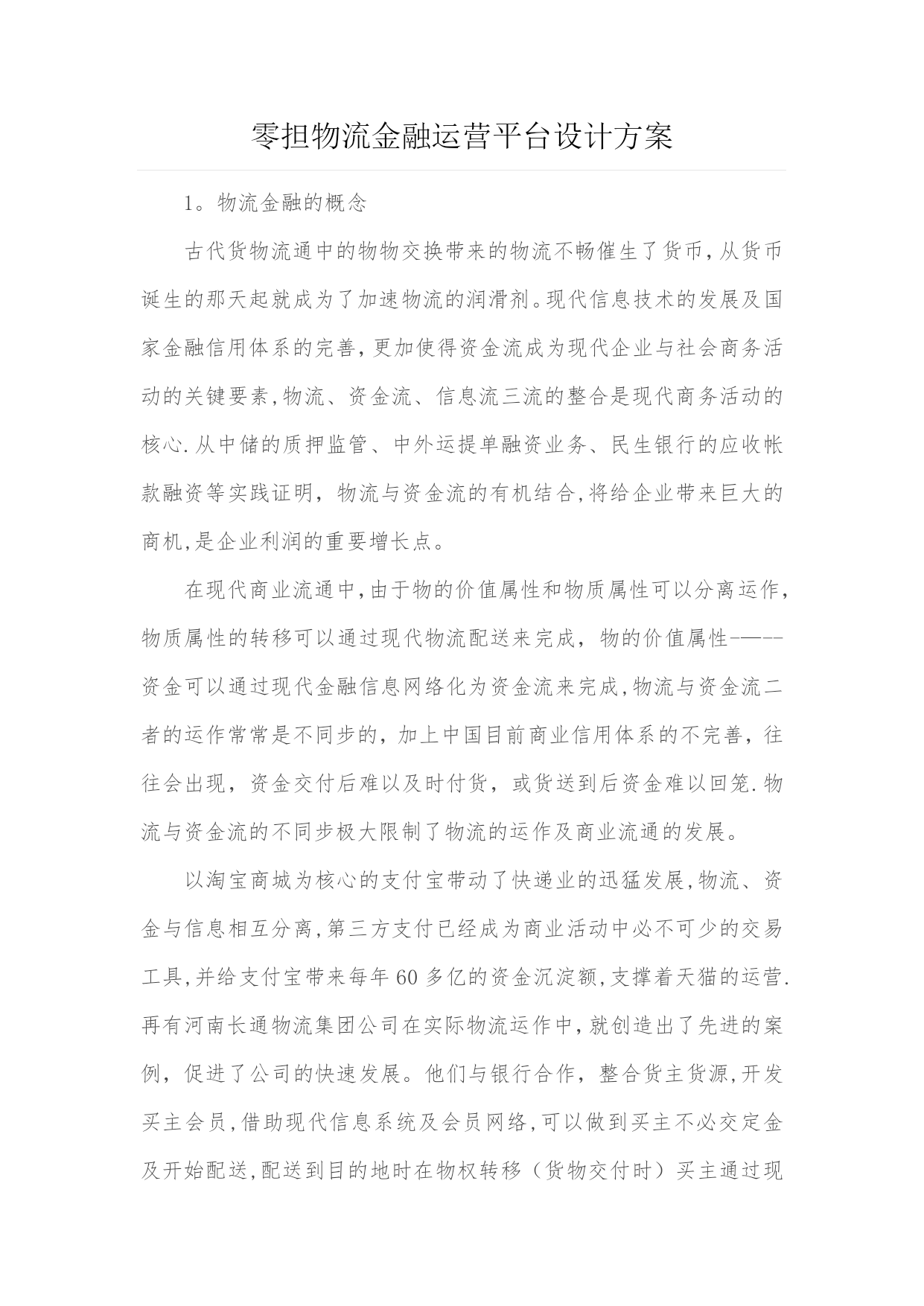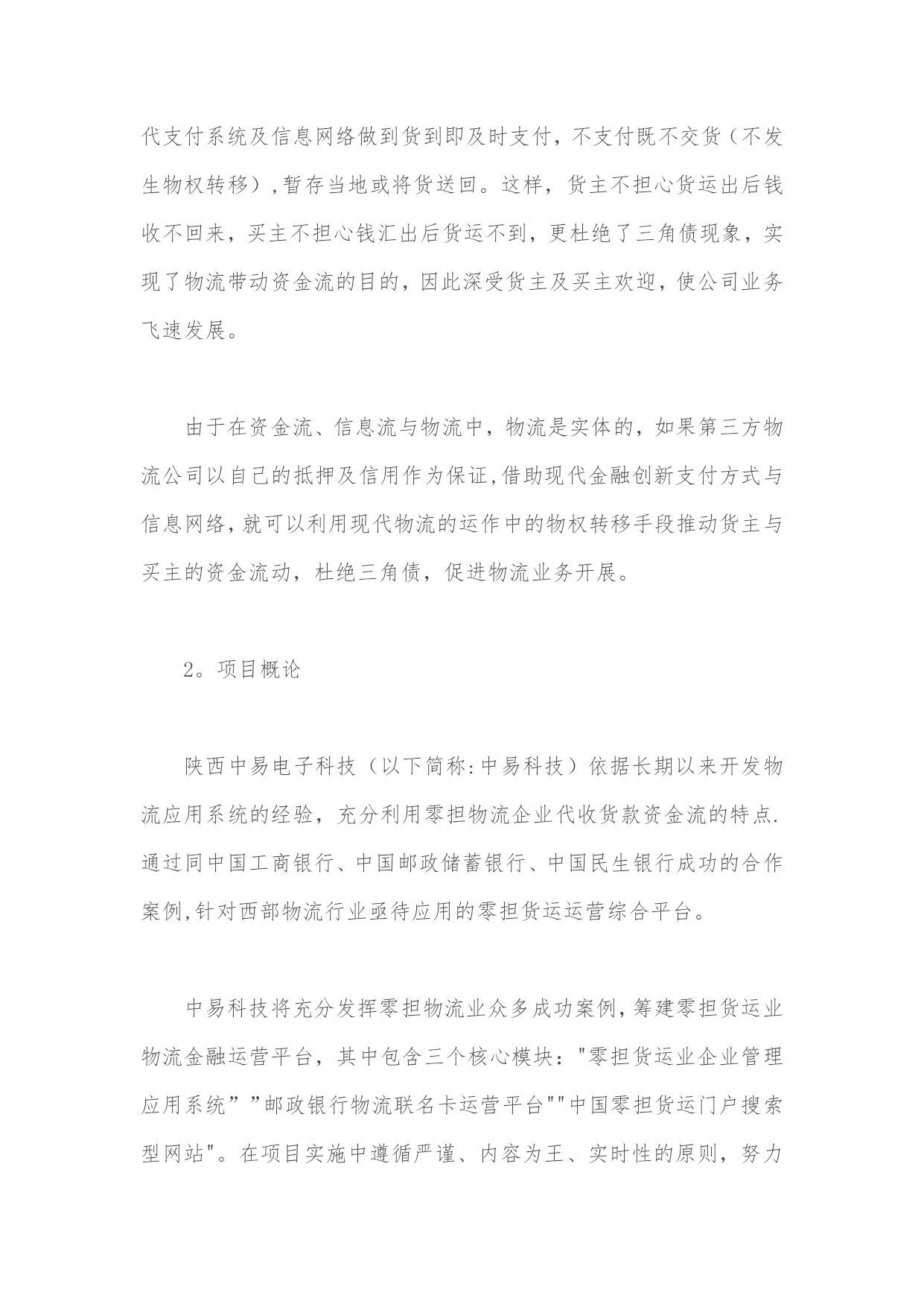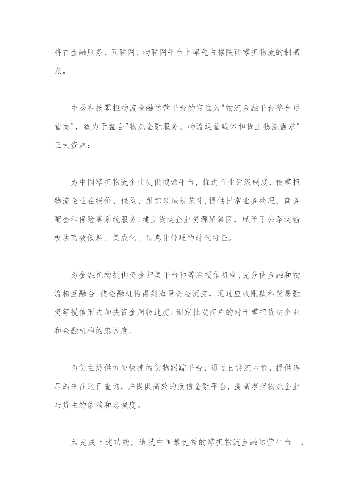 零担物流金融运营平台设计方案实用文档(实用文档,可以直接使用,可编辑优秀版资料,欢迎下载)零担物流金融运营平台设计方案1。物流金融的概念古代货物流通中的物物交换带来的物流不畅催生了货币,从货币诞生的那天起就成为了加速物流的润滑剂。现代信息技术的发展及国家金融信用体系的完善,更加使得资金流成为现代企业与社会商务活动的关键要素,物流、资金流、信息流三流的整合是现代商务活动的核心.从中储的质押监管、中外运提单融资业务、民生银行的应收帐款融资等实践证明,物流与资金流的有机结合,将给企业带来巨大的商机,是企业利润的重要增长点。在现代商业流通中,由于物的价值属性和物质属性可以分离运作,物质属性的转移可以通过现代物流配送来完成,物的价值属性-—--资金可以通过现代金融信息网络化为资金流来完成,物流与资金流二者的运作常常是不同步的,加上中国目前商业信用体系的不完善,往往会出现,资金交付后难以及时付货,或货送到后资金难以回笼.物流与资金流的不同步极大限制了物流的运作及商业流通的发展。以淘宝商城为核心的支付宝带动了快递业的迅猛发展,物流、资金与信息相互分离,第三方支付已经成为商业活动中必不可少的交易工具,并给支付宝带来每年60多亿的资金沉淀额,支撑着天猫的运营.再有河南长通物流集团公司在实际物流运作中,就创造出了先进的案例,促进了公司的快速发展。他们与银行合作,整合货主货源,开发买主会员,借助现代信息系统及会员网络,可以做到买主不必交定金及开始配送,配送到目的地时在物权转移(货物交付时)买主通过现代支付系统及信息网络做到货到即及时支付,不支付既不交货(不发生物权转移),暂存当地或将货送回。这样,货主不担心货运出后钱收不回来,买主不担心钱汇出后货运不到,更杜绝了三角债现象,实现了物流带动资金流的目的,因此深受货主及买主欢迎,使公司业务飞速发展。由于在资金流、信息流与物流中,物流是实体的,如果第三方物流公司以自己的抵押及信用作为保证,借助现代金融创新支付方式与信息网络,就可以利用现代物流的运作中的物权转移手段推动货主与买主的资金流动,杜绝三角债,促进物流业务开展。2。项目概论陕西中易电子科技(以下简称:中易科技)依据长期以来开发物流应用系统的经验,充分利用零担物流企业代收货款资金流的特点.通过同中国工商银行、中国邮政储蓄银行、中国民生银行成功的合作案例,针对西部物流行业亟待应用的零担货运运营综合平台。中易科技将充分发挥零担物流业众多成功案例,筹建零担货运业物流金融运营平台,其中包含三个核心模块:"零担货运业企业管理应用系统””邮政银行物流联名卡运营平台""中国零担货运门户搜索型网站"。在项目实施中遵循严谨、内容为王、实时性的原则,努力将在金融服务、互联网、物联网平台上率先占据陕西零担物流的制高点。中易科技零担物流金融运营平台的定位为"物流金融平台整合运营商",致力于整合"物流金融服务、物流运营载体和货主物流需求"三大资源:为中国零担物流企业提供搜索平台,推进行业评级制度,使零担物流企业在报价、保险、跟踪领域规范化,提供日常业务处理、商务配套和保险等系统服务.建立货运企业资源聚集区,赋予了公路运输板块高效低耗、集成化、信息化管理的时代特征。为金融机构提供资金归集平台和等级授信机制,充分使金融和物流相互融合,使金融机构得到海量资金沉淀,通过应收账款和贸易融资等授信形式加快资金周转速度。锁定批发商户的对于零担货运企业和金融机构的忠诚度。为货主提供方便快捷的货物跟踪平台,通过日常流水额,提供详尽的来往账目查询,并提供高效的授信金融平台,提高零担物流企业与货主的依赖和忠诚度。为完成上述功能,造就中国最优秀的零担物流金融运营平台,超越现有零担货运的运营模式,在业态功能上进行创新,在信息技术上所有突破。通过对零担货运企业运营的的调查分析,邀请日本佐川急便,长安大学物流研究所探讨,并走访保险、金融、信息、省物流协会、交通运输协会、新闻出版局、陕西物产集团、省政府信息中心等相关部门,综合各方面意见,形成以下初步方案,望通过进一步的深入探讨后实施运作,在三年内在影响力、整合力、市场份额等方面成为地区物流行业领导者。3。西安零担货运市场运营市场分析中国公路货运每年五千亿元的总需求量,以天地华宇、德邦物流、通成物流、佳吉物流、远成物流组成的国内零担物流业第一阵营,已然形成公路零担物流业的三强分别是:TNT天地华宇、佳吉快运和德邦物流。2021年底,三家企业的网点数分别约是1500、1000和750。其物流业务品牌分别为:"定日达"、"红色快线”、"精准卡航”.定位于中高端客户,采取甩挂、箱车、GPS、网络查询、条码分拣等技术手段。陕西货运行业正处于激流涌动的变革期,一方面约14万货运经营业户,拥有约21万辆运输车辆,但平均每户只拥有1。5