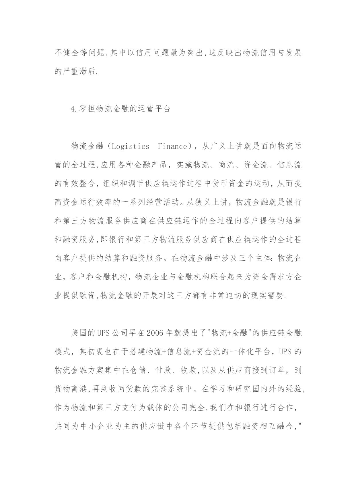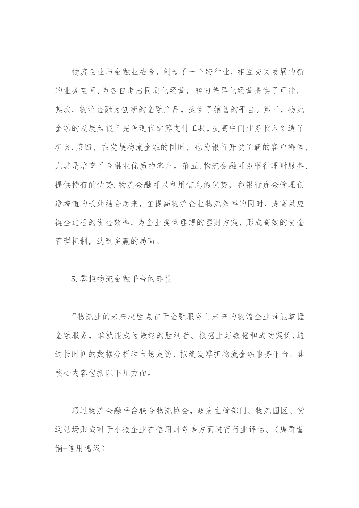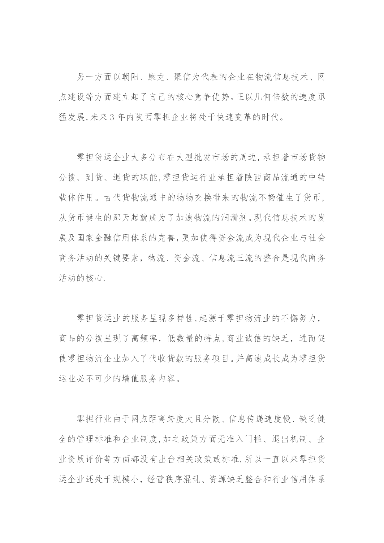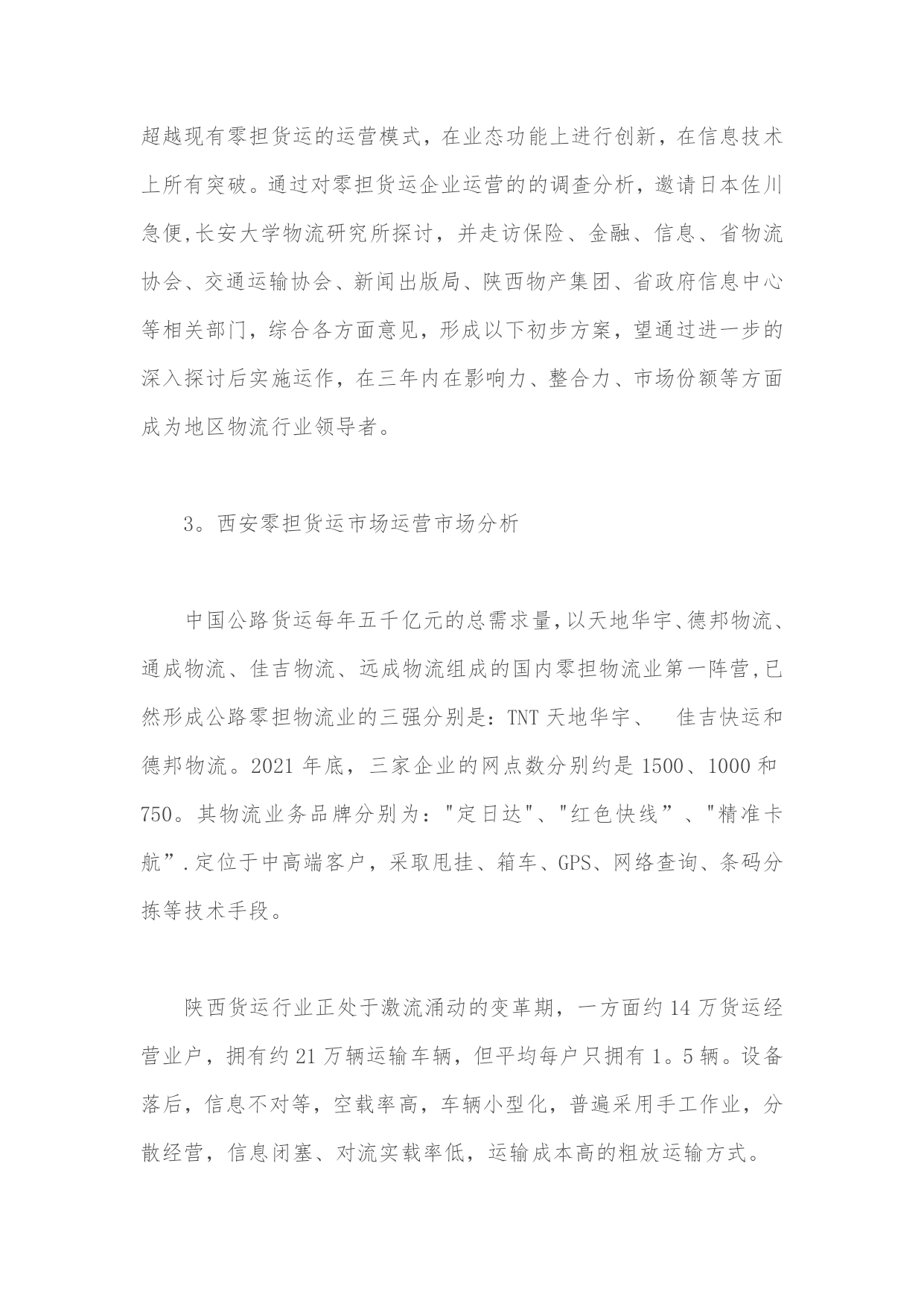 零担物流金融运营平台设计方案实用文档(实用文档,可以直接使用,可编辑优秀版资料,欢迎下载)零担物流金融运营平台设计方案1。物流金融的概念古代货物流通中的物物交换带来的物流不畅催生了货币,从货币诞生的那天起就成为了加速物流的润滑剂。现代信息技术的发展及国家金融信用体系的完善,更加使得资金流成为现代企业与社会商务活动的关键要素,物流、资金流、信息流三流的整合是现代商务活动的核心.从中储的质押监管、中外运提单融资业务、民生银行的应收帐款融资等实践证明,物流与资金流的有机结合,将给企业带来巨大的商机,是企业利润的重要增长点。在现代商业流通中,由于物的价值属性和物质属性可以分离运作,物质属性的转移可以通过现代物流配送来完成,物的价值属性-—--资金可以通过现代金融信息网络化为资金流来完成,物流与资金流二者的运作常常是不同步的,加上中国目前商业信用体系的不完善,往往会出现,资金交付后难以及时付货,或货送到后资金难以回笼.物流与资金流的不同步极大限制了物流的运作及商业流通的发展。以淘宝商城为核心的支付宝带动了快递业的迅猛发展,物流、资金与信息相互分离,第三方支付已经成为商业活动中必不可少的交易工具,并给支付宝带来每年60多亿的资金沉淀额,支撑着天猫的运营.再有河南长通物流集团公司在实际物流运作中,就创造出了先进的案例,促进了公司的快速发展。他们与银行合作,整合货主货源,开发买主会员,借助现代信息系统及会员网络,可以做到买主不必交定金及开始配送,配送到目的地时在物权转移(货物交付时)买主通过现代支付系统及信息网络做到货到即及时支付,不支付既不交货(不发生物权转移),暂存当地或将货送回。这样,货主不担心货运出后钱收不回来,买主不担心钱汇出后货运不到,更杜绝了三角债现象,实现了物流带动资金流的目的,因此深受货主及买主欢迎,使公司业务飞速发展。由于在资金流、信息流与物流中,物流是实体的,如果第三方物流公司以自己的抵押及信用作为保证,借助现代金融创新支付方式与信息网络,就可以利用现代物流的运作中的物权转移手段推动货主与买主的资金流动,杜绝三角债,促进物流业务开展。2。项目概论陕西中易电子科技(以下简称:中易科技)依据长期以来开发物流应用系统的经验,充分利用零担物流企业代收货款资金流的特点.通过同中国工商银行、中国邮政储蓄银行、中国民生银行成功的合作案例,针对西部物流行业亟待应用的零担货运运营综合平台。中易科技将充分发挥零担物流业众多成功案例,筹建零担货运业物流金融运营平台,其中包含三个核心模块:"零担货运业企业管理应用系统””邮政银行物流联名卡运营平台""中国零担货运门户搜索型网站"。在项目实施中遵循严谨、内容为王、实时性的原则,努力将在金融服务、互联网、物联网平台上率先占据陕西零担物流的制高点。中易科技零担物流金融运营平台的定位为"物流金融平台整合运营商",致力于整合"物流金融服务、物流运营载体和货主物流需求"三大资源:为中国零担物流企业提供搜索平台,推进行业评级制度,使零担物流企业在报价、保险、跟踪领域规范化,提供日常业务处理、商务配套和保险等系统服务.建立货运企业资源聚集区,赋予了公路运输板块高效低耗、集成化、信息化管理的时代特征。为金融机构提供资金归集平台和等级授信机制,充分使金融和物流相互融合,使金融机构得到海量资金沉淀,通过应收账款和贸易融资等授信形式加快资金周转速度。锁定批发商户的对于零担货运企业和金融机构的忠诚度。为货主提供方便快捷的货物跟踪平台,通过日常流水额,提供详尽的来往账目查询,并提供高效的授信金融平台,提高零担物流企业与货主的依赖和忠诚度。为完成上述功能,造就中国最优秀的零担物流金融运营平台,超越现有零担货运的运营模式,在业态功能上进行创新,在信息技术上所有突破。通过对零担货运企业运营的的调查分析,邀请日本佐川急便,长安大学物流研究所探讨,并走访保险、金融、信息、省物流协会、交通运输协会、新闻出版局、陕西物产集团、省政府信息中心等相关部门,综合各方面意见,形成以下初步方案,望通过进一步的深入探讨后实施运作,在三年内在影响力、整合力、市场份额等方面成为地区物流行业领导者。3。西安零担货运市场运营市场分析中国公路货运每年五千亿元的总需求量,以天地华宇、德邦物流、通成物流、佳吉物流、远成物流组成的国内零担物流业第一阵营,已然形成公路零担物流业的三强分别是:TNT天地华宇、佳吉快运和德邦物流。2021年底,三家企业的网点数分别约是1500、1000和750。其物流业务品牌分别为:"定日达"、"红色快线”、"精准卡航”.定位于中高端客户,采取甩挂、箱车、GPS、网络查询、条码分拣等技术手段。陕西货运行业正处于激流涌动的变革期,一方面约14万货运经营业户,拥有约21万辆运输车辆,但平均每户只拥有1。5