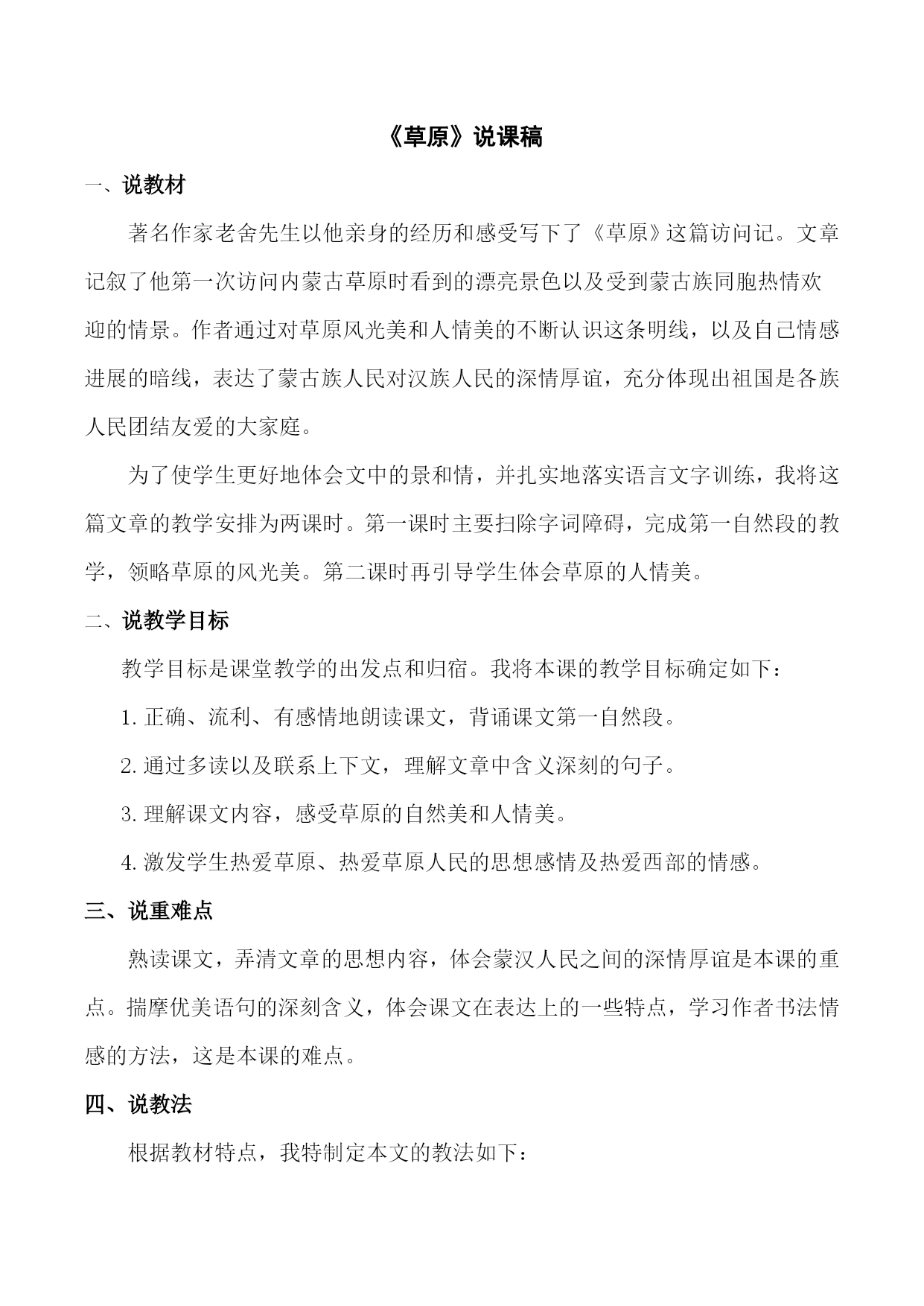 《草原》说课稿说教材 著名作家老舍先生以他亲身的经历和感受写下了《草原》这篇访问记。文章记叙了他第一次访问内蒙古草原时看到的漂亮景色以及受到蒙古族同胞热情欢迎的情景。作者通过对草原风光美和人情美的不断认识这条明线,以及自己情感进展的暗线,表达了蒙古族人民对汉族人民的深情厚谊,充分体现出祖国是各族人民团结友爱的大家庭。 为了使学生更好地体会文中的景和情,并扎实地落实语言文字训练,我将这篇文章的教学安排为两课时。第一课时主要扫除字词障碍,完成第一自然段的教学,领略草原的风光美。第二课时再引导学生体