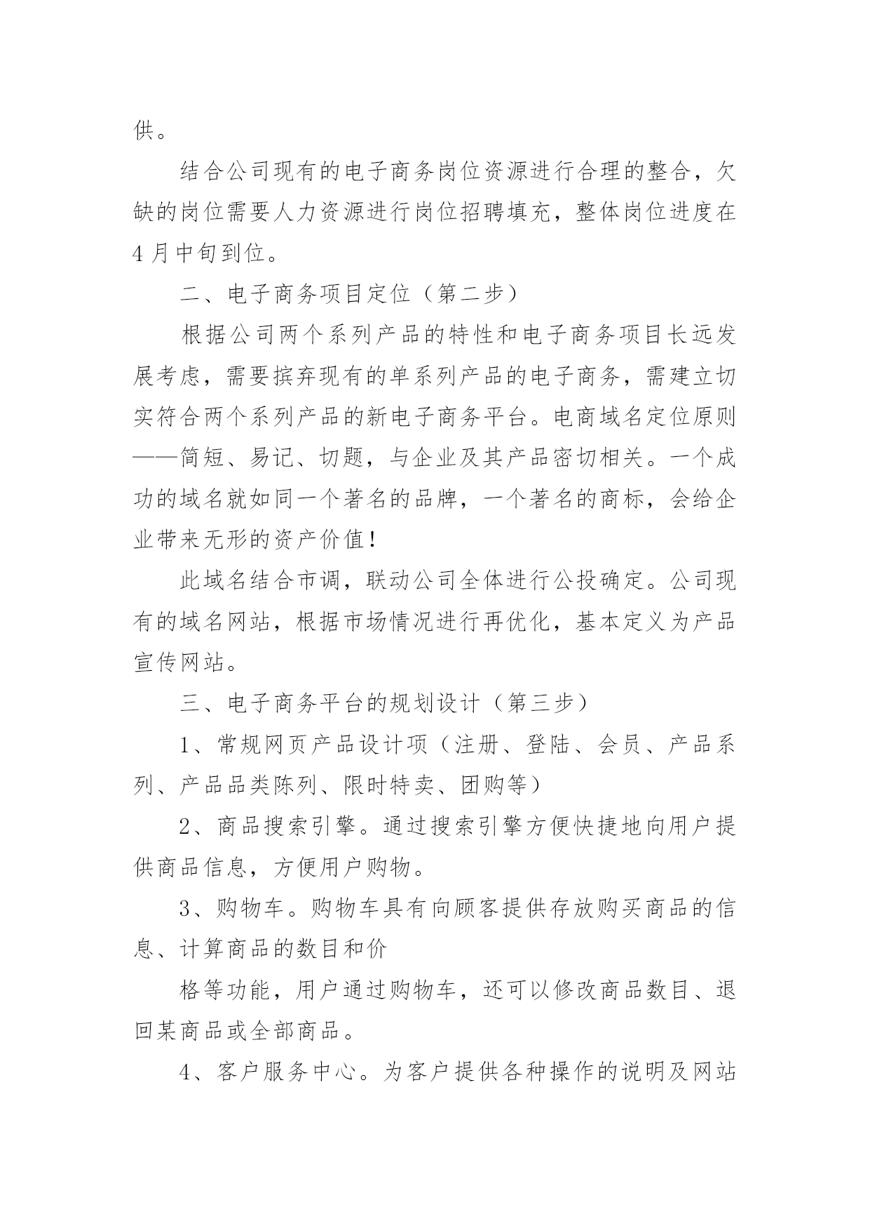 电商运营工作总结电商运营工作总结总结是对某一阶段的工作、学习或思想中的经验或情况进行分析研究的书面材料,写总结有利于我们学习和工作能力的提高,因此好好准备一份总结吧。我们该怎么去写总结呢?下面是小编为大家整理的电商运营工作总结,供大家参考借鉴,希望可以帮助到有需要的朋友。电商运营工作总结1一、电子商务项目组织架构搭建及岗位职责(第一步)电子商务平台团队成员是关系整个项目启动推进和后续运营的关键,需要专人构建。1、项目负责人:整体运营。2、网站架构管理:网站的整体构架与内容优化。3、美工:网站的页面设计与页面的人性化互动沟通。4、后台程序员:实现后台的程序功能。5、网络推广员:通过互联网和传统媒体或其他方式推广网站。6、网络营销员:通过互联网营销或传统方式销售网站服务产品。7、网站编辑/信息管理员:管理网站各个栏目的信息。8、服务器维护人员:服务器的安全、网站相关功能提供。结合公司现有的电子商务岗位资源进行合理的整合,欠缺的岗位需要人力资源进行岗位招聘填充,整体岗位进度在4月中旬到位。二、电子商务项目定位(第二步)根据公司两个系列产品的特性和电子商务项目长远发展考虑,需要摈弃现有的单系列产品的电子商务,需建立切实符合两个系列产品的新电子商务平台。电商域名定位原则——简短、易记、切题,与企业及其产品密切相关。一个成功的域名就如同一个著名的品牌,一个著名的商标,会给企业带来无形的资产价值!此域名结合市调,联动公司全体进行公投确定。公司现有的域名网站,根据市场情况进行再优化,基本定义为产品宣传网站。三、电子商务平台的规划设计(第三步)1、常规网页产品设计项(注册、登陆、会员、产品系列、产品品类陈列、限时特卖、团购等)2、商品搜索引擎。通过搜索引擎方便快捷地向用户提供商品信息,方便用户购物。3、购物车。购物车具有向顾客提供存放购买商品的信息、计算商品的数目和价格等功能,用户通过购物车,还可以修改商品数目、退回某商品或全部商品。4、客户服务中心。为客户提供各种操作的说明及网站的各种服务,包括购物向导、服务特点、服务承诺、能否退换货、商场支持的.付款方式、送货上门是否另收费、在确认收到货款后的发货时间等客户关心的信息。5、访问计数器。访问计数器能统计上网访问者对网站各主题的访问频度,把握消费者对商场、商品及服务的需求,其数据是制定经营和营销策略的重要参考依据。6、订单查询。用户可根据订单号和相应信息进入订单状态界面,该界面提供订单日期、是否已收到货款、是否已发货和发货日期等信息。7、BBS。运用留言薄方式,记录客户在浏览网站或购物之后,对网站内容、提供的服务、产品搜索、产品对比、购物车、客服中心、产品反馈、配送站、查询中心、收银中心、热搜电子商务网站规划计划报告等的意见。通过留言薄,一方面可以了解客户需求,改进服务,丰富商品种类;另一方面通过答复,让用户了解商场提供的服务,增加用户对网站的信任度。8、电子邮件。在网站的每个页面上提供相应管理员的电子信箱,使客户在访问每一页面时,将遇到的问题及意见和建议以E2mail形式反馈到管理员处,以便管理员能及时改进服务、处理问题。9、电子邮件列表。每当更新商品、出台新的优惠措施或举行重大活动时,通过电子邮件列表联系客户。10、网络支付。由于现阶段在我国实现网上实时支付还未完全实现,因此,商场在支付方面应提供多种支付方式,例如信用卡支付。以上单项目版面设计,会结合市调以及B2c或o2o的类型进行窗口设计,整体版面会进行两个系列产品的综合考虑。四、电子商务平台软硬件(第四步)通常一个网站的运行好坏,硬件很重要,硬件是网站运行的基本保障;1、电子商务硬件一般分两大部分:网络设备、服务器;网络设备:路由器、交换机、防火墙服务器:根据公司的发展可视情况而定,可自建、托管、租用。2、电子商务软件一般三大部分:A、操作软件系统(UINX、LINUX、Netware)B、web服务器软件c、数据库软件(如DB2、oracle、SyBase、Informix、mSSQLServer、mySQL等)以上设备软件的选择,根据项目的定位以及公司自有的资源相结合,再进行最终确定。五、电子商务项目的流程培训(第五步)电商平台搭建后,协调公司两个系列产品管理人员包含工厂管理人员,进行多部门的电商运作流程对接培训,以保障电商从电商平台产品展示——价格操作——市场推广——客户关注——客户下单——到两个产品库存管理协调——财务结算——产品送货——客户售后服务,整个环节的闭环不断档,确保流程顺畅,确保公司所有人员对电商的操作流程熟悉。六、电子商务的推广运营(第六步)1、统一公司全体的QQ以及公众QQ群、个人微信及公众微信、微博、邮箱等对外公共软件的电商平台口径出口,进行自媒体宣传推广营销。2、统一公司两个系列产品包装以及对外广告的电商