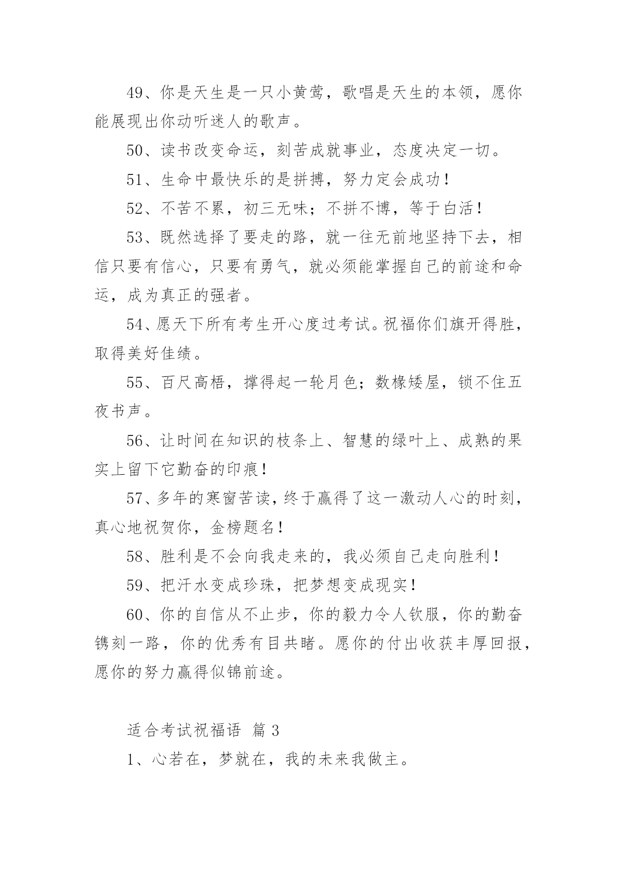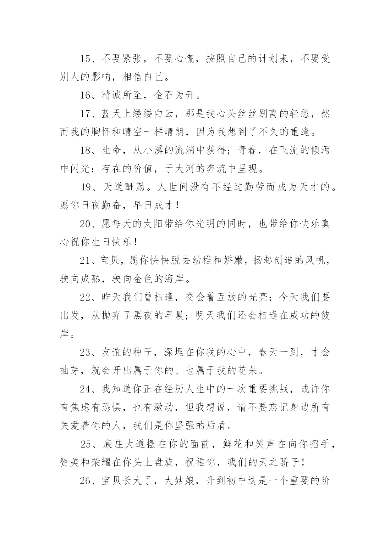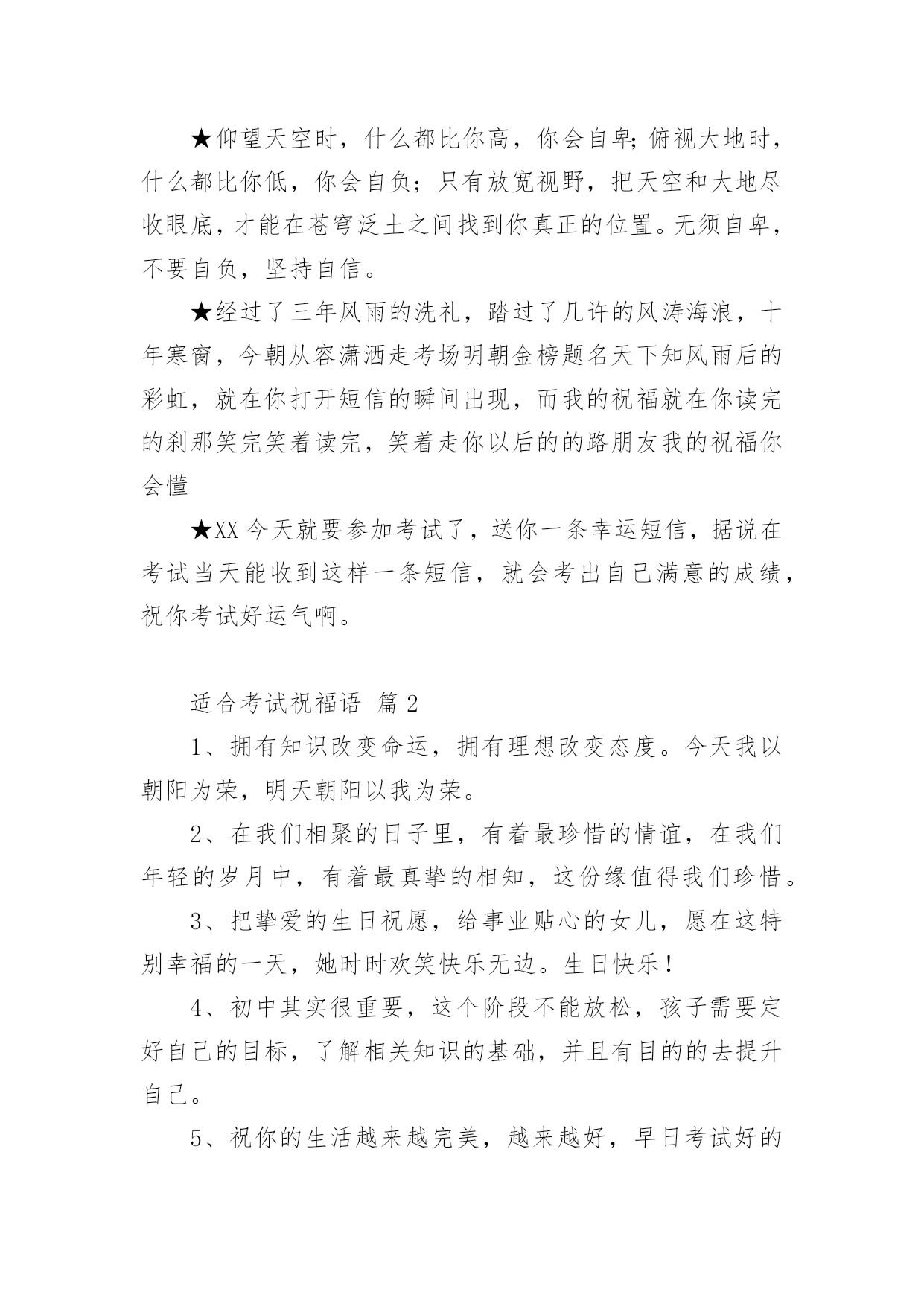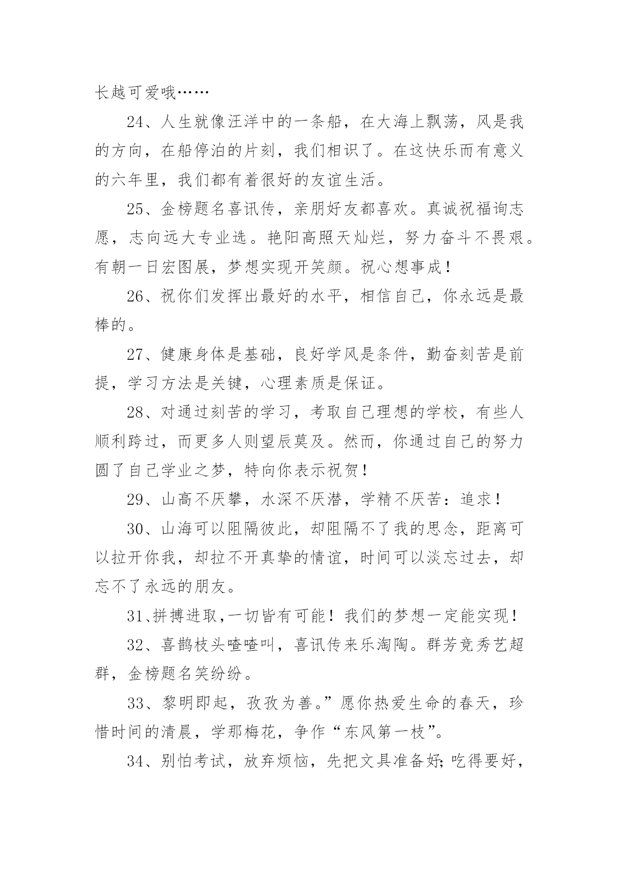 适合考试祝福语在学习、工作乃至生活中,大家都经常接触到祝福语吧,祝福语不限制字数,在运用上较为灵活。那么,怎么去写祝福语呢?以下是小编为大家收集的适合考试祝福语,欢迎阅读,希望大家能够喜欢。适合考试祝福语篇1★榜上有名固可喜,名落孙山亦莫恼只要努力了,就一定会成功的,祝你高考大捷★高考着实是一种丰收,它包蕴着太多的内涵。无论高考成绩如何,你的成长与成熟是任何人无法改变的事实,这三年的辛勤走过,你获得的太多太多。★悲观些看成功,乐观些看失败。轻松些看自己,宽容些看别人。理智些不问收获,但问耕耘天道酬勤。★你笔下拥有一个色彩绚丽的世界:愿你,也相信你,拥有另一个笔下灿烂的图景。★你有你的赤橙黄绿,我有我的青蓝靛紫,天空同属于我们,因为我们年轻。★我们这些曾经的.战友只能默默的祝福,祝福他们得到真正的成功,同时希望在看到他们时能有笑脸战友,加油。★亲爱的同学,我们在一起这么久了,都是你在为我付出。我却没为你做些什么…下辈子如果做牛做马,我……我一定拔草给你吃高考顺利★仰望天空时,什么都比你高,你会自卑;俯视大地时,什么都比你低,你会自负;只有放宽视野,把天空和大地尽收眼底,才能在苍穹泛土之间找到你真正的位置。无须自卑,不要自负,坚持自信。★经过了三年风雨的洗礼,踏过了几许的风涛海浪,十年寒窗,今朝从容潇洒走考场明朝金榜题名天下知风雨后的彩虹,就在你打开短信的瞬间出现,而我的祝福就在你读完的刹那笑完笑着读完,笑着走你以后的的路朋友我的祝福你会懂★XX今天就要参加考试了,送你一条幸运短信,据说在考试当天能收到这样一条短信,就会考出自己满意的成绩,祝你考试好运气啊。适合考试祝福语篇21、拥有知识改变命运,拥有理想改变态度。今天我以朝阳为荣,明天朝阳以我为荣。2、在我们相聚的日子里,有着最珍惜的情谊,在我们年轻的岁月中,有着最真挚的相知,这份缘值得我们珍惜。3、把挚爱的生日祝愿,给事业贴心的女儿,愿在这特别幸福的一天,她时时欢笑快乐无边。生日快乐!4、初中其实很重要,这个阶段不能放松,孩子需要定好自己的目标,了解相关知识的基础,并且有目的的去提升自己。5、祝你的生活越来越完美,越来越好,早日考试好的中学,也希望我们能再次见到。也愿我们的友谊天长地久。6、对通过刻苦的学习,考取自己理想的学校,有些人顺利跨过,而更多人则望辰莫及。然而,你通过自己的努力圆了自己学业之梦,特向你表示祝贺!7、明天,这是个美丽灿烂、辉映着五光十色的迷人的字眼。愿你的明天无限美丽、无限灿烂、无限迷人!8、金榜题名喜讯传,亲朋好友都喜欢。真诚祝福询志愿,志向远大专业选。艳阳高照天灿烂,努力奋斗不畏艰。有朝一日宏图展,梦想实现开笑颜。祝心想事成!9、世间最可宝贵的就是今天,最易丧失的也是今天;愿你在未来的一年中,无限珍惜这每一个今天。10、你留给我的,是美丽的记忆。你使是怀念少年时的纯真和友谊。当我捧起记忆中的佳酿想请你喝时,却先醉了自己。11、自信,是无尽智慧的凝聚。平淡,是成功路上的驿站。12、时间终究会比爱强悍,忘记什么都不难,想复原,不难。等某天各自出现下个牵绊,关于你,很自然会烟消云散。13、百尺竿头,更进一步,蟾宫折桂,金榜题名,美梦成真,学业有成。14、眼看高考就要来了,向前看,相信自己,我会在远方为你送去最真挚的祝福,付出就会有收获的!放松心情,去迎接挑战,我相信你,你一定是最出色的'!15、不要紧张,不要心慌,按照自己的计划来,不要受别人的影响,相信自己。16、精诚所至,金石为开。17、蓝天上缕缕白云,那是我心头丝丝别离的轻愁,然而我的胸怀和晴空一样晴朗,因为我想到了不久的重逢。18、生命,从小溪的流淌中获得;青春,在飞流的倾泻中闪光;存在的价值,于大河的奔流中呈现。19、天道酬勤。人世间没有不经过勤劳而成为天才的。愿你日夜勤奋,早日成才!20、愿每天的太阳带给你光明的同时,也带给你快乐真心祝你生日快乐!21、宝贝,愿你快快脱去幼稚和娇嫩,扬起创造的风帆,驶向成熟,驶向金色的海岸。22、昨天我们曾相逢,交会着互放的光亮;今天我们要出发,从抛弃了黑夜的早晨;明天我们还会相逢在成功的彼岸。23、友谊的种子,深埋在你我的心中,春天一到,才会抽芽,就会开出属于你的、也属于我的花朵。24、我知道你正在经历人生中的一次重要挑战,或许你有焦虑有恐惧,也有激动,但我想说,请不要忘记身边所有关爱着你的人,我们是你坚强的后盾。25、康庄大道摆在你的面前,鲜花和笑声在向你招手,赞美和荣耀在你头上盘旋,祝福你,我们的天之骄子!26、宝贝长大了,大姑娘,升到初中这是一个重要的阶段,希望你越来越自信,开开心心就好。27、我们曾走在童年的路上,看着我们成长的路,脚步向我们远去了,我们的心中,都珍藏着朋友的友情,他会成为成长路上的里程碑。28、当我们心中有一个明确的目标,凭着不屈的