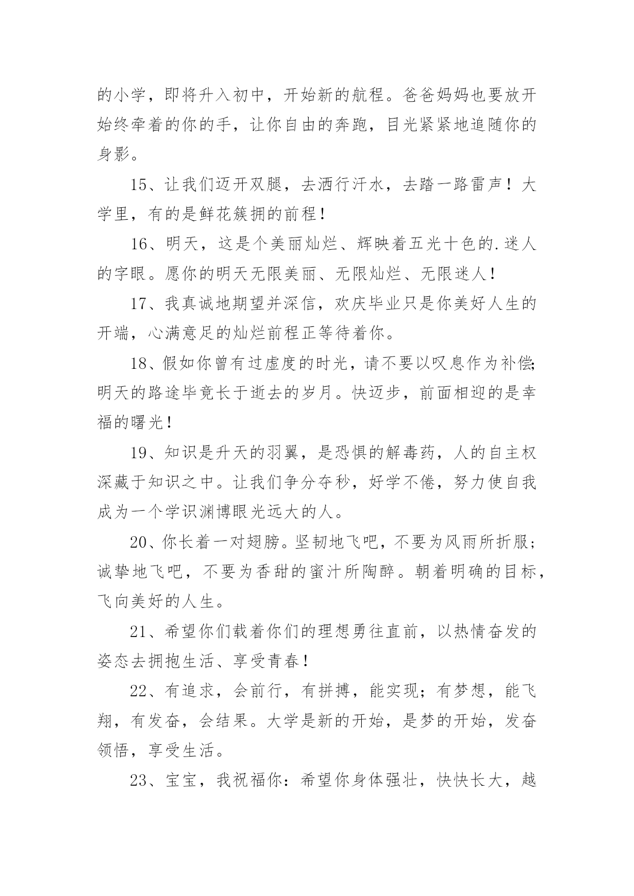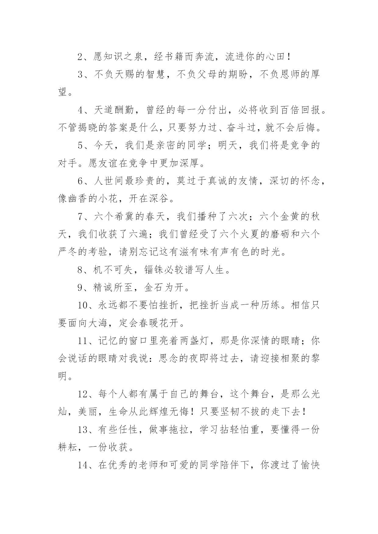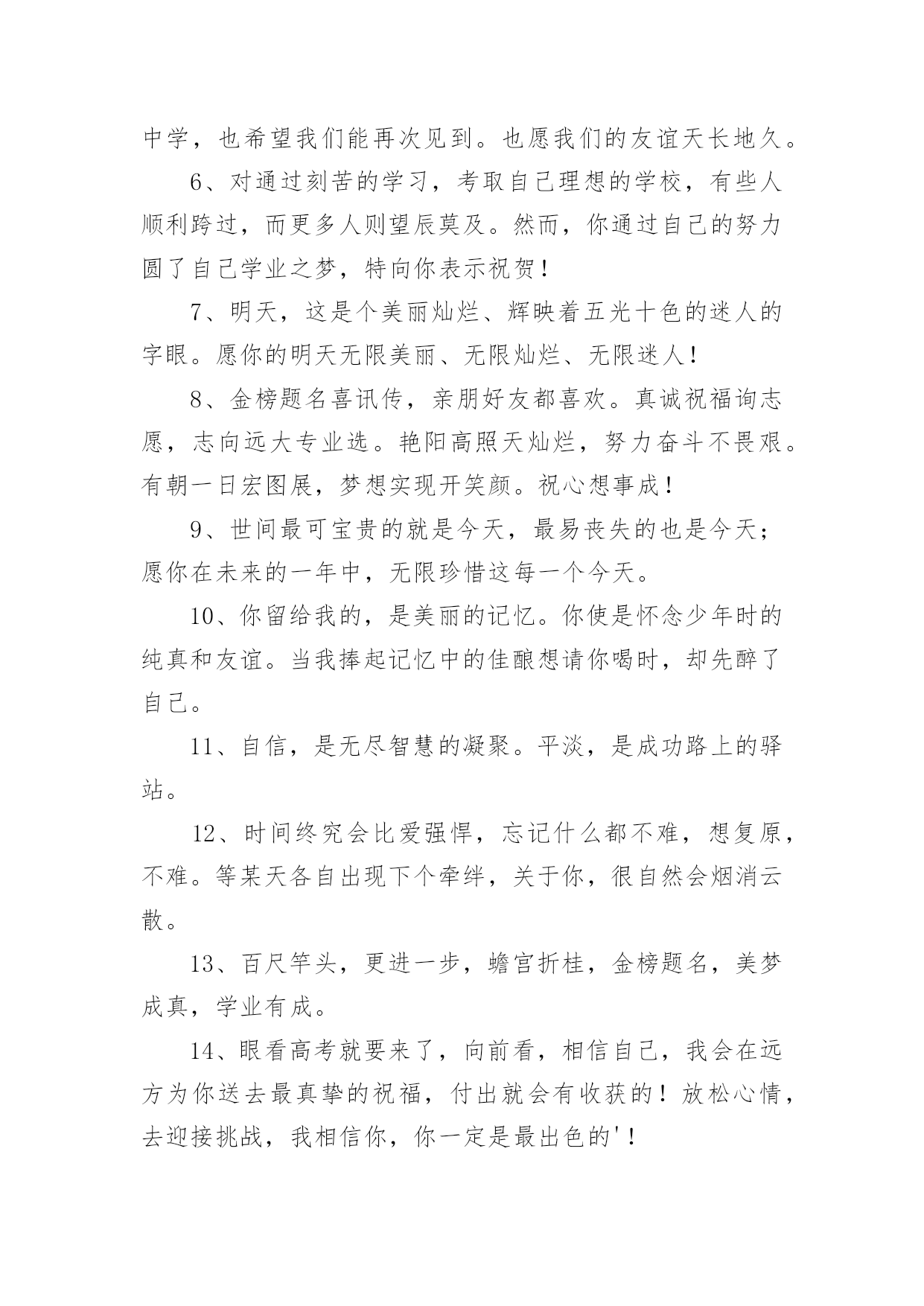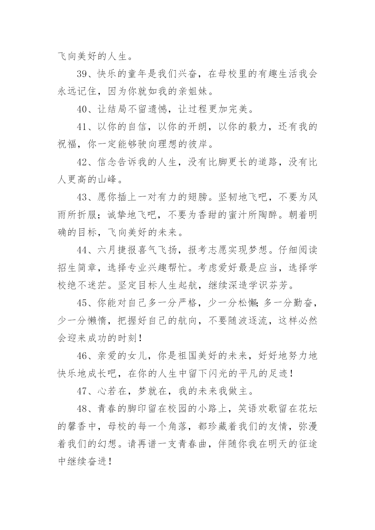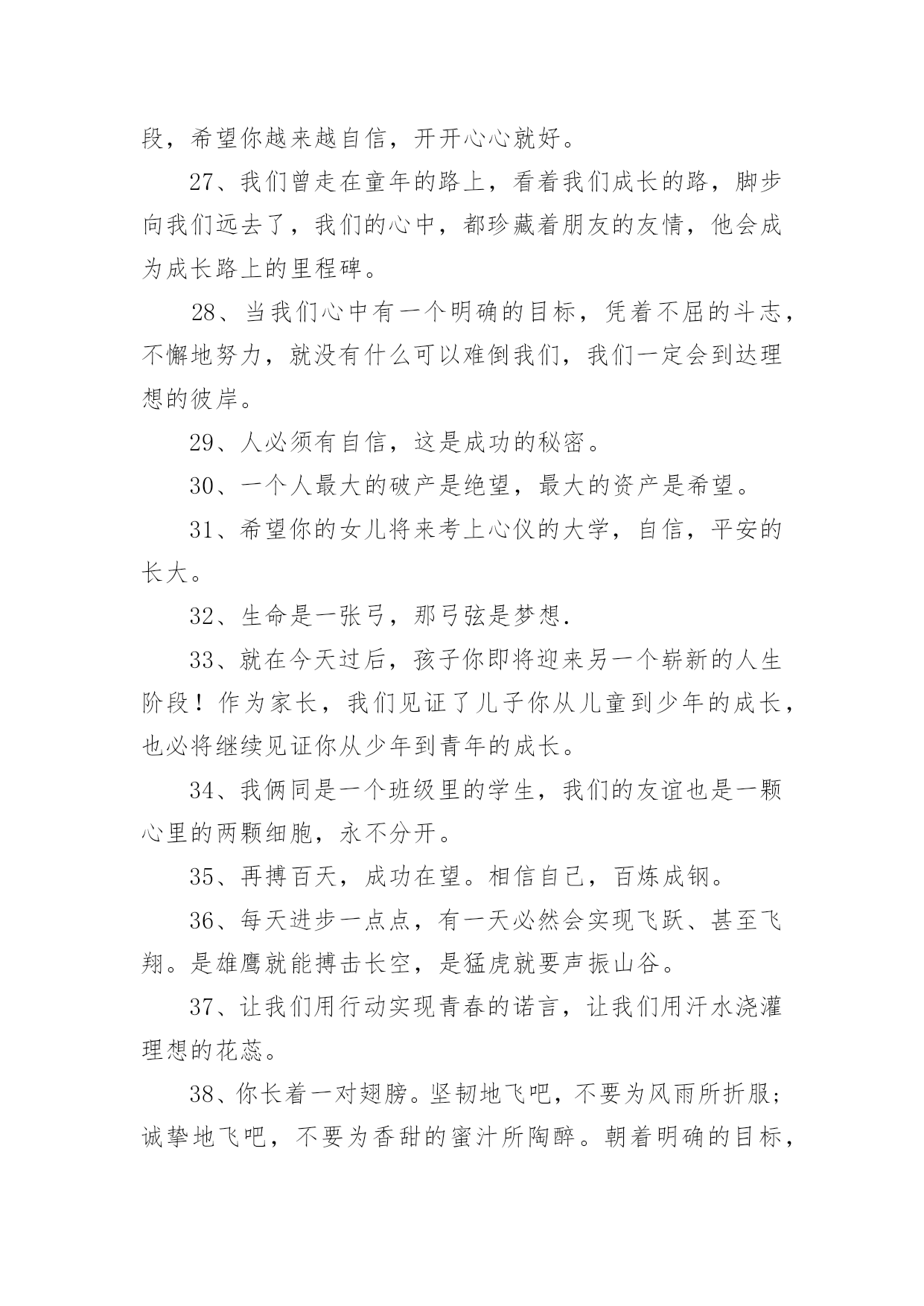 适合考试祝福语在学习、工作乃至生活中,大家都经常接触到祝福语吧,祝福语不限制字数,在运用上较为灵活。那么,怎么去写祝福语呢?以下是小编为大家收集的适合考试祝福语,欢迎阅读,希望大家能够喜欢。适合考试祝福语篇1★榜上有名固可喜,名落孙山亦莫恼只要努力了,就一定会成功的,祝你高考大捷★高考着实是一种丰收,它包蕴着太多的内涵。无论高考成绩如何,你的成长与成熟是任何人无法改变的事实,这三年的辛勤走过,你获得的太多太多。★悲观些看成功,乐观些看失败。轻松些看自己,宽容些看别人。理智些不问收获,但问耕耘天道酬勤。★你笔下拥有一个色彩绚丽的世界:愿你,也相信你,拥有另一个笔下灿烂的图景。★你有你的赤橙黄绿,我有我的青蓝靛紫,天空同属于我们,因为我们年轻。★我们这些曾经的.战友只能默默的祝福,祝福他们得到真正的成功,同时希望在看到他们时能有笑脸战友,加油。★亲爱的同学,我们在一起这么久了,都是你在为我付出。我却没为你做些什么…下辈子如果做牛做马,我……我一定拔草给你吃高考顺利★仰望天空时,什么都比你高,你会自卑;俯视大地时,什么都比你低,你会自负;只有放宽视野,把天空和大地尽收眼底,才能在苍穹泛土之间找到你真正的位置。无须自卑,不要自负,坚持自信。★经过了三年风雨的洗礼,踏过了几许的风涛海浪,十年寒窗,今朝从容潇洒走考场明朝金榜题名天下知风雨后的彩虹,就在你打开短信的瞬间出现,而我的祝福就在你读完的刹那笑完笑着读完,笑着走你以后的的路朋友我的祝福你会懂★XX今天就要参加考试了,送你一条幸运短信,据说在考试当天能收到这样一条短信,就会考出自己满意的成绩,祝你考试好运气啊。适合考试祝福语篇21、拥有知识改变命运,拥有理想改变态度。今天我以朝阳为荣,明天朝阳以我为荣。2、在我们相聚的日子里,有着最珍惜的情谊,在我们年轻的岁月中,有着最真挚的相知,这份缘值得我们珍惜。3、把挚爱的生日祝愿,给事业贴心的女儿,愿在这特别幸福的一天,她时时欢笑快乐无边。生日快乐!4、初中其实很重要,这个阶段不能放松,孩子需要定好自己的目标,了解相关知识的基础,并且有目的的去提升自己。5、祝你的生活越来越完美,越来越好,早日考试好的中学,也希望我们能再次见到。也愿我们的友谊天长地久。6、对通过刻苦的学习,考取自己理想的学校,有些人顺利跨过,而更多人则望辰莫及。然而,你通过自己的努力圆了自己学业之梦,特向你表示祝贺!7、明天,这是个美丽灿烂、辉映着五光十色的迷人的字眼。愿你的明天无限美丽、无限灿烂、无限迷人!8、金榜题名喜讯传,亲朋好友都喜欢。真诚祝福询志愿,志向远大专业选。艳阳高照天灿烂,努力奋斗不畏艰。有朝一日宏图展,梦想实现开笑颜。祝心想事成!9、世间最可宝贵的就是今天,最易丧失的也是今天;愿你在未来的一年中,无限珍惜这每一个今天。10、你留给我的,是美丽的记忆。你使是怀念少年时的纯真和友谊。当我捧起记忆中的佳酿想请你喝时,却先醉了自己。11、自信,是无尽智慧的凝聚。平淡,是成功路上的驿站。12、时间终究会比爱强悍,忘记什么都不难,想复原,不难。等某天各自出现下个牵绊,关于你,很自然会烟消云散。13、百尺竿头,更进一步,蟾宫折桂,金榜题名,美梦成真,学业有成。14、眼看高考就要来了,向前看,相信自己,我会在远方为你送去最真挚的祝福,付出就会有收获的!放松心情,去迎接挑战,我相信你,你一定是最出色的'!15、不要紧张,不要心慌,按照自己的计划来,不要受别人的影响,相信自己。16、精诚所至,金石为开。17、蓝天上缕缕白云,那是我心头丝丝别离的轻愁,然而我的胸怀和晴空一样晴朗,因为我想到了不久的重逢。18、生命,从小溪的流淌中获得;青春,在飞流的倾泻中闪光;存在的价值,于大河的奔流中呈现。19、天道酬勤。人世间没有不经过勤劳而成为天才的。愿你日夜勤奋,早日成才!20、愿每天的太阳带给你光明的同时,也带给你快乐真心祝你生日快乐!21、宝贝,愿你快快脱去幼稚和娇嫩,扬起创造的风帆,驶向成熟,驶向金色的海岸。22、昨天我们曾相逢,交会着互放的光亮;今天我们要出发,从抛弃了黑夜的早晨;明天我们还会相逢在成功的彼岸。23、友谊的种子,深埋在你我的心中,春天一到,才会抽芽,就会开出属于你的、也属于我的花朵。24、我知道你正在经历人生中的一次重要挑战,或许你有焦虑有恐惧,也有激动,但我想说,请不要忘记身边所有关爱着你的人,我们是你坚强的后盾。25、康庄大道摆在你的面前,鲜花和笑声在向你招手,赞美和荣耀在你头上盘旋,祝福你,我们的天之骄子!26、宝贝长大了,大姑娘,升到初中这是一个重要的阶段,希望你越来越自信,开开心心就好。27、我们曾走在童年的路上,看着我们成长的路,脚步向我们远去了,我们的心中,都珍藏着朋友的友情,他会成为成长路上的里程碑。28、当我们心中有一个明确的目标,凭着不屈的