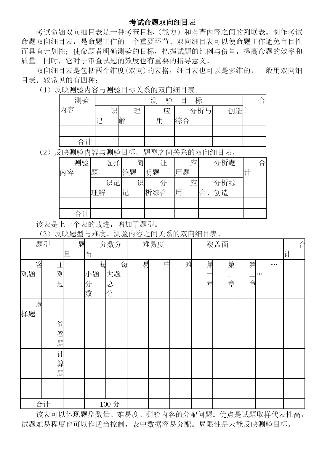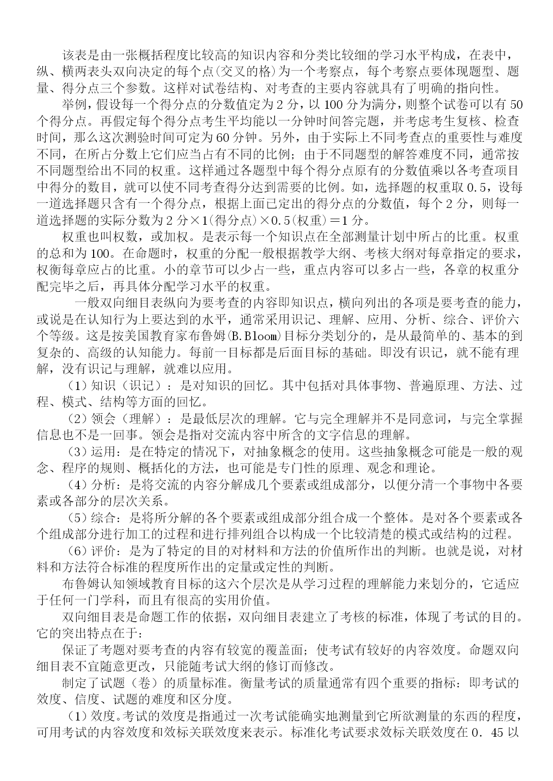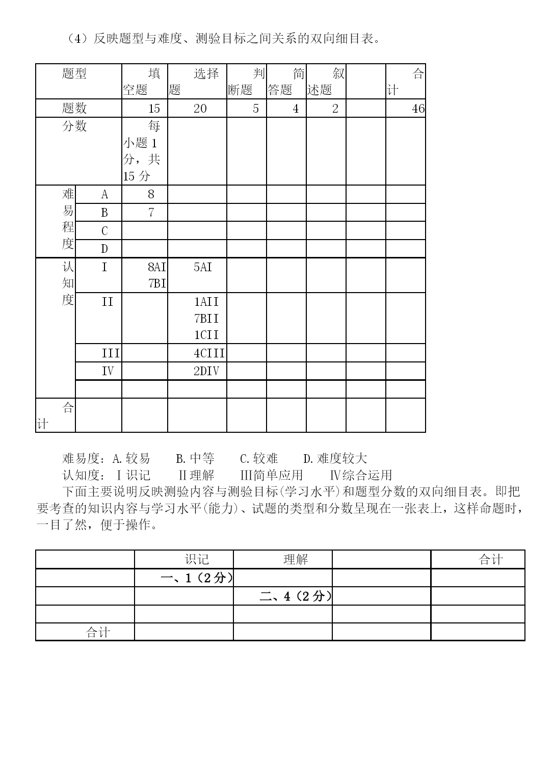 考试命题双向细目表优质资料(可以直接使用,可编辑优质资料,欢迎下载)考试命题双向细目表考试命题双向细目表是一种考查目标(能力)和考查内容之间的列联表。制作考试命题双向细目表,是命题工作的一个重要环节。双向细目表可以使命题工作避免盲目性而具有计划性;使命题者明确测验的目标,把握试题的比例与份量,提高命题的效率和质量。同时,它对于审查试题的效度也有重要的指导意义。双向细目表是包括两个维度(双向)的表格,细目表也可以是多维的,一般用双向细目表。较常见的有四种:(1)反映测验内容与测验目标关系的双向细目表。测验内容测验目标合计识记理解应用分析与综合创造合计(2)反映测验内容与测验目标、题型之间关系的双向细目表。测验内容选择题简答题证明题应用题分析题合计识记、理解识记分析综合应用分析综合、创造合计该表是上一个表的改进,增加了题型。(3)反映题型与难度、测验内容之间关系的双向细目表。题型题量分数分布难易度覆盖面合计客观题主观题每小题分数每大题总分易中难第一章第二章第三章……选择题简答题计算题合计100分该表可以体现题型数量、难易度、测验内容的分配问题。优点是试题取样代表性高,试题难易程度也可以作适当控制,表中数据容易分配。局限性是未能反映测验目标。(4)反映题型与难度、测验目标之间关系的双向细目表。题型填空题选择题判断题简答题叙述题合计题数152054246分数每小题1分,共15分难易程度A8B7CD认知度I8AI7BI5AIII1AII7BII1CIIIII4CIIIIV2DIV合计难易度:A.较易B.中等C.较难D.难度较大认知度:Ⅰ识记Ⅱ理解Ⅲ简单应用Ⅳ综合运用下面主要说明反映测验内容与测验目标(学习水平)和题型分数的双向细目表。即把要考查的知识内容与学习水平(能力)、试题的类型和分数呈现在一张表上,这样命题时,一目了然,便于操作。识记理解合计一、1(2分)二、4(2分)合计该表是由一张概括程度比较高的知识内容和分类比较细的学习水平构成,在表中,纵、横两表头双向决定的每个点(交叉的格)为一个考察点,每个考察点要体现题型、题量、得分点三个参数。这样对试卷结构、对考查的主要内容就具有了明确的指向性。举例,假设每一个得分点的分数值定为2分,以100分为满分,则整个试卷可以有50个得分点。再假定每个得分点考生平均能以一分钟时间答完题,并考虑考生复核、检查时间,那么这次测验时间可定为60分钟。另外,由于实际上不同考查点的重要性与难度不同,在所占分数上它们应当占有不同的比例;由于不同题型的解答难度不同,通常按不同题型给出不同的权重。这样通过各题型中每个得分点原有的分数值乘以各考查项目中得分的数目,就可以使不同考查得分达到需要的比例。如,选择题的权重取0.5,设每一道选择题只含有一个得分点,根据上面已定出的得分点的分数值,每个2分,则每一道选择题的实际分数为2分×1(得分点)×0.5(权重)=1分。权重也叫权数,或加权。是表示每一个知识点在全部测量计划中所占的比重。权重的总和为100。在命题时,权重的分配一般根据教学大纲、考核大纲对每章指定的要求,权衡每章应占的比重。小的章节可以少占一些,重点内容可以多占一些,各章的权重分配完毕之后,再具体分配学习水平的权重。一般双向细目表纵向为要考查的内容即知识点,横向列出的各项是要考查的能力,或说是在认知行为上要达到的水平,通常采用识记、理解、应用、分析、综合、评价六个等级。这是按美国教育家布鲁姆(B.Bloom)目标分类划分的,是从最简单的、基本的到复杂的、高级的认知能力。每前一目标都是后面目标的基础。即没有识记,就不能有理解,没有识记与理解,就难以应用。(1)知识(识记):是对知识的回忆。其中包括对具体事物、普遍原理、方法、过程、模式、结构等方面的回忆。(2)领会(理解):是最低层次的理解。它与完全理解并不是同意词,与完全掌握信息也不是一回事。领会是指对交流内容中所含的文字信息的理解。(3)运用:是在特定的情况下,对抽象概念的使用。这些抽象概念可能是一般的观念、程序的规则、概括化的方法,也可能是专门性的原理、观念和理论。(4)分析:是将交流的内容分解成几个要素或组成部分,以便分清一个事物中各要素或各部分的层次关系。(5)综合:是将所分解的各个要素或组成部分组合成一个整体。是对各个要素或各个组成部分进行加工的过程和进行排列组合以构成一个比较清楚的模式或结构的过程。(6)评价:是为了特定的目的对材料和方法的价值所作出的判断。也就是说,对材料和方法符合标准的程度所作出的定量或定性的判断。布鲁姆认知领域教育目标的这六个层次是从学习过程的理解能力来划分的,它适应于任何一门学科,而且有很高的实用价值。双向细