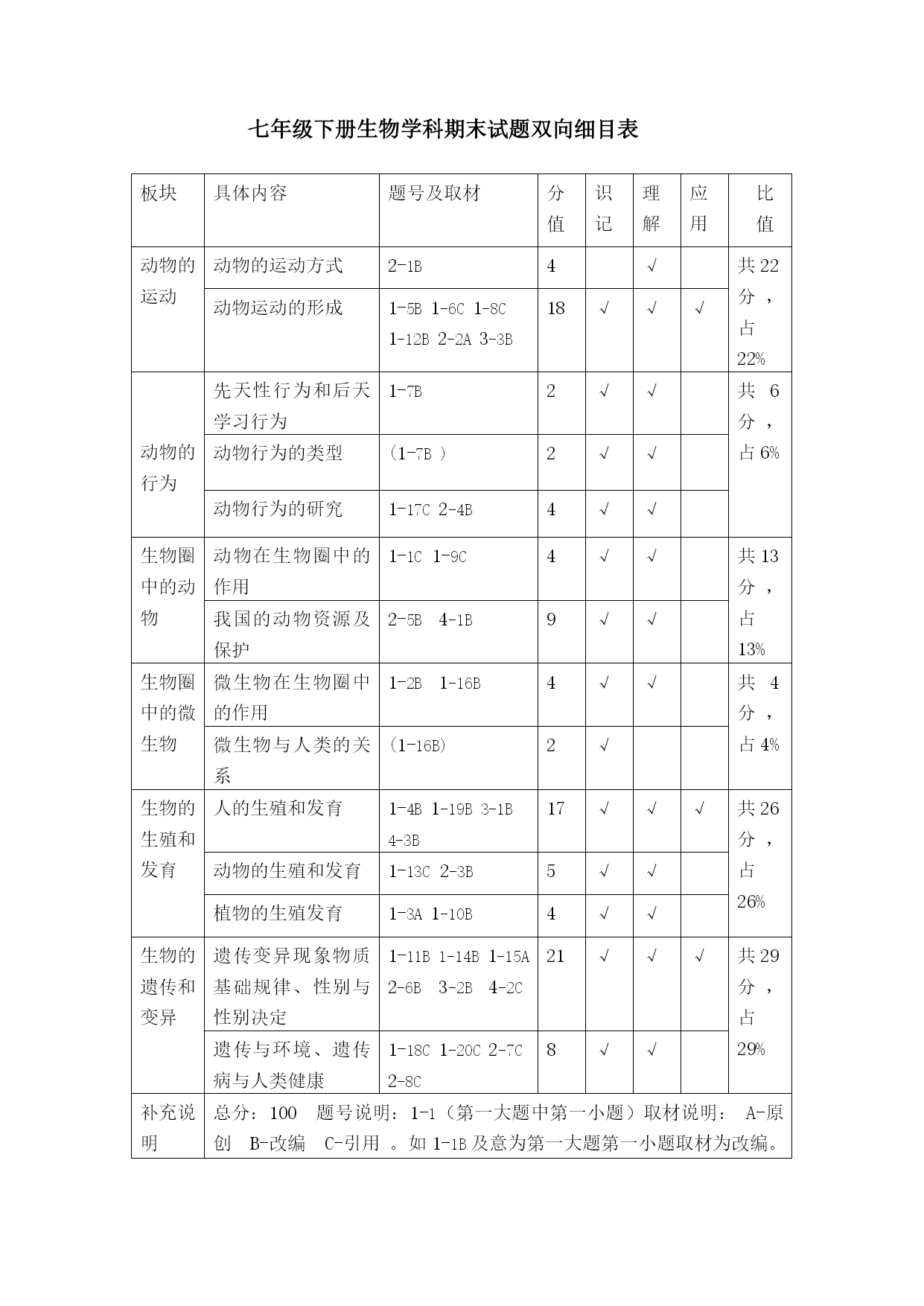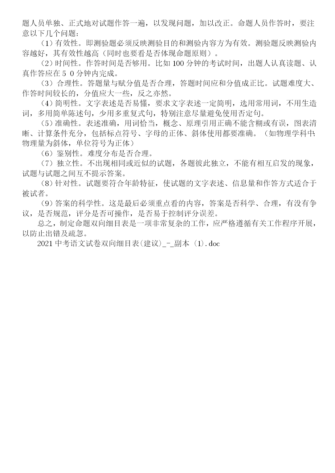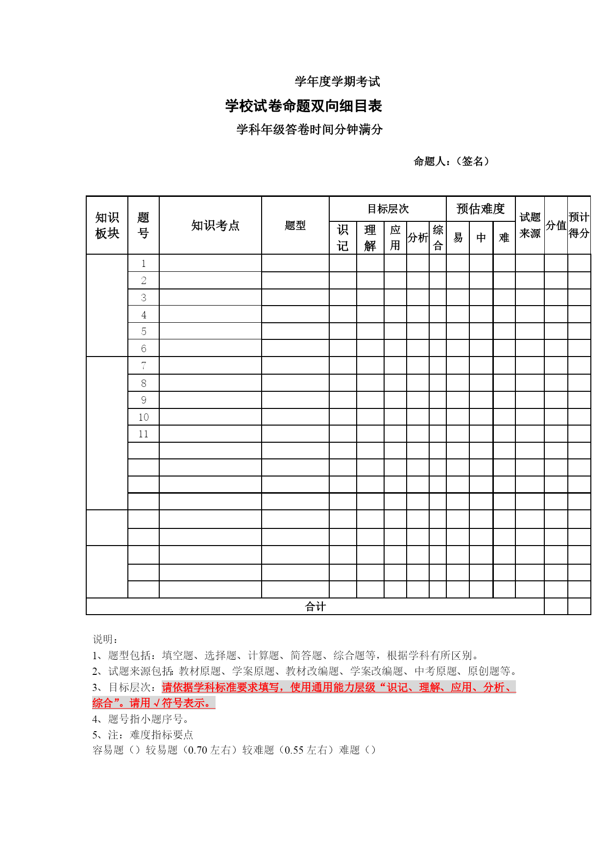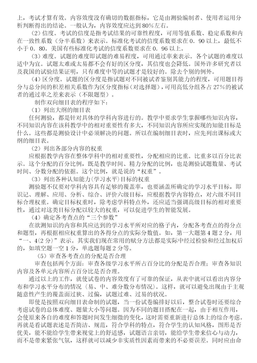 考试命题双向细目表优质资料(可以直接使用,可编辑优质资料,欢迎下载)考试命题双向细目表考试命题双向细目表是一种考查目标(能力)和考查内容之间的列联表。制作考试命题双向细目表,是命题工作的一个重要环节。双向细目表可以使命题工作避免盲目性而具有计划性;使命题者明确测验的目标,把握试题的比例与份量,提高命题的效率和质量。同时,它对于审查试题的效度也有重要的指导意义。双向细目表是包括两个维度(双向)的表格,细目表也可以是多维的,一般用双向细目表。较常见的有四种:(1)反映测验内容与测验目标关系的双向细目表。测验内容测验目标合计识记理解应用分析与综合创造合计(2)反映测验内容与测验目标、题型之间关系的双向细目表。测验内容选择题简答题证明题应用题分析题合计识记、理解识记分析综合应用分析综合、创造合计该表是上一个表的改进,增加了题型。(3)反映题型与难度、测验内容之间关系的双向细目表。题型题量分数分布难易度覆盖面合计客观题主观题每小题分数每大题总分易中难第一章第二章第三章……选择题简答题计算题合计100分该表可以体现题型数量、难易度、测验内容的分配问题。优点是试题取样代表性高,试题难易程度也可以作适当控制,表中数据容易分配。局限性是未能反映测验目标。(4)反映题型与难度、测验目标之间关系的双向细目表。题型填空题选择题判断题简答题叙述题合计题数152054246分数每小题1分,共15分难易程度A8B7CD认知度I8AI7BI5AIII1AII7BII1CIIIII4CIIIIV2DIV合计难易度:A.较易B.中等C.较难D.难度较大认知度:Ⅰ识记Ⅱ理解Ⅲ简单应用Ⅳ综合运用下面主要说明反映测验内容与测验目标(学习水平)和题型分数的双向细目表。即把要考查的知识内容与学习水平(能力)、试题的类型和分数呈现在一张表上,这样命题时,一目了然,便于操作。识记理解合计一、1(2分)二、4(2分)合计该表是由一张概括程度比较高的知识内容和分类比较细的学习水平构成,在表中,纵、横两表头双向决定的每个点(交叉的格)为一个考察点,每个考察点要体现题型、题量、得分点三个参数。这样对试卷结构、对考查的主要内容就具有了明确的指向性。举例,假设每一个得分点的分数值定为2分,以100分为满分,则整个试卷可以有50个得分点。再假定每个得分点考生平均能以一分钟时间答完题,并考虑考生复核、检查时间,那么这次测验时间可定为60分钟。另外,由于实际上不同考查点的重要性与难度不同,在所占分数上它们应当占有不同的比例;由于不同题型的解答难度不同,通常按不同题型给出不同的权重。这样通过各题型中每个得分点原有的分数值乘以各考查项目中得分的数目,就可以使不同考查得分达到需要的比例。如,选择题的权重取0.5,设每一道选择题只含有一个得分点,根据上面已定出的得分点的分数值,每个2分,则每一道选择题的实际分数为2分×1(得分点)×0.5(权重)=1分。权重也叫权数,或加权。是表示每一个知识点在全部测量计划中所占的比重。权重的总和为100。在命题时,权重的分配一般根据教学大纲、考核大纲对每章指定的要求,权衡每章应占的比重。小的章节可以少占一些,重点内容可以多占一些,各章的权重分配完毕之后,再具体分配学习水平的权重。一般双向细目表纵向为要考查的内容即知识点,横向列出的各项是要考查的能力,或说是在认知行为上要达到的水平,通常采用识记、理解、应用、分析、综合、评价六个等级。这是按美国教育家布鲁姆(B.Bloom)目标分类划分的,是从最简单的、基本的到复杂的、高级的认知能力。每前一目标都是后面目标的基础。即没有识记,就不能有理解,没有识记与理解,就难以应用。(1)知识(识记):是对知识的回忆。其中包括对具体事物、普遍原理、方法、过程、模式、结构等方面的回忆。(2)领会(理解):是最低层次的理解。它与完全理解并不是同意词,与完全掌握信息也不是一回事。领会是指对交流内容中所含的文字信息的理解。(3)运用:是在特定的情况下,对抽象概念的使用。这些抽象概念可能是一般的观念、程序的规则、概括化的方法,也可能是专门性的原理、观念和理论。(4)分析:是将交流的内容分解成几个要素或组成部分,以便分清一个事物中各要素或各部分的层次关系。(5)综合:是将所分解的各个要素或组成部分组合成一个整体。是对各个要素或各个组成部分进行加工的过程和进行排列组合以构成一个比较清楚的模式或结构的过程。(6)评价:是为了特定的目的对材料和方法的价值所作出的判断。也就是说,对材料和方法符合标准的程度所作出的定量或定性的判断。布鲁姆认知领域教育目标的这六个层次是从学习过程的理解能力来划分的,它适应于任何一门学科,而且有很高的实用价值。双向细