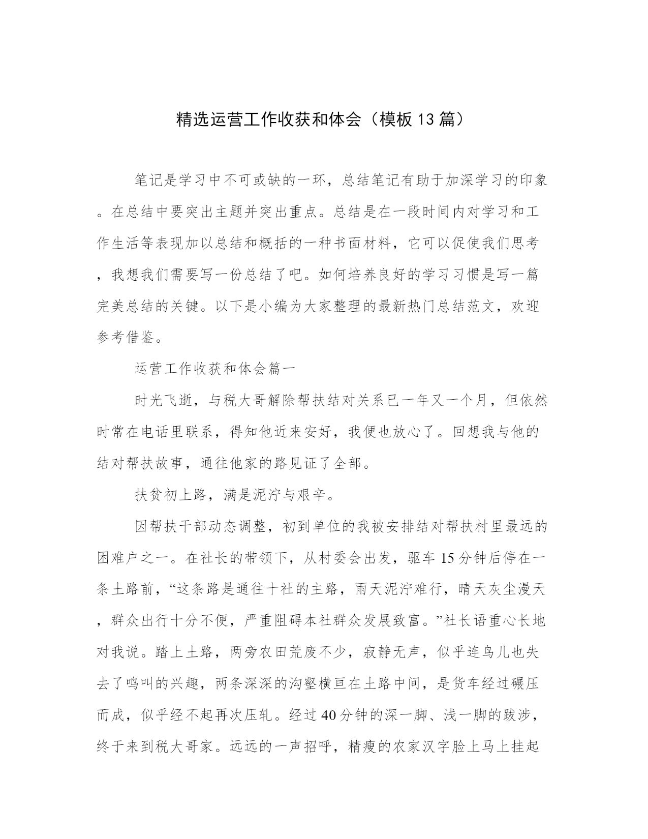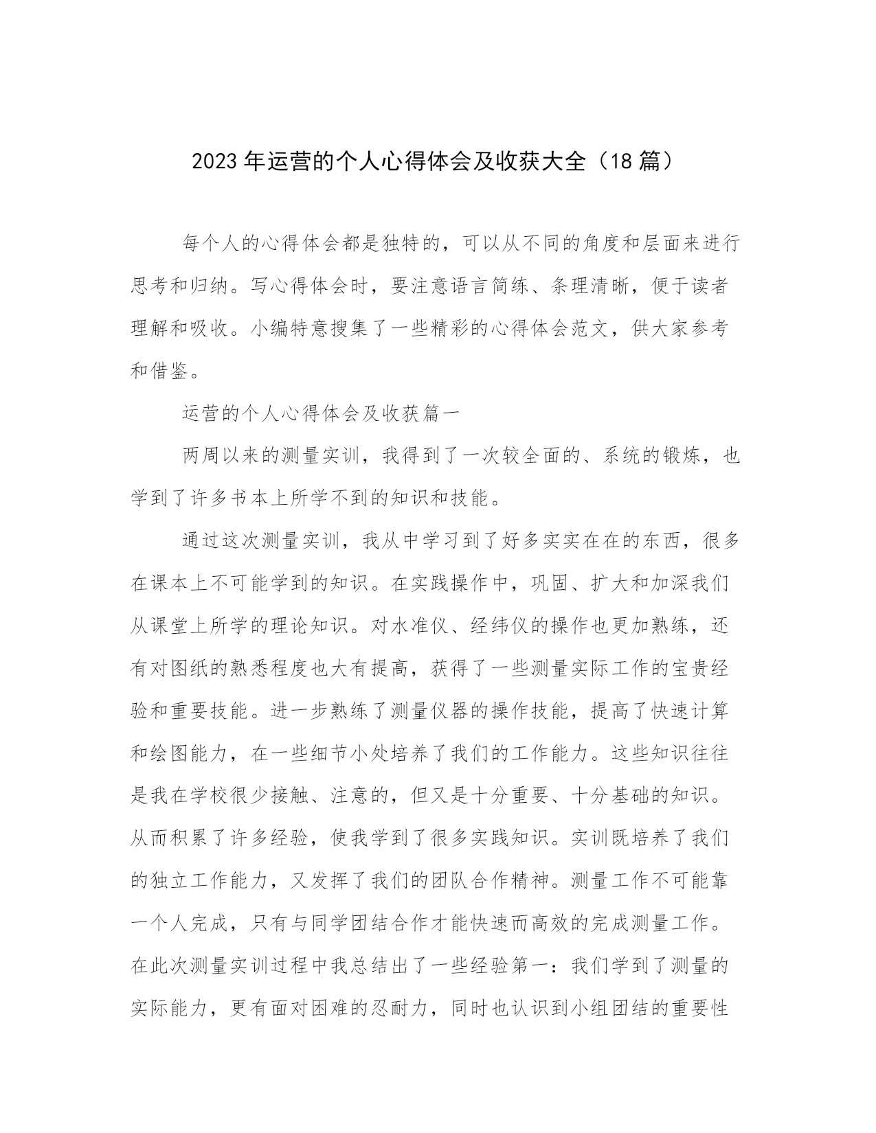 优秀企业运营的收获体会大全(16篇)总结是学习的重要环节之一,只有通过总结才能逐渐提高自己的学习效果。写总结时要注意客观、全面、准确地表达自己的想法和认识。以下是小编为大家准备的一些总结示范,希望对大家有所启发。企业运营的收获体会篇一在过去的数年中,我一直在一家中型企业工作,负责运营管理。在这个过程中,我积累了许多关于企业运营的宝贵经验。今天,我想分享一些我所学到的收获心得,希望对其他企业运营者有所帮助。首先,建立良好的团队合作是企业成功的关键。一个强大的团队能够共同努力完成各种任务和目标。我了解到,要建立一个成功的团队,领导者需要具备明确的愿景和目标,并将其传达给团队成员。同时,领导者应该激励并激发团队成员的潜力,鼓励他们要相互支持和合作。通过建立一个团结一致的团队,企业可以更加高效地运营,取得更好的成果。其次,不断学习和创新是企业运营的关键。在快速变化的商业环境中,如果企业停止学习和创新,就会落后于竞争对手。在我的工作经验中,我发现定期进行市场调研和竞争对手分析是非常重要的。通过了解行业的最新趋势和市场的需求变化,企业可以及时调整自己的运营策略,保持竞争优势。此外,我还鼓励团队成员不断追求个人成长和发展,为企业带来更多的创新和创意。第三,建立良好的客户关系是企业运营成功的关键因素。在现代社会,顾客满意度对于企业的生存和发展至关重要。因此,建立良好的客户关系需要企业运营者倾听客户的需求和反馈,并及时作出调整和改进。我始终坚信,顾客是企业的最大资产,只有通过提供优质的产品和服务,才能赢得客户的信任和忠诚。所以,我在企业运营中始终将客户的需求放在首位,努力为他们提供最佳的解决方案。第四,有效的沟通和协调是企业运营的核心。在一个大型组织中,不同部门和团队之间的沟通和协调至关重要。我通过在工作中积极倾听和有效沟通的实践中,意识到沟通是解决问题和促进合作的关键。除了面对面的沟通,现代技术也提供了更多的工具和渠道来加强沟通。通过利用这些工具,企业可以更好地协调和整合各项业务活动,提高运营效率。最后,我认为企业运营的关键在于持续的改进和追求。持续改进是一种价值观和一种文化,它要求企业不断寻求更好的解决方案和方法,以提高效率和质量。同时,企业运营者也需要不断追求个人和团队的进步,在学习和实践中不断提升自己的能力和知识。通过持续改进和追求,企业可以不断适应变化的环境,保持竞争优势。总而言之,企业运营是一个复杂而关键的领域。在我的工作经验中,我认识到,建立良好的团队合作、不断学习和创新、建立良好的客户关系、有效的沟通和协调,以及持续改进和追求,是企业运营成功的关键因素。通过运用这些心得体会,我相信企业运营者可以在竞争激烈的商业环境中取得更好的成果。企业运营的收获体会篇二随着经济的快速发展和竞争的日益激烈,运营企业已成为现代商业的核心工作之一。在经历了多年的企业运营,我深刻认识到,成功的企业必须具备恰当的战略眼光、卓越的执行力和有效的团队管理。在本文中,我将分享我在运营企业中所积累的心得体会,并总结出了五个关键要点。首先,战略眼光是运营企业成功的基石。一个明智的企业运营者应该具备敏锐的市场洞察力,能够准确地把握市场趋势,并为企业制定明确的发展规划。在一个由竞争激烈的市场环境所构成的世界里,企业必须不断地调整和改进自己的战略,以保持竞争力。此外,对于新兴市场和新技术的积极关注也是企业运营者不可或缺的品质。只有不断创新和超越,企业才能在激烈的市场竞争中生存下来。其次,卓越的执行力是运营企业的关键。一项伟大的战略如果没有得到有效的执行,就只是一纸空文。一个成功的企业运营者应该具备良好的执行能力,能够将战略转化为可行的行动计划,并有效地将其传达给团队成员。并且,企业运营者还应该有监督和追踪执行计划的能力,以确保工作按时完成并达到预期的目标。在执行计划中,有效的沟通是至关重要的,确保每个人都清楚自己的工作职责,并且团队之间能够高效协作。第三,团队管理是运营企业成功的关键。做好团队管理,能够帮助企业充分发挥每个员工的潜力。一个优秀的企业运营者应该具备良好的人际沟通能力,能够合理地分配工作,并能够给予员工必要的支持和指导。此外,团队文化也是团队管理的重要方面。一个有效的团队文化可以激发员工的工作热情和创造力,增强团队的凝聚力。因此,企业运营者应该注重培养和塑造良好的团队文化。第四,持续学习是运营企业的必要条件。运营企业是一个复杂而多样化的过程,每天都会面临新的问题和挑战。为了应对这些挑战,企业运营者必须不断学习和进步。持续学习意味着要不断更新和扩大自己的知识储备,并掌握最新的管理理论和工具。此外,企业运营者还应该通过参加研讨会、培训课程和与同行的交流来扩展自己的视野。最后,坚持诚信和道德原则是运营企业的基本要求。在商业活动中,