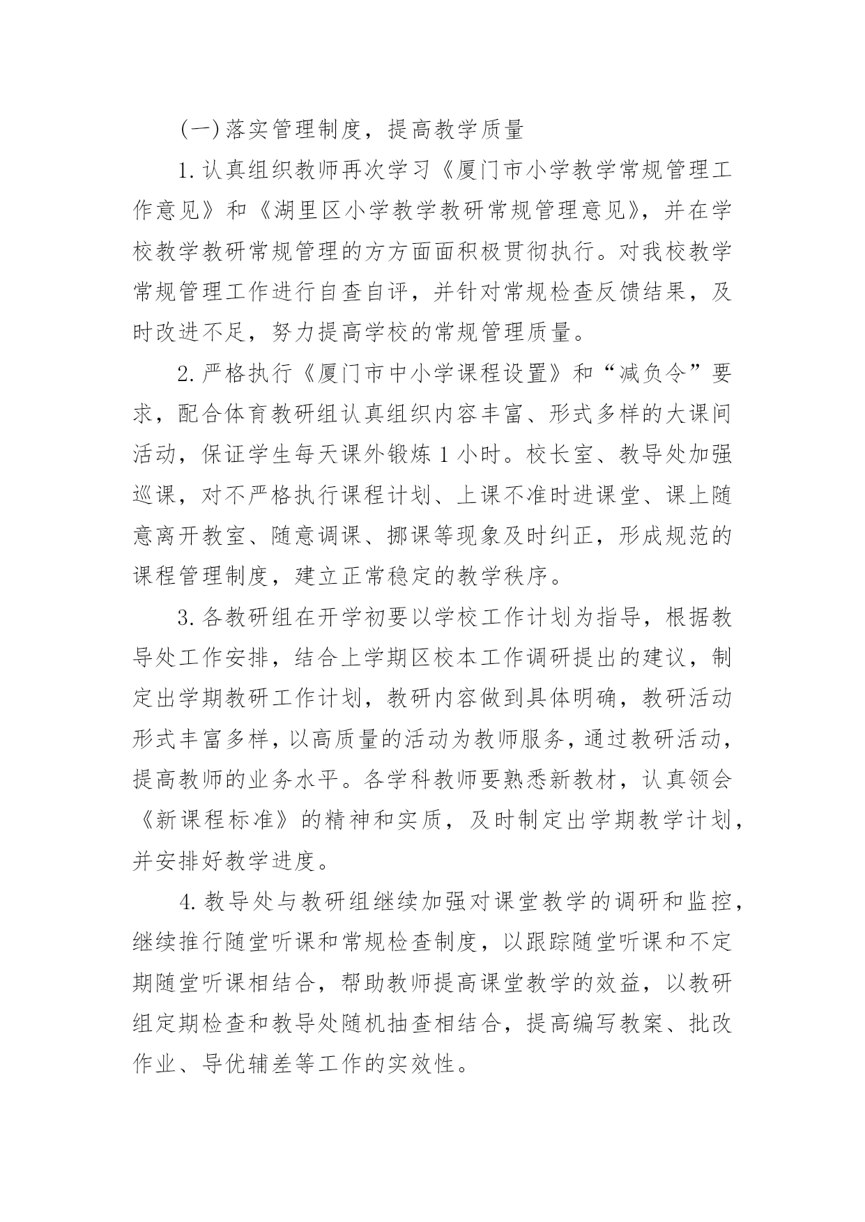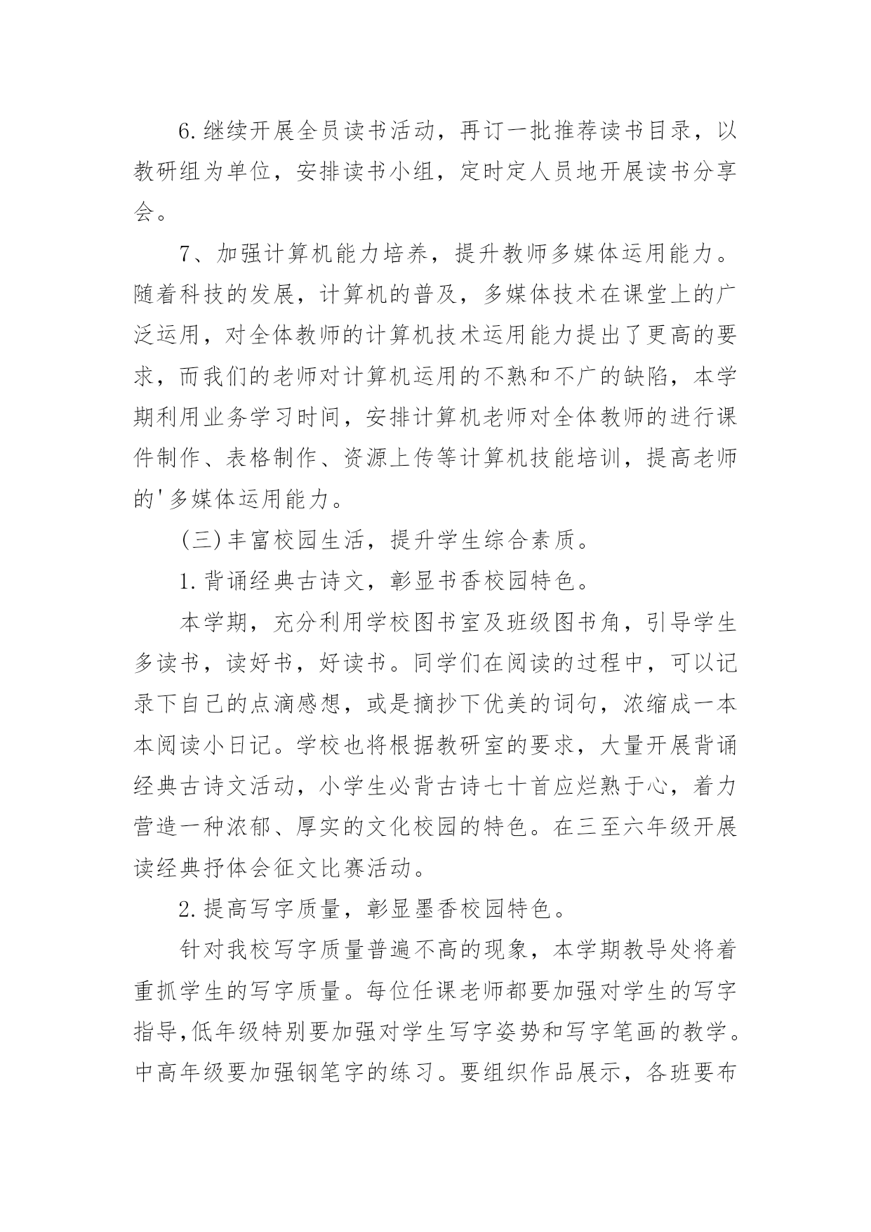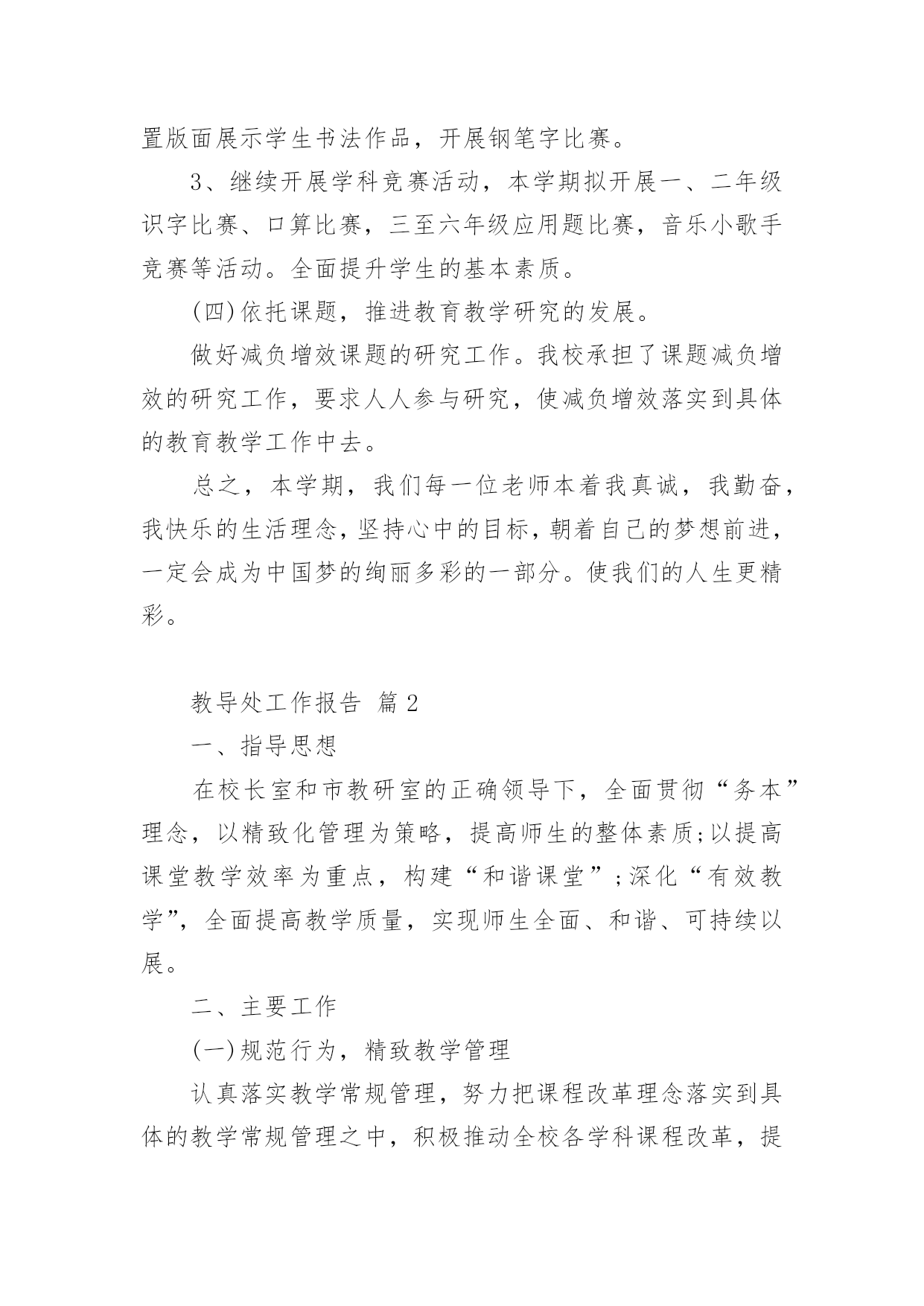 教导处工作报告随着个人素质的提升,报告的使用成为日常生活的常态,多数报告都是在事情做完或发生后撰写的。那么你真正懂得怎么写好报告吗?以下是小编精心整理的教导处工作报告,供大家参考借鉴,希望可以帮助到有需要的朋友。教导处工作报告篇1一、指导思想:新学期,我校教导处工作将继续围绕区教师进修学校教研和培训工作部署,以全面提高教学质量为中心,以进一步推进我校基础教育课程改革为重点,着力抓好常规管理、师资培训、质量监控、课题研究等工作,推动我校教育教学工作再上新台阶。二、工作思路:深思并总结我校近几年教学发展的过程,汲取有用经验,联系实际,重新定位本学期的发展目标和措施。坚持精细化管理,务实求真,把提高教学质量放在重要位置,不断加大我校的教学科研力度,突破进取,开拓一个崭新的教学面貌。1、常规管理更精细;2、校本教研更有效;3、教学质量更稳定;4、师生素质更全面。三、工作重点及措施:(一)落实管理制度,提高教学质量1.认真组织教师再次学习《厦门市小学教学常规管理工作意见》和《湖里区小学教学教研常规管理意见》,并在学校教学教研常规管理的方方面面积极贯彻执行。对我校教学常规管理工作进行自查自评,并针对常规检查反馈结果,及时改进不足,努力提高学校的常规管理质量。2.严格执行《厦门市中小学课程设置》和“减负令”要求,配合体育教研组认真组织内容丰富、形式多样的大课间活动,保证学生每天课外锻炼1小时。校长室、教导处加强巡课,对不严格执行课程计划、上课不准时进课堂、课上随意离开教室、随意调课、挪课等现象及时纠正,形成规范的课程管理制度,建立正常稳定的教学秩序。3.各教研组在开学初要以学校工作计划为指导,根据教导处工作安排,结合上学期区校本工作调研提出的建议,制定出学期教研工作计划,教研内容做到具体明确,教研活动形式丰富多样,以高质量的活动为教师服务,通过教研活动,提高教师的业务水平。各学科教师要熟悉新教材,认真领会《新课程标准》的精神和实质,及时制定出学期教学计划,并安排好教学进度。4.教导处与教研组继续加强对课堂教学的调研和监控,继续推行随堂听课和常规检查制度,以跟踪随堂听课和不定期随堂听课相结合,帮助教师提高课堂教学的效益,以教研组定期检查和教导处随机抽查相结合,提高编写教案、批改作业、导优辅差等工作的实效性。5.加强对学科教学质量的跟踪调研,虽然平时不举行单元测试,但仍然要求各学科要有阶段复习和练习,及时了解学生学习情况,认真进行质量分析与总结,提出相应的具体措施。重点加强毕业班的质量监控,及时召开毕业班任课教师会议、毕业班学生家长会等,掌握学生思想、学习等方面的动态,制定详细的复习指导方案,家校密切配合,做好毕业迎考工作。进一步加强和改进学生的评价方式,落实《湖里区发展性评价综合记录册》全学科评价及定性定量、细评粗评相结合的评价策略。6.重视导优辅差工作。建立导优辅差档案,要求每位教师一要重视课内补差,二要重视利用课余时间进行导优辅差,三要及时与家长取得联系,防止个别厌学、逃学情况的发生,并做好观察记录,对所教班中的差生情况老师要做到心中有数,一个不能少,一个不能放。重视学生的作业质量,及时订正,人人过关,做到“堂堂清、课课清、日日清”。7.加强对学科竞赛的组织、策划、指导工作,组织学生参加各级各类竞赛,以竞赛为契机,切实加强对特长生的辅导,做到因材施教。丰富第二课堂,挖掘家长和周边资源,开展舞蹈、科技、美术、书法、篮球、田径队等小社团活动,规范管理,每个负责老师在开学初要拟定出活动计划、活动内容,教导处对各组进行巡查,期末各组综合展示。(二)强化课程改革,促进有效研修1.组织教师积极参加各级课程培训,外出听讲座、学习取经等,自觉阅读有关教育教学、课改理论等书籍,将新思想新理念运用到自己的课堂教学实践中去,有效转变教学行为。2.加强教育科研和教研工作,继续以科研带动教研,以教研促进教改。充分发挥教研组长的职责,以常规教研活动与创新教研方式相结合,积极探索更科学有效的教研方式。加强校内同学科、同年段的教研工作,引领教师以教学实践中的各种具体问题为对象开展研究,提高研究、解决问题的能力。每位教师本学期要在本组内至少上一节公开课,撰写较高质量的学科论文和教学反思等,通过听课、评课,促进交流;尝试到外校参加教研,不断提高教研组的教研实效性。3.围绕我校市、区共三个立项课题继续开展课题研究活动,争取专家的引领,鼓励教师大胆尝试,合作研讨,重点突破,做好阶段小结和过程性材料的积累,力求通过课题的引领来提升校本教研的质量。4.开展教师技能岗位练兵活动、竞赛,发挥新一批骨干教师的辐射作用,带动更多的年轻教师练好基本功,提升教师教学能力,并借练兵活动为平台挑选校级骨干。5.继续加强对青年教师的培养,教导处将组织对部分青年教师进行随堂听课,甚至跟踪听课,目的