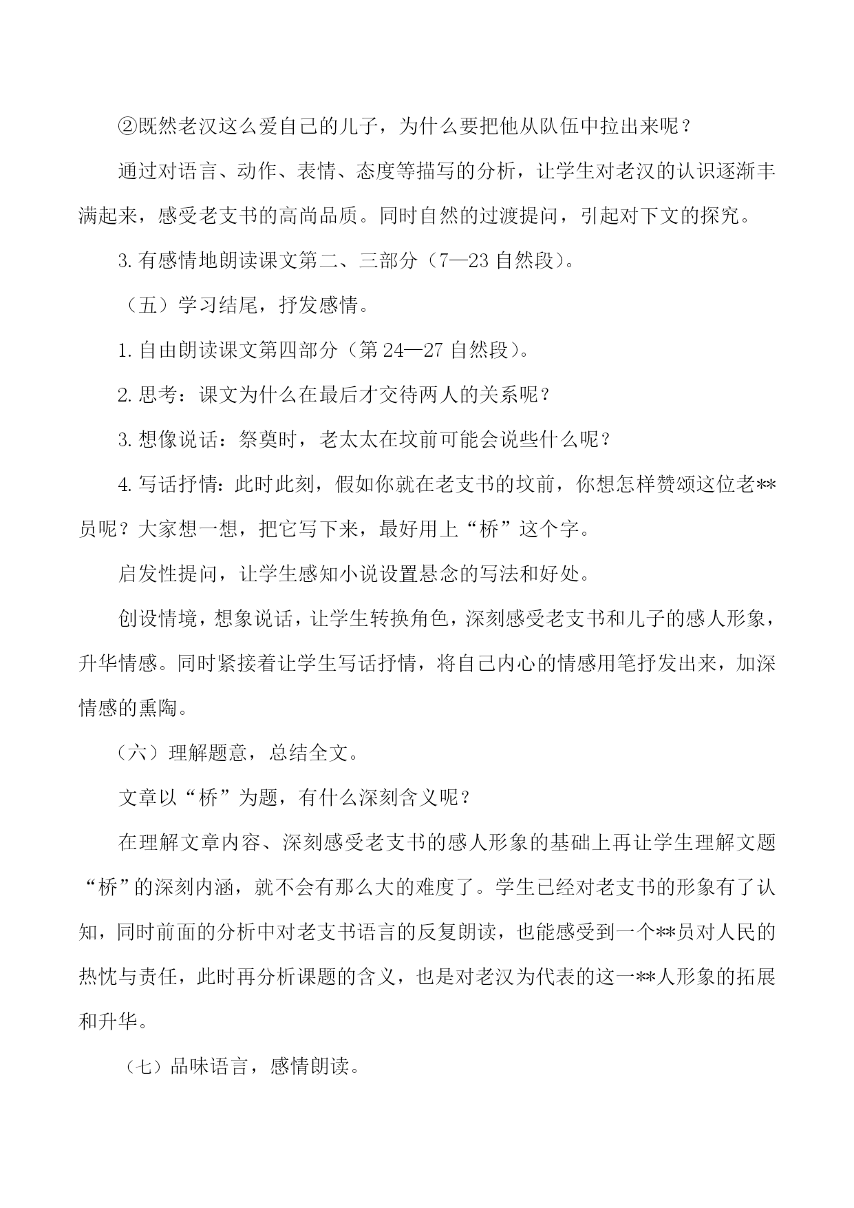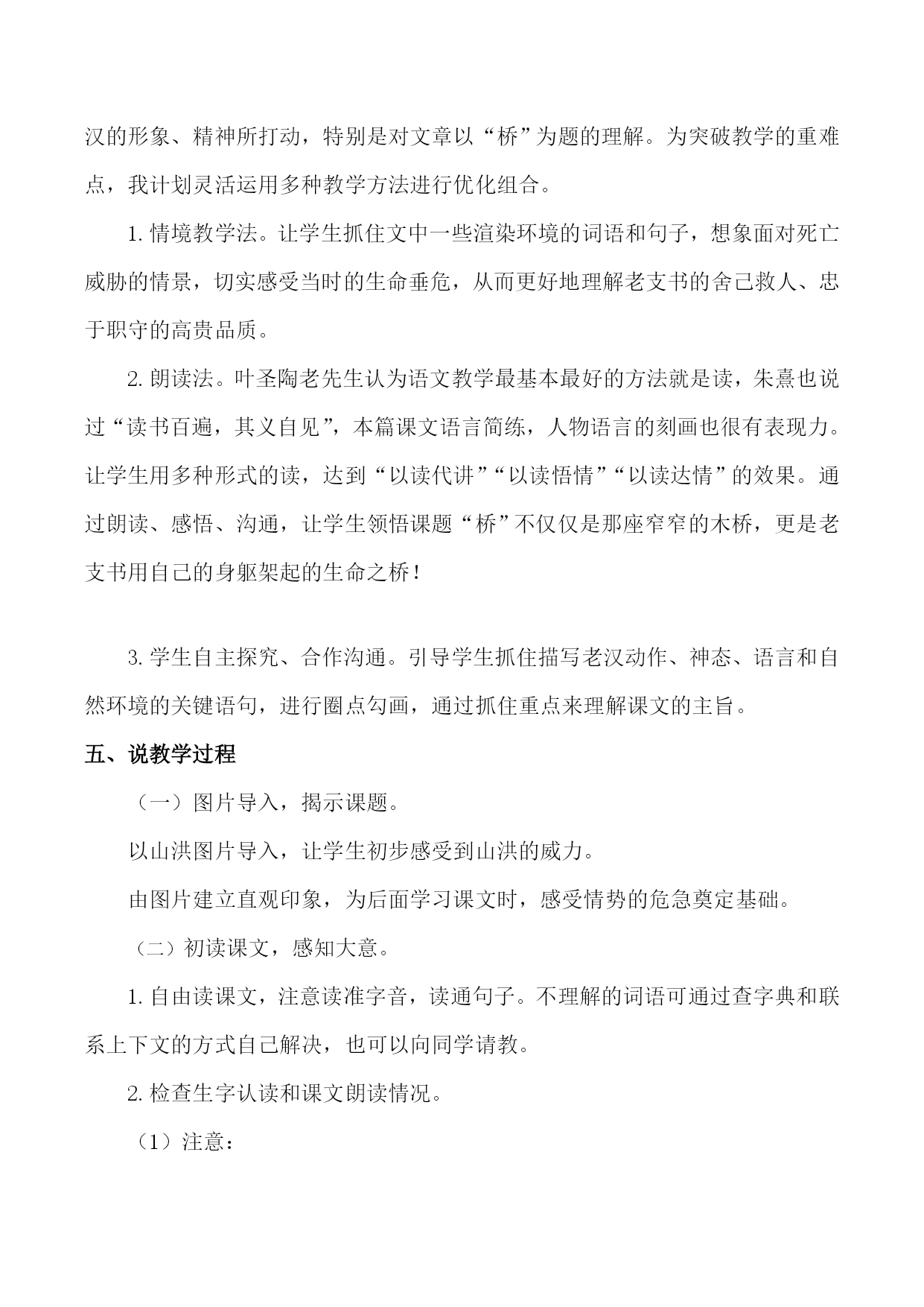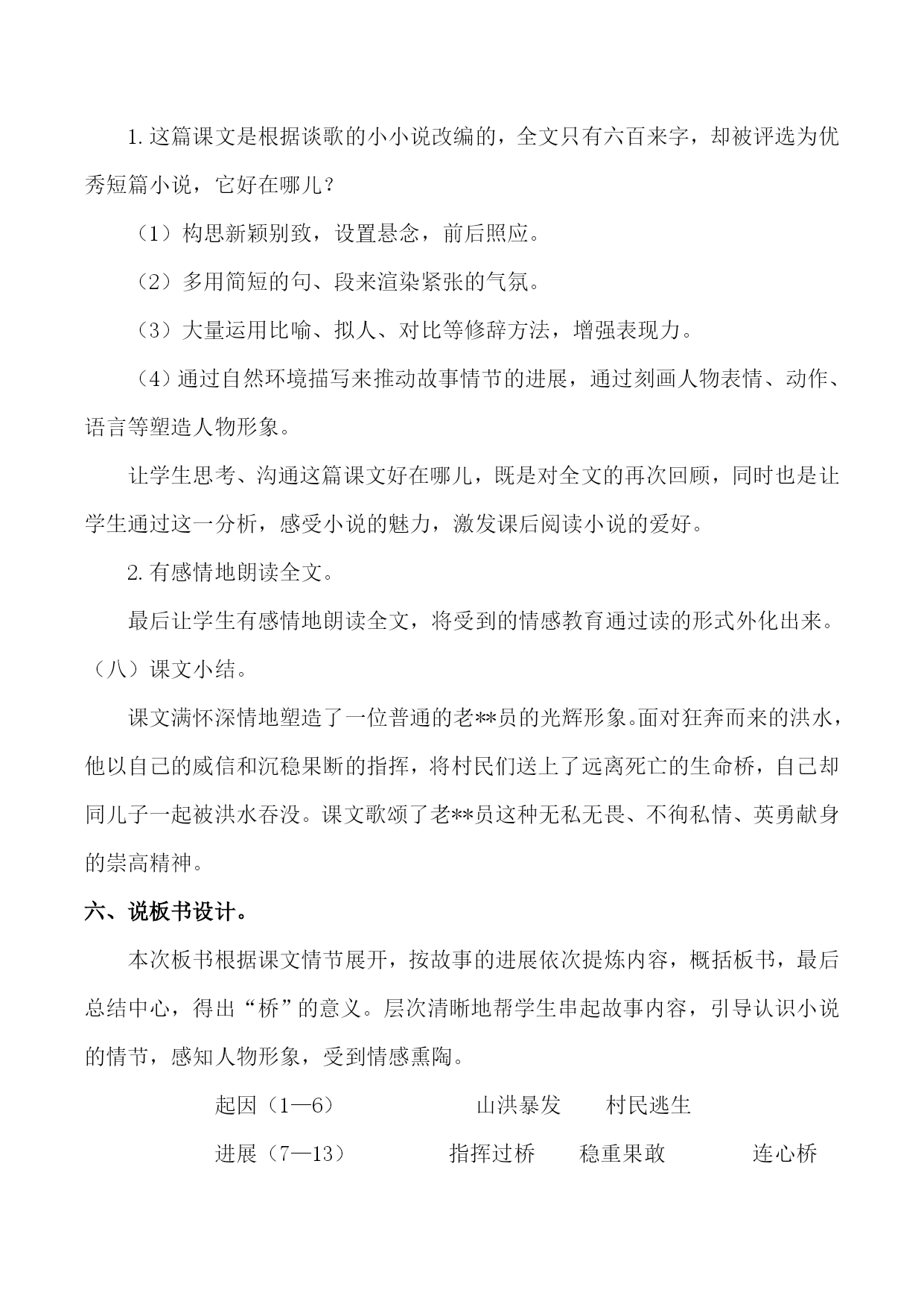 《桥》说课稿说教材 《桥》是统编教材小学语文六年级上册第四单元的第一篇课文。本单元是小说单元,引导学生读小说,关注情节、环境,感受人物形象。这篇课文处处充满着人性的美,作者以深情的笔触塑造了一位老**员的光辉形象。面对狂奔而来的洪水,他以自己威信、沉稳、果断地指挥,将村民们送上跨越死亡的生命桥。他把生的希望让给群众,把死的危险留给自己,用自己的血肉之躯筑起了一座不朽的桥梁。这座桥梁是我们党以老支书为代表的优秀**员密切联系群众的“桥”,这正是课文以“桥”作题目的深刻内涵。 说教学目标 1.会写“咆、哮”等