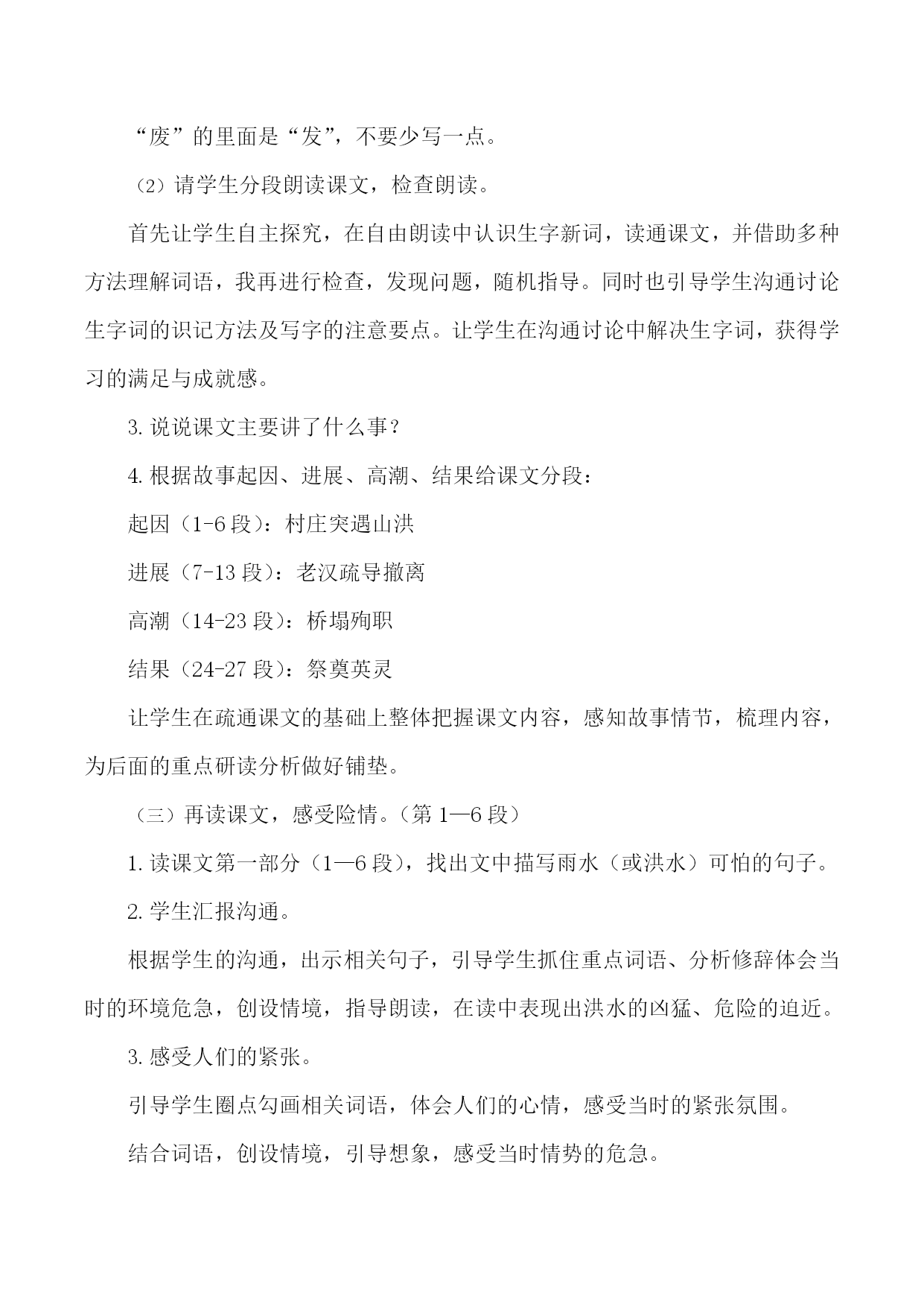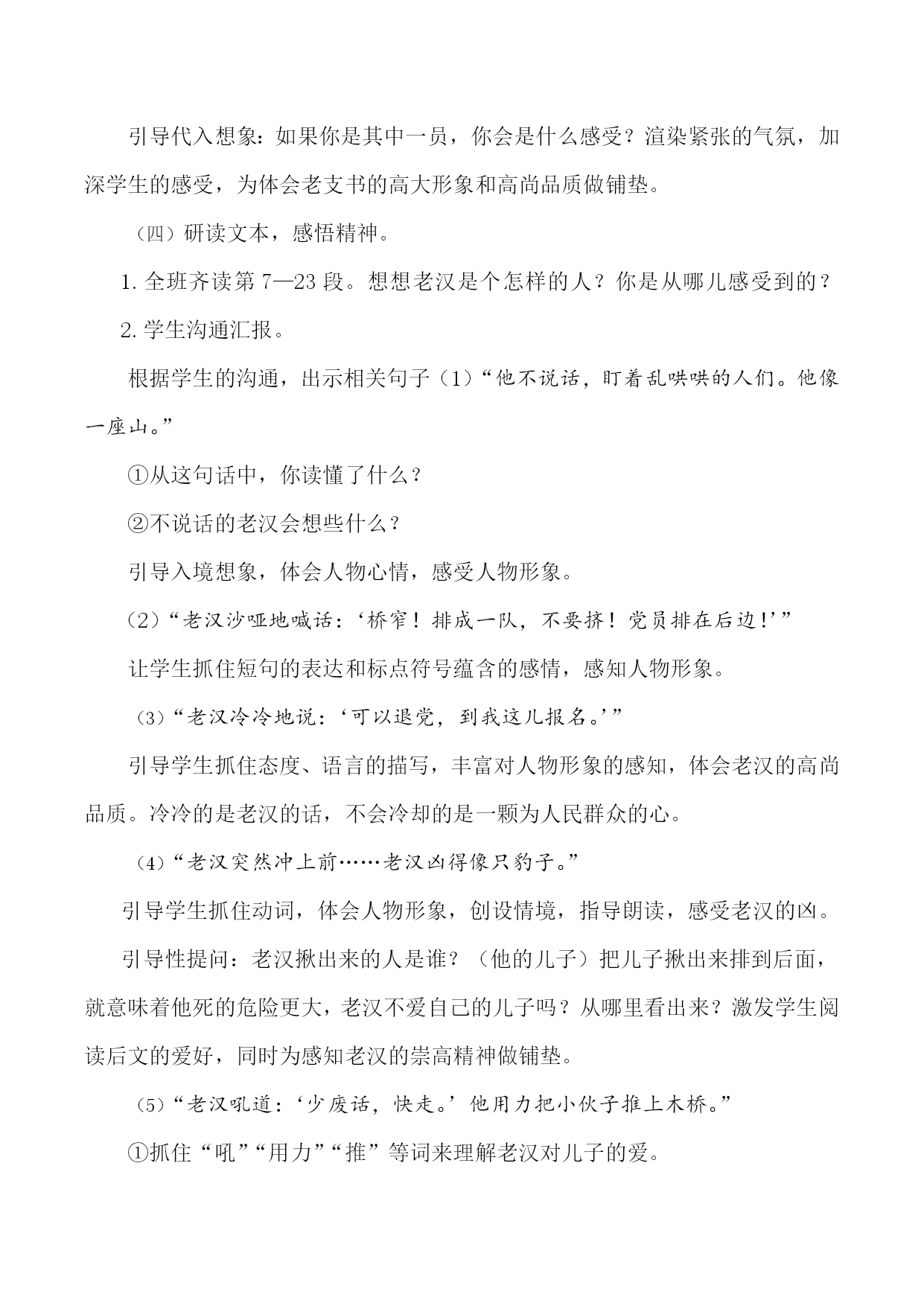 13《桥》导学案课题桥课型新授课教学目标1.会写“咆、哮”等8个字,会写“咆哮、惊慌”等12个词语。 2.正确、流利、有感情地朗读课文,注意读好短句。 3.能抓住重点词句透过内容体会文章的思想感情,领悟课文在表达上的特点。4.理解课文内容,重点感悟老支书在危难面前所表现出来的无私无畏、舍己救人的高尚品质和人格魅力。教学重难点能抓住重点词句感悟老支书在危难面前所表现出来的无私无畏、舍己救人的高尚品质和人格魅力。课前准备1.准备有关“山洪暴发、洪水肆虐”的视频。(教师) 2.准备课文配乐朗读。(教师) 3.准