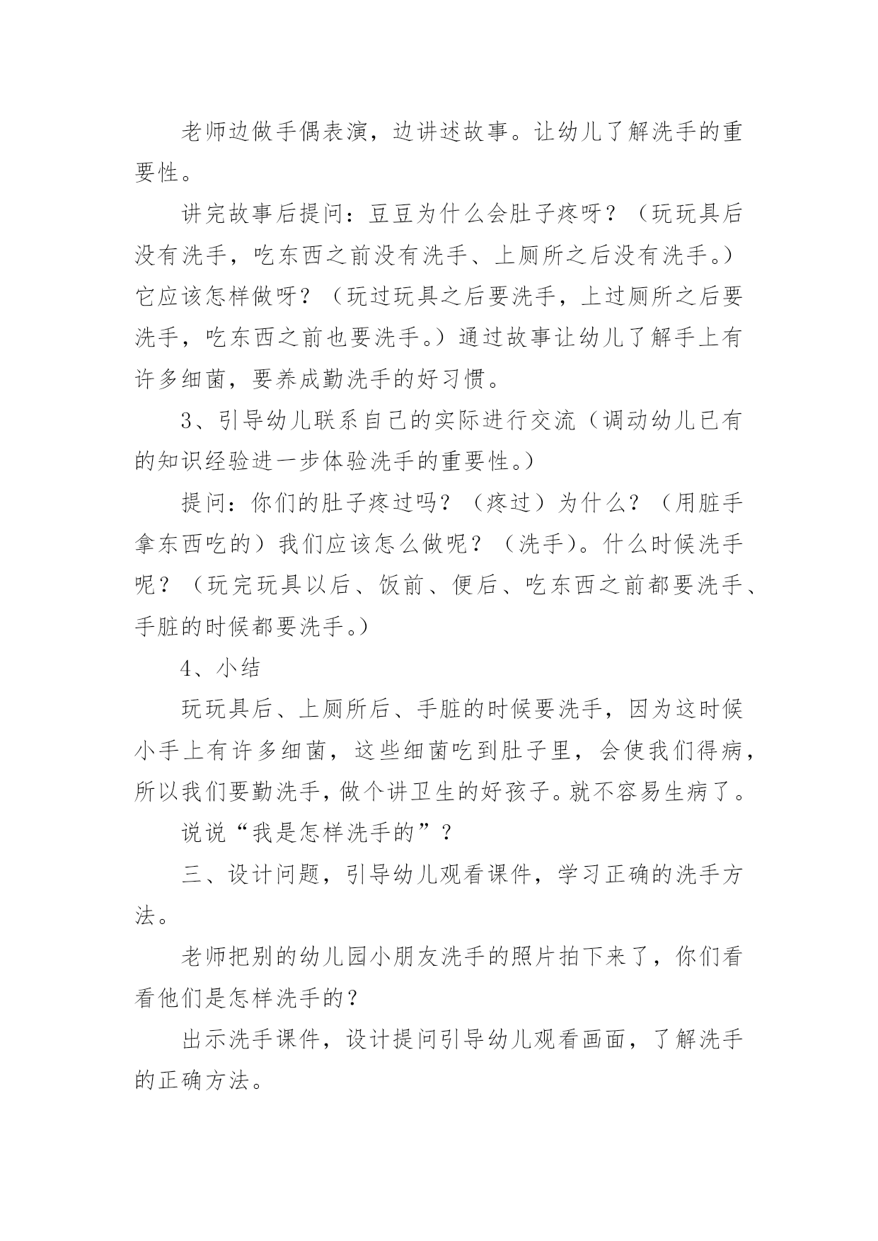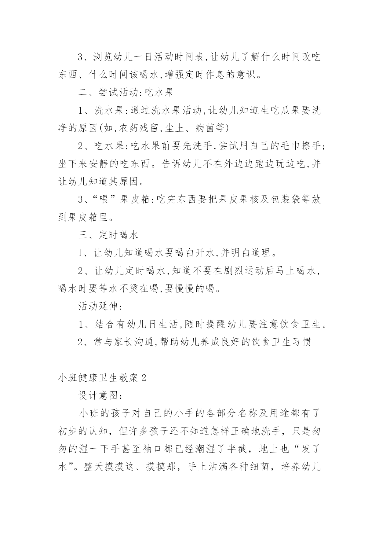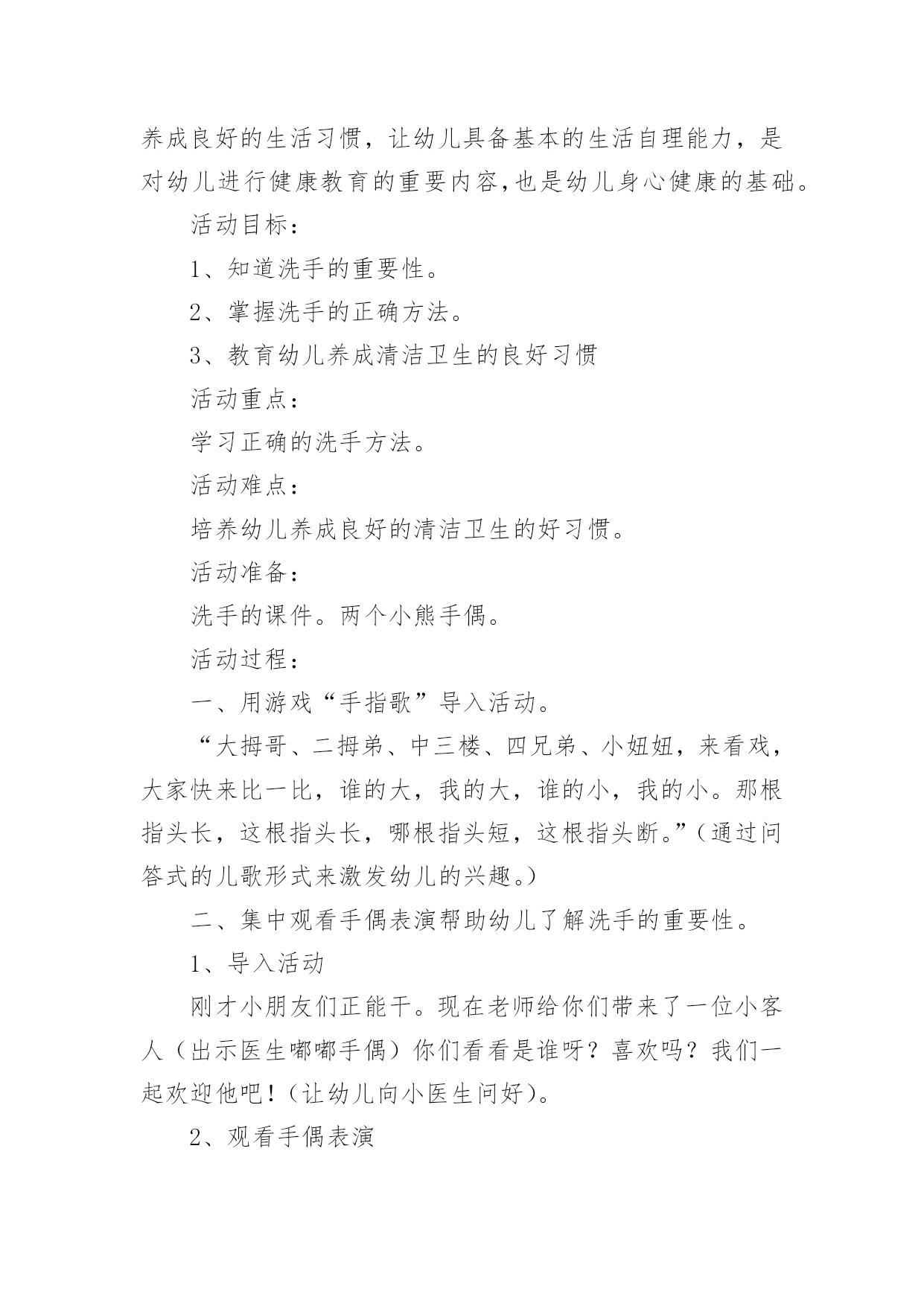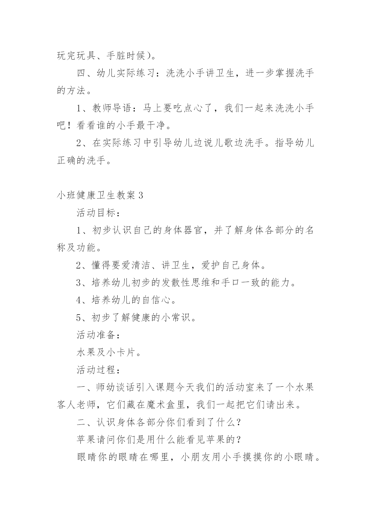 小班健康卫生教案作为一名优秀的教育工作者,时常要开展教案准备工作,借助教案可以更好地组织教学活动。那么教案应该怎么写才合适呢?下面是小编整理的小班健康卫生教案,仅供参考,希望能够帮助到大家。小班健康卫生教案1小班健康活动:饮食卫生活动目标:1、让幼儿知道吃东西前要洗手,生吃瓜果蔬菜要洗净,不吃腐烂变质的东西。2、吃东西要坐下来安静的吃,不在外边边跑边玩边吃,做到定时吃东西和水。活动准备:1、果皮箱一个,配有相应的墙饰标记图。2、幼儿一日活动时间表一张,各种水果每人一份(幼儿也可自带)。活动过程:一、游戏:开火车,带领幼儿参观活动室,认识卫生角。1、给幼儿编号,认识自己的毛巾杯子,知道自己喝水、洗手要用自己的水杯毛巾。2、认识“果皮箱”及相应的'墙饰标记图,了解果皮箱的用途。3、浏览幼儿一日活动时间表,让幼儿了解什么时间改吃东西、什么时间该喝水,增强定时作息的意识。二、尝试活动:吃水果1、洗水果:通过洗水果活动,让幼儿知道生吃瓜果要洗净的原因(如,农药残留,尘土、病菌等)2、吃水果:吃水果前要先洗手,尝试用自己的毛巾擦手;坐下来安静的吃东西。告诉幼儿不在外边边跑边玩边吃,并让幼儿知道其原因。3、“喂”果皮箱:吃完东西要把果皮果核及包装袋等放到果皮箱里。三、定时喝水1、让幼儿知道喝水要喝白开水,并明白道理。2、让幼儿定时喝水,知道不要在剧烈运动后马上喝水,喝水时要等水不烫在喝,要慢慢的喝。活动延伸:1、结合有幼儿日生活,随时提醒幼儿要注意饮食卫生。2、常与家长沟通,帮助幼儿养成良好的饮食卫生习惯小班健康卫生教案2设计意图:小班的孩子对自己的小手的各部分名称及用途都有了初步的认知,但许多孩子还不知道怎样正确地洗手,只是匆匆的湿一下手甚至袖口都已经潮湿了半截,地上也“发了水”。整天摸摸这、摸摸那,手上沾满各种细菌,培养幼儿养成良好的生活习惯,让幼儿具备基本的生活自理能力,是对幼儿进行健康教育的重要内容,也是幼儿身心健康的基础。活动目标:1、知道洗手的重要性。2、掌握洗手的正确方法。3、教育幼儿养成清洁卫生的良好习惯活动重点:学习正确的洗手方法。活动难点:培养幼儿养成良好的清洁卫生的好习惯。活动准备:洗手的课件。两个小熊手偶。活动过程:一、用游戏“手指歌”导入活动。“大拇哥、二拇弟、中三楼、四兄弟、小妞妞,来看戏,大家快来比一比,谁的大,我的大,谁的小,我的小。那根指头长,这根指头长,哪根指头短,这根指头断。”(通过问答式的儿歌形式来激发幼儿的兴趣。)二、集中观看手偶表演帮助幼儿了解洗手的重要性。1、导入活动刚才小朋友们正能干。现在老师给你们带来了一位小客人(出示医生嘟嘟手偶)你们看看是谁呀?喜欢吗?我们一起欢迎他吧!(让幼儿向小医生问好)。2、观看手偶表演老师边做手偶表演,边讲述故事。让幼儿了解洗手的重要性。讲完故事后提问:豆豆为什么会肚子疼呀?(玩玩具后没有洗手,吃东西之前没有洗手、上厕所之后没有洗手。)它应该怎样做呀?(玩过玩具之后要洗手,上过厕所之后要洗手,吃东西之前也要洗手。)通过故事让幼儿了解手上有许多细菌,要养成勤洗手的好习惯。3、引导幼儿联系自己的实际进行交流(调动幼儿已有的知识经验进一步体验洗手的重要性。)提问:你们的肚子疼过吗?(疼过)为什么?(用脏手拿东西吃的)我们应该怎么做呢?(洗手)。什么时候洗手呢?(玩完玩具以后、饭前、便后、吃东西之前都要洗手、手脏的时候都要洗手。)4、小结玩玩具后、上厕所后、手脏的时候要洗手,因为这时候小手上有许多细菌,这些细菌吃到肚子里,会使我们得病,所以我们要勤洗手,做个讲卫生的好孩子。就不容易生病了。说说“我是怎样洗手的”?三、设计问题,引导幼儿观看课件,学习正确的洗手方法。老师把别的幼儿园小朋友洗手的照片拍下来了,你们看看他们是怎样洗手的?出示洗手课件,设计提问引导幼儿观看画面,了解洗手的正确方法。出示PPT1。提问:画面上的小朋友在干什么?为什么要把袖子卷起来?我们也一起来学一学吧!(引导幼儿理解画面内容,并启发幼儿哟暖和语言表达)出示PPT2:引导幼儿观察后提问:图上的`小朋友在干什么?出示PPT3:图上上的小朋友在干什么?(打肥皂、抹洗手液)出示课PPT4:图上的小朋友在干什么?(搓手)搓手的时候水龙头是关着的?还是开着的?为什么?出示PPT5:图上的小朋友在干什么?(冲手)冲完手之后还要甩甩手。出示PPT6:图片上的小朋友在干什么?(用毛巾擦手)用谁的毛巾擦手?为什么?(3)老师和幼儿共同讲述正确的洗手顺序及方法、卷袖子——冲手——搓肥皂——搓手心搓手背——冲肥皂——甩手——用毛巾擦手。(根据画面边做动作边讲解)(4)引导幼儿边说儿歌边做模仿动作。(进一步学习正确的洗手顺序及方法。我有一双小小手,快来快来洗洗手,洗手前,快卷袖,不让水滴沾衣袖。打开水龙头,冲冲小小手,关