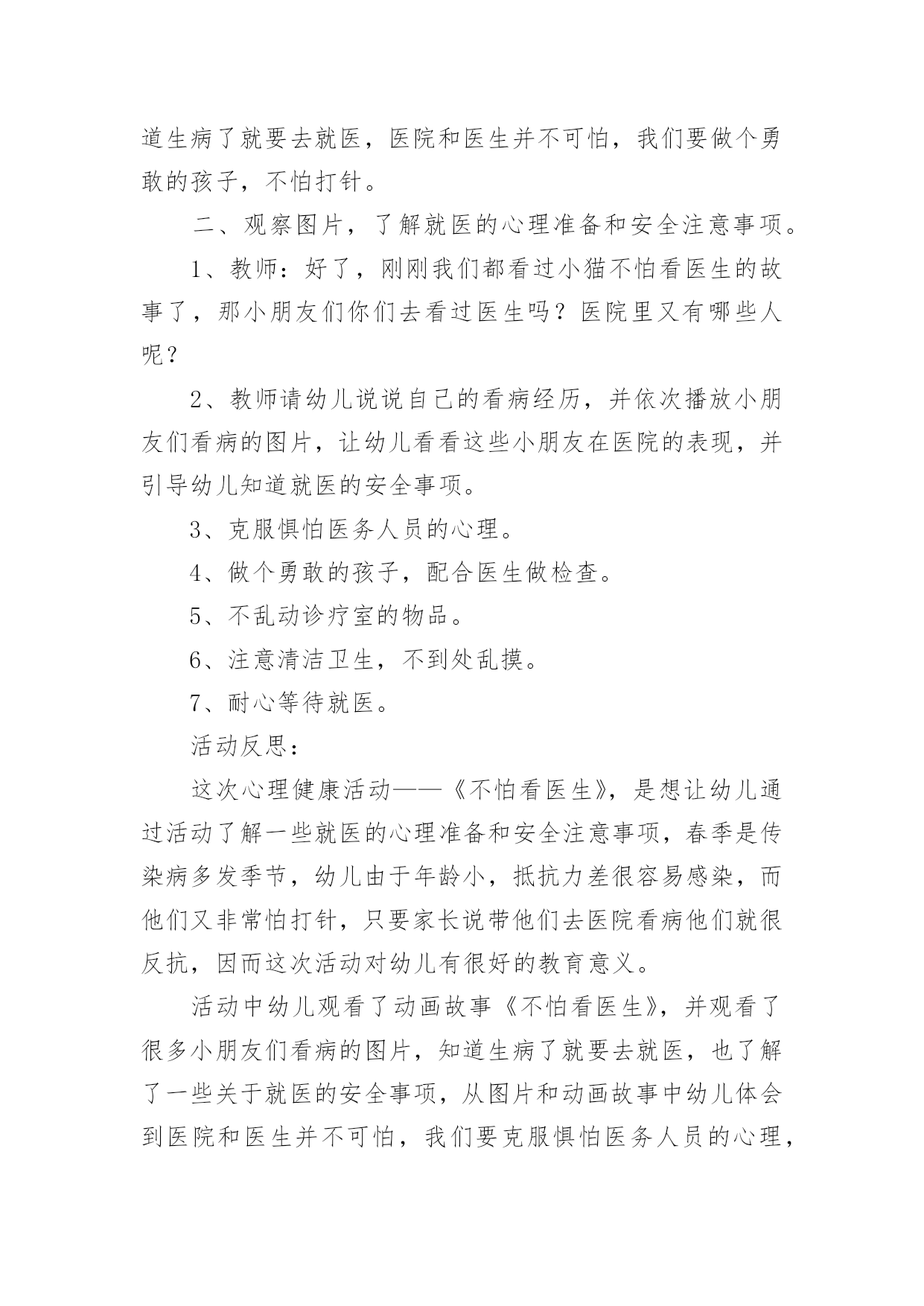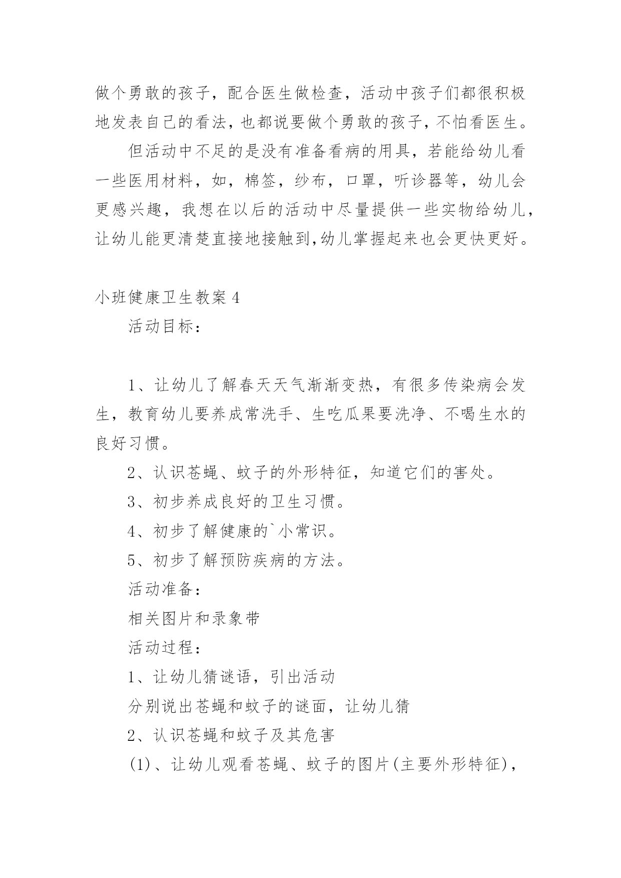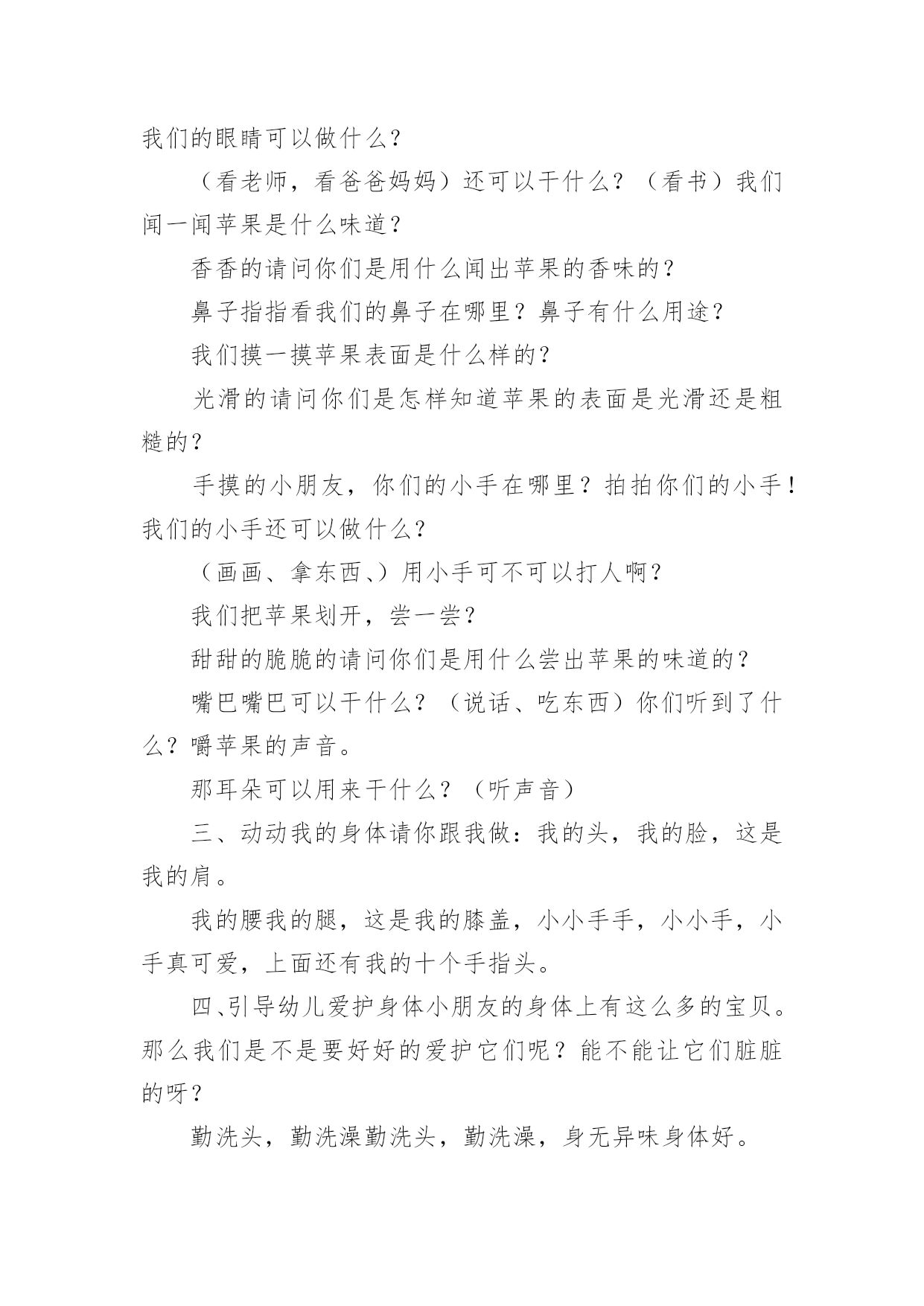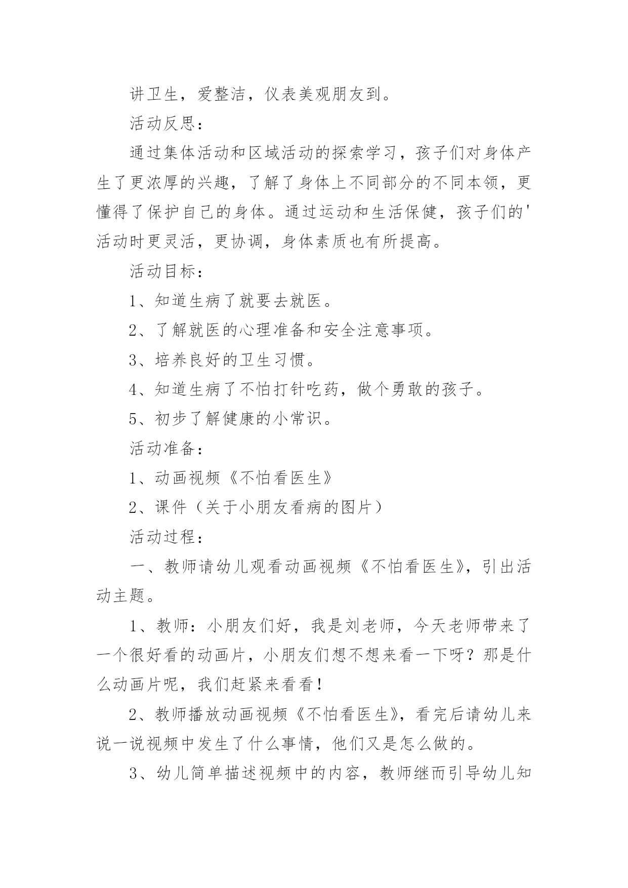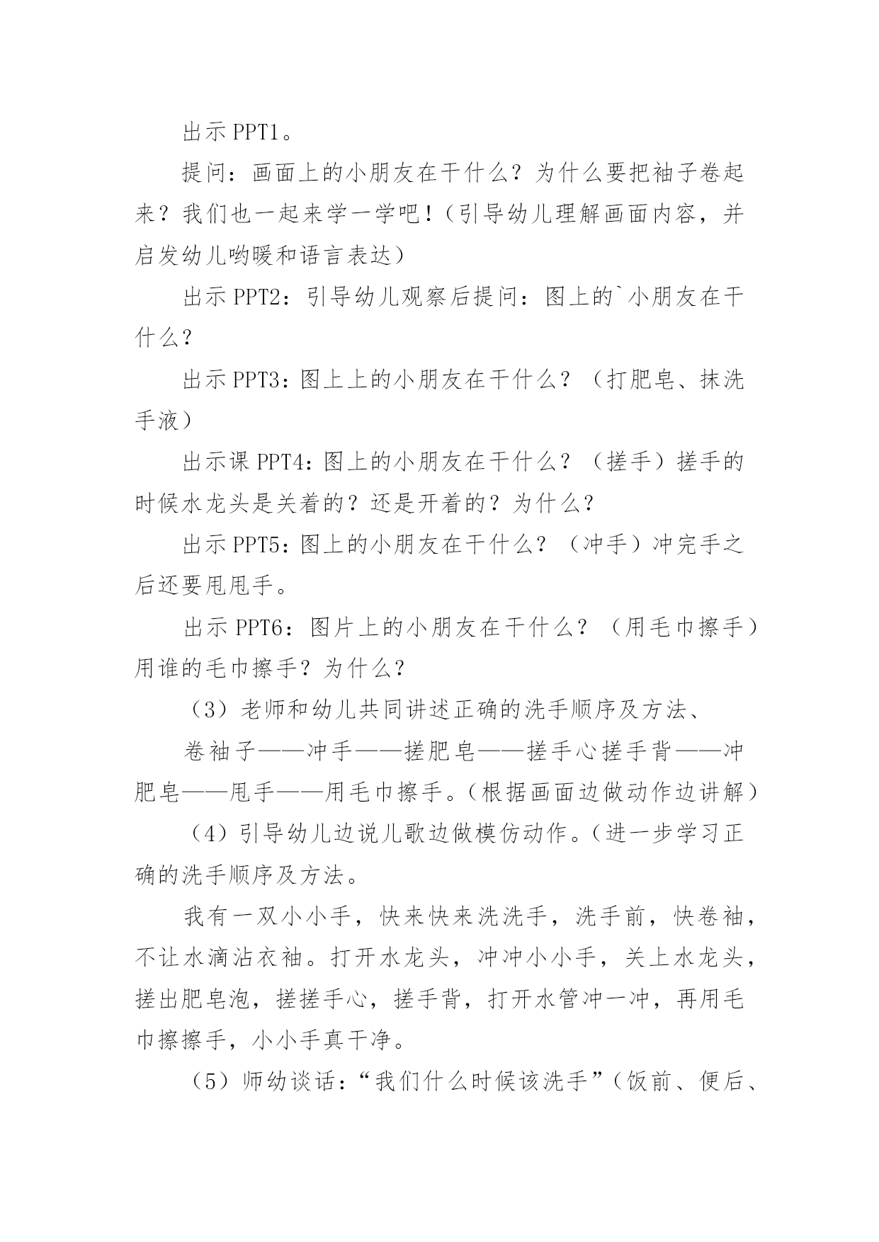 小班健康卫生教案作为一名优秀的教育工作者,时常要开展教案准备工作,借助教案可以更好地组织教学活动。那么教案应该怎么写才合适呢?下面是小编整理的小班健康卫生教案,仅供参考,希望能够帮助到大家。小班健康卫生教案1小班健康活动:饮食卫生活动目标:1、让幼儿知道吃东西前要洗手,生吃瓜果蔬菜要洗净,不吃腐烂变质的东西。2、吃东西要坐下来安静的吃,不在外边边跑边玩边吃,做到定时吃东西和水。活动准备:1、果皮箱一个,配有相应的墙饰标记图。2、幼儿一日活动时间表一张,各种水果每人一份(幼儿也可自带)。活动过程:一、游戏:开火车,带领幼儿参观活动室,认识卫生角。1、给幼儿编号,认识自己的毛巾杯子,知道自己喝水、洗手要用自己的水杯毛巾。2、认识“果皮箱”及相应的'墙饰标记图,了解果皮箱的用途。3、浏览幼儿一日活动时间表,让幼儿了解什么时间改吃东西、什么时间该喝水,增强定时作息的意识。二、尝试活动:吃水果1、洗水果:通过洗水果活动,让幼儿知道生吃瓜果要洗净的原因(如,农药残留,尘土、病菌等)2、吃水果:吃水果前要先洗手,尝试用自己的毛巾擦手;坐下来安静的吃东西。告诉幼儿不在外边边跑边玩边吃,并让幼儿知道其原因。3、“喂”果皮箱:吃完东西要把果皮果核及包装袋等放到果皮箱里。三、定时喝水1、让幼儿知道喝水要喝白开水,并明白道理。2、让幼儿定时喝水,知道不要在剧烈运动后马上喝水,喝水时要等水不烫在喝,要慢慢的喝。活动延伸:1、结合有幼儿日生活,随时提醒幼儿要注意饮食卫生。2、常与家长沟通,帮助幼儿养成良好的饮食卫生习惯小班健康卫生教案2设计意图:小班的孩子对自己的小手的各部分名称及用途都有了初步的认知,但许多孩子还不知道怎样正确地洗手,只是匆匆的湿一下手甚至袖口都已经潮湿了半截,地上也“发了水”。整天摸摸这、摸摸那,手上沾满各种细菌,培养幼儿养成良好的生活习惯,让幼儿具备基本的生活自理能力,是对幼儿进行健康教育的重要内容,也是幼儿身心健康的基础。活动目标:1、知道洗手的重要性。2、掌握洗手的正确方法。3、教育幼儿养成清洁卫生的良好习惯活动重点:学习正确的洗手方法。活动难点:培养幼儿养成良好的清洁卫生的好习惯。活动准备:洗手的课件。两个小熊手偶。活动过程:一、用游戏“手指歌”导入活动。“大拇哥、二拇弟、中三楼、四兄弟、小妞妞,来看戏,大家快来比一比,谁的大,我的大,谁的小,我的小。那根指头长,这根指头长,哪根指头短,这根指头断。”(通过问答式的儿歌形式来激发幼儿的兴趣。)二、集中观看手偶表演帮助幼儿了解洗手的重要性。1、导入活动刚才小朋友们正能干。现在老师给你们带来了一位小客人(出示医生嘟嘟手偶)你们看看是谁呀?喜欢吗?我们一起欢迎他吧!(让幼儿向小医生问好)。2、观看手偶表演老师边做手偶表演,边讲述故事。让幼儿了解洗手的重要性。讲完故事后提问:豆豆为什么会肚子疼呀?(玩玩具后没有洗手,吃东西之前没有洗手、上厕所之后没有洗手。)它应该怎样做呀?(玩过玩具之后要洗手,上过厕所之后要洗手,吃东西之前也要洗手。)通过故事让幼儿了解手上有许多细菌,要养成勤洗手的好习惯。3、引导幼儿联系自己的实际进行交流(调动幼儿已有的知识经验进一步体验洗手的重要性。)提问:你们的肚子疼过吗?(疼过)为什么?(用脏手拿东西吃的)我们应该怎么做呢?(洗手)。什么时候洗手呢?(玩完玩具以后、饭前、便后、吃东西之前都要洗手、手脏的时候都要洗手。)4、小结玩玩具后、上厕所后、手脏的时候要洗手,因为这时候小手上有许多细菌,这些细菌吃到肚子里,会使我们得病,所以我们要勤洗手,做个讲卫生的好孩子。就不容易生病了。说说“我是怎样洗手的”?三、设计问题,引导幼儿观看课件,学习正确的洗手方法。老师把别的幼儿园小朋友洗手的照片拍下来了,你们看看他们是怎样洗手的?出示洗手课件,设计提问引导幼儿观看画面,了解洗手的正确方法。出示PPT1。提问:画面上的小朋友在干什么?为什么要把袖子卷起来?我们也一起来学一学吧!(引导幼儿理解画面内容,并启发幼儿哟暖和语言表达)出示PPT2:引导幼儿观察后提问:图上的`小朋友在干什么?出示PPT3:图上上的小朋友在干什么?(打肥皂、抹洗手液)出示课PPT4:图上的小朋友在干什么?(搓手)搓手的时候水龙头是关着的?还是开着的?为什么?出示PPT5:图上的小朋友在干什么?(冲手)冲完手之后还要甩甩手。出示PPT6:图片上的小朋友在干什么?(用毛巾擦手)用谁的毛巾擦手?为什么?(3)老师和幼儿共同讲述正确的洗手顺序及方法、卷袖子——冲手——搓肥皂——搓手心搓手背——冲肥皂——甩手——用毛巾擦手。(根据画面边做动作边讲解)(4)引导幼儿边说儿歌边做模仿动作。(进一步学习正确的洗手顺序及方法。我有一双小小手,快来快来洗洗手,洗手前,快卷袖,不让水滴沾衣袖。打开水龙头,冲冲小小手,关