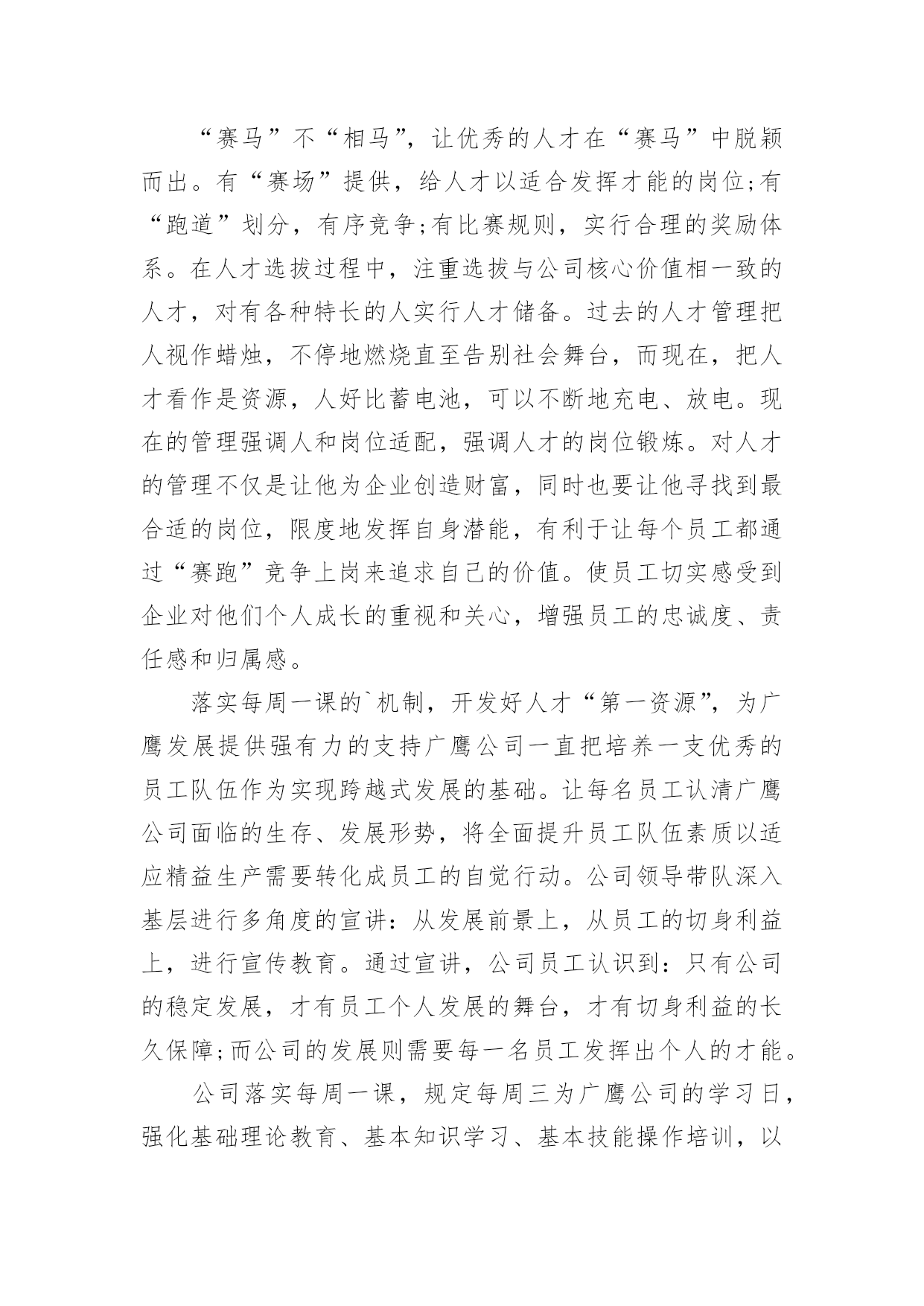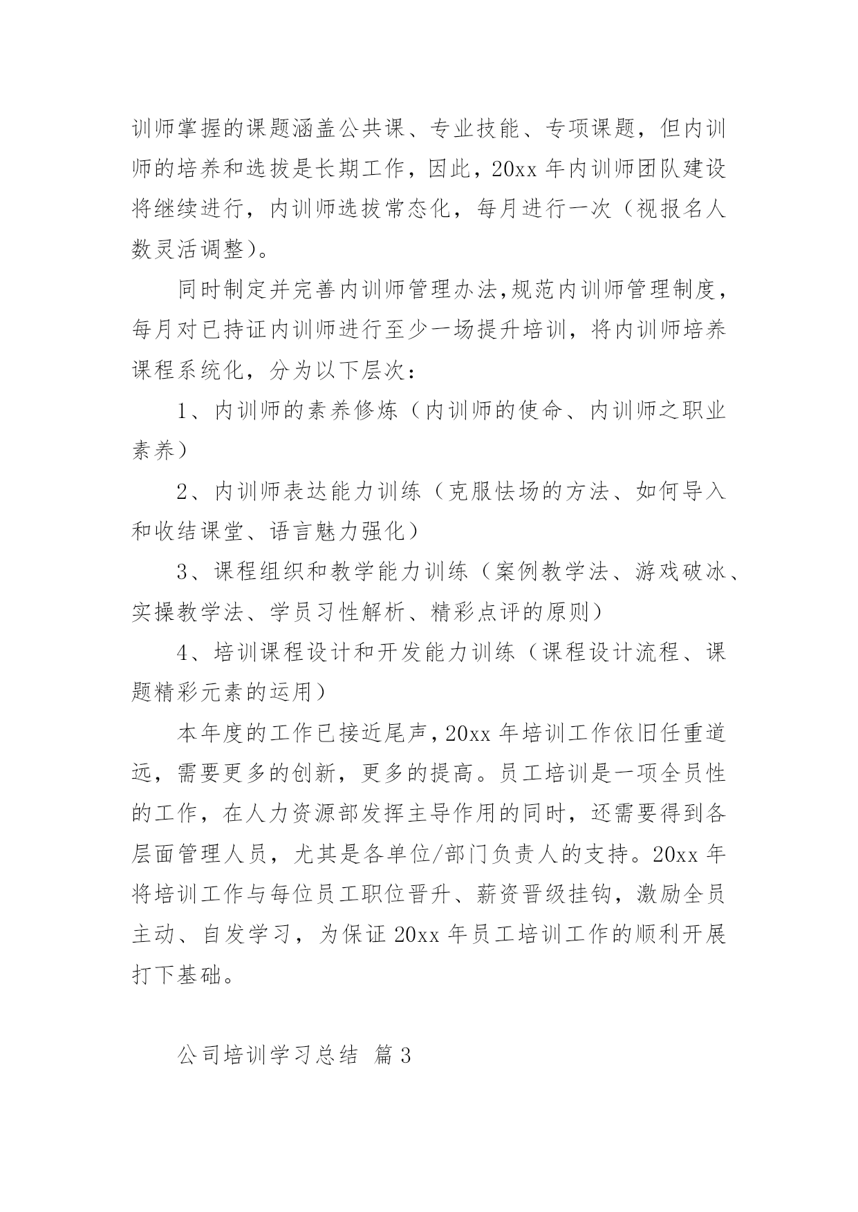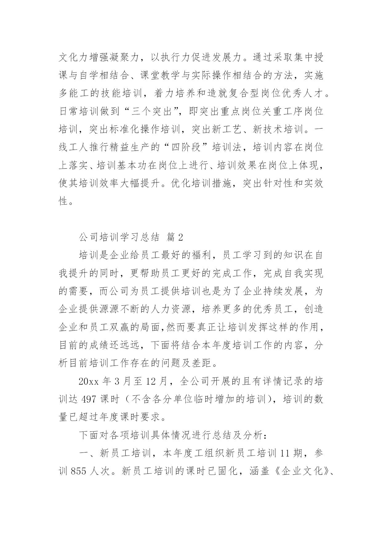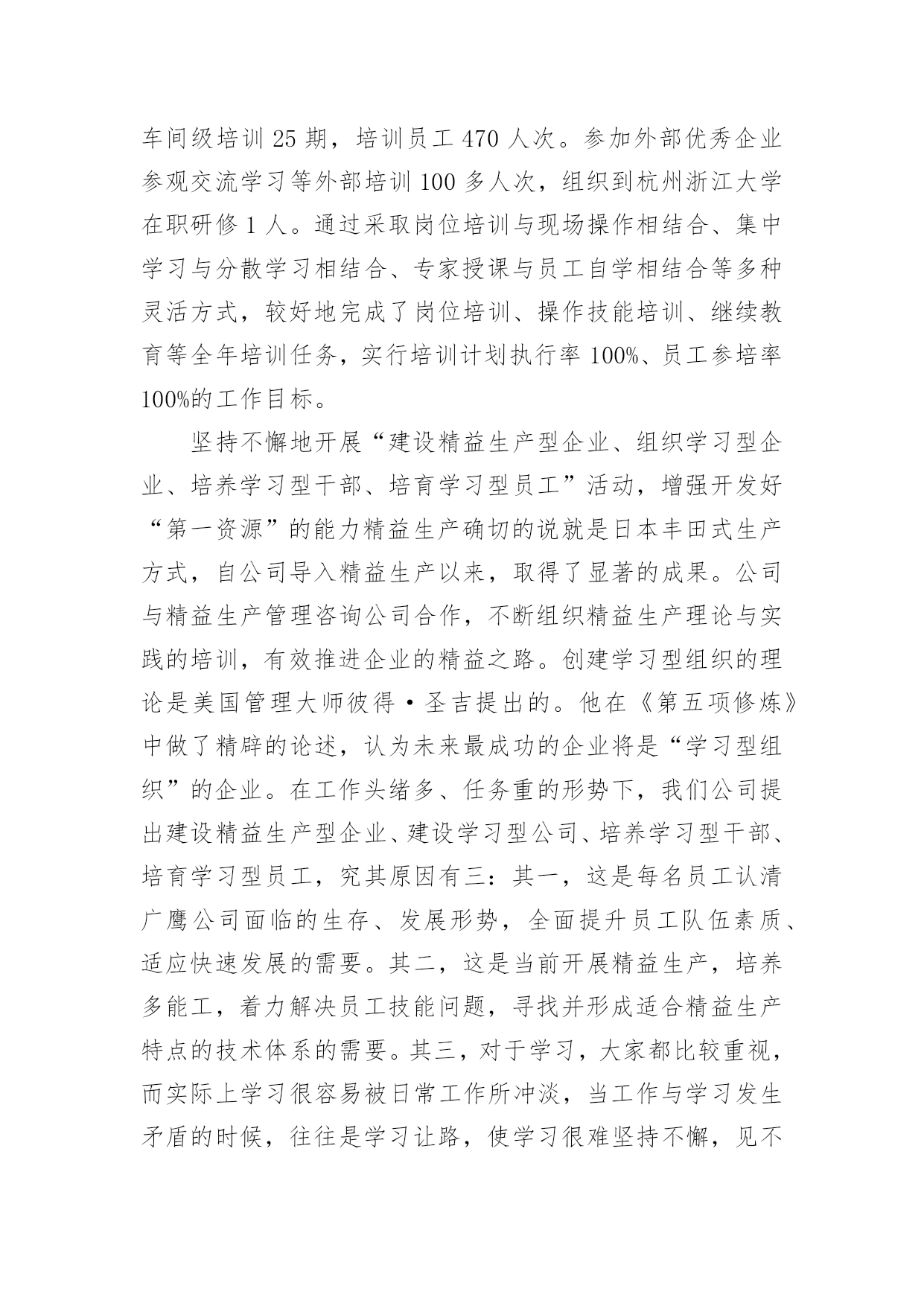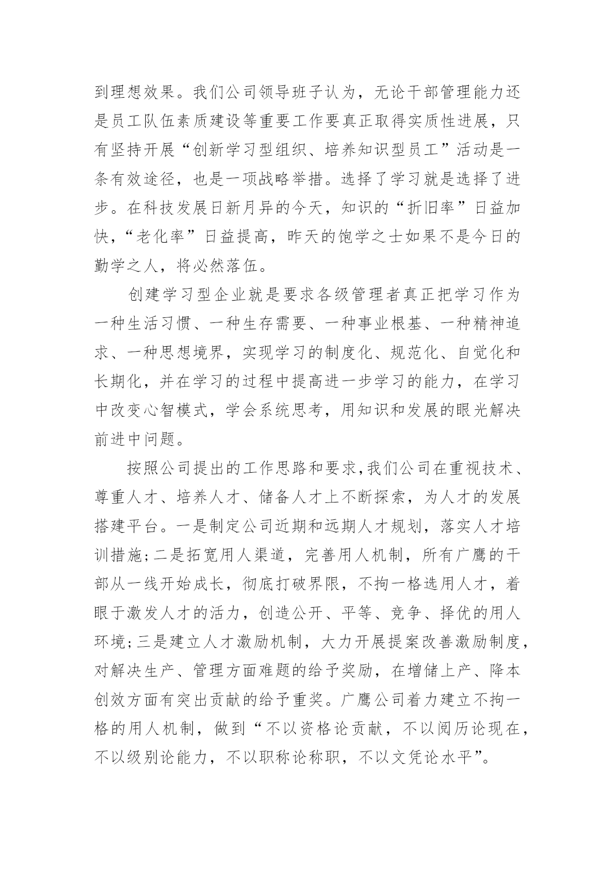 公司培训学习总结公司培训学习总结(通用13篇)一段难忘的学习生活结束了,我们在不断的学习中,获得了更多的进步,让我们一起来写学习总结吧。千万不能认为学习总结随便应付就可以,以下是小编收集整理的公司培训学习总结,欢迎大家分享。公司培训学习总结篇1浙江广鹰机械有限公司自xx年年导入精益生产以来,坚持贯彻落实建设精益生产型企业、组织学习型企业、培养学习型干部、培育学习型员工的精神,牢固树立“培训是公司的长效投入,是发展的后劲,是员工的福利”的理念,紧紧围绕公司培训目标,贯彻落实每周一课的培训机制;加强基础理论教育、基本知识学习、基本技能操作培训;提高员工技术业务素质和干部管理水平开展工作,做到一般人员普遍培训、骨干人员重点培训、紧缺人员抓紧培训、优秀人员奖励培训,进一步提高了一线操作员工队伍的整体素质,为公司适应快速发展做好人才、技术储备,提供了人才保证和支持。公司现有员工900多人,其中管理人员50多人,专业技术人员70多人。下设两个事业部,11个管理部门。今年按照《xxxx机械有限公司20xx年员工培训工作计划》的要求,公司举办各种培训班21期,培训相关人员320人次。车间级培训25期,培训员工470人次。参加外部优秀企业参观交流学习等外部培训100多人次,组织到杭州浙江大学在职研修1人。通过采取岗位培训与现场操作相结合、集中学习与分散学习相结合、专家授课与员工自学相结合等多种灵活方式,较好地完成了岗位培训、操作技能培训、继续教育等全年培训任务,实行培训计划执行率100%、员工参培率100%的工作目标。坚持不懈地开展“建设精益生产型企业、组织学习型企业、培养学习型干部、培育学习型员工”活动,增强开发好“第一资源”的能力精益生产确切的说就是日本丰田式生产方式,自公司导入精益生产以来,取得了显著的成果。公司与精益生产管理咨询公司合作,不断组织精益生产理论与实践的培训,有效推进企业的精益之路。创建学习型组织的理论是美国管理大师彼得·圣吉提出的。他在《第五项修炼》中做了精辟的论述,认为未来最成功的企业将是“学习型组织”的企业。在工作头绪多、任务重的形势下,我们公司提出建设精益生产型企业、建设学习型公司、培养学习型干部、培育学习型员工,究其原因有三:其一,这是每名员工认清广鹰公司面临的生存、发展形势,全面提升员工队伍素质、适应快速发展的需要。其二,这是当前开展精益生产,培养多能工,着力解决员工技能问题,寻找并形成适合精益生产特点的技术体系的需要。其三,对于学习,大家都比较重视,而实际上学习很容易被日常工作所冲淡,当工作与学习发生矛盾的时候,往往是学习让路,使学习很难坚持不懈,见不到理想效果。我们公司领导班子认为,无论干部管理能力还是员工队伍素质建设等重要工作要真正取得实质性进展,只有坚持开展“创新学习型组织、培养知识型员工”活动是一条有效途径,也是一项战略举措。选择了学习就是选择了进步。在科技发展日新月异的今天,知识的“折旧率”日益加快,“老化率”日益提高,昨天的饱学之士如果不是今日的勤学之人,将必然落伍。创建学习型企业就是要求各级管理者真正把学习作为一种生活习惯、一种生存需要、一种事业根基、一种精神追求、一种思想境界,实现学习的制度化、规范化、自觉化和长期化,并在学习的过程中提高进一步学习的能力,在学习中改变心智模式,学会系统思考,用知识和发展的眼光解决前进中问题。按照公司提出的工作思路和要求,我们公司在重视技术、尊重人才、培养人才、储备人才上不断探索,为人才的发展搭建平台。一是制定公司近期和远期人才规划,落实人才培训措施;二是拓宽用人渠道,完善用人机制,所有广鹰的干部从一线开始成长,彻底打破界限,不拘一格选用人才,着眼于激发人才的活力,创造公开、平等、竞争、择优的用人环境;三是建立人才激励机制,大力开展提案改善激励制度,对解决生产、管理方面难题的给予奖励,在增储上产、降本创效方面有突出贡献的给予重奖。广鹰公司着力建立不拘一格的用人机制,做到“不以资格论贡献,不以阅历论现在,不以级别论能力,不以职称论称职,不以文凭论水平”。“赛马”不“相马”,让优秀的人才在“赛马”中脱颖而出。有“赛场”提供,给人才以适合发挥才能的岗位;有“跑道”划分,有序竞争;有比赛规则,实行合理的奖励体系。在人才选拔过程中,注重选拔与公司核心价值相一致的人才,对有各种特长的人实行人才储备。过去的人才管理把人视作蜡烛,不停地燃烧直至告别社会舞台,而现在,把人才看作是资源,人好比蓄电池,可以不断地充电、放电。现在的管理强调人和岗位适配,强调人才的岗位锻炼。对人才的管理不仅是让他为企业创造财富,同时也要让他寻找到最合适的岗位,限度地发挥自身潜能,有利于让每个员工都通过“赛跑”竞争上岗来追求自己的价值。使员工切实感受到企业对他们个人成长的重视和关心,增强员工的忠诚度、责