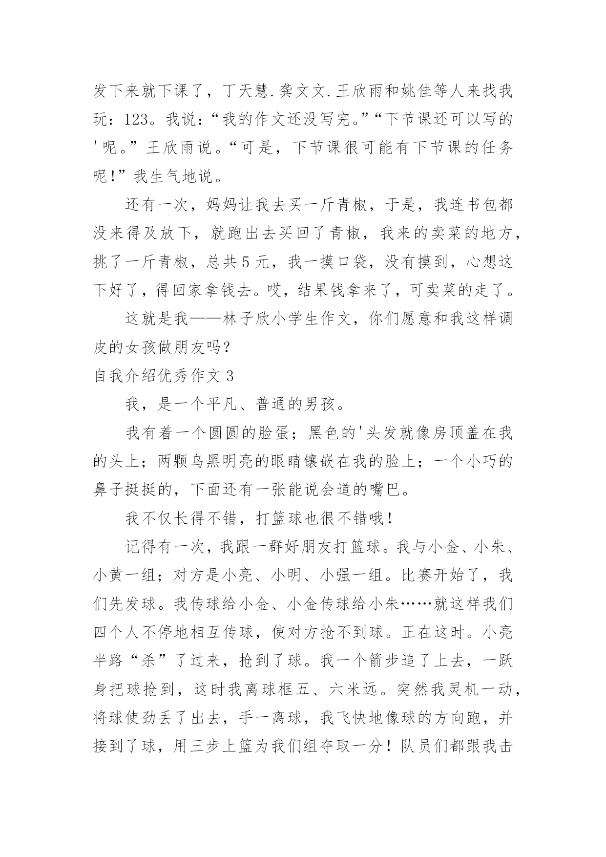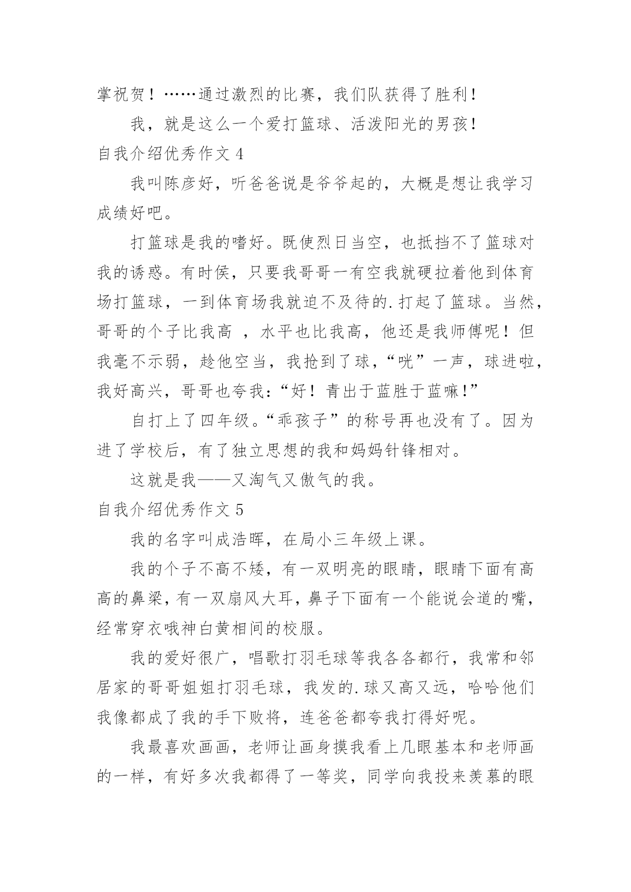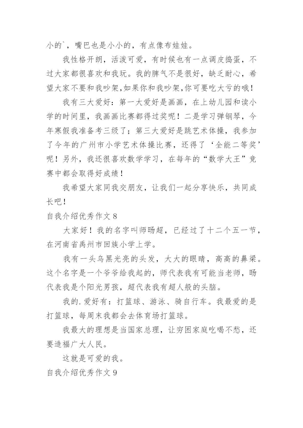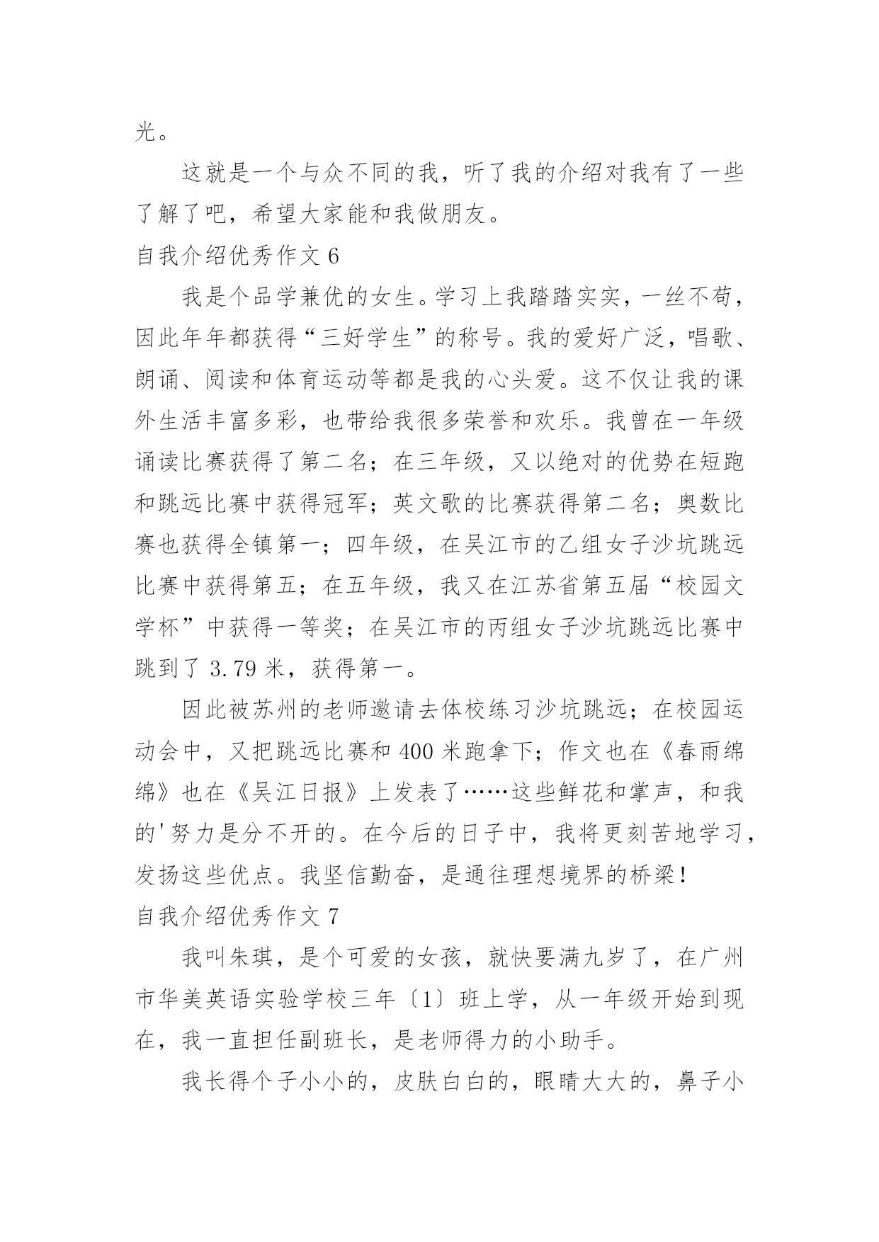 自我介绍优秀作文[优选]自我介绍优秀作文当来到一个新环境时,我们有必要对自己进行适当的介绍,自我介绍是我们重新认识自己的开始。那么自我介绍应该包括什么内容呢?下面是小编帮大家整理的自我介绍优秀作文,希望能够帮助到大家。自我介绍优秀作文1我叫汪墨,来自美丽的深圳。我是龙华中心小学一年级(5)班的`学生。我的兴趣有很多:我喜欢唱歌、跳舞、画画……我的优点是有爱心、善良、懂事,而且有一定的组织能力。可是我也有一些缺点:学习上常常粗心大意,做事拖拉,讲话不够大胆,不过我有信心会努力改掉这几个坏毛病。我的愿望是长大后想成为一名歌唱家、舞蹈家和古筝演奏家。作为一(5)班的班长,我希望我们班小朋友能够团结友爱,相互帮助,共同把我们一(5)班建设的更加美好。自我介绍优秀作文2我是一个活波.开朗的小女孩,今年9岁,上三年级。我的优点是学习好,缺点是爱打人,我很爱读书,也非常善变,在学校里,我很严肃,在家里,我很听爸爸妈妈的话。有一次,数学老师让我从第1题写到第4题,数学本刚发下来就下课了,丁天慧.龚文文.王欣雨和姚佳等人来找我玩:123。我说:“我的作文还没写完。”“下节课还可以写的'呢。”王欣雨说。“可是,下节课很可能有下节课的任务呢!”我生气地说。还有一次,妈妈让我去买一斤青椒,于是,我连书包都没来得及放下,就跑出去买回了青椒,我来的卖菜的地方,挑了一斤青椒,总共5元,我一摸口袋,没有摸到,心想这下好了,得回家拿钱去。哎,结果钱拿来了,可卖菜的走了。这就是我——林子欣小学生作文,你们愿意和我这样调皮的女孩做朋友吗?自我介绍优秀作文3我,是一个平凡、普通的男孩。我有着一个圆圆的脸蛋;黑色的'头发就像房顶盖在我的头上;两颗乌黑明亮的眼睛镶嵌在我的脸上;一个小巧的鼻子挺挺的,下面还有一张能说会道的嘴巴。我不仅长得不错,打篮球也很不错哦!记得有一次,我跟一群好朋友打篮球。我与小金、小朱、小黄一组;对方是小亮、小明、小强一组。比赛开始了,我们先发球。我传球给小金、小金传球给小朱……就这样我们四个人不停地相互传球,使对方抢不到球。正在这时。小亮半路“杀”了过来,抢到了球。我一个箭步追了上去,一跃身把球抢到,这时我离球框五、六米远。突然我灵机一动,将球使劲丢了出去,手一离球,我飞快地像球的方向跑,并接到了球,用三步上篮为我们组夺取一分!队员们都跟我击掌祝贺!……通过激烈的比赛,我们队获得了胜利!我,就是这么一个爱打篮球、活泼阳光的男孩!自我介绍优秀作文4我叫陈彦好,听爸爸说是爷爷起的,大概是想让我学习成绩好吧。打篮球是我的嗜好。既使烈日当空,也抵挡不了篮球对我的诱惑。有时侯,只要我哥哥一有空我就硬拉着他到体育场打篮球,一到体育场我就迫不及待的.打起了篮球。当然,哥哥的个子比我高,水平也比我高,他还是我师傅呢!但我毫不示弱,趁他空当,我抢到了球,“咣”一声,球进啦,我好高兴,哥哥也夸我:“好!青出于蓝胜于蓝嘛!”自打上了四年级。“乖孩子”的称号再也没有了。因为进了学校后,有了独立思想的我和妈妈针锋相对。这就是我——又淘气又傲气的我。自我介绍优秀作文5我的名字叫成浩晖,在局小三年级上课。我的个子不高不矮,有一双明亮的眼睛,眼睛下面有高高的鼻梁,有一双扇风大耳,鼻子下面有一个能说会道的嘴,经常穿衣哦神白黄相间的校服。我的爱好很广,唱歌打羽毛球等我各各都行,我常和邻居家的哥哥姐姐打羽毛球,我发的.球又高又远,哈哈他们我像都成了我的手下败将,连爸爸都夸我打得好呢。我最喜欢画画,老师让画身摸我看上几眼基本和老师画的一样,有好多次我都得了一等奖,同学向我投来羡慕的眼光。这就是一个与众不同的我,听了我的介绍对我有了一些了解了吧,希望大家能和我做朋友。自我介绍优秀作文6我是个品学兼优的女生。学习上我踏踏实实,一丝不苟,因此年年都获得“三好学生”的称号。我的爱好广泛,唱歌、朗诵、阅读和体育运动等都是我的心头爱。这不仅让我的课外生活丰富多彩,也带给我很多荣誉和欢乐。我曾在一年级诵读比赛获得了第二名;在三年级,又以绝对的优势在短跑和跳远比赛中获得冠军;英文歌的比赛获得第二名;奥数比赛也获得全镇第一;四年级,在吴江市的乙组女子沙坑跳远比赛中获得第五;在五年级,我又在江苏省第五届“校园文学杯”中获得一等奖;在吴江市的丙组女子沙坑跳远比赛中跳到了3.79米,获得第一。因此被苏州的老师邀请去体校练习沙坑跳远;在校园运动会中,又把跳远比赛和400米跑拿下;作文也在《春雨绵绵》也在《吴江日报》上发表了……这些鲜花和掌声,和我的'努力是分不开的。在今后的日子中,我将更刻苦地学习,发扬这些优点。我坚信勤奋,是通往理想境界的桥梁!自我介绍优秀作文7我叫朱琪,是个可爱的女孩,就快要满九岁了,在广州市华美英语实验学校三年〔1〕班上学,从一年级开始到现在,我一直担任副班长,是老师得力的小助手。我长