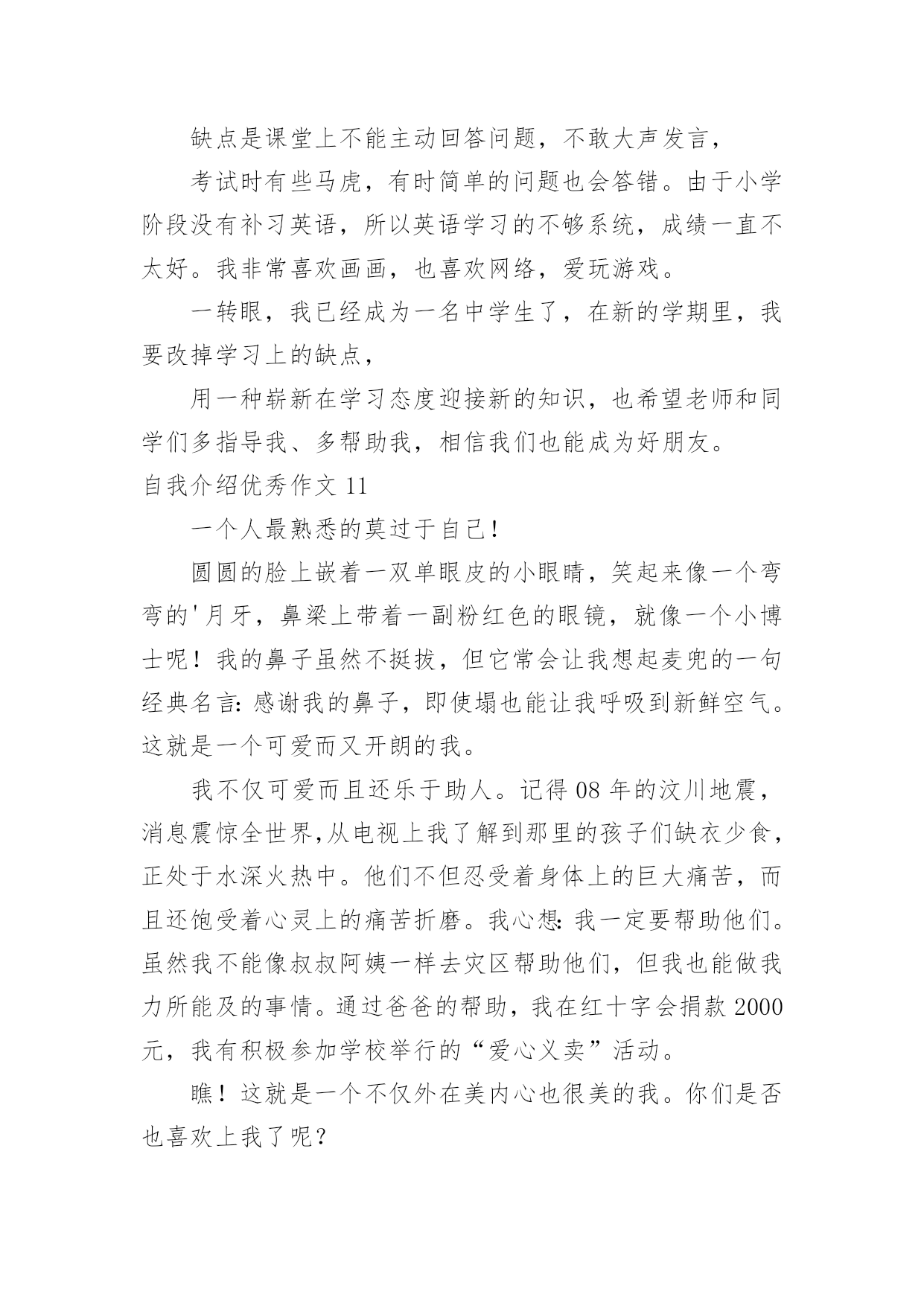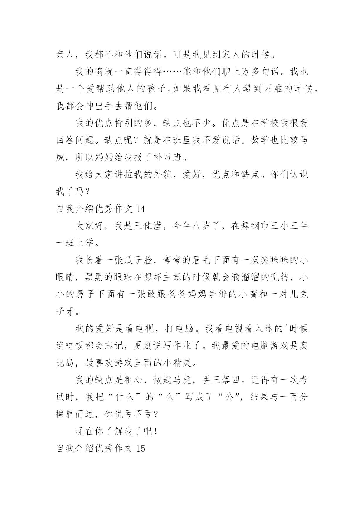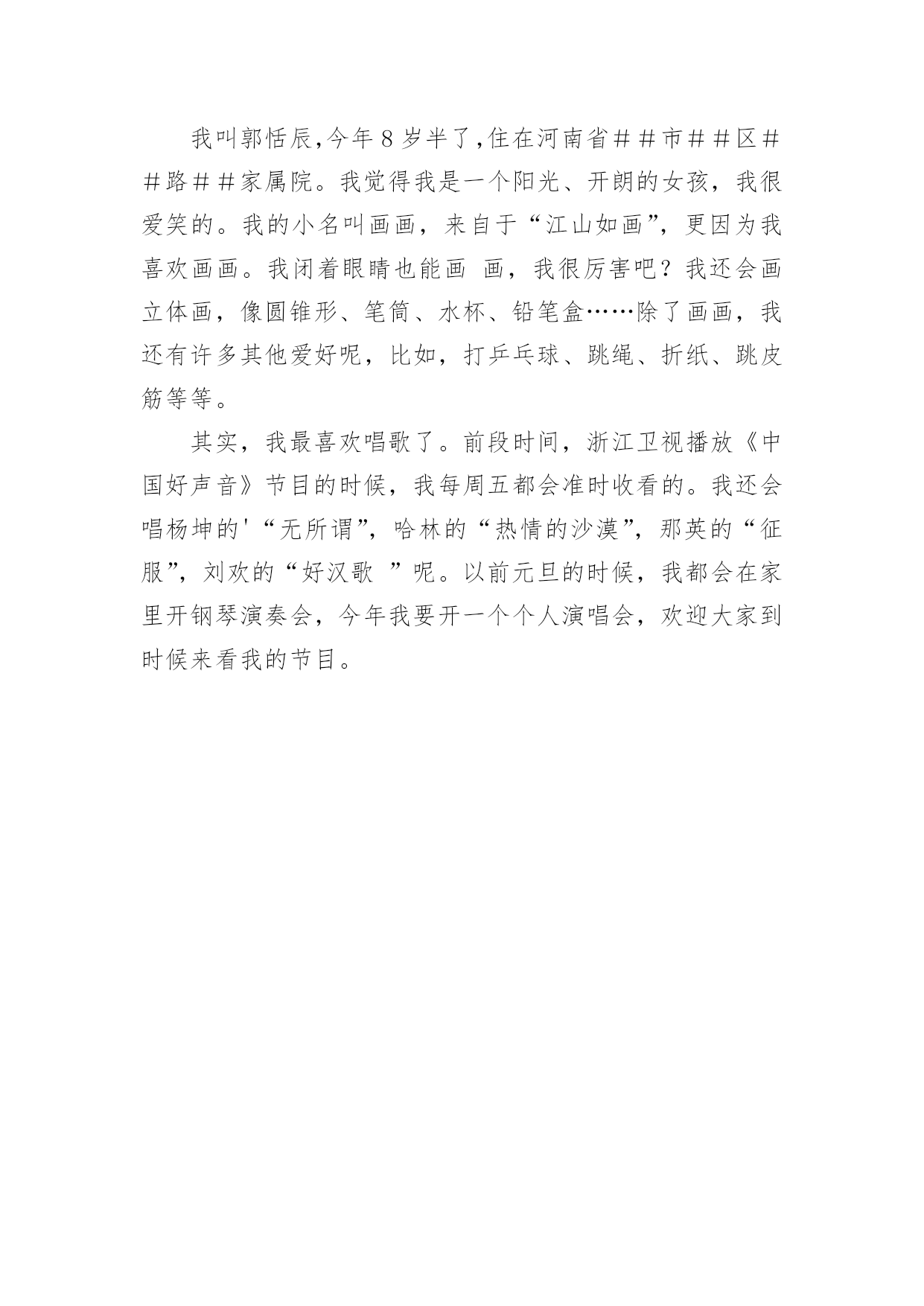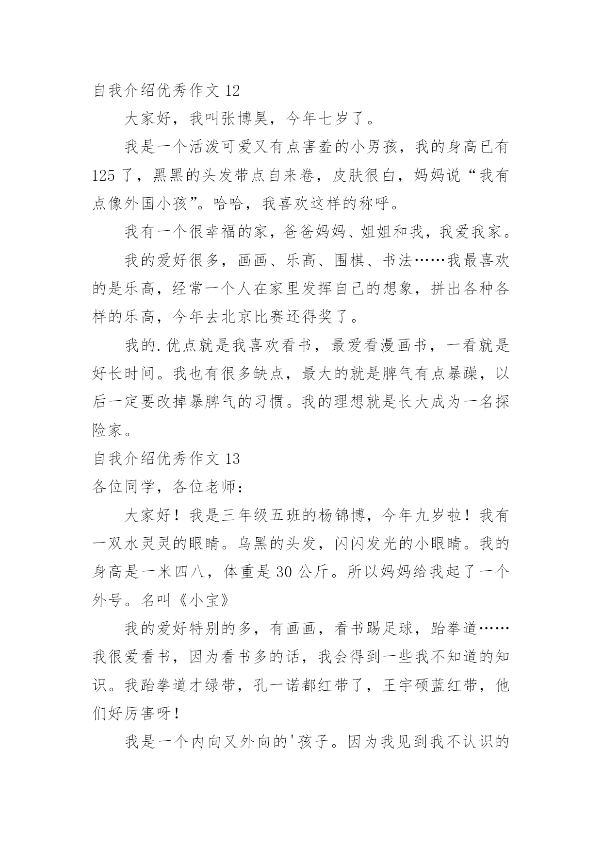 自我介绍优秀作文[优选]自我介绍优秀作文当来到一个新环境时,我们有必要对自己进行适当的介绍,自我介绍是我们重新认识自己的开始。那么自我介绍应该包括什么内容呢?下面是小编帮大家整理的自我介绍优秀作文,希望能够帮助到大家。自我介绍优秀作文1我叫汪墨,来自美丽的深圳。我是龙华中心小学一年级(5)班的`学生。我的兴趣有很多:我喜欢唱歌、跳舞、画画……我的优点是有爱心、善良、懂事,而且有一定的组织能力。可是我也有一些缺点:学习上常常粗心大意,做事拖拉,讲话不够大胆,不过我有信心会努力改掉这几个坏毛病。我的愿望是长大后想成为一名歌唱家、舞蹈家和古筝演奏家。作为一(5)班的班长,我希望我们班小朋友能够团结友爱,相互帮助,共同把我们一(5)班建设的更加美好。自我介绍优秀作文2我是一个活波.开朗的小女孩,今年9岁,上三年级。我的优点是学习好,缺点是爱打人,我很爱读书,也非常善变,在学校里,我很严肃,在家里,我很听爸爸妈妈的话。有一次,数学老师让我从第1题写到第4题,数学本刚发下来就下课了,丁天慧.龚文文.王欣雨和姚佳等人来找我玩:123。我说:“我的作文还没写完。”“下节课还可以写的'呢。”王欣雨说。“可是,下节课很可能有下节课的任务呢!”我生气地说。还有一次,妈妈让我去买一斤青椒,于是,我连书包都没来得及放下,就跑出去买回了青椒,我来的卖菜的地方,挑了一斤青椒,总共5元,我一摸口袋,没有摸到,心想这下好了,得回家拿钱去。哎,结果钱拿来了,可卖菜的走了。这就是我——林子欣小学生作文,你们愿意和我这样调皮的女孩做朋友吗?自我介绍优秀作文3我,是一个平凡、普通的男孩。我有着一个圆圆的脸蛋;黑色的'头发就像房顶盖在我的头上;两颗乌黑明亮的眼睛镶嵌在我的脸上;一个小巧的鼻子挺挺的,下面还有一张能说会道的嘴巴。我不仅长得不错,打篮球也很不错哦!记得有一次,我跟一群好朋友打篮球。我与小金、小朱、小黄一组;对方是小亮、小明、小强一组。比赛开始了,我们先发球。我传球给小金、小金传球给小朱……就这样我们四个人不停地相互传球,使对方抢不到球。正在这时。小亮半路“杀”了过来,抢到了球。我一个箭步追了上去,一跃身把球抢到,这时我离球框五、六米远。突然我灵机一动,将球使劲丢了出去,手一离球,我飞快地像球的方向跑,并接到了球,用三步上篮为我们组夺取一分!队员们都跟我击掌祝贺!……通过激烈的比赛,我们队获得了胜利!我,就是这么一个爱打篮球、活泼阳光的男孩!自我介绍优秀作文4我叫陈彦好,听爸爸说是爷爷起的,大概是想让我学习成绩好吧。打篮球是我的嗜好。既使烈日当空,也抵挡不了篮球对我的诱惑。有时侯,只要我哥哥一有空我就硬拉着他到体育场打篮球,一到体育场我就迫不及待的.打起了篮球。当然,哥哥的个子比我高,水平也比我高,他还是我师傅呢!但我毫不示弱,趁他空当,我抢到了球,“咣”一声,球进啦,我好高兴,哥哥也夸我:“好!青出于蓝胜于蓝嘛!”自打上了四年级。“乖孩子”的称号再也没有了。因为进了学校后,有了独立思想的我和妈妈针锋相对。这就是我——又淘气又傲气的我。自我介绍优秀作文5我的名字叫成浩晖,在局小三年级上课。我的个子不高不矮,有一双明亮的眼睛,眼睛下面有高高的鼻梁,有一双扇风大耳,鼻子下面有一个能说会道的嘴,经常穿衣哦神白黄相间的校服。我的爱好很广,唱歌打羽毛球等我各各都行,我常和邻居家的哥哥姐姐打羽毛球,我发的.球又高又远,哈哈他们我像都成了我的手下败将,连爸爸都夸我打得好呢。我最喜欢画画,老师让画身摸我看上几眼基本和老师画的一样,有好多次我都得了一等奖,同学向我投来羡慕的眼光。这就是一个与众不同的我,听了我的介绍对我有了一些了解了吧,希望大家能和我做朋友。自我介绍优秀作文6我是个品学兼优的女生。学习上我踏踏实实,一丝不苟,因此年年都获得“三好学生”的称号。我的爱好广泛,唱歌、朗诵、阅读和体育运动等都是我的心头爱。这不仅让我的课外生活丰富多彩,也带给我很多荣誉和欢乐。我曾在一年级诵读比赛获得了第二名;在三年级,又以绝对的优势在短跑和跳远比赛中获得冠军;英文歌的比赛获得第二名;奥数比赛也获得全镇第一;四年级,在吴江市的乙组女子沙坑跳远比赛中获得第五;在五年级,我又在江苏省第五届“校园文学杯”中获得一等奖;在吴江市的丙组女子沙坑跳远比赛中跳到了3.79米,获得第一。因此被苏州的老师邀请去体校练习沙坑跳远;在校园运动会中,又把跳远比赛和400米跑拿下;作文也在《春雨绵绵》也在《吴江日报》上发表了……这些鲜花和掌声,和我的'努力是分不开的。在今后的日子中,我将更刻苦地学习,发扬这些优点。我坚信勤奋,是通往理想境界的桥梁!自我介绍优秀作文7我叫朱琪,是个可爱的女孩,就快要满九岁了,在广州市华美英语实验学校三年〔1〕班上学,从一年级开始到现在,我一直担任副班长,是老师得力的小助手。我长