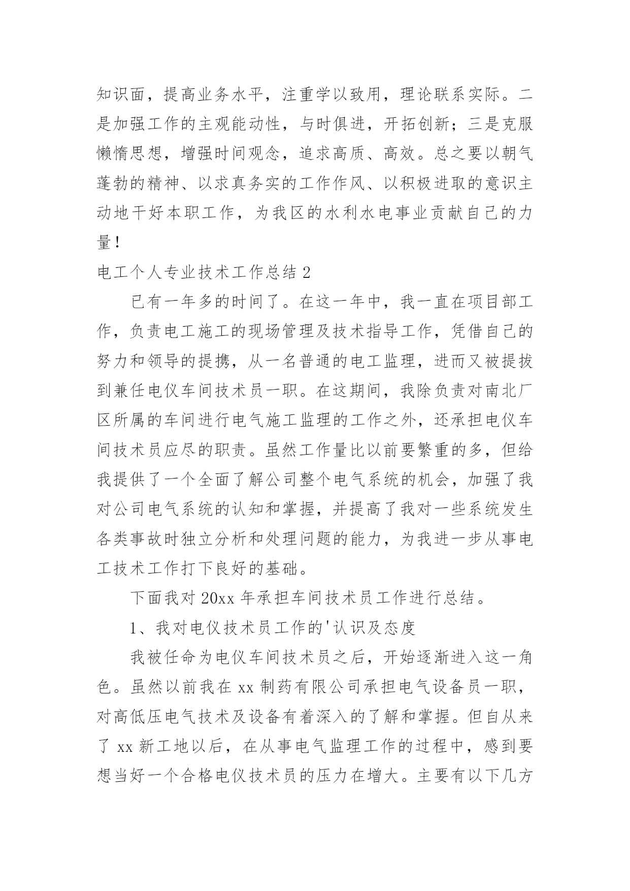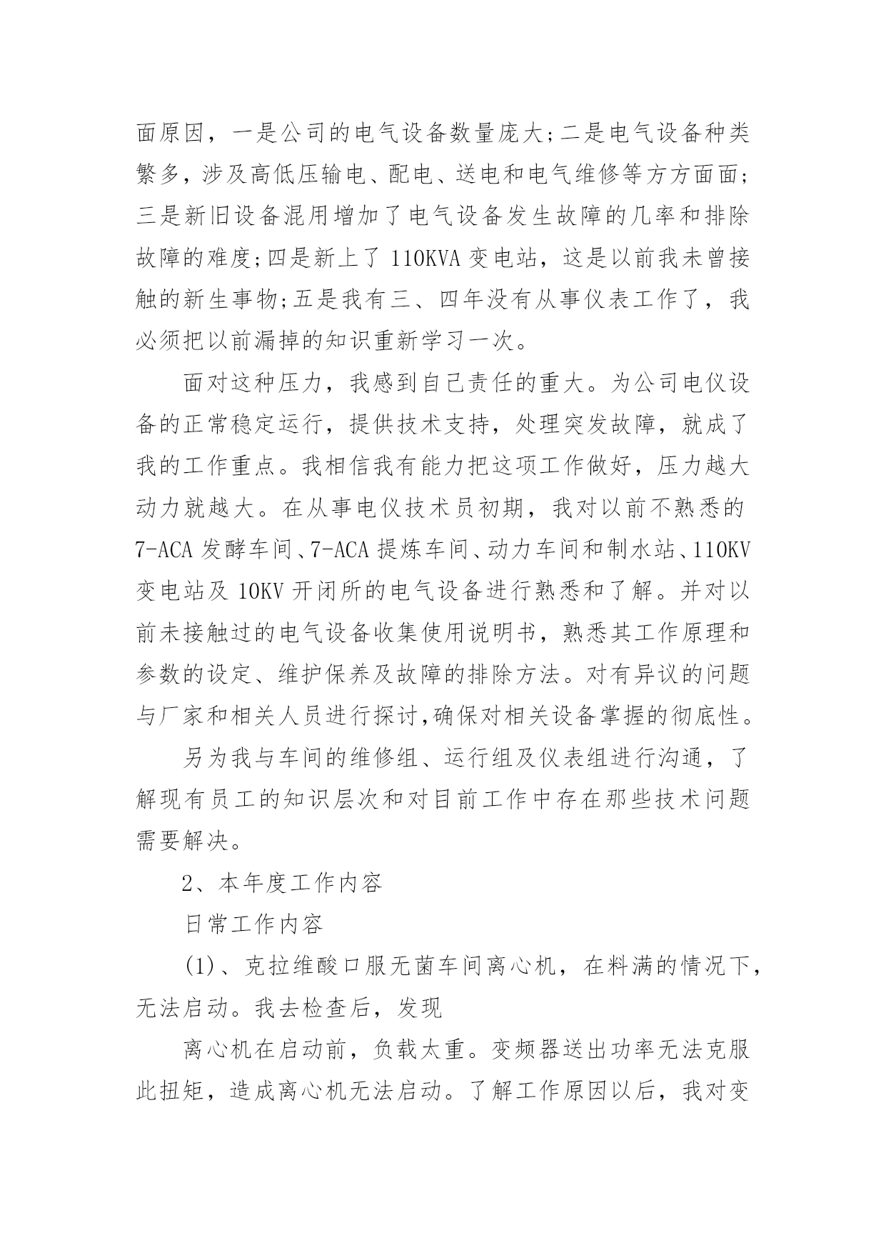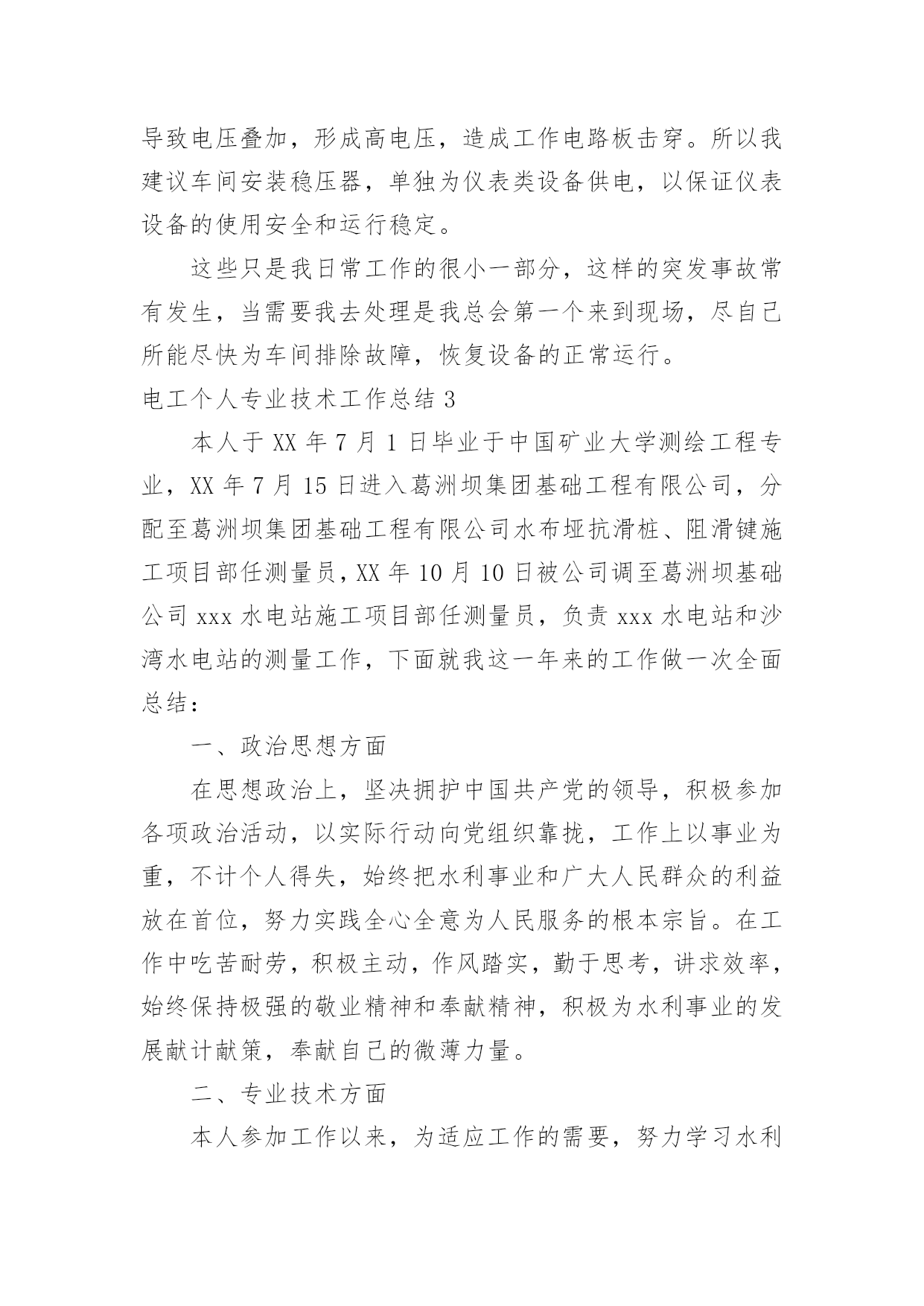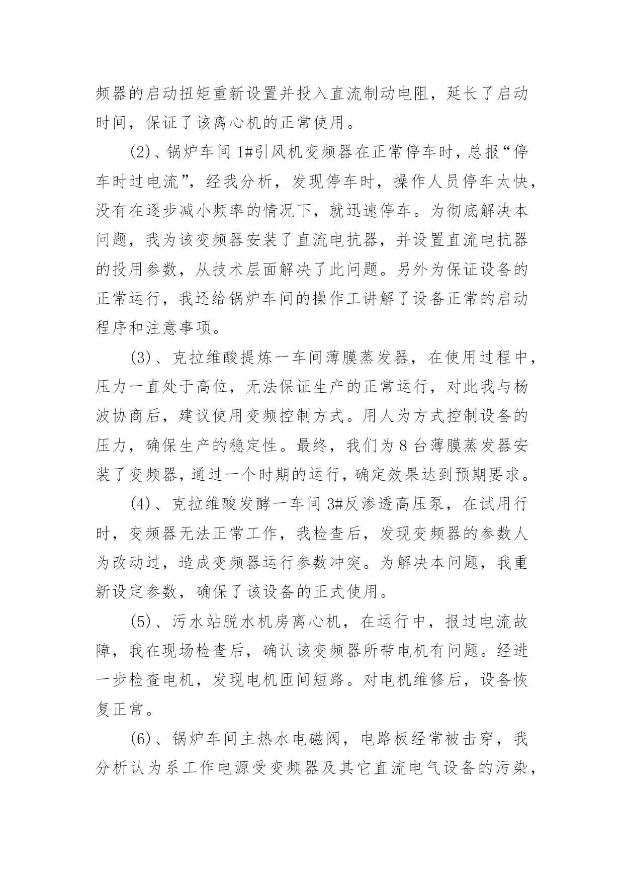 电工个人专业技术工作总结电工个人专业技术工作总结5篇总结是指社会团体、企业单位和个人对某一阶段的学习、工作或其完成情况加以回顾和分析,得出教训和一些规律性认识的一种书面材料,写总结有利于我们学习和工作能力的提高,让我们好好写一份总结吧。那么总结应该包括什么内容呢?以下是小编为大家整理的电工个人专业技术工作总结,欢迎大家借鉴与参考,希望对大家有所帮助。电工个人专业技术工作总结1本人XXX,女,汉族,现年30岁。于1994年7月毕业于绵阳XX校,分配于XX区XX水库XXX电站工作,主要负责该电站的电气检修,1995年10月被XX区工程职称评审委员会评为电气技术员;1996年1月调到XX水库工程运行科工作,主要工作是XX水库干渠的设计施工管理,XX年3月调到XX区水务局设计队工作至今,主要工作是水利水电工程的勘测、设计与施工工作。1999年10月被XX区工程职称评审委员会评定为电气助理工程师。一、与时俱进,政治思想不断提升。我是一个彻底的唯物主义者。自小接受马列主义教育,热爱中国历史,深深理解中国共产党是在血与火的战争年代诞生的并经过革命和社会主义现代化建设的考验稳步成长的。历史的变革充分证明只有中国共产党才是中国的唯一的领导,社会主义才是唯一的适合中国现阶段的社会制度。因此,本人坚定不移地坚持中国共产党的领导,坚持社会主义制度,坚持四项基本原则,遵纪守法,信守社会公德。并能跟随时代的变化,与时俱进,不断学习,深入理解。使自己的政治素质不断提升。二、勤学苦练,专业理论转化为工作技能。参加工作面对的不再是抽象的理论,而是实实在在的物体,不再是书本中具体的一门课程,而是一个系统专业。为了尽快熟悉工作,本人放弃了一切休息时间,勤奋学习,对照实物联系书本将学校所学的理论基础和社会实践相结合,在XXX电站工作期间,解决了XXX电站装机不配套、母线长期发热、经常跳闸烧毁供区电器等问题。同时结合电站实际提出了对该电站进行装机扩容的建议,并编制了《XXX电站技术改造方案》。针对全区电气化建设现状,编制了《XX区“十五”期间及XX年小水电代燃料生态建设工程规划》,1996年调到XX水库工程科,正值水库渠系配套建设,在此期间,我努力钻研水利专业技术知识,在工程师的带领下和同事一道克服了主干渠地质恶劣,山势陡峭等诸多困难,全面规划,精心设计,严格施工。通过两年的紧张工作,长达2的标准化渠系展现在XX镇、柳桥乡、大石镇的绿色怀抱,该工程竣工后经省市区验收评为XX市优质工程。使XX水库丰富的水通过干渠源源不断地输入到灌区万亩良田中。有力地促进了灌区农村经济的发展,提高了农业亩产量,增加了农民的收入。在施工一线锻炼的几年中,通过理论联系实际,将学校所学的专业理论知识迅速转化为了业务能力。任助理工程师专业技术职务和调到XX区水务局设计队后,为了提升专业知识,我更加努力地学习水利设计、施工与管理,先后独立设计施工了朝阳乡、柳桥乡、磨滩镇、香溪乡、黄龙乡、面上村社等多套农村人饮解困工程,晋贤乡石板河交通桥工程,虎跳镇竹江二社人畜饮水和农田提灌工程,青川县砂石水库除险加固工程实施方案,黄龙乡、清水乡土地整治综合开发项目工程、日元生态项目建设工程和XX市八一供水站技改工程配水管部分的勘测设计,并在技术管理过程和设计中积极推行“新工艺、新结构、新材料、新设备”。如一体自动化净化设备、聚乙烯PE塑料管、钢塑复合管在人饮工程中的运用,塑料薄膜在山坪塘中的应用,这些工程的实施和新材料的运用极大地缓解了我区的农村人畜饮水和农田水利灌溉困难,为工程区的群众身体健康的当地经济的发展作出了较大的贡献。三、开拓创新,不断更新知识。作为一名生长在信息化时代的专业技术人员,面临着高科技、高技术的快速更替,没有与时俱进,不断学习的精神就要落后。为了紧跟时代的脚步,我除了努力钻研专业技术,做好本职工作外,经常学习水利水电法律法规、经济学、管理学、办公文书和微机等多方面的知识,并于1998年10月参加了全国高等教育自学考试,已于XX年12月取得了汉语言文学专业文凭,XX年3月参加了水利水电工程专业本科段的学习,在边学习边工作的过程中提高了自己的法律知识、文化素质、技术水平和写作能力。同时积极掌握现代化办公设备,推行无纸化办公,用高科技手段提高单位的经济效益,我参与主研的《CAD制图技术在工程设计中的'推广应用》项目荣获XX区科技进步二等奖。如今设计的方案全部采用计算机设计和CAD制图,其方便快捷、精确美观、优质高效的众多优点为我们的设计带来了一场新的技术革命,使我们设计的成果质量在省市同行业中位居首位,获得领导专家一致好评。四、爱岗敬业,扎根于水利事业。从94年毕业分配到XX水库XXX电站至今已12年。12年的水电工作,使我由纸上谈兵的“书生秀才”变成一名具有实践经验的专业技术人员,12年的实