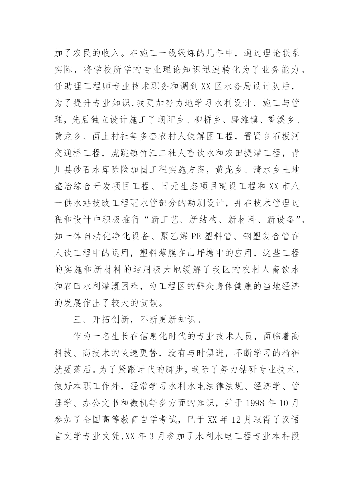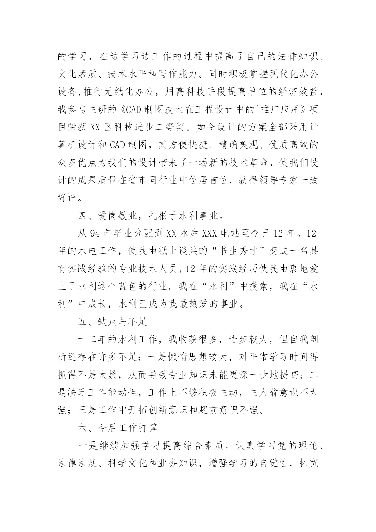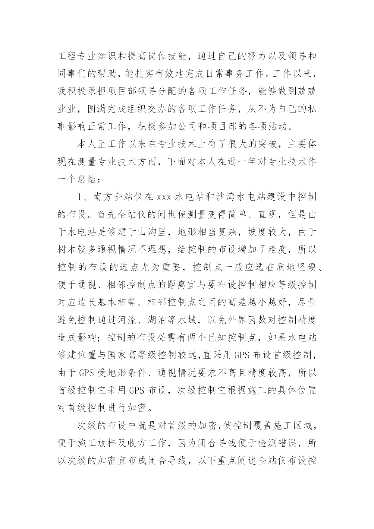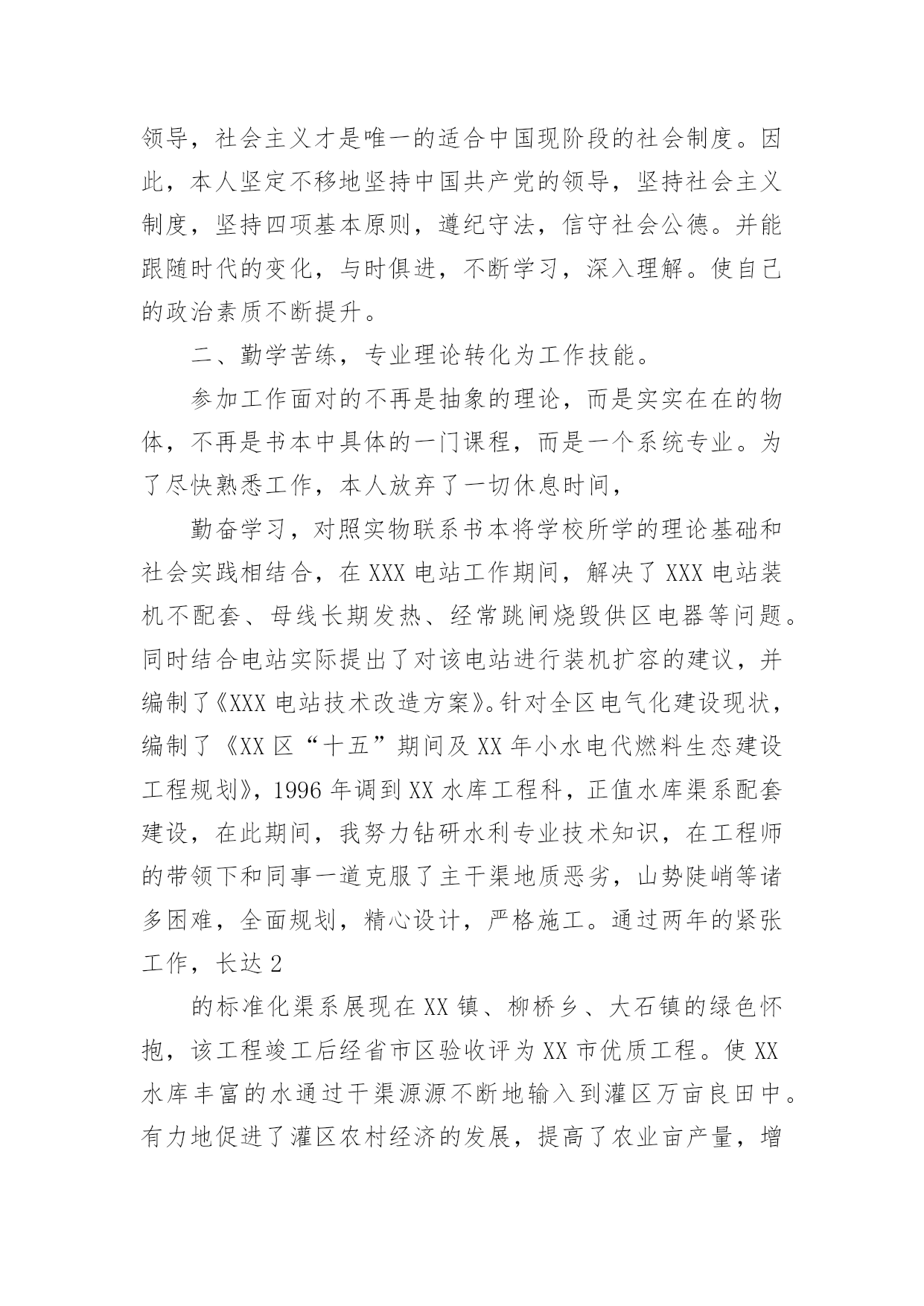 电工个人专业技术工作总结电工个人专业技术工作总结5篇总结是指社会团体、企业单位和个人对某一阶段的学习、工作或其完成情况加以回顾和分析,得出教训和一些规律性认识的一种书面材料,写总结有利于我们学习和工作能力的提高,让我们好好写一份总结吧。那么总结应该包括什么内容呢?以下是小编为大家整理的电工个人专业技术工作总结,欢迎大家借鉴与参考,希望对大家有所帮助。电工个人专业技术工作总结1本人XXX,女,汉族,现年30岁。于1994年7月毕业于绵阳XX校,分配于XX区XX水库XXX电站工作,主要负责该电站的电气检修,1995年10月被XX区工程职称评审委员会评为电气技术员;1996年1月调到XX水库工程运行科工作,主要工作是XX水库干渠的设计施工管理,XX年3月调到XX区水务局设计队工作至今,主要工作是水利水电工程的勘测、设计与施工工作。1999年10月被XX区工程职称评审委员会评定为电气助理工程师。一、与时俱进,政治思想不断提升。我是一个彻底的唯物主义者。自小接受马列主义教育,热爱中国历史,深深理解中国共产党是在血与火的战争年代诞生的并经过革命和社会主义现代化建设的考验稳步成长的。历史的变革充分证明只有中国共产党才是中国的唯一的领导,社会主义才是唯一的适合中国现阶段的社会制度。因此,本人坚定不移地坚持中国共产党的领导,坚持社会主义制度,坚持四项基本原则,遵纪守法,信守社会公德。并能跟随时代的变化,与时俱进,不断学习,深入理解。使自己的政治素质不断提升。二、勤学苦练,专业理论转化为工作技能。参加工作面对的不再是抽象的理论,而是实实在在的物体,不再是书本中具体的一门课程,而是一个系统专业。为了尽快熟悉工作,本人放弃了一切休息时间,勤奋学习,对照实物联系书本将学校所学的理论基础和社会实践相结合,在XXX电站工作期间,解决了XXX电站装机不配套、母线长期发热、经常跳闸烧毁供区电器等问题。同时结合电站实际提出了对该电站进行装机扩容的建议,并编制了《XXX电站技术改造方案》。针对全区电气化建设现状,编制了《XX区“十五”期间及XX年小水电代燃料生态建设工程规划》,1996年调到XX水库工程科,正值水库渠系配套建设,在此期间,我努力钻研水利专业技术知识,在工程师的带领下和同事一道克服了主干渠地质恶劣,山势陡峭等诸多困难,全面规划,精心设计,严格施工。通过两年的紧张工作,长达2的标准化渠系展现在XX镇、柳桥乡、大石镇的绿色怀抱,该工程竣工后经省市区验收评为XX市优质工程。使XX水库丰富的水通过干渠源源不断地输入到灌区万亩良田中。有力地促进了灌区农村经济的发展,提高了农业亩产量,增加了农民的收入。在施工一线锻炼的几年中,通过理论联系实际,将学校所学的专业理论知识迅速转化为了业务能力。任助理工程师专业技术职务和调到XX区水务局设计队后,为了提升专业知识,我更加努力地学习水利设计、施工与管理,先后独立设计施工了朝阳乡、柳桥乡、磨滩镇、香溪乡、黄龙乡、面上村社等多套农村人饮解困工程,晋贤乡石板河交通桥工程,虎跳镇竹江二社人畜饮水和农田提灌工程,青川县砂石水库除险加固工程实施方案,黄龙乡、清水乡土地整治综合开发项目工程、日元生态项目建设工程和XX市八一供水站技改工程配水管部分的勘测设计,并在技术管理过程和设计中积极推行“新工艺、新结构、新材料、新设备”。如一体自动化净化设备、聚乙烯PE塑料管、钢塑复合管在人饮工程中的运用,塑料薄膜在山坪塘中的应用,这些工程的实施和新材料的运用极大地缓解了我区的农村人畜饮水和农田水利灌溉困难,为工程区的群众身体健康的当地经济的发展作出了较大的贡献。三、开拓创新,不断更新知识。作为一名生长在信息化时代的专业技术人员,面临着高科技、高技术的快速更替,没有与时俱进,不断学习的精神就要落后。为了紧跟时代的脚步,我除了努力钻研专业技术,做好本职工作外,经常学习水利水电法律法规、经济学、管理学、办公文书和微机等多方面的知识,并于1998年10月参加了全国高等教育自学考试,已于XX年12月取得了汉语言文学专业文凭,XX年3月参加了水利水电工程专业本科段的学习,在边学习边工作的过程中提高了自己的法律知识、文化素质、技术水平和写作能力。同时积极掌握现代化办公设备,推行无纸化办公,用高科技手段提高单位的经济效益,我参与主研的《CAD制图技术在工程设计中的'推广应用》项目荣获XX区科技进步二等奖。如今设计的方案全部采用计算机设计和CAD制图,其方便快捷、精确美观、优质高效的众多优点为我们的设计带来了一场新的技术革命,使我们设计的成果质量在省市同行业中位居首位,获得领导专家一致好评。四、爱岗敬业,扎根于水利事业。从94年毕业分配到XX水库XXX电站至今已12年。12年的水电工作,使我由纸上谈兵的“书生秀才”变成一名具有实践经验的专业技术人员,12年的实