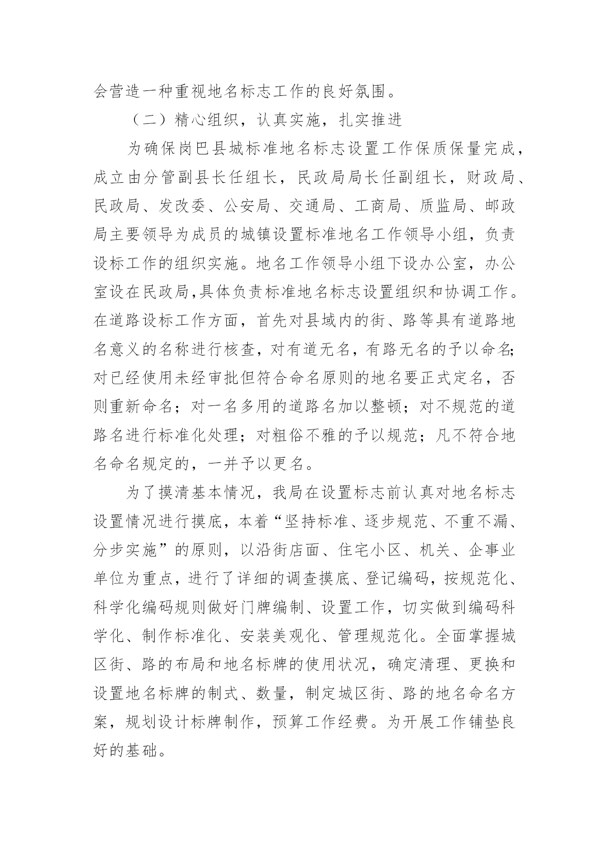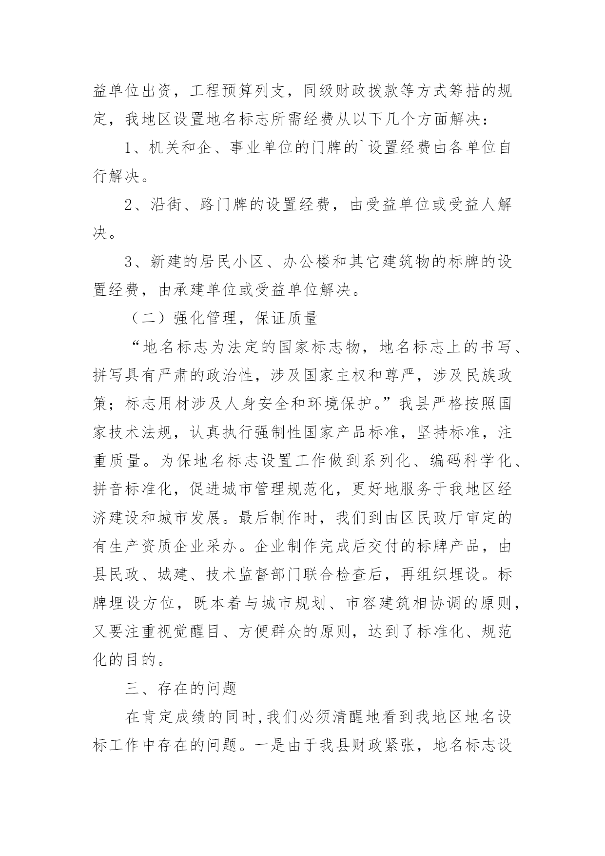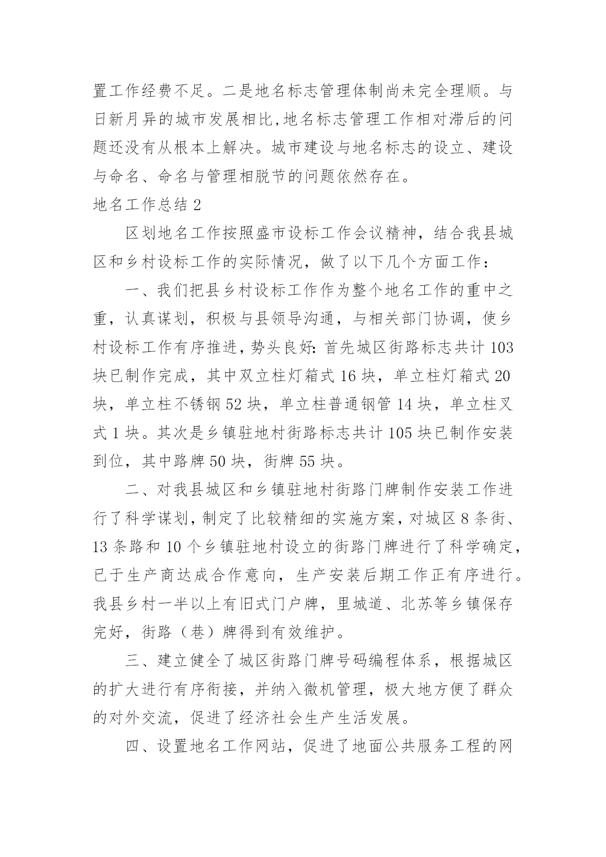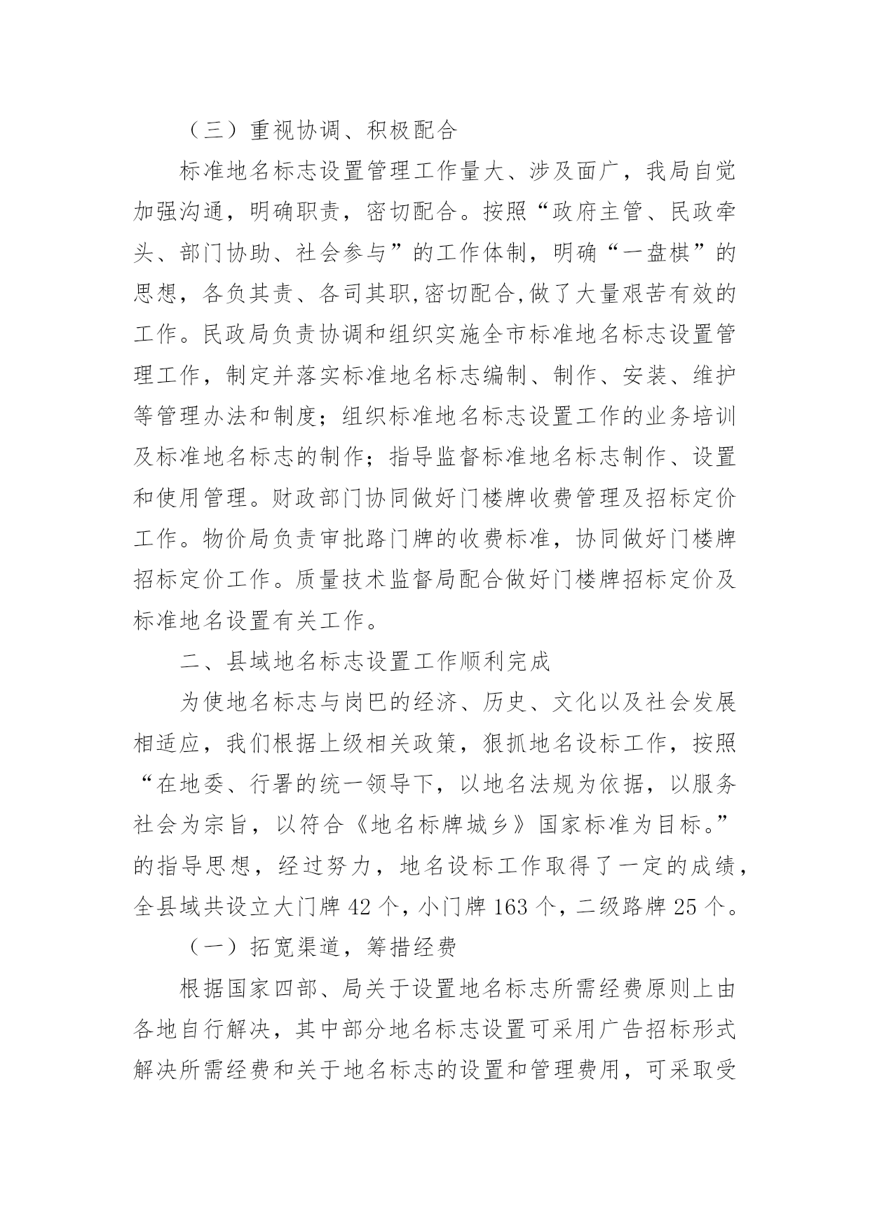 地名工作总结地名工作总结总结是对取得的成绩、存在的问题及得到的经验和教训等方面情况进行评价与描述的一种书面材料,它能够给人努力工作的动力,让我们好好写一份总结吧。总结怎么写才不会流于形式呢?下面是小编帮大家整理的地名工作总结,仅供参考,大家一起来看看吧。地名工作总结1自从开展地名设标工作以来,在自治区民政厅、地区民政局的大力支持和正确指导下,设标工作有序推进、步步深入,实现了从规划向实施的全方位拓展。一、统一思想,加强协调,全面开展设标工作(一)统一思想、提高认识在设标之初,我局主管副局长专门了参加地区关于国家标准专业培训,并认真学习其他兄弟县市的先进经验。学习回来后,积极向领导汇报,并联合相关部门业务通知进行了宣传发动和经验交流。通过学习,大家统一了思想,同志们充分认识到,路标门牌设置工作,关系到群众的切身利益和社会稳定。大家对这项工作的重要性有了高度的认识,把路标门牌设置作为一件实事来抓,并且加强对县城群众的宣传教育,切实提高群众对设置城市地名标志工作的认识,在全社会营造一种重视地名标志工作的良好氛围。(二)精心组织,认真实施,扎实推进为确保岗巴县城标准地名标志设置工作保质保量完成,成立由分管副县长任组长,民政局局长任副组长,财政局、民政局、发改委、公安局、交通局、工商局、质监局、邮政局主要领导为成员的城镇设置标准地名工作领导小组,负责设标工作的组织实施。地名工作领导小组下设办公室,办公室设在民政局,具体负责标准地名标志设置组织和协调工作。在道路设标工作方面,首先对县域内的街、路等具有道路地名意义的名称进行核查,对有道无名,有路无名的予以命名;对已经使用未经审批但符合命名原则的地名要正式定名,否则重新命名;对一名多用的道路名加以整顿;对不规范的道路名进行标准化处理;对粗俗不雅的予以规范;凡不符合地名命名规定的,一并予以更名。为了摸清基本情况,我局在设置标志前认真对地名标志设置情况进行摸底,本着“坚持标准、逐步规范、不重不漏、分步实施”的原则,以沿街店面、住宅小区、机关、企事业单位为重点,进行了详细的调查摸底、登记编码,按规范化、科学化编码规则做好门牌编制、设置工作,切实做到编码科学化、制作标准化、安装美观化、管理规范化。全面掌握城区街、路的布局和地名标牌的使用状况,确定清理、更换和设置地名标牌的制式、数量,制定城区街、路的地名命名方案,规划设计标牌制作,预算工作经费。为开展工作铺垫良好的基础。(三)重视协调、积极配合标准地名标志设置管理工作量大、涉及面广,我局自觉加强沟通,明确职责,密切配合。按照“政府主管、民政牵头、部门协助、社会参与”的工作体制,明确“一盘棋”的思想,各负其责、各司其职,密切配合,做了大量艰苦有效的工作。民政局负责协调和组织实施全市标准地名标志设置管理工作,制定并落实标准地名标志编制、制作、安装、维护等管理办法和制度;组织标准地名标志设置工作的业务培训及标准地名标志的制作;指导监督标准地名标志制作、设置和使用管理。财政部门协同做好门楼牌收费管理及招标定价工作。物价局负责审批路门牌的收费标准,协同做好门楼牌招标定价工作。质量技术监督局配合做好门楼牌招标定价及标准地名设置有关工作。二、县域地名标志设置工作顺利完成为使地名标志与岗巴的经济、历史、文化以及社会发展相适应,我们根据上级相关政策,狠抓地名设标工作,按照“在地委、行署的统一领导下,以地名法规为依据,以服务社会为宗旨,以符合《地名标牌城乡》国家标准为目标。”的指导思想,经过努力,地名设标工作取得了一定的成绩,全县域共设立大门牌42个,小门牌163个,二级路牌25个。(一)拓宽渠道,筹措经费根据国家四部、局关于设置地名标志所需经费原则上由各地自行解决,其中部分地名标志设置可采用广告招标形式解决所需经费和关于地名标志的设置和管理费用,可采取受益单位出资,工程预算列支,同级财政拨款等方式筹措的规定,我地区设置地名标志所需经费从以下几个方面解决:1、机关和企、事业单位的门牌的`设置经费由各单位自行解决。2、沿街、路门牌的设置经费,由受益单位或受益人解决。3、新建的居民小区、办公楼和其它建筑物的标牌的设置经费,由承建单位或受益单位解决。(二)强化管理,保证质量“地名标志为法定的国家标志物,地名标志上的书写、拼写具有严肃的政治性,涉及国家主权和尊严,涉及民族政策;标志用材涉及人身安全和环境保护。”我县严格按照国家技术法规,认真执行强制性国家产品标准,坚持标准,注重质量。为保地名标志设置工作做到系列化、编码科学化、拼音标准化,促进城市管理规范化,更好地服务于我地区经济建设和城市发展。最后制作时,我们到由区民政厅审定的有生产资质企业采办。企业制作完成后交付的标牌产品,由县民政、城建、技术监督部门联合检查后,再组织埋设。标牌埋设方位,既本着与城市规划、市容建筑相协调