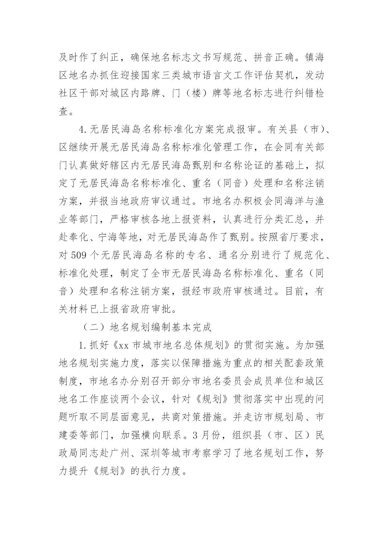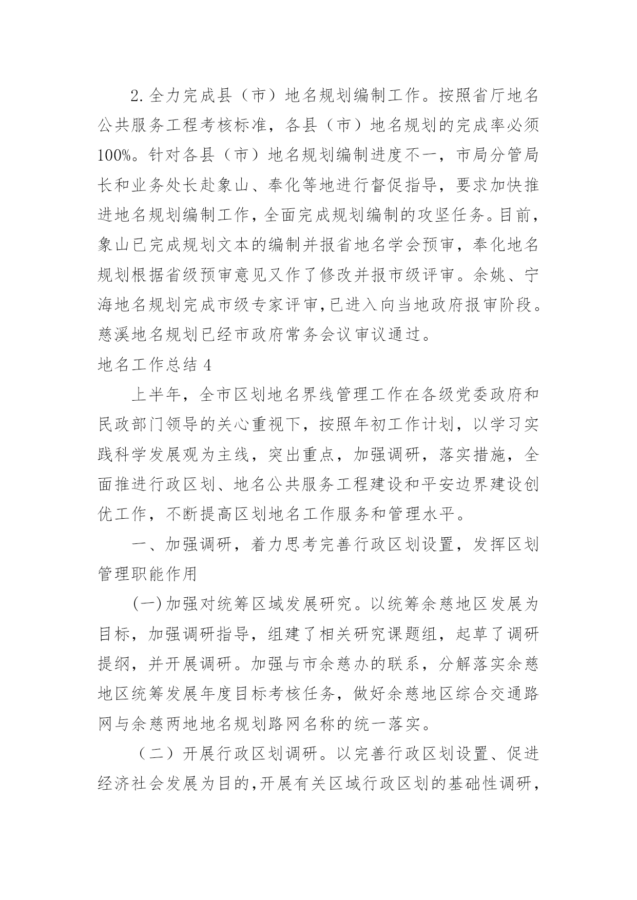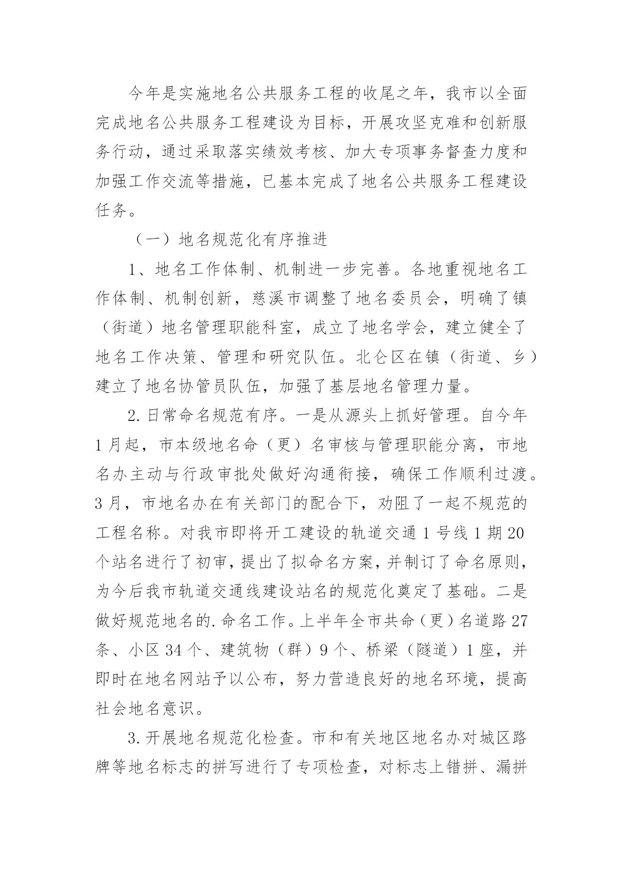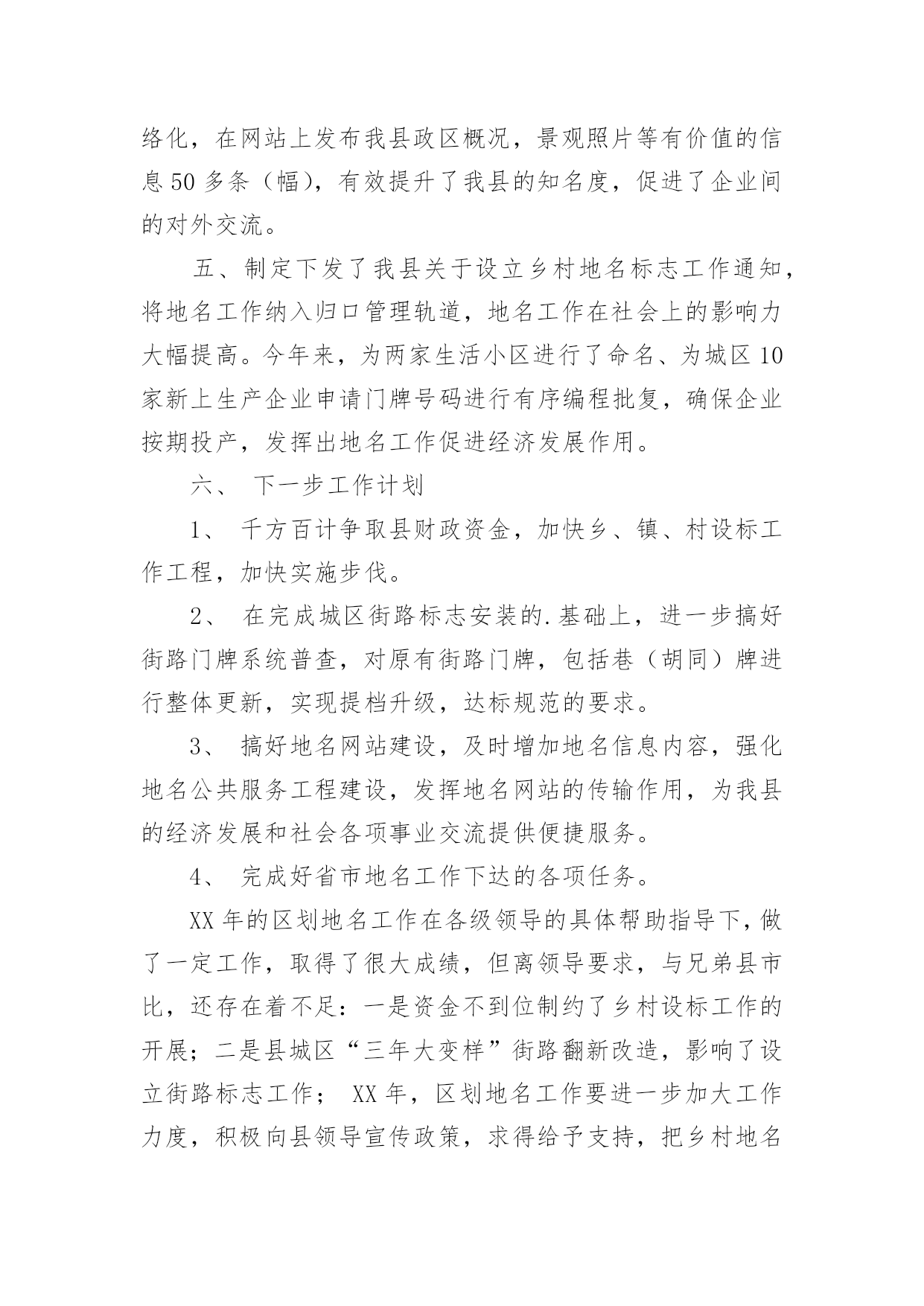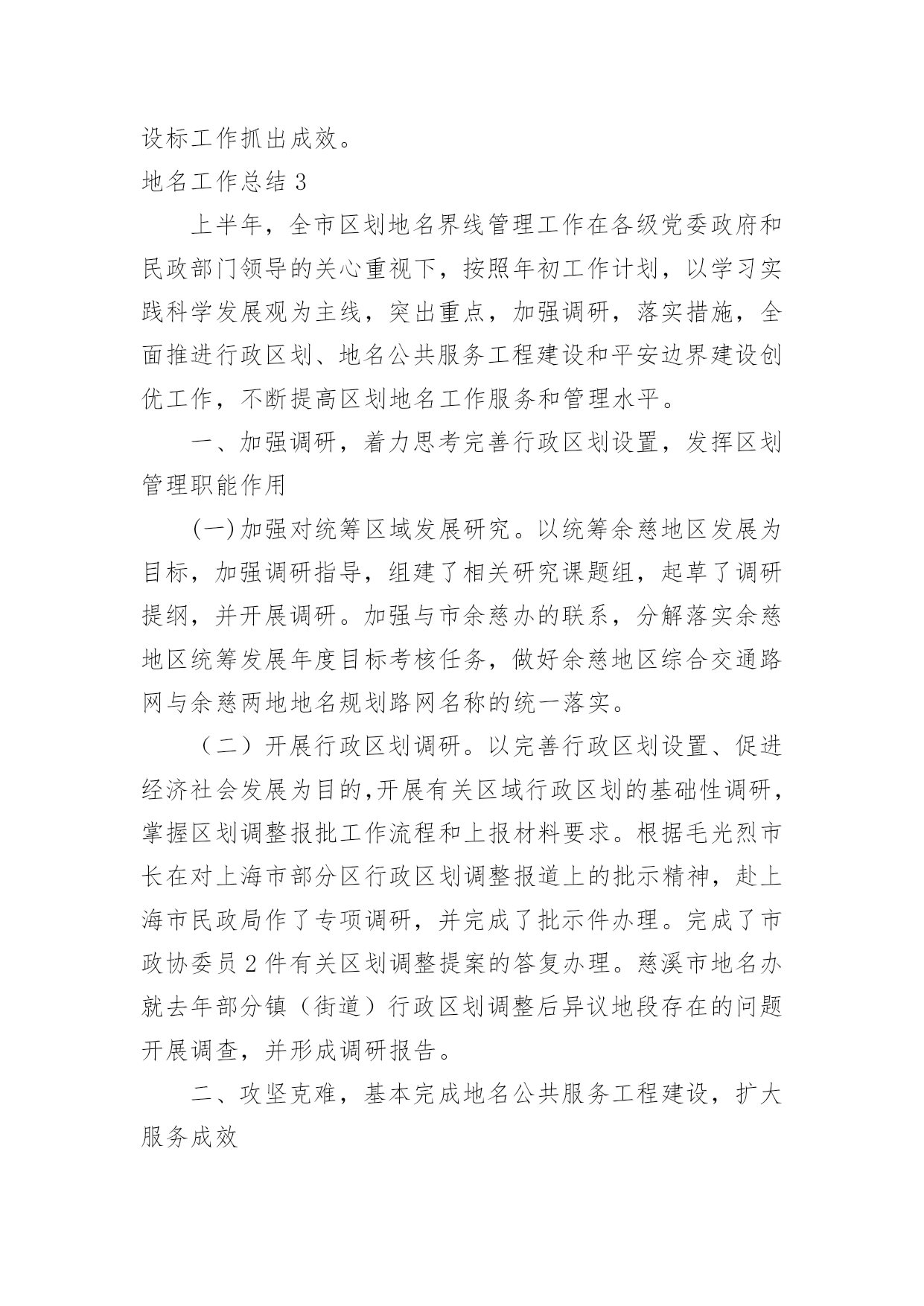 地名工作总结地名工作总结总结是对取得的成绩、存在的问题及得到的经验和教训等方面情况进行评价与描述的一种书面材料,它能够给人努力工作的动力,让我们好好写一份总结吧。总结怎么写才不会流于形式呢?下面是小编帮大家整理的地名工作总结,仅供参考,大家一起来看看吧。地名工作总结1自从开展地名设标工作以来,在自治区民政厅、地区民政局的大力支持和正确指导下,设标工作有序推进、步步深入,实现了从规划向实施的全方位拓展。一、统一思想,加强协调,全面开展设标工作(一)统一思想、提高认识在设标之初,我局主管副局长专门了参加地区关于国家标准专业培训,并认真学习其他兄弟县市的先进经验。学习回来后,积极向领导汇报,并联合相关部门业务通知进行了宣传发动和经验交流。通过学习,大家统一了思想,同志们充分认识到,路标门牌设置工作,关系到群众的切身利益和社会稳定。大家对这项工作的重要性有了高度的认识,把路标门牌设置作为一件实事来抓,并且加强对县城群众的宣传教育,切实提高群众对设置城市地名标志工作的认识,在全社会营造一种重视地名标志工作的良好氛围。(二)精心组织,认真实施,扎实推进为确保岗巴县城标准地名标志设置工作保质保量完成,成立由分管副县长任组长,民政局局长任副组长,财政局、民政局、发改委、公安局、交通局、工商局、质监局、邮政局主要领导为成员的城镇设置标准地名工作领导小组,负责设标工作的组织实施。地名工作领导小组下设办公室,办公室设在民政局,具体负责标准地名标志设置组织和协调工作。在道路设标工作方面,首先对县域内的街、路等具有道路地名意义的名称进行核查,对有道无名,有路无名的予以命名;对已经使用未经审批但符合命名原则的地名要正式定名,否则重新命名;对一名多用的道路名加以整顿;对不规范的道路名进行标准化处理;对粗俗不雅的予以规范;凡不符合地名命名规定的,一并予以更名。为了摸清基本情况,我局在设置标志前认真对地名标志设置情况进行摸底,本着“坚持标准、逐步规范、不重不漏、分步实施”的原则,以沿街店面、住宅小区、机关、企事业单位为重点,进行了详细的调查摸底、登记编码,按规范化、科学化编码规则做好门牌编制、设置工作,切实做到编码科学化、制作标准化、安装美观化、管理规范化。全面掌握城区街、路的布局和地名标牌的使用状况,确定清理、更换和设置地名标牌的制式、数量,制定城区街、路的地名命名方案,规划设计标牌制作,预算工作经费。为开展工作铺垫良好的基础。(三)重视协调、积极配合标准地名标志设置管理工作量大、涉及面广,我局自觉加强沟通,明确职责,密切配合。按照“政府主管、民政牵头、部门协助、社会参与”的工作体制,明确“一盘棋”的思想,各负其责、各司其职,密切配合,做了大量艰苦有效的工作。民政局负责协调和组织实施全市标准地名标志设置管理工作,制定并落实标准地名标志编制、制作、安装、维护等管理办法和制度;组织标准地名标志设置工作的业务培训及标准地名标志的制作;指导监督标准地名标志制作、设置和使用管理。财政部门协同做好门楼牌收费管理及招标定价工作。物价局负责审批路门牌的收费标准,协同做好门楼牌招标定价工作。质量技术监督局配合做好门楼牌招标定价及标准地名设置有关工作。二、县域地名标志设置工作顺利完成为使地名标志与岗巴的经济、历史、文化以及社会发展相适应,我们根据上级相关政策,狠抓地名设标工作,按照“在地委、行署的统一领导下,以地名法规为依据,以服务社会为宗旨,以符合《地名标牌城乡》国家标准为目标。”的指导思想,经过努力,地名设标工作取得了一定的成绩,全县域共设立大门牌42个,小门牌163个,二级路牌25个。(一)拓宽渠道,筹措经费根据国家四部、局关于设置地名标志所需经费原则上由各地自行解决,其中部分地名标志设置可采用广告招标形式解决所需经费和关于地名标志的设置和管理费用,可采取受益单位出资,工程预算列支,同级财政拨款等方式筹措的规定,我地区设置地名标志所需经费从以下几个方面解决:1、机关和企、事业单位的门牌的`设置经费由各单位自行解决。2、沿街、路门牌的设置经费,由受益单位或受益人解决。3、新建的居民小区、办公楼和其它建筑物的标牌的设置经费,由承建单位或受益单位解决。(二)强化管理,保证质量“地名标志为法定的国家标志物,地名标志上的书写、拼写具有严肃的政治性,涉及国家主权和尊严,涉及民族政策;标志用材涉及人身安全和环境保护。”我县严格按照国家技术法规,认真执行强制性国家产品标准,坚持标准,注重质量。为保地名标志设置工作做到系列化、编码科学化、拼音标准化,促进城市管理规范化,更好地服务于我地区经济建设和城市发展。最后制作时,我们到由区民政厅审定的有生产资质企业采办。企业制作完成后交付的标牌产品,由县民政、城建、技术监督部门联合检查后,再组织埋设。标牌埋设方位,既本着与城市规划、市容建筑相协调