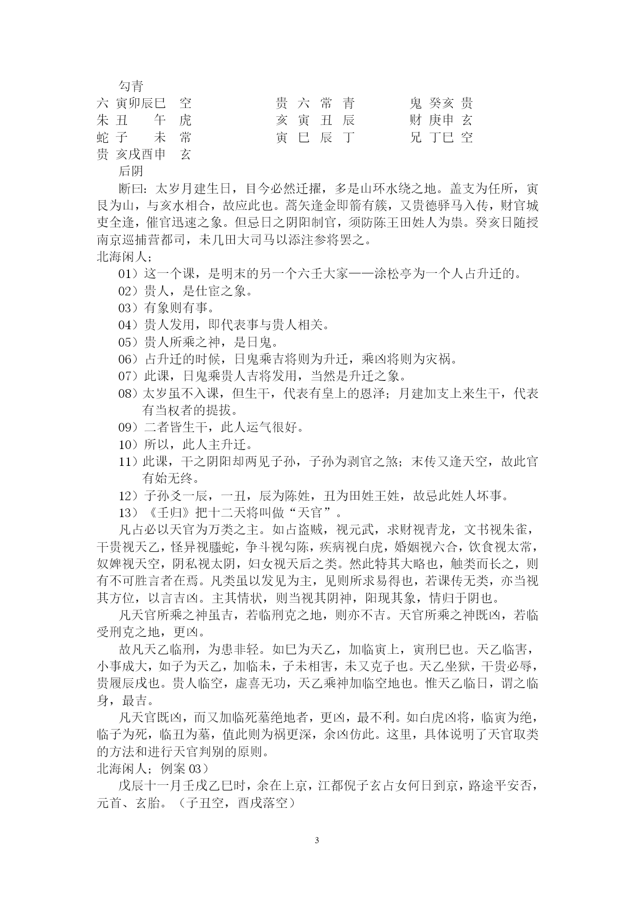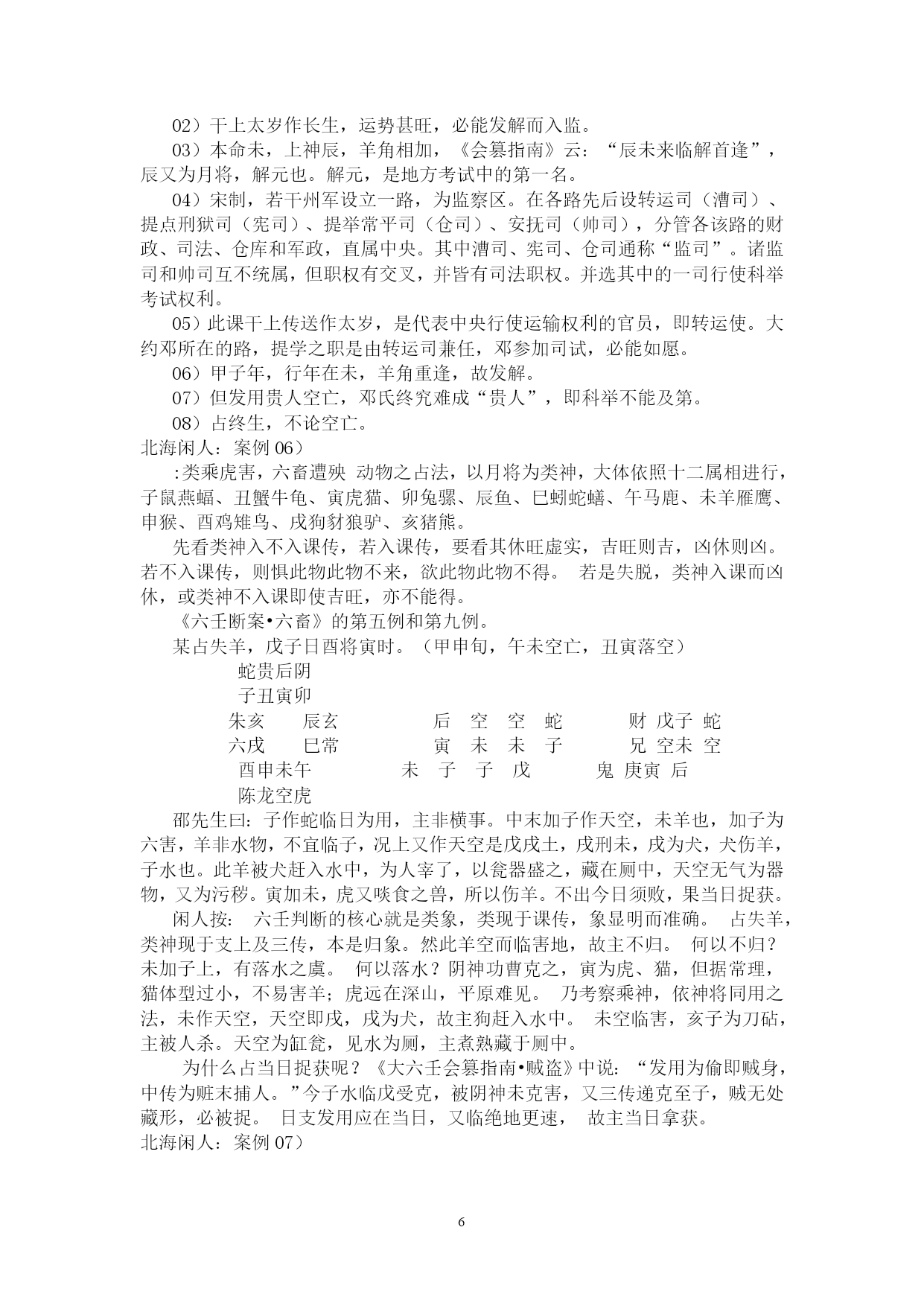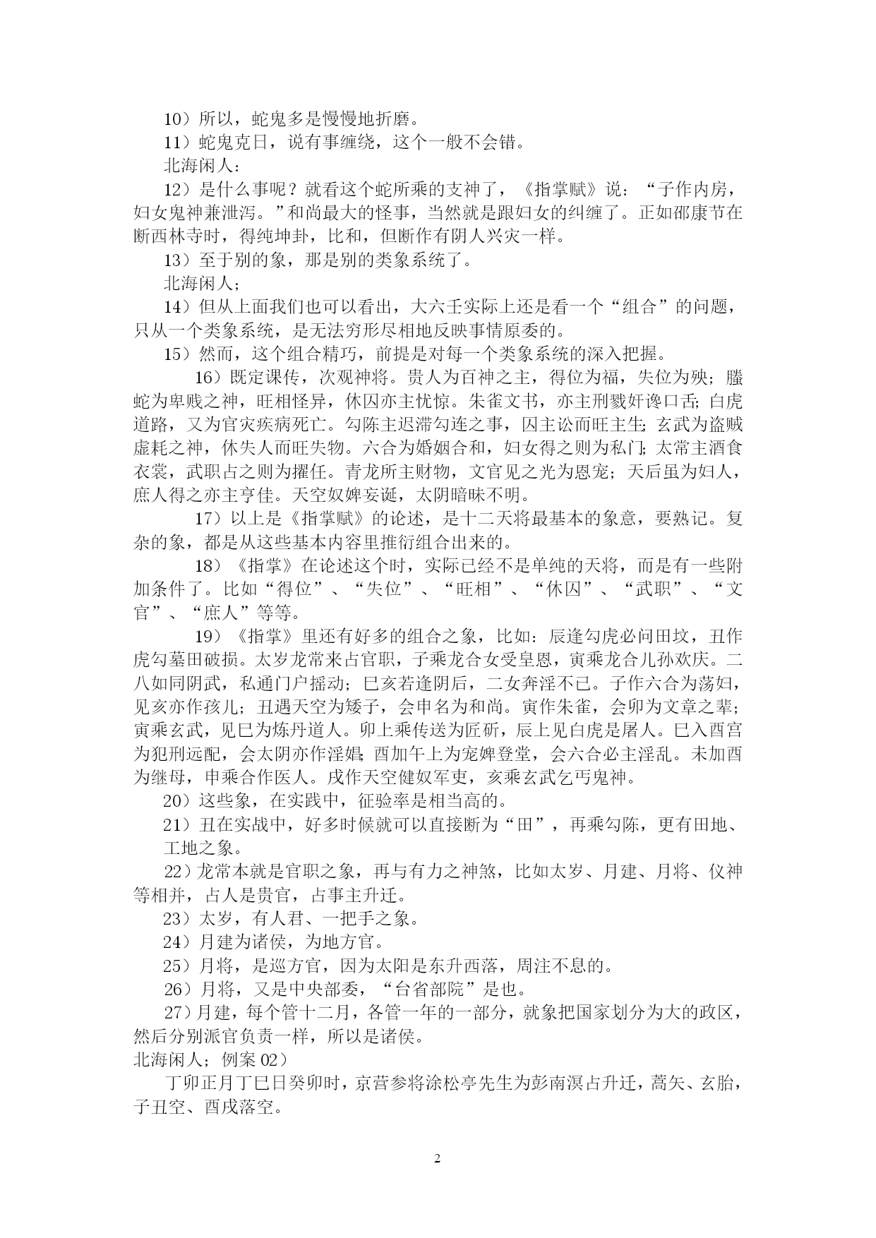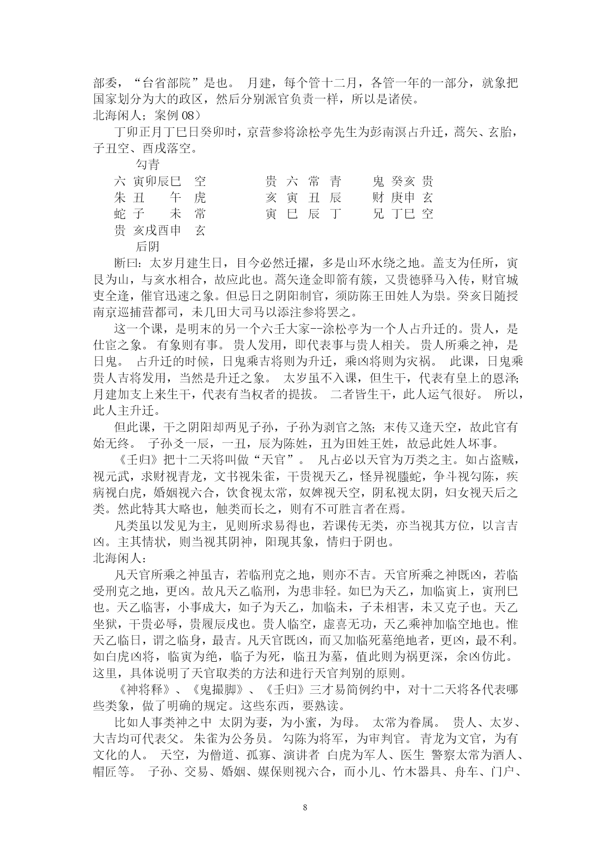 PAGE262北海学习整理资料北海闲人,世居渤海之滨,故以为名。受齐鲁儒家思想熏陶,雅慕术数玄学,酷好天文、地理、历史、哲学,涉猎多种玄学门类,独醉心于大六壬,多年苦研,祖述先贤之理,形成了系统的大六壬研究和教学思路。主张“壬学即人学,世事洞明,人情练达。”、“壬学是传统文化的构成要素,大六壬学习理当以传统伦理道德为指导。”、“壬本象学,有象即有事。”、“学重积累,所记即所得。”,主张“理气为指导,类象为核心。”、“崇尚平实简易,反对炫奇求巧”,主张“有教无类,唯德唯勤。”,反对将大六壬神秘化。撰成《六壬金针》、《大六壬断法述要》、《<大六壬指南>占验今诠》等书,发表壬学论文多篇,获得广大壬友购阅、转载。占验平实准确,不尚浮华。开展大六壬函授、面授,教学理路清通,实效性强,深受欢迎。近来并录制大六壬义务教学录音以供收听。壬海茫茫,来路遥遥,愿有志于壬者众志成城,共同发扬传统文化!北海闲人:例案01)丙寅四月丙寅日庚寅时,维扬关外建龙寺僧丽天在蓝园住静,偶晤求占,涉害、周遍。朱六蛇子丑寅卯勾虎贵常蛇鬼甲子蛇贵亥辰龙辰酉未子子辛未常后戌巳空酉寅子丙父丙寅六阴酉申未午虎玄常断曰:神后蛇鬼临干发用,必有阴人往来缠扰。僧默然久之,曰:凶吉若何?曰:干支首尾相见,一时不能拆离;且河魁加卯命,驿马临行年,必有相携而逃之意。然而传将互克,提防有人攻讦事。因而众施主送僧渡江,后复来扬,携妇而去。北海闲人:01)这一个僧人,忽然来找陈公献问课。陈公献一见蛇鬼发用临日,即断作有恶事缠绕。02)为什么这么断呢?就是因为蛇主缠绕。加于干上又发用,双重的凶象,比较明显,因此断有恶事缠绕。03)蛇这个天将,《指掌赋》里说:“螣蛇为卑贱之神,旺相怪异,休囚亦主忧惊。”04)怪异,使人忧惊,形象的说,就是蛇这一动物给人的感觉。05)汉族人自来就不喜欢蛇,因为它实在是让人心里ZIGZAG地。06)这玩意没腿,但窜得飞快;滑溜溜的,专在人不经意之时出现;好多还有毒。实在是让人不寒而栗。07)蛇要伤人,不会像老虎一样一口咬死吃掉,而是慢慢地。08)这蛇,就是慢慢地折磨、恐吓人。因此,蛇鬼,代表的是缠绕不休、越来越紧的。北海闲人:09)一个人被巨蟒缠住,会越来越紧,看着那家伙吐着信子的大口,人在憋闷、惊恐之中煎熬,恐怕还没等到咬死、勒死,早吓死了。10)所以,蛇鬼多是慢慢地折磨。11)蛇鬼克日,说有事缠绕,这个一般不会错。北海闲人:12)是什么事呢?就看这个蛇所乘的支神了,《指掌赋》说:“子作内房,妇女鬼神兼泄泻。”和尚最大的怪事,当然就是跟妇女的纠缠了。正如邵康节在断西林寺时,得纯坤卦,比和,但断作有阴人兴灾一样。13)至于别的象,那是别的类象系统了。北海闲人;14)但从上面我们也可以看出,大六壬实际上还是看一个“组合”的问题,只从一个类象系统,是无法穷形尽相地反映事情原委的。15)然而,这个组合精巧,前提是对每一个类象系统的深入把握。16)既定课传,次观神将。贵人为百神之主,得位为福,失位为殃;螣蛇为卑贱之神,旺相怪异,休囚亦主忧惊。朱雀文书,亦主刑戮奸谗口舌;白虎道路,又为官灾疾病死亡。勾陈主迟滞勾连之事,囚主讼而旺主生;玄武为盗贼虚耗之神,休失人而旺失物。六合为婚姻合和,妇女得之则为私门;太常主酒食衣裳,武职占之则为擢任。青龙所主财物,文官见之光为恩宠;天后虽为妇人,庶人得之亦主亨佳。天空奴婢妄诞,太阴暗昧不明。17)以上是《指掌赋》的论述,是十二天将最基本的象意,要熟记。复杂的象,都是从这些基本内容里推衍组合出来的。18)《指掌》在论述这个时,实际已经不是单纯的天将,而是有一些附加条件了。比如“得位”、“失位”、“旺相”、“休囚”、“武职”、“文官”、“庶人”等等。19)《指掌》里还有好多的组合之象,比如:辰逢勾虎必问田坟,丑作虎勾墓田破损。太岁龙常来占官职,子乘龙合女受皇恩,寅乘龙合儿孙欢庆。二八如同阴武,私通门户摇动;巳亥若逢阴后,二女奔淫不已。子作六合为荡妇,见亥亦作孩儿;丑遇天空为矮子,会申名为和尚。寅作朱雀,会卯为文章之辈;寅乘玄武,见巳为炼丹道人。卯上乘传送为匠斫,辰上见白虎是屠人。巳入酉宫为犯刑远配,会太阴亦作淫娼;酉加午上为宠婢登堂,会六合必主淫乱。未加酉为继母,申乘合作医人。戌作天空健奴军吏,亥乘玄武乞丐鬼神。20)这些象,在实践中,征验率是相当高的。21)丑在实战中,好多时候就可以直接断为“田”,再乘勾陈,更有田地、工地之象。22)龙常本就是官职之象,再与有力之神煞,比如太岁、月建、月将、仪神等相并,占人是贵官,占事主升迁。23)太岁,有人君、一把手之象。24)月建为诸侯,为地方官。25)