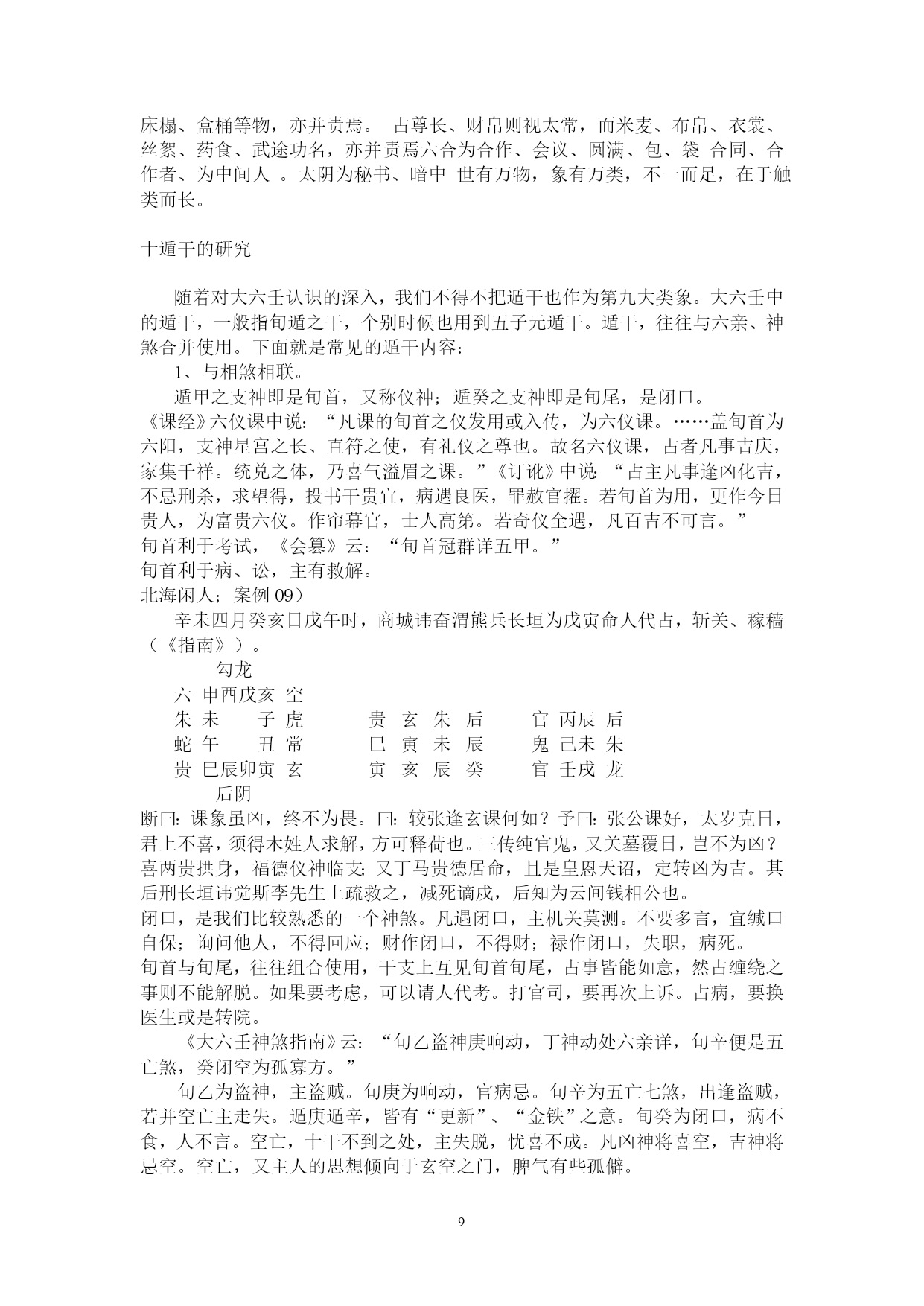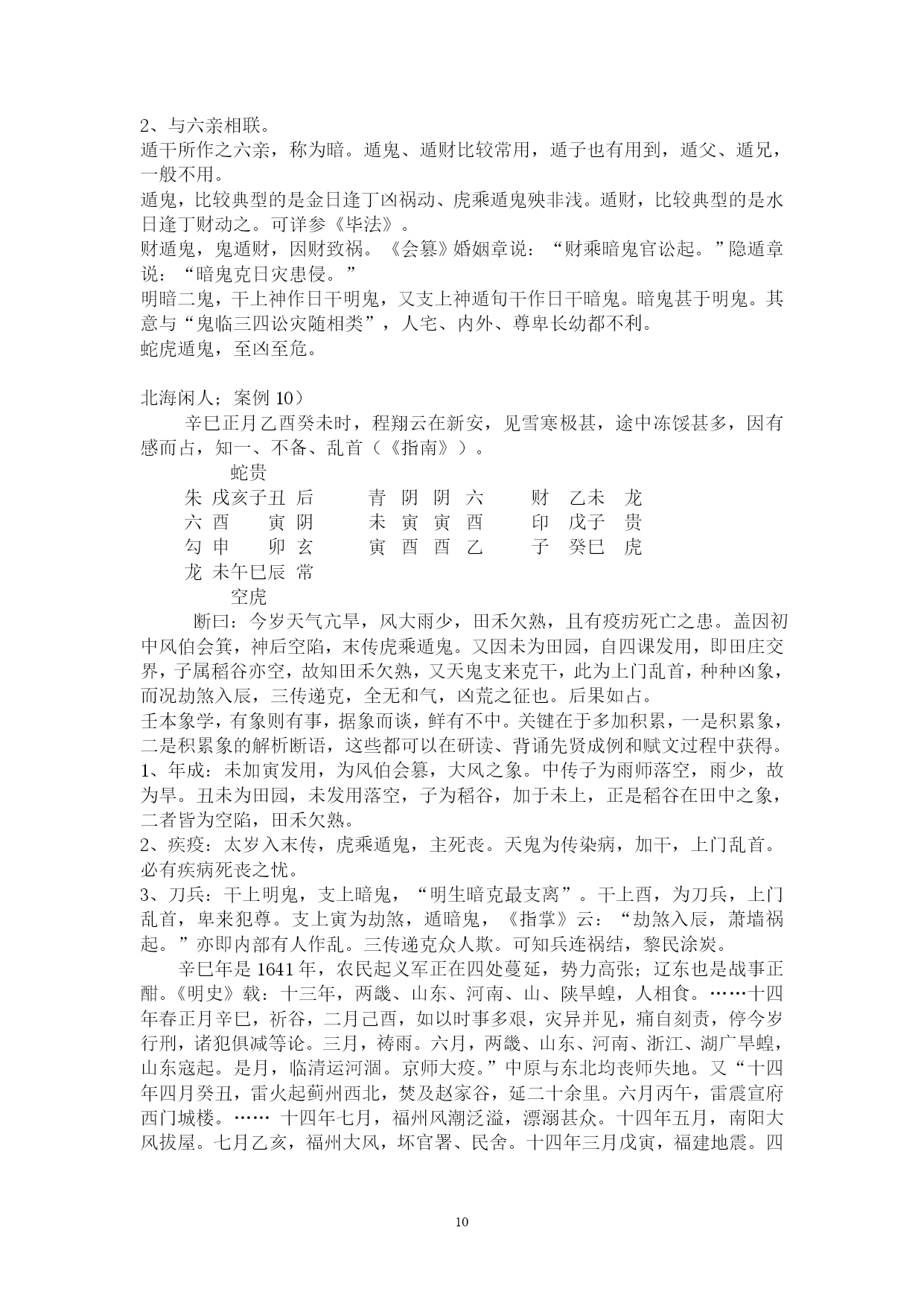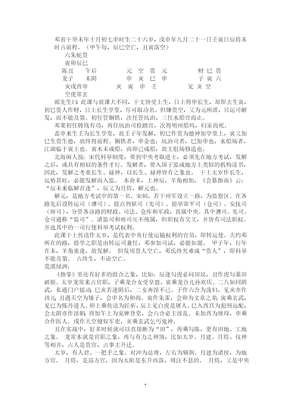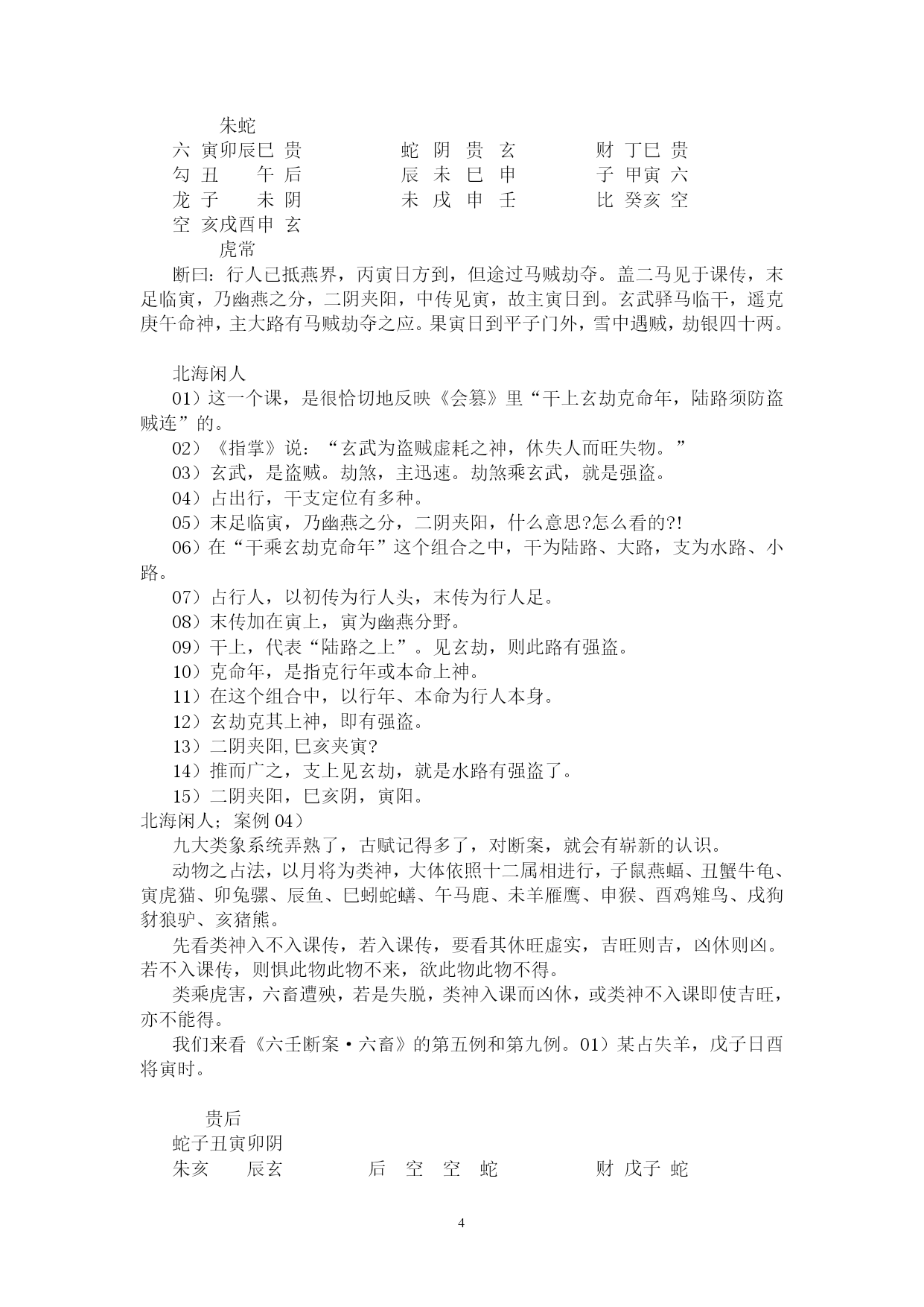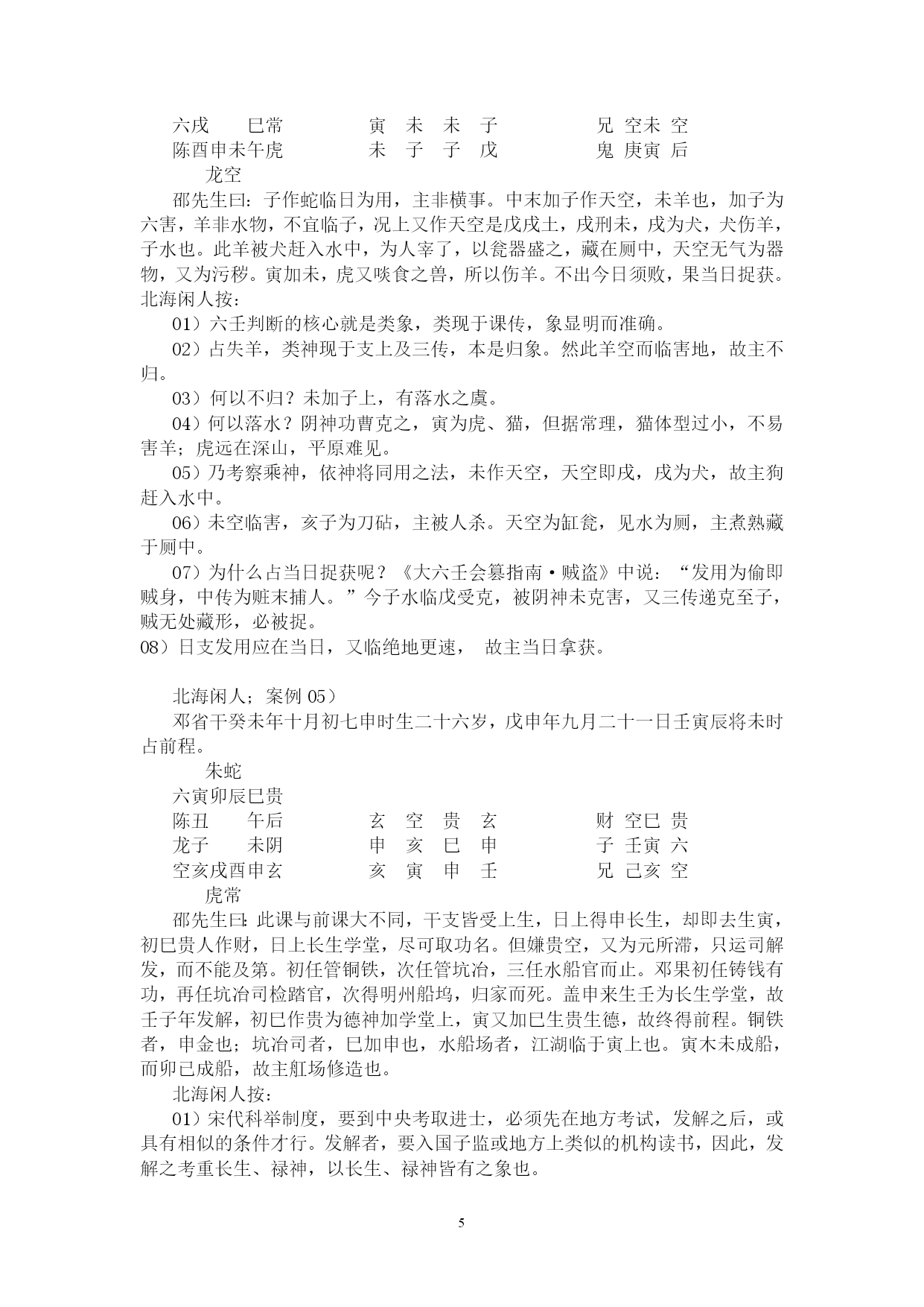 PAGE262北海学习整理资料北海闲人,世居渤海之滨,故以为名。受齐鲁儒家思想熏陶,雅慕术数玄学,酷好天文、地理、历史、哲学,涉猎多种玄学门类,独醉心于大六壬,多年苦研,祖述先贤之理,形成了系统的大六壬研究和教学思路。主张“壬学即人学,世事洞明,人情练达。”、“壬学是传统文化的构成要素,大六壬学习理当以传统伦理道德为指导。”、“壬本象学,有象即有事。”、“学重积累,所记即所得。”,主张“理气为指导,类象为核心。”、“崇尚平实简易,反对炫奇求巧”,主张“有教无类,唯德唯勤。”,反对将大六壬神秘化。撰成《六壬金针》、《大六壬断法述要》、《<大六壬指南>占验今诠》等书,发表壬学论文多篇,获得广大壬友购阅、转载。占验平实准确,不尚浮华。开展大六壬函授、面授,教学理路清通,实效性强,深受欢迎。近来并录制大六壬义务教学录音以供收听。壬海茫茫,来路遥遥,愿有志于壬者众志成城,共同发扬传统文化!北海闲人:例案01)丙寅四月丙寅日庚寅时,维扬关外建龙寺僧丽天在蓝园住静,偶晤求占,涉害、周遍。朱六蛇子丑寅卯勾虎贵常蛇鬼甲子蛇贵亥辰龙辰酉未子子辛未常后戌巳空酉寅子丙父丙寅六阴酉申未午虎玄常断曰:神后蛇鬼临干发用,必有阴人往来缠扰。僧默然久之,曰:凶吉若何?曰:干支首尾相见,一时不能拆离;且河魁加卯命,驿马临行年,必有相携而逃之意。然而传将互克,提防有人攻讦事。因而众施主送僧渡江,后复来扬,携妇而去。北海闲人:01)这一个僧人,忽然来找陈公献问课。陈公献一见蛇鬼发用临日,即断作有恶事缠绕。02)为什么这么断呢?就是因为蛇主缠绕。加于干上又发用,双重的凶象,比较明显,因此断有恶事缠绕。03)蛇这个天将,《指掌赋》里说:“螣蛇为卑贱之神,旺相怪异,休囚亦主忧惊。”04)怪异,使人忧惊,形象的说,就是蛇这一动物给人的感觉。05)汉族人自来就不喜欢蛇,因为它实在是让人心里ZIGZAG地。06)这玩意没腿,但窜得飞快;滑溜溜的,专在人不经意之时出现;好多还有毒。实在是让人不寒而栗。07)蛇要伤人,不会像老虎一样一口咬死吃掉,而是慢慢地。08)这蛇,就是慢慢地折磨、恐吓人。因此,蛇鬼,代表的是缠绕不休、越来越紧的。北海闲人:09)一个人被巨蟒缠住,会越来越紧,看着那家伙吐着信子的大口,人在憋闷、惊恐之中煎熬,恐怕还没等到咬死、勒死,早吓死了。10)所以,蛇鬼多是慢慢地折磨。11)蛇鬼克日,说有事缠绕,这个一般不会错。北海闲人:12)是什么事呢?就看这个蛇所乘的支神了,《指掌赋》说:“子作内房,妇女鬼神兼泄泻。”和尚最大的怪事,当然就是跟妇女的纠缠了。正如邵康节在断西林寺时,得纯坤卦,比和,但断作有阴人兴灾一样。13)至于别的象,那是别的类象系统了。北海闲人;14)但从上面我们也可以看出,大六壬实际上还是看一个“组合”的问题,只从一个类象系统,是无法穷形尽相地反映事情原委的。15)然而,这个组合精巧,前提是对每一个类象系统的深入把握。16)既定课传,次观神将。贵人为百神之主,得位为福,失位为殃;螣蛇为卑贱之神,旺相怪异,休囚亦主忧惊。朱雀文书,亦主刑戮奸谗口舌;白虎道路,又为官灾疾病死亡。勾陈主迟滞勾连之事,囚主讼而旺主生;玄武为盗贼虚耗之神,休失人而旺失物。六合为婚姻合和,妇女得之则为私门;太常主酒食衣裳,武职占之则为擢任。青龙所主财物,文官见之光为恩宠;天后虽为妇人,庶人得之亦主亨佳。天空奴婢妄诞,太阴暗昧不明。17)以上是《指掌赋》的论述,是十二天将最基本的象意,要熟记。复杂的象,都是从这些基本内容里推衍组合出来的。18)《指掌》在论述这个时,实际已经不是单纯的天将,而是有一些附加条件了。比如“得位”、“失位”、“旺相”、“休囚”、“武职”、“文官”、“庶人”等等。19)《指掌》里还有好多的组合之象,比如:辰逢勾虎必问田坟,丑作虎勾墓田破损。太岁龙常来占官职,子乘龙合女受皇恩,寅乘龙合儿孙欢庆。二八如同阴武,私通门户摇动;巳亥若逢阴后,二女奔淫不已。子作六合为荡妇,见亥亦作孩儿;丑遇天空为矮子,会申名为和尚。寅作朱雀,会卯为文章之辈;寅乘玄武,见巳为炼丹道人。卯上乘传送为匠斫,辰上见白虎是屠人。巳入酉宫为犯刑远配,会太阴亦作淫娼;酉加午上为宠婢登堂,会六合必主淫乱。未加酉为继母,申乘合作医人。戌作天空健奴军吏,亥乘玄武乞丐鬼神。20)这些象,在实践中,征验率是相当高的。21)丑在实战中,好多时候就可以直接断为“田”,再乘勾陈,更有田地、工地之象。22)龙常本就是官职之象,再与有力之神煞,比如太岁、月建、月将、仪神等相并,占人是贵官,占事主升迁。23)太岁,有人君、一把手之象。24)月建为诸侯,为地方官。25)