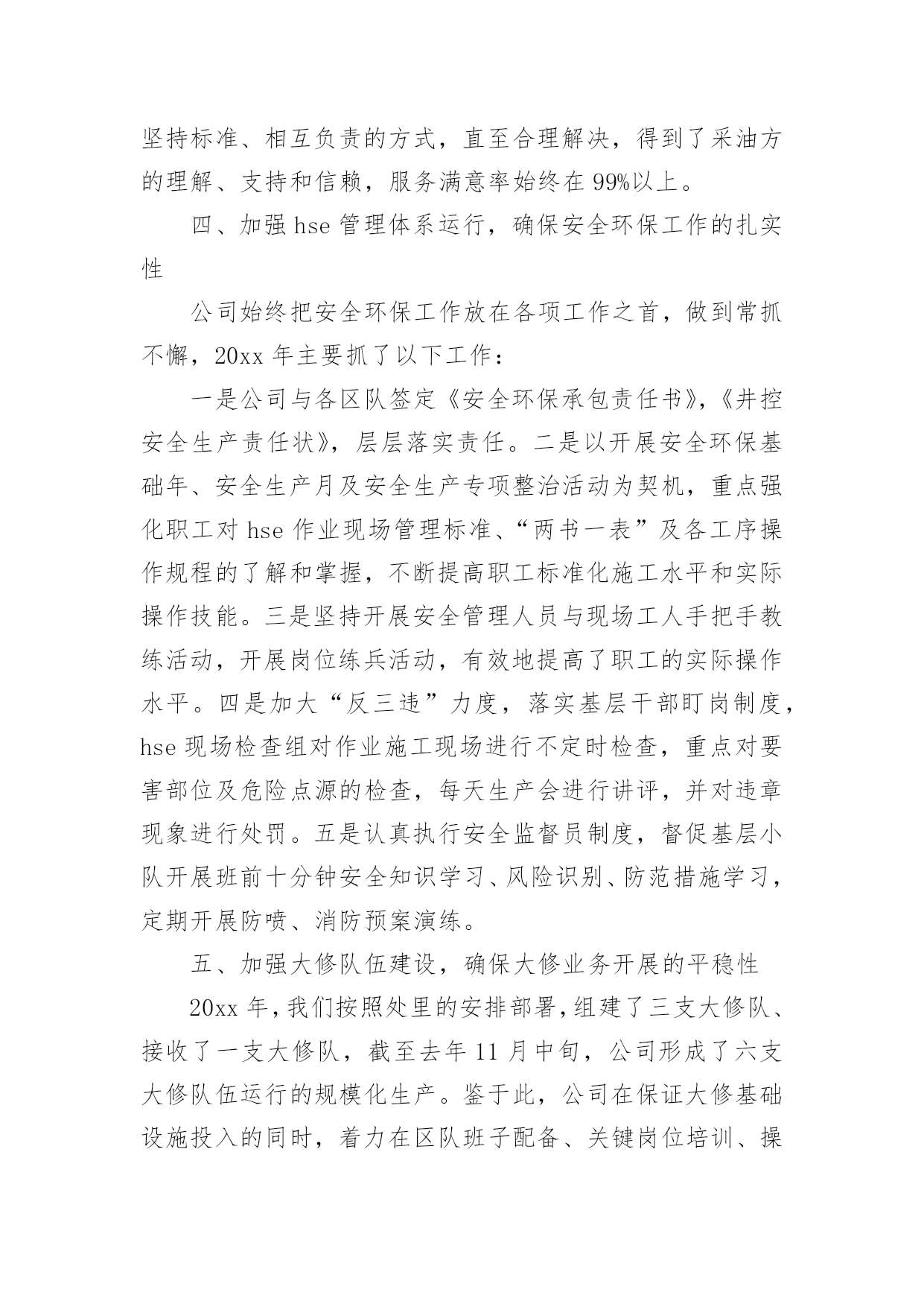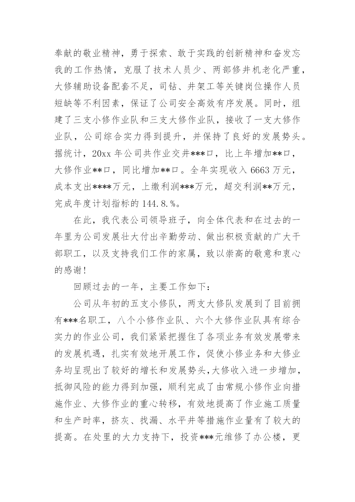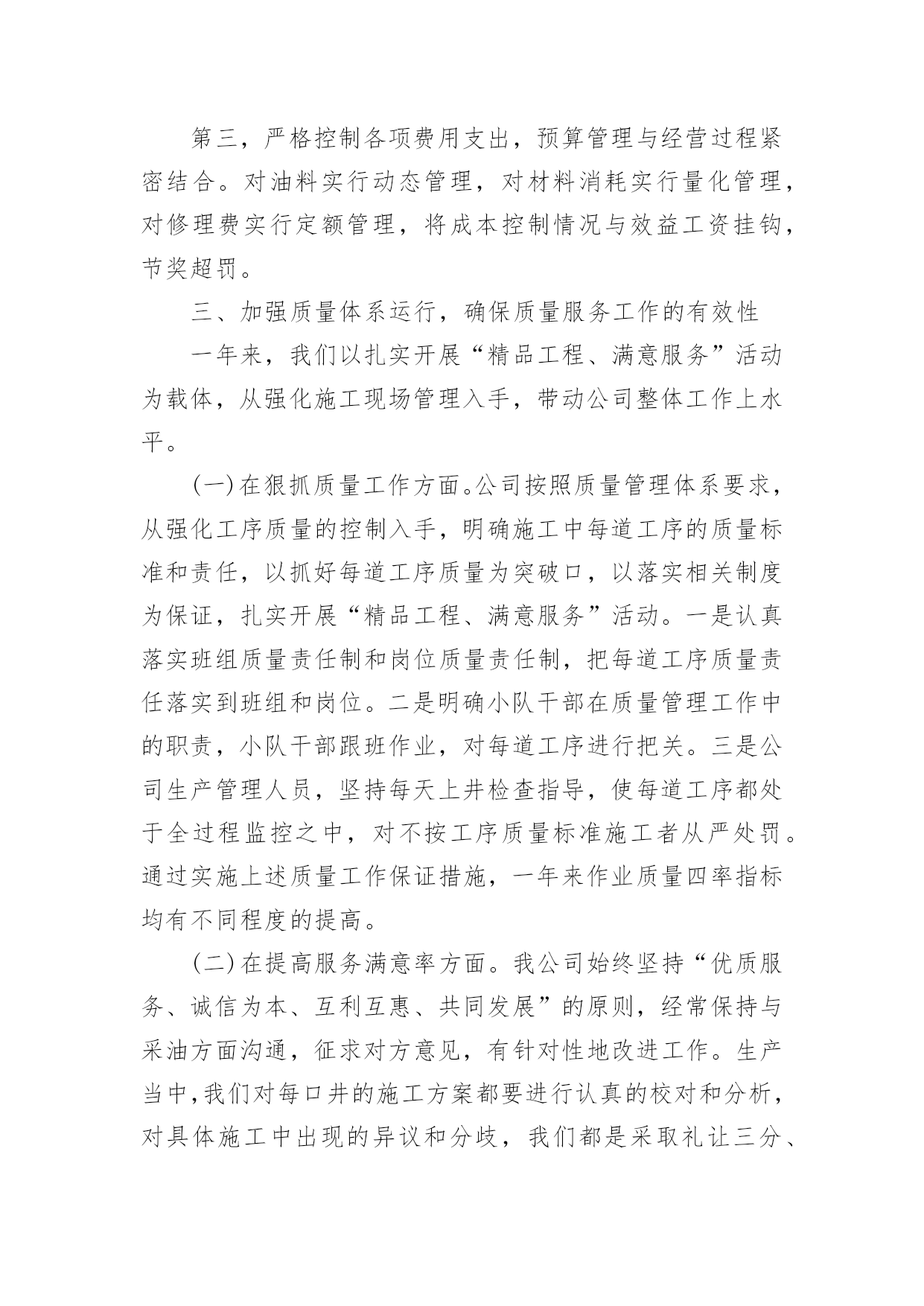 公司年终工作报告公司年终工作报告14篇随着人们自身素质提升,报告十分的重要,我们在写报告的时候要注意逻辑的合理性。那么大家知道标准正式的报告格式吗?以下是小编为大家整理的公司年终工作报告,仅供参考,大家一起来看看吧。公司年终工作报告1各位代表,同志们:现在,我向大会作行政工作报告,请予审议。二0xx年主要工作回顾20xx年,我公司紧紧围绕处二届三次职代会确定的工作目标,把“提升企业核心竞争力,实现持续有效增长”作为总的指导思想,以提高企业核心竞争力实现持续有效增长为工作思路,经过全体干部职工的共同努力,在生产经营管理、基层建设工作以及党建思想政治工作等方面均取得了较好成绩,全面完成了处里下达的年度各项考核指标。公司连续第三年荣获处级安全生产、环境保护、质量管理先进单位荣誉称号。各位代表,20xx年我们大家一起经历和见证了公司成长和壮大的历程。一年来,面对诸多困难,我们的干部职工充分发扬了迎难而上、不屈不挠的拼搏精神,心系企业、甘作奉献的敬业精神,勇于探索、敢于实践的创新精神和奋发忘我的工作热情,克服了技术人员少、两部修井机老化严重,大修辅助设备配套不足,司钻、井架工等关键岗位操作人员短缺等不利因素,保证了公司安全高效有序发展。同时,组建了三支小修作业队和三支大修作业队,接收了一支大修作业队,公司综合实力得到提升,并保持了良好的发展势头。据统计,20xx年公司共作业交井***口,比上年增加**口,大修作业**口,同比增加**口。全年实现收入6663万元,成本支出****万元,上缴利润***万元,超交利润**万元,完成年度计划指标的144.8.%。在此,我代表公司领导班子,向全体代表和在过去的一年里为公司发展壮大付出辛勤劳动、做出积极贡献的广大干部职工,以及支持我们工作的家属,致以崇高的敬意和衷心的感谢!回顾过去的一年,主要工作如下:公司从年初的五支小修队,两支大修队发展到了目前拥有***名职工,八个小修作业队、六个大修作业队具有综合实力的作业公司,我们紧紧把握住了各项业务有效发展带来的发展机遇,扎实有效地开展工作,促使小修业务和大修业务均呈现出了较好的增长和发展势头,大修收入进一步增加,抵御风险的能力得到加强,顺利完成了由常规小修作业向措施作业、大修作业的重心转移,有效地提高了作业施工质量和生产时率,挤灰、找漏、水平井等措施作业量有了较大的提高。在处里的大力支持下,投资***元维修了办公楼,更新了办公设施,新建了*个作业库房,大大改善了办公环境和生产条件。一、加强组织协调,确保作业生产的连续性生产组织方面,公司严密组织,层次分明,秩序井然,信息通畅,指挥得力。做到施工井号随时到随时安排,尤其是处里安排上作业的重点井、大头井,我们都能够及时优选队伍,突击抢上,公司工程、质量、安全、监督、资产等生产人员每天坚持巡回跑现场,加大夜间检查力度,发现问题后,当场能整改的就当场整改,现场整改不了的,停工整改,与相关部门协调及时解决。各区队都能采取科学有效的组织方式,提高作业时效。另外是认真开好每天的生产会,各队在汇报生产进度的同时,把遇到的生产问题一并讲出来,这样,公司不仅能全面地了解和掌握具体情况,同时有针对性地安排第二天的工作,保证了生产组织的连续性。二、加强精细化管理,确保各项经营措施的可操作性今年以来,我公司紧紧围绕年度经营目标,实施精细化管理,强化经营手段,创新管理方式,向管理要效益。首先,我们将处下达的利润指标和成本指标分解并承包到每个小队,同时把经营指标和管理目标纳入承包考核范围,突出效益指标考核,激发了全员创效的积极性。其次,每月召开一次经营分析会,对各区队上个月完成利润的多少、成本节超情况以及存在的疖症性问题进行综合评定和认真分析,逐项找原因、查不足、定措施,有针对性地制定出下个月的主攻方向和工作目标。第三,严格控制各项费用支出,预算管理与经营过程紧密结合。对油料实行动态管理,对材料消耗实行量化管理,对修理费实行定额管理,将成本控制情况与效益工资挂钩,节奖超罚。三、加强质量体系运行,确保质量服务工作的有效性一年来,我们以扎实开展“精品工程、满意服务”活动为载体,从强化施工现场管理入手,带动公司整体工作上水平。(一)在狠抓质量工作方面。公司按照质量管理体系要求,从强化工序质量的控制入手,明确施工中每道工序的质量标准和责任,以抓好每道工序质量为突破口,以落实相关制度为保证,扎实开展“精品工程、满意服务”活动。一是认真落实班组质量责任制和岗位质量责任制,把每道工序质量责任落实到班组和岗位。二是明确小队干部在质量管理工作中的职责,小队干部跟班作业,对每道工序进行把关。三是公司生产管理人员,坚持每天上井检查指导,使每道工序都处于全过程监控之中,对不按工序质量标准施工者从严处罚。通过实施上述质量工作保证措施,一年来作业质量四率指标