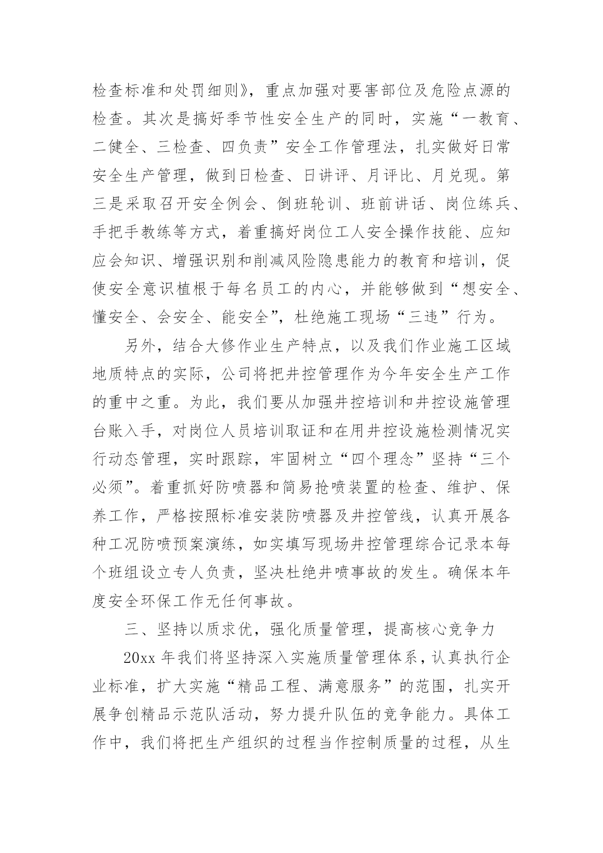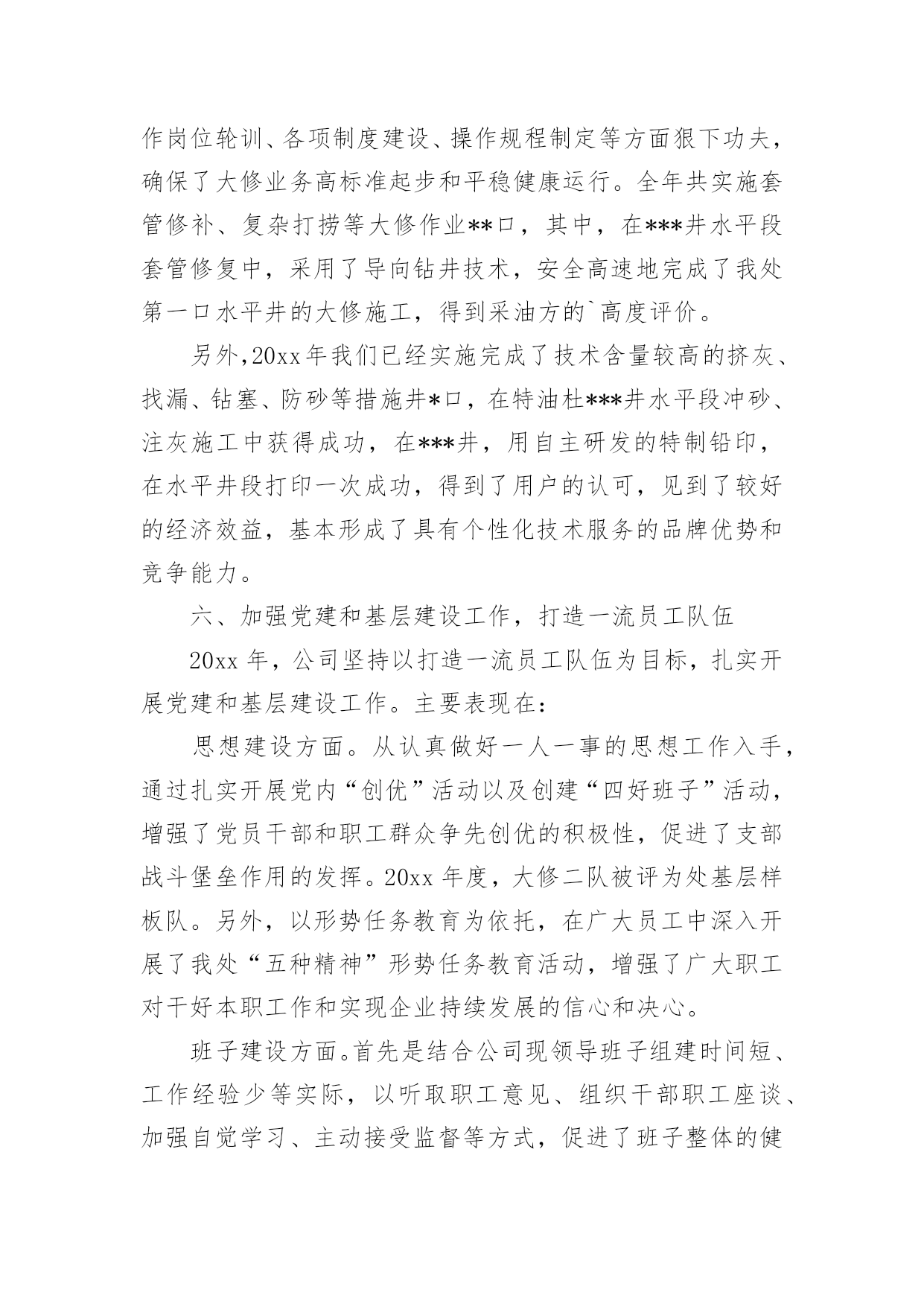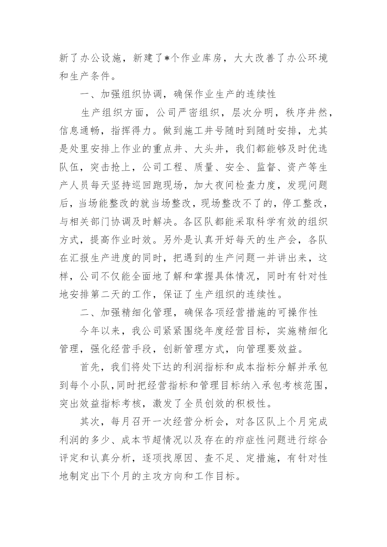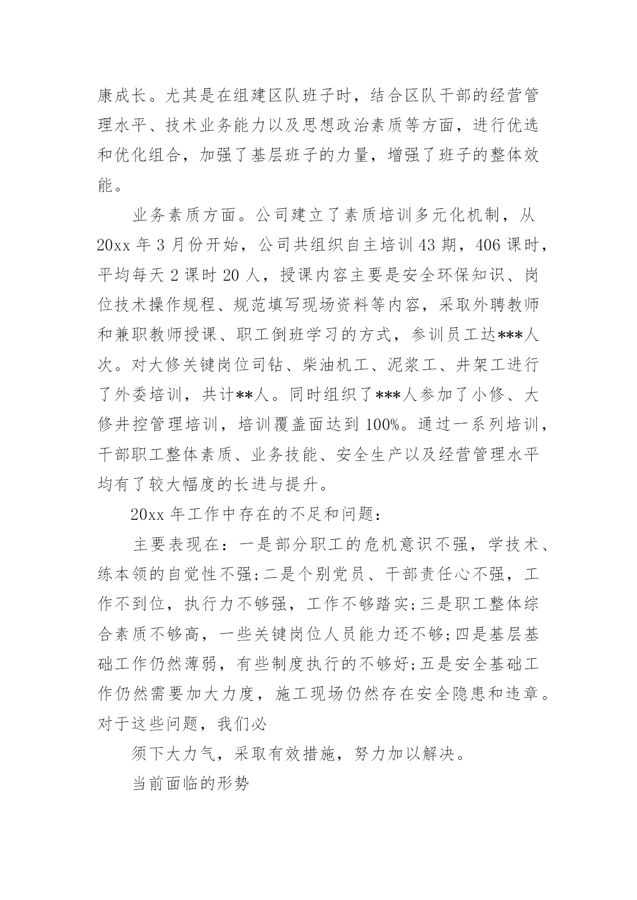 公司年终工作报告公司年终工作报告14篇随着人们自身素质提升,报告十分的重要,我们在写报告的时候要注意逻辑的合理性。那么大家知道标准正式的报告格式吗?以下是小编为大家整理的公司年终工作报告,仅供参考,大家一起来看看吧。公司年终工作报告1各位代表,同志们:现在,我向大会作行政工作报告,请予审议。二0xx年主要工作回顾20xx年,我公司紧紧围绕处二届三次职代会确定的工作目标,把“提升企业核心竞争力,实现持续有效增长”作为总的指导思想,以提高企业核心竞争力实现持续有效增长为工作思路,经过全体干部职工的共同努力,在生产经营管理、基层建设工作以及党建思想政治工作等方面均取得了较好成绩,全面完成了处里下达的年度各项考核指标。公司连续第三年荣获处级安全生产、环境保护、质量管理先进单位荣誉称号。各位代表,20xx年我们大家一起经历和见证了公司成长和壮大的历程。一年来,面对诸多困难,我们的干部职工充分发扬了迎难而上、不屈不挠的拼搏精神,心系企业、甘作奉献的敬业精神,勇于探索、敢于实践的创新精神和奋发忘我的工作热情,克服了技术人员少、两部修井机老化严重,大修辅助设备配套不足,司钻、井架工等关键岗位操作人员短缺等不利因素,保证了公司安全高效有序发展。同时,组建了三支小修作业队和三支大修作业队,接收了一支大修作业队,公司综合实力得到提升,并保持了良好的发展势头。据统计,20xx年公司共作业交井***口,比上年增加**口,大修作业**口,同比增加**口。全年实现收入6663万元,成本支出****万元,上缴利润***万元,超交利润**万元,完成年度计划指标的144.8.%。在此,我代表公司领导班子,向全体代表和在过去的一年里为公司发展壮大付出辛勤劳动、做出积极贡献的广大干部职工,以及支持我们工作的家属,致以崇高的敬意和衷心的感谢!回顾过去的一年,主要工作如下:公司从年初的五支小修队,两支大修队发展到了目前拥有***名职工,八个小修作业队、六个大修作业队具有综合实力的作业公司,我们紧紧把握住了各项业务有效发展带来的发展机遇,扎实有效地开展工作,促使小修业务和大修业务均呈现出了较好的增长和发展势头,大修收入进一步增加,抵御风险的能力得到加强,顺利完成了由常规小修作业向措施作业、大修作业的重心转移,有效地提高了作业施工质量和生产时率,挤灰、找漏、水平井等措施作业量有了较大的提高。在处里的大力支持下,投资***元维修了办公楼,更新了办公设施,新建了*个作业库房,大大改善了办公环境和生产条件。一、加强组织协调,确保作业生产的连续性生产组织方面,公司严密组织,层次分明,秩序井然,信息通畅,指挥得力。做到施工井号随时到随时安排,尤其是处里安排上作业的重点井、大头井,我们都能够及时优选队伍,突击抢上,公司工程、质量、安全、监督、资产等生产人员每天坚持巡回跑现场,加大夜间检查力度,发现问题后,当场能整改的就当场整改,现场整改不了的,停工整改,与相关部门协调及时解决。各区队都能采取科学有效的组织方式,提高作业时效。另外是认真开好每天的生产会,各队在汇报生产进度的同时,把遇到的生产问题一并讲出来,这样,公司不仅能全面地了解和掌握具体情况,同时有针对性地安排第二天的工作,保证了生产组织的连续性。二、加强精细化管理,确保各项经营措施的可操作性今年以来,我公司紧紧围绕年度经营目标,实施精细化管理,强化经营手段,创新管理方式,向管理要效益。首先,我们将处下达的利润指标和成本指标分解并承包到每个小队,同时把经营指标和管理目标纳入承包考核范围,突出效益指标考核,激发了全员创效的积极性。其次,每月召开一次经营分析会,对各区队上个月完成利润的多少、成本节超情况以及存在的疖症性问题进行综合评定和认真分析,逐项找原因、查不足、定措施,有针对性地制定出下个月的主攻方向和工作目标。第三,严格控制各项费用支出,预算管理与经营过程紧密结合。对油料实行动态管理,对材料消耗实行量化管理,对修理费实行定额管理,将成本控制情况与效益工资挂钩,节奖超罚。三、加强质量体系运行,确保质量服务工作的有效性一年来,我们以扎实开展“精品工程、满意服务”活动为载体,从强化施工现场管理入手,带动公司整体工作上水平。(一)在狠抓质量工作方面。公司按照质量管理体系要求,从强化工序质量的控制入手,明确施工中每道工序的质量标准和责任,以抓好每道工序质量为突破口,以落实相关制度为保证,扎实开展“精品工程、满意服务”活动。一是认真落实班组质量责任制和岗位质量责任制,把每道工序质量责任落实到班组和岗位。二是明确小队干部在质量管理工作中的职责,小队干部跟班作业,对每道工序进行把关。三是公司生产管理人员,坚持每天上井检查指导,使每道工序都处于全过程监控之中,对不按工序质量标准施工者从严处罚。通过实施上述质量工作保证措施,一年来作业质量四率指标