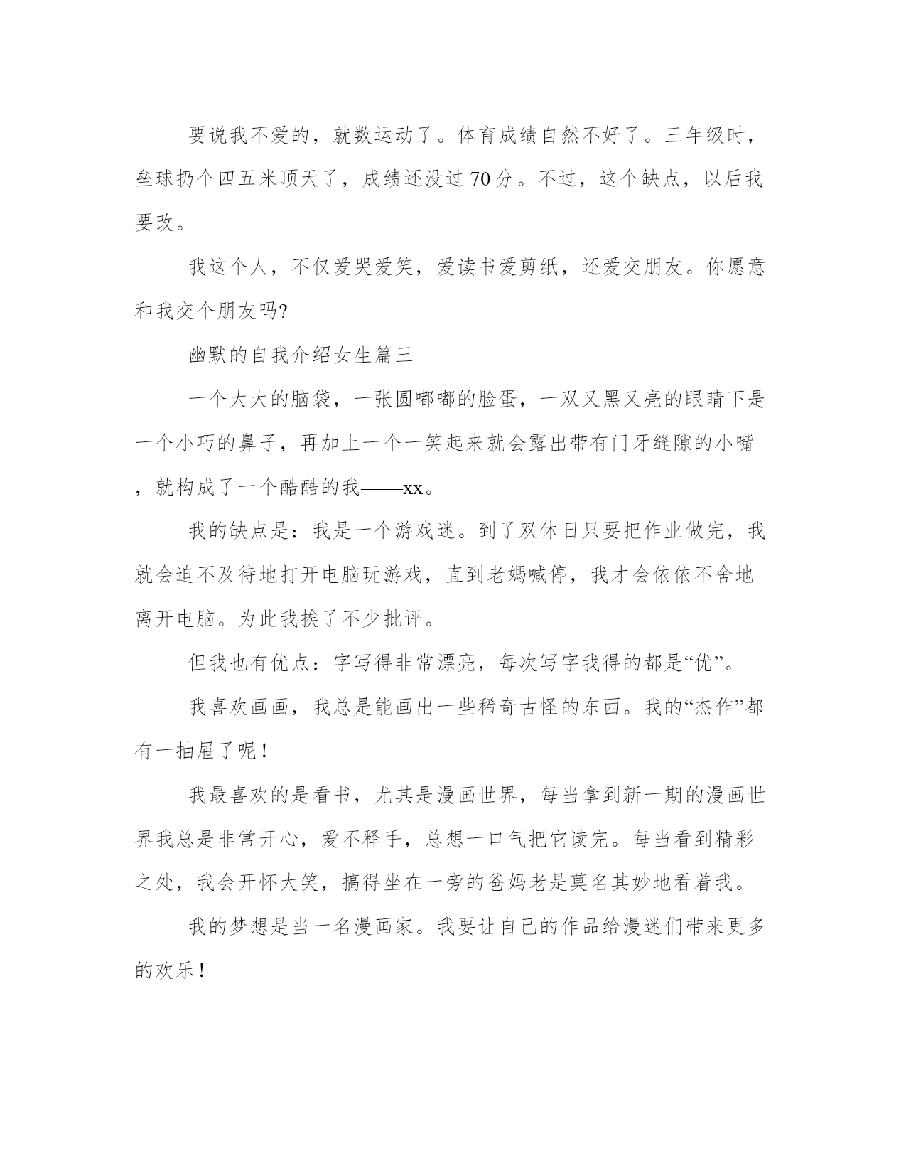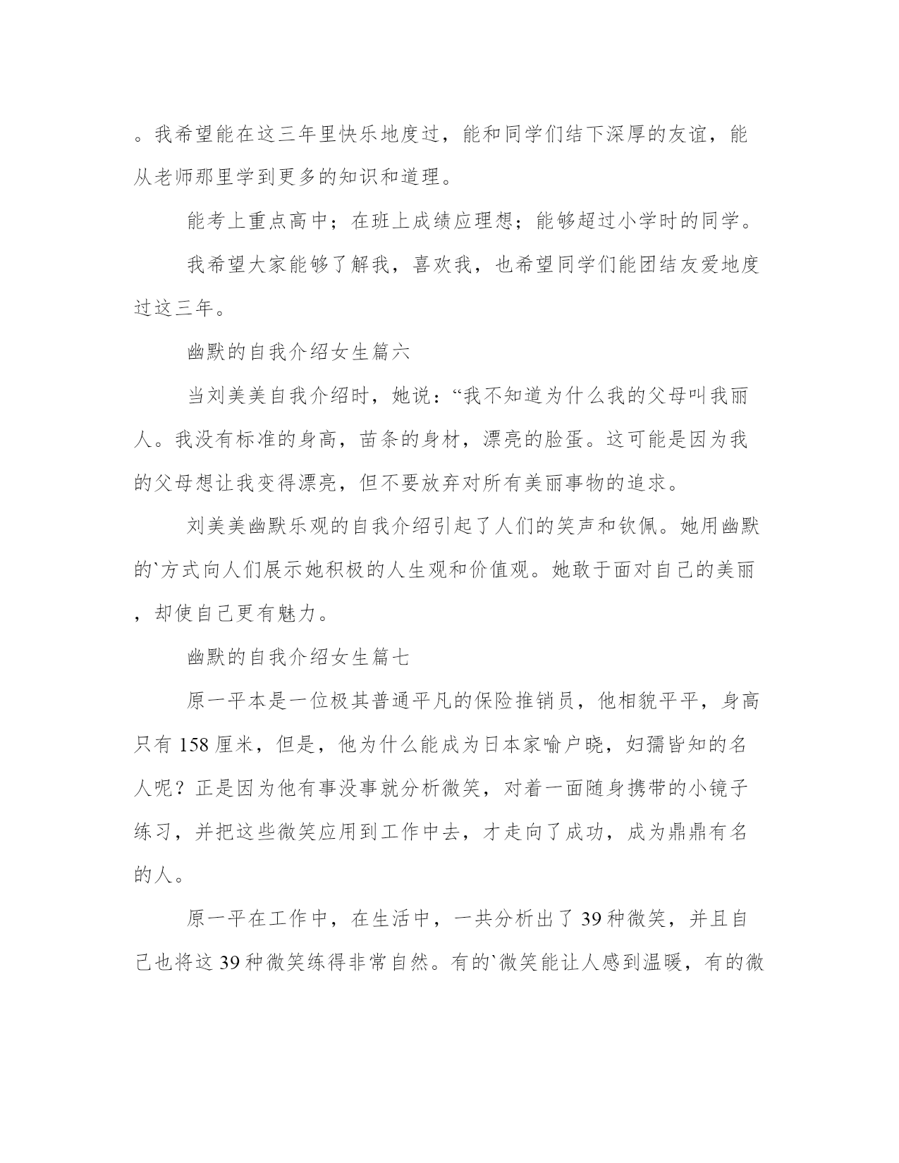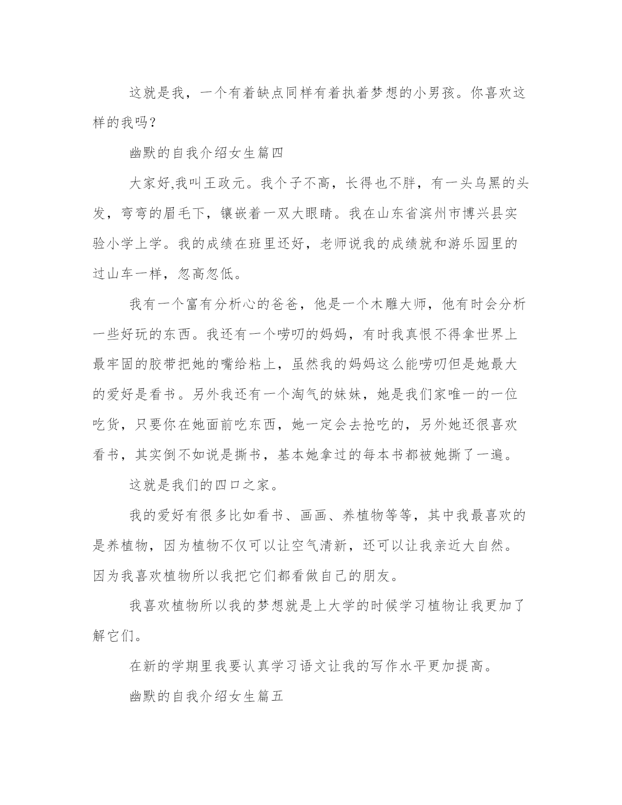 2023年幽默的自我介绍女生幽默自我介绍(优质9篇)人的记忆力会随着岁月的流逝而衰退,写作可以弥补记忆的不足,将曾经的人生经历和感悟记录下来,也便于保存一份美好的回忆。相信许多人会觉得范文很难写?接下来小编就给大家介绍一下优秀的范文该怎么写,我们一起来看一看吧。幽默的自我介绍女生篇一各位考官:早上好!我叫***,今年27岁。20xx年7月我从xx师范学校历史专业毕业。教师这个职业是神圣而伟大的,他要求教师不仅要有丰富的知识,还要有高尚的情操。因此,在读师范时,我就十分注重自身的全面发展,广泛地培养自己的兴趣爱好,并学有专长,做到除擅长绘画和书法外,还能会唱、会说、会讲。“学高仅能为师,身正方能为范”,在注重知识学习的同时我还注意培养自己高尚的道德情操,自觉遵纪守法,遵守社会公德,没有不良嗜好和行为。我想这些都是一名教育工假如,我通过了面试,成为众多教师队伍中的成员,我将不断努力学习,努力工作,为家乡的教育事业贡献自己的力量,决不辜负“人类灵魂的工程师”这个光荣的称号。幽默的自我介绍女生篇二hello!大家好,我叫王x,现在在xx市xx在小学五年级学习。我有一张圆圆的脸,一双乌黑的眼睛,短头发。我今年12岁了,不小了吧?却总也脱不掉那满脸的稚气。我的爱好就是爱看书。说起看书,我还有一段小故事呢!那天,我看见我的一个同学买了一本苦儿流浪记,这本书我已经向往了许久,可是爸爸始终没有答应我的要求。我的自尊心很强,从小到大几乎没有央求过别人,这次,我硬着头皮,只好向他去借。谁知,他说可以是可以,可得拿动物图书跟与交换,我只好把书给他,向他要了那本苦儿流浪记。我凭借在大赛中的优异表现,多次参加文艺演出活动和担任评审。云南改革开放30周年专题文艺晚会七彩颂歌上,我独唱了歌曲祝福云南;云南电视台少儿频道20xx年元旦晚会上,我领唱了朝霞之歌和小小世界;20xx年,在云南电视台少儿频道迎新晚会上,我表演歌舞跨世纪的新一代;还是这一年,我在北京“德艺双馨”祖国颂晚会中领唱学好本领去回答。20xx年8月,我被中央电视台青少年节目中心聘为20xx年全国儿童歌曲大奖赛儿童评委。我的缺点就是爱掉“金豆豆”。咳,你可别笑,这也是我的爱好哩!养的宠物死了,哭!受同学欺负,哭!考试不好,哭!看书看到感人处,鼻子一酸,又落下两排“大珍珠”。不过,我丝毫不觉得难为情,古人云:“当笑则笑,当哭则哭,无须掩饰。”要说我不爱的,就数运动了。体育成绩自然不好了。三年级时,垒球扔个四五米顶天了,成绩还没过70分。不过,这个缺点,以后我要改。我这个人,不仅爱哭爱笑,爱读书爱剪纸,还爱交朋友。你愿意和我交个朋友吗?幽默的自我介绍女生篇三一个大大的脑袋,一张圆嘟嘟的脸蛋,一双又黑又亮的眼睛下是一个小巧的鼻子,再加上一个一笑起来就会露出带有门牙缝隙的小嘴,就构成了一个酷酷的我——xx。我的缺点是:我是一个游戏迷。到了双休日只要把作业做完,我就会迫不及待地打开电脑玩游戏,直到老媽喊停,我才会依依不舍地离开电脑。为此我挨了不少批评。但我也有优点:字写得非常漂亮,每次写字我得的都是“优”。我喜欢画画,我总是能画出一些稀奇古怪的东西。我的“杰作”都有一抽屉了呢!我最喜欢的是看书,尤其是漫画世界,每当拿到新一期的漫画世界我总是非常开心,爱不释手,总想一口气把它读完。每当看到精彩之处,我会开怀大笑,搞得坐在一旁的爸妈老是莫名其妙地看着我。我的梦想是当一名漫画家。我要让自己的作品给漫迷们带来更多的欢乐!这就是我,一个有着缺点同样有着执着梦想的小男孩。你喜欢这样的我吗?幽默的自我介绍女生篇四大家好,我叫王政元。我个子不高,长得也不胖,有一头乌黑的头发,弯弯的眉毛下,镶嵌着一双大眼睛。我在山东省滨州市博兴县实验小学上学。我的成绩在班里还好,老师说我的成绩就和游乐园里的过山车一样,忽高忽低。我有一个富有分析心的爸爸,他是一个木雕大师,他有时会分析一些好玩的东西。我还有一个唠叨的妈妈,有时我真恨不得拿世界上最牢固的胶带把她的嘴给粘上,虽然我的妈妈这么能唠叨但是她最大的爱好是看书。另外我还有一个淘气的妹妹,她是我们家唯一的一位吃货,只要你在她面前吃东西,她一定会去抢吃的,另外她还很喜欢看书,其实倒不如说是撕书,基本她拿过的每本书都被她撕了一遍。这就是我们的四口之家。我的爱好有很多比如看书、画画、养植物等等,其中我最喜欢的是养植物,因为植物不仅可以让空气清新,还可以让我亲近大自然。因为我喜欢植物所以我把它们都看做自己的朋友。我喜欢植物所以我的梦想就是上大学的时候学习植物让我更加了解它们。在新的学期里我要认真学习语文让我的写作水平更加提高。幽默的自我介绍女生篇五大家好!我的名字叫xxx。我的个子不矮,但和班上的高个儿比起来,就逊色多了。和大多数