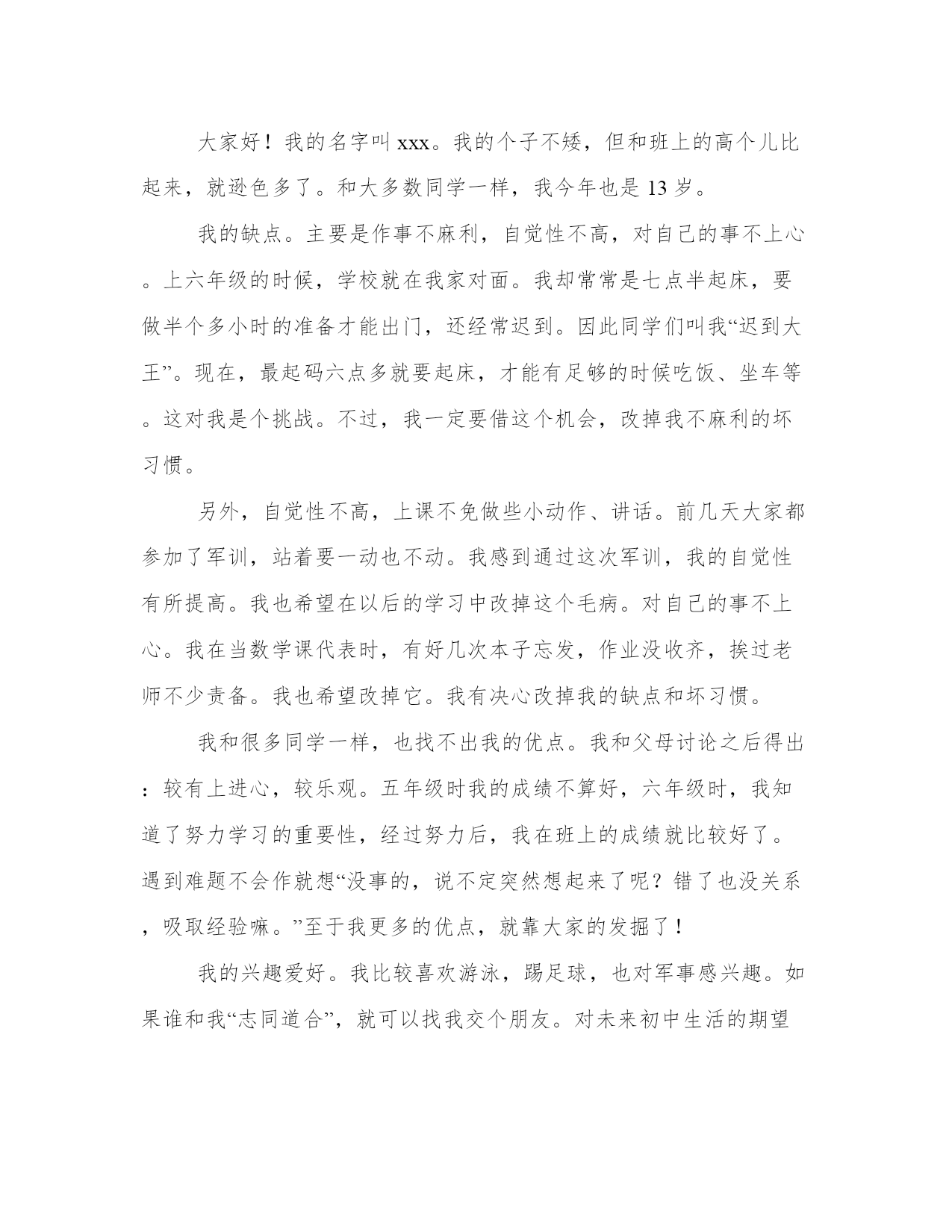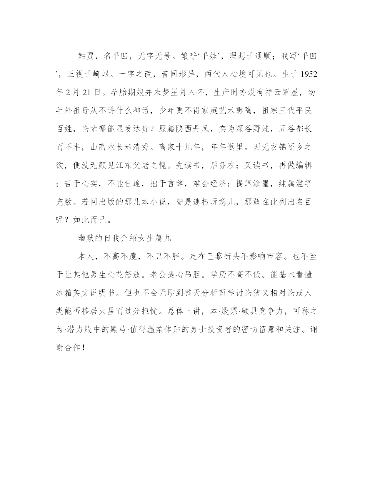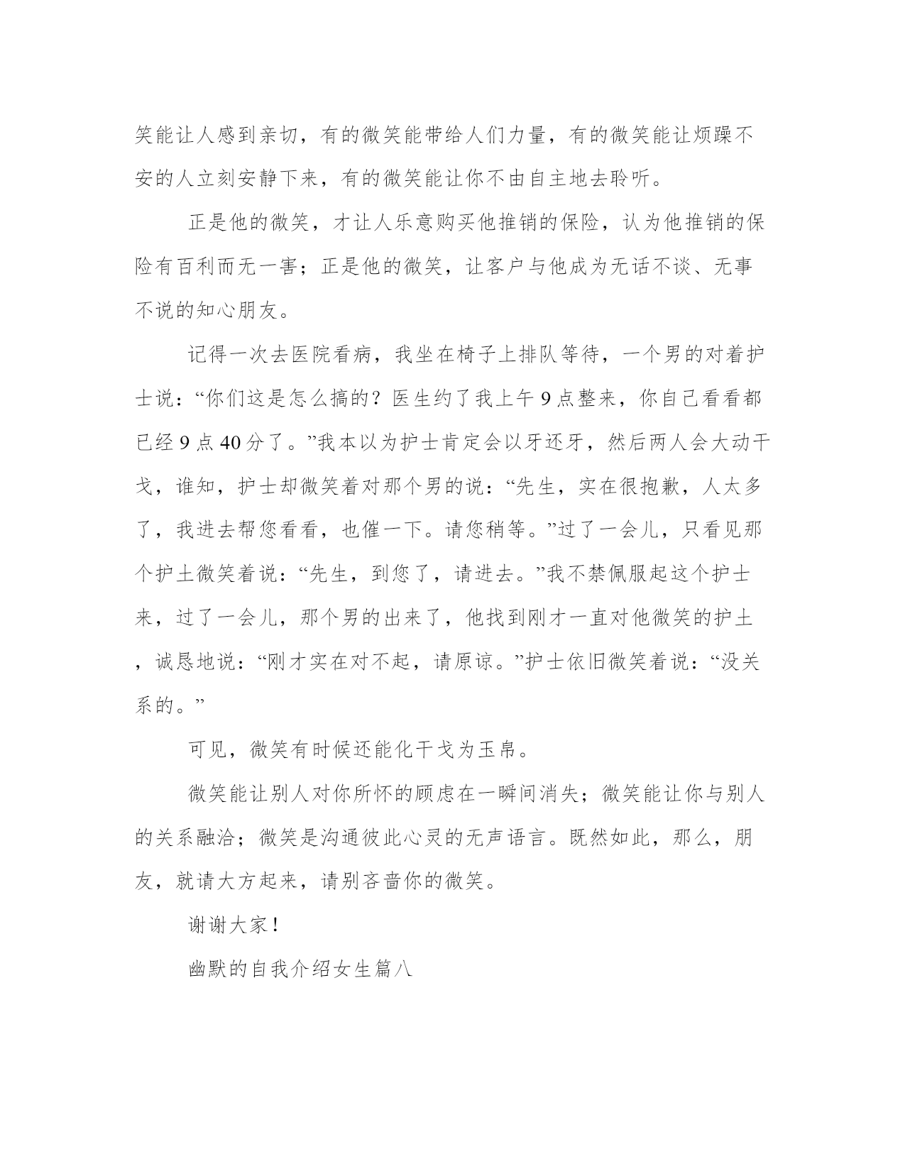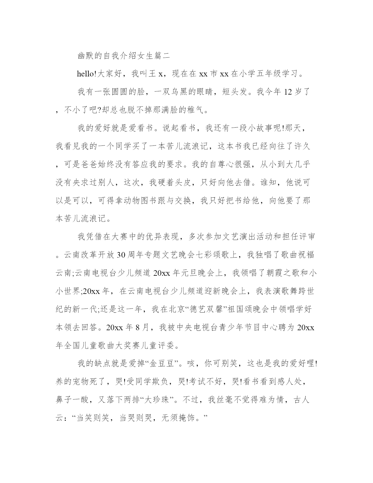 2023年幽默的自我介绍女生幽默自我介绍(优质9篇)人的记忆力会随着岁月的流逝而衰退,写作可以弥补记忆的不足,将曾经的人生经历和感悟记录下来,也便于保存一份美好的回忆。相信许多人会觉得范文很难写?接下来小编就给大家介绍一下优秀的范文该怎么写,我们一起来看一看吧。幽默的自我介绍女生篇一各位考官:早上好!我叫***,今年27岁。20xx年7月我从xx师范学校历史专业毕业。教师这个职业是神圣而伟大的,他要求教师不仅要有丰富的知识,还要有高尚的情操。因此,在读师范时,我就十分注重自身的全面发展,广泛地培养自己的兴趣爱好,并学有专长,做到除擅长绘画和书法外,还能会唱、会说、会讲。“学高仅能为师,身正方能为范”,在注重知识学习的同时我还注意培养自己高尚的道德情操,自觉遵纪守法,遵守社会公德,没有不良嗜好和行为。我想这些都是一名教育工假如,我通过了面试,成为众多教师队伍中的成员,我将不断努力学习,努力工作,为家乡的教育事业贡献自己的力量,决不辜负“人类灵魂的工程师”这个光荣的称号。幽默的自我介绍女生篇二hello!大家好,我叫王x,现在在xx市xx在小学五年级学习。我有一张圆圆的脸,一双乌黑的眼睛,短头发。我今年12岁了,不小了吧?却总也脱不掉那满脸的稚气。我的爱好就是爱看书。说起看书,我还有一段小故事呢!那天,我看见我的一个同学买了一本苦儿流浪记,这本书我已经向往了许久,可是爸爸始终没有答应我的要求。我的自尊心很强,从小到大几乎没有央求过别人,这次,我硬着头皮,只好向他去借。谁知,他说可以是可以,可得拿动物图书跟与交换,我只好把书给他,向他要了那本苦儿流浪记。我凭借在大赛中的优异表现,多次参加文艺演出活动和担任评审。云南改革开放30周年专题文艺晚会七彩颂歌上,我独唱了歌曲祝福云南;云南电视台少儿频道20xx年元旦晚会上,我领唱了朝霞之歌和小小世界;20xx年,在云南电视台少儿频道迎新晚会上,我表演歌舞跨世纪的新一代;还是这一年,我在北京“德艺双馨”祖国颂晚会中领唱学好本领去回答。20xx年8月,我被中央电视台青少年节目中心聘为20xx年全国儿童歌曲大奖赛儿童评委。我的缺点就是爱掉“金豆豆”。咳,你可别笑,这也是我的爱好哩!养的宠物死了,哭!受同学欺负,哭!考试不好,哭!看书看到感人处,鼻子一酸,又落下两排“大珍珠”。不过,我丝毫不觉得难为情,古人云:“当笑则笑,当哭则哭,无须掩饰。”要说我不爱的,就数运动了。体育成绩自然不好了。三年级时,垒球扔个四五米顶天了,成绩还没过70分。不过,这个缺点,以后我要改。我这个人,不仅爱哭爱笑,爱读书爱剪纸,还爱交朋友。你愿意和我交个朋友吗?幽默的自我介绍女生篇三一个大大的脑袋,一张圆嘟嘟的脸蛋,一双又黑又亮的眼睛下是一个小巧的鼻子,再加上一个一笑起来就会露出带有门牙缝隙的小嘴,就构成了一个酷酷的我——xx。我的缺点是:我是一个游戏迷。到了双休日只要把作业做完,我就会迫不及待地打开电脑玩游戏,直到老媽喊停,我才会依依不舍地离开电脑。为此我挨了不少批评。但我也有优点:字写得非常漂亮,每次写字我得的都是“优”。我喜欢画画,我总是能画出一些稀奇古怪的东西。我的“杰作”都有一抽屉了呢!我最喜欢的是看书,尤其是漫画世界,每当拿到新一期的漫画世界我总是非常开心,爱不释手,总想一口气把它读完。每当看到精彩之处,我会开怀大笑,搞得坐在一旁的爸妈老是莫名其妙地看着我。我的梦想是当一名漫画家。我要让自己的作品给漫迷们带来更多的欢乐!这就是我,一个有着缺点同样有着执着梦想的小男孩。你喜欢这样的我吗?幽默的自我介绍女生篇四大家好,我叫王政元。我个子不高,长得也不胖,有一头乌黑的头发,弯弯的眉毛下,镶嵌着一双大眼睛。我在山东省滨州市博兴县实验小学上学。我的成绩在班里还好,老师说我的成绩就和游乐园里的过山车一样,忽高忽低。我有一个富有分析心的爸爸,他是一个木雕大师,他有时会分析一些好玩的东西。我还有一个唠叨的妈妈,有时我真恨不得拿世界上最牢固的胶带把她的嘴给粘上,虽然我的妈妈这么能唠叨但是她最大的爱好是看书。另外我还有一个淘气的妹妹,她是我们家唯一的一位吃货,只要你在她面前吃东西,她一定会去抢吃的,另外她还很喜欢看书,其实倒不如说是撕书,基本她拿过的每本书都被她撕了一遍。这就是我们的四口之家。我的爱好有很多比如看书、画画、养植物等等,其中我最喜欢的是养植物,因为植物不仅可以让空气清新,还可以让我亲近大自然。因为我喜欢植物所以我把它们都看做自己的朋友。我喜欢植物所以我的梦想就是上大学的时候学习植物让我更加了解它们。在新的学期里我要认真学习语文让我的写作水平更加提高。幽默的自我介绍女生篇五大家好!我的名字叫xxx。我的个子不矮,但和班上的高个儿比起来,就逊色多了。和大多数